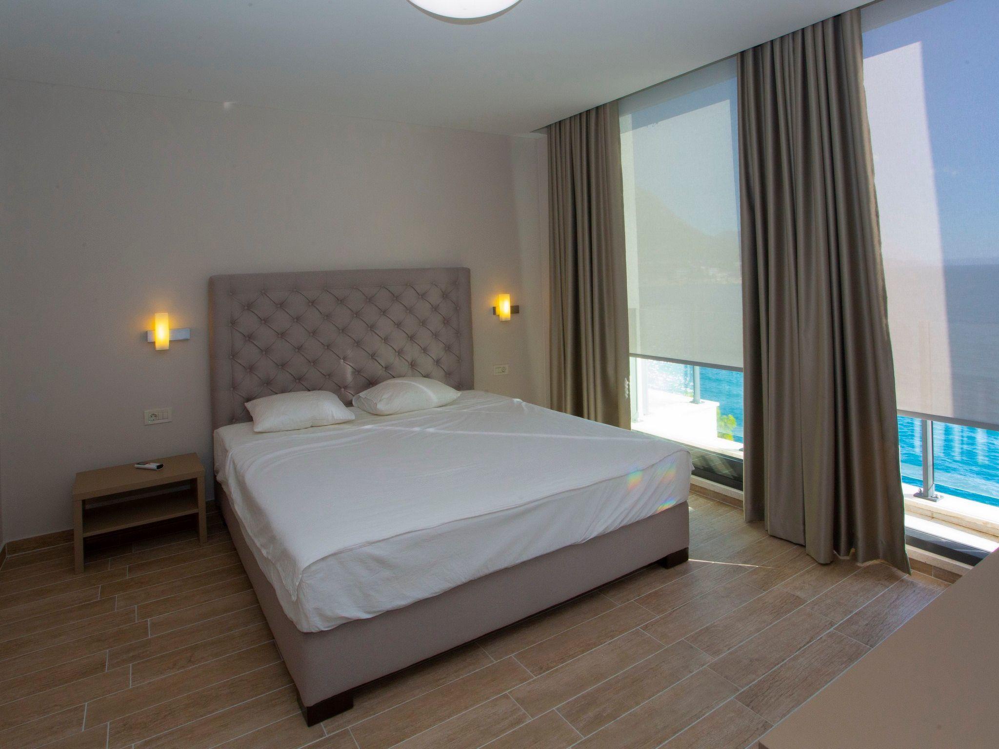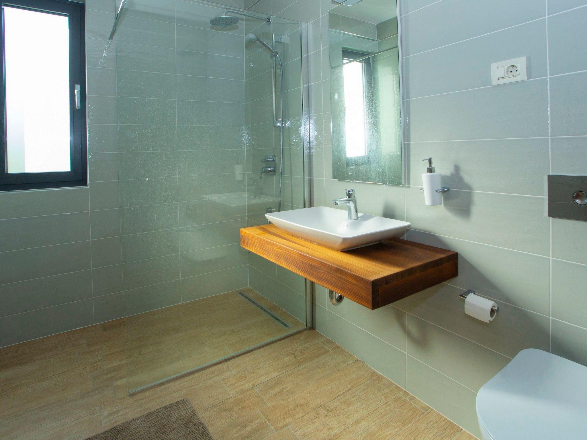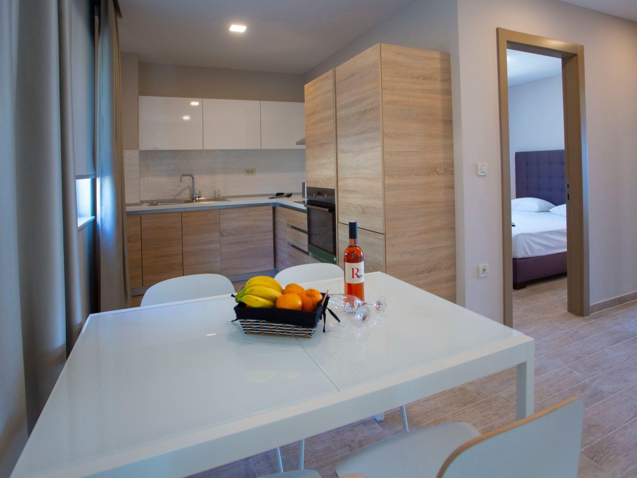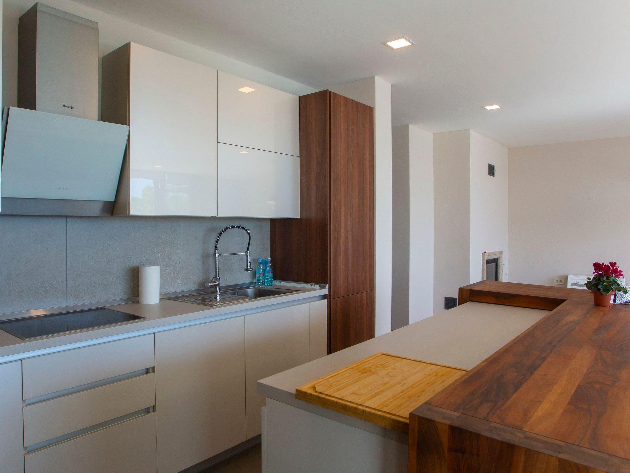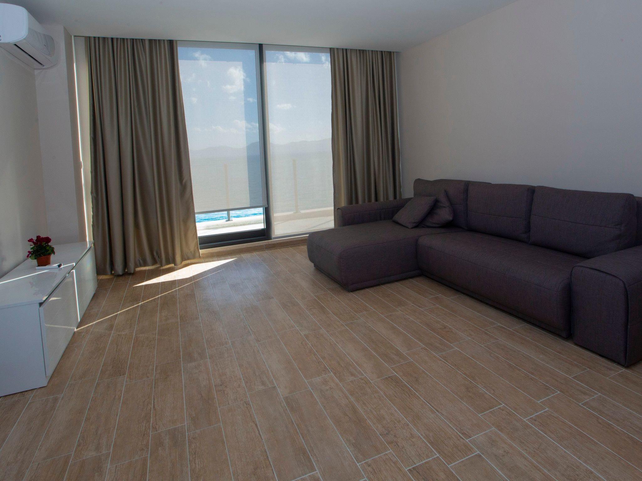 The villa’s exterior is nothing short of a paradise, offering panoramic sea views from its balcony and a private pool that serves as the centerpiece of relaxation. Surrounding the pool is a spacious terrace equipped with sun loungers, an outdoor dining table, and a grill, perfect for entertaining, whether it’s a family barbecue or a serene sunset dinner. The allure of dining under the stars or sunbathing with the backdrop of the Adriatic’s soothing hues is an experience in itself.