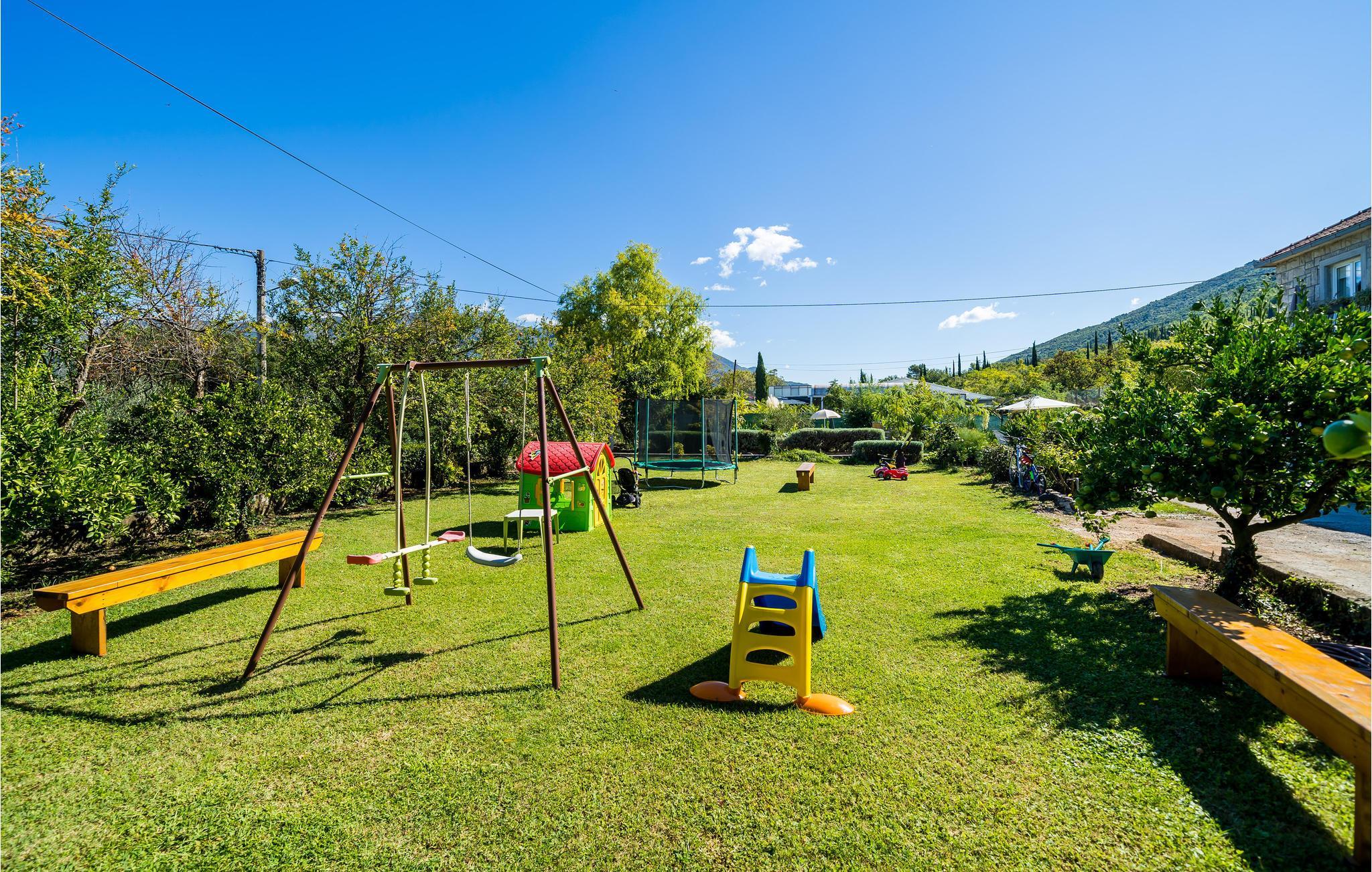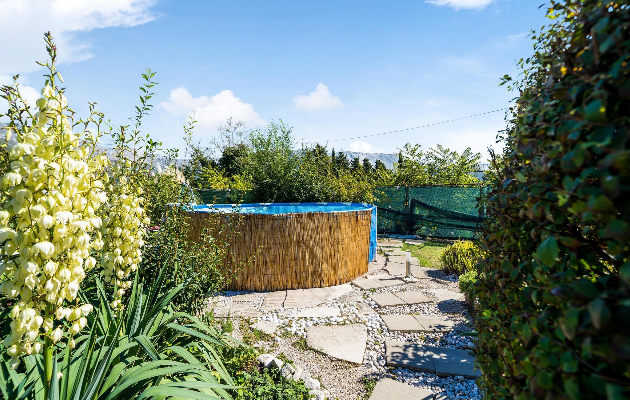 Lejligheden ligger på første sal i et familiehus, hvor der er to soveværelser, en stue med køkken og et badeværelse. Terrassen med have, legeredskaber og swimmingpool ligger i stueetagen og er omgivet af flere mindre haver med duftende blomster og planter, der giver den en særlig charme.