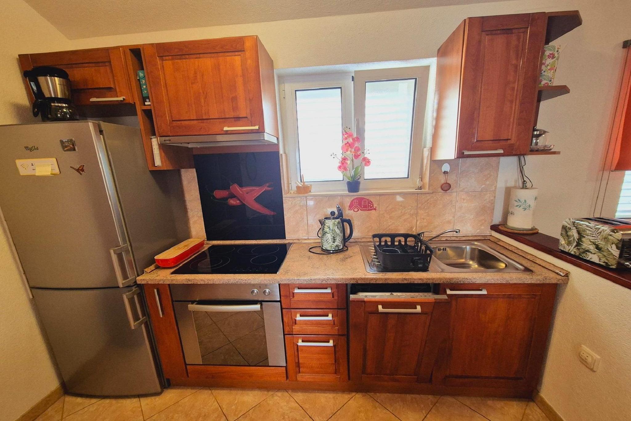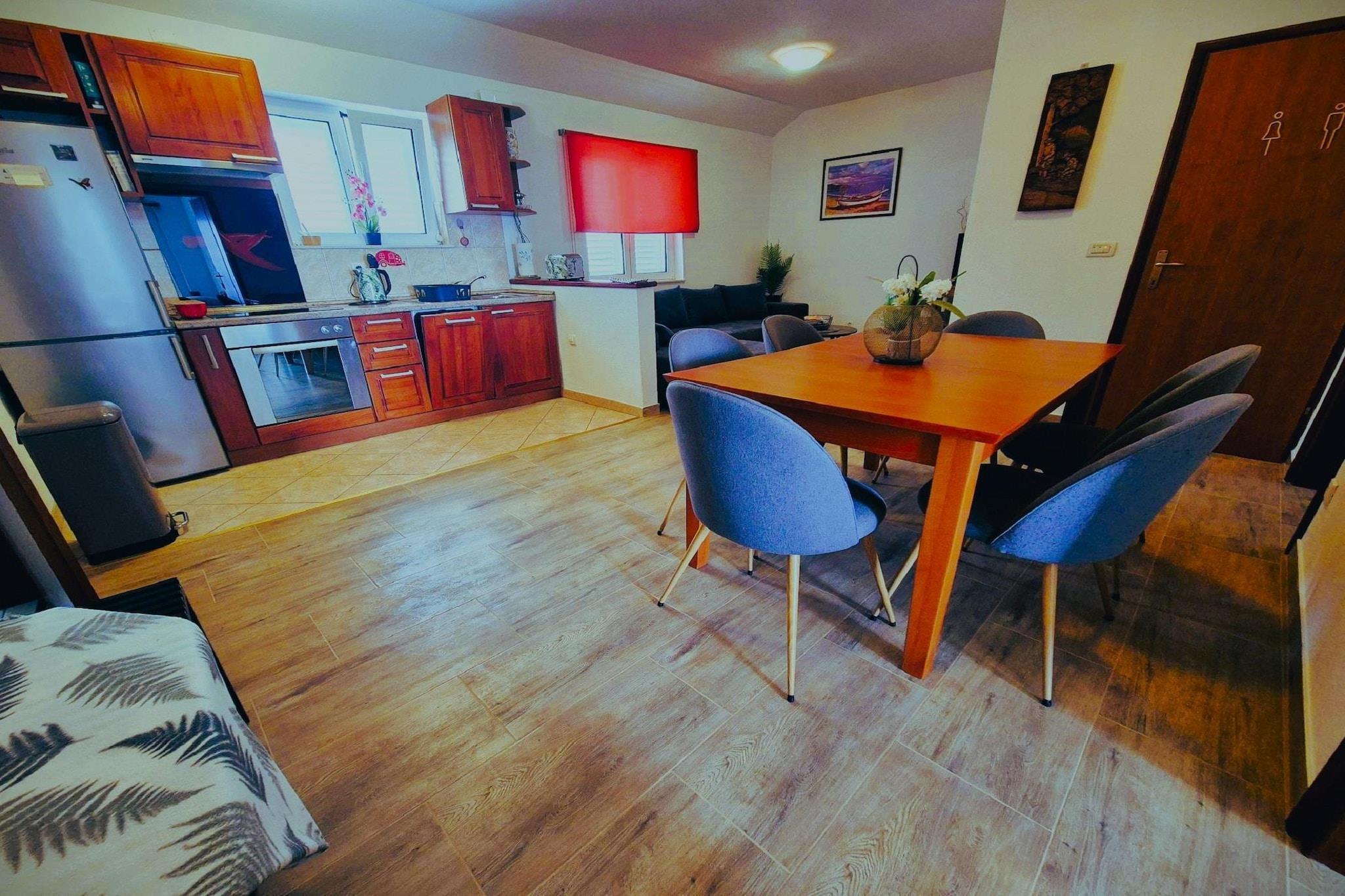 Komfortabel og stilfuld lejlighed i feriehus ligger i Cavtat, den gamle lille by ved Adriaterhavet, bosatte sig mellem Konavle vingård og Dubrovnik. Omgivet af grønne omgivelser med en smuk udsigt over havet og de nærliggende øer, kun 600 m væk fra den smukke sandstrand, ville der være en autentisk rolig atmosfære, perfekt til familier eller en gruppe på op til 4 personer. Lejligheden ligger kun 4 km fra Dubrovnik lufthavn i rolige omgivelser med flot havudsigt, fuld af privatliv og fri, sikker plads rundt. Lang balkon, der forbinder 3 soveværelser, giver fantastisk havudsigt, hvor du kan nyde dine måltider eller slappe af mens du observerer ekstraordinære solnedgange. Perfekt sted til familieferie som rekreative faciliteter er alle omkring. En fodboldbane, tennis- og beachvolleyballbaner ligger inden for 2,5 km fra lejligheden samt et spa- og wellnesscenter. Udover vandsport og dykning kan den kendte turistby Cavtat også tilbyde et højt professionelt ridecenter i en landsby Popovici, flere vandrestier, hvorigennem du kan opleve Konavle og dens cykelruter. UNESCO beskyttede by Dubrovnik med dens rige kulturarv og renæssance monumenter lokker at blive udforsket ubestemt.Montenegro med det naturlige skønheder er kun 20 km væk. Nationalparken Mljet, Ston, Mostar, Medjugorje, halvø Peljesac kunne alle besøges på en 1-dages tur.