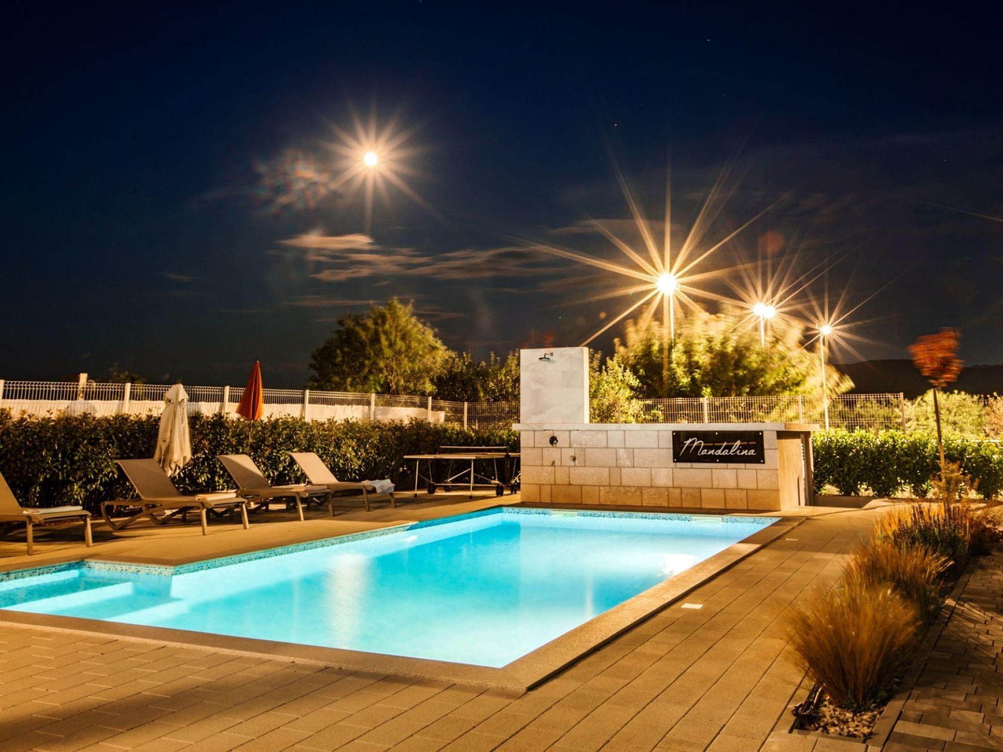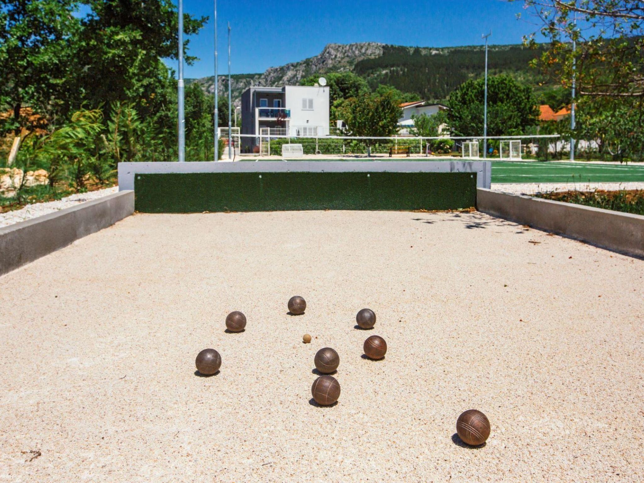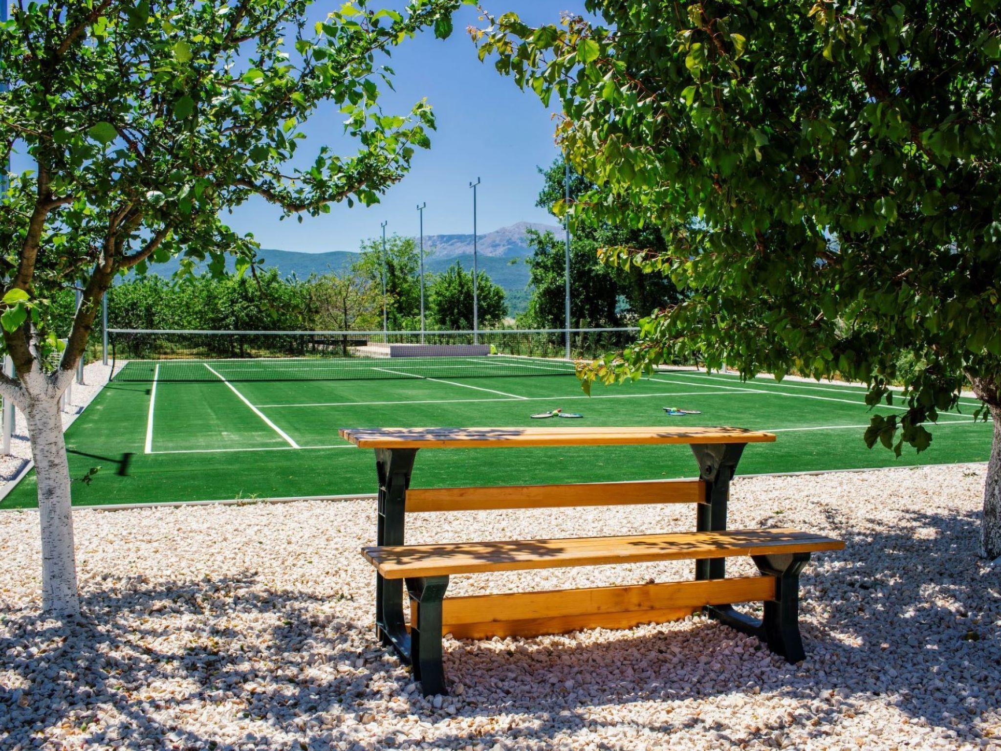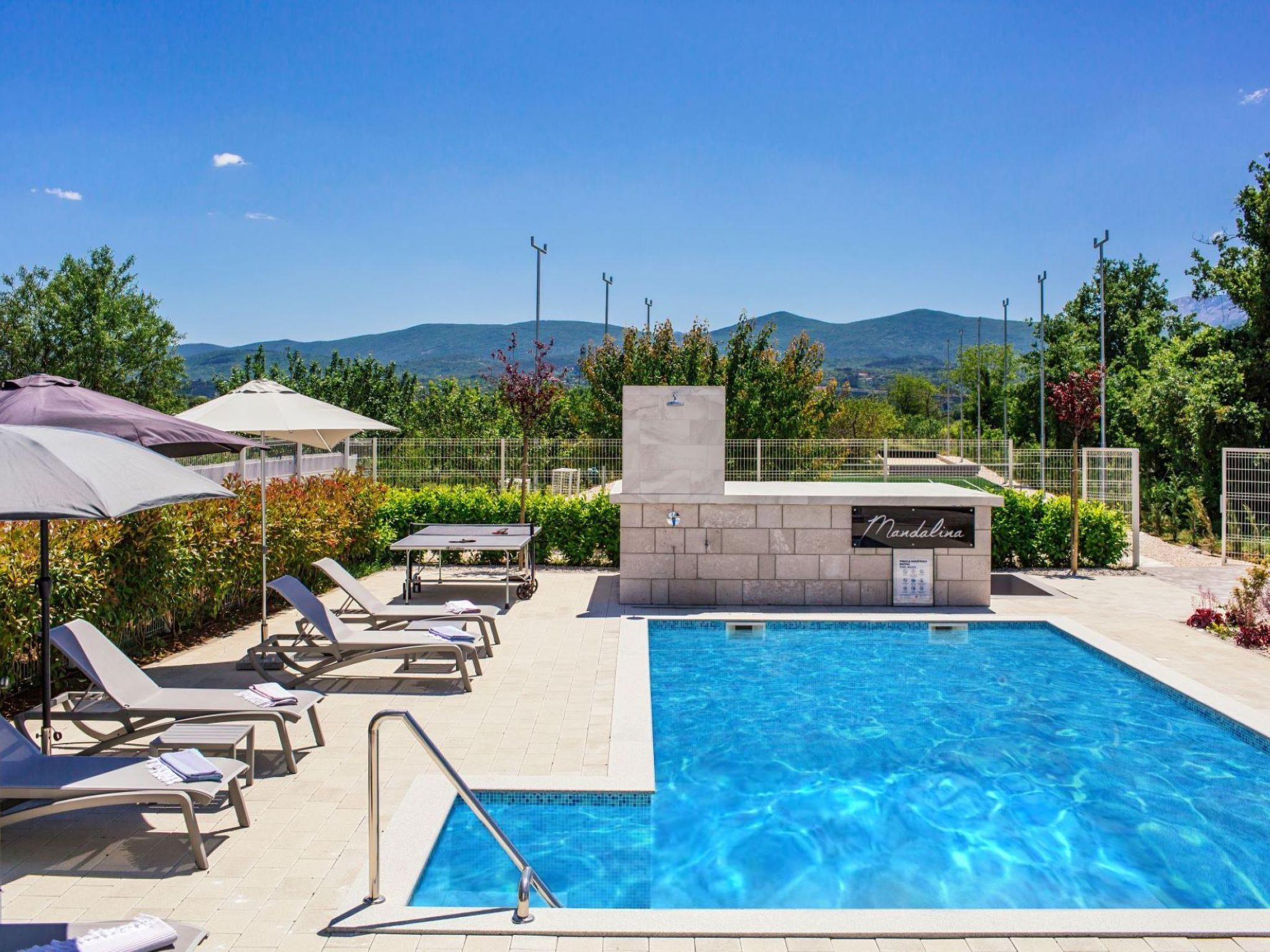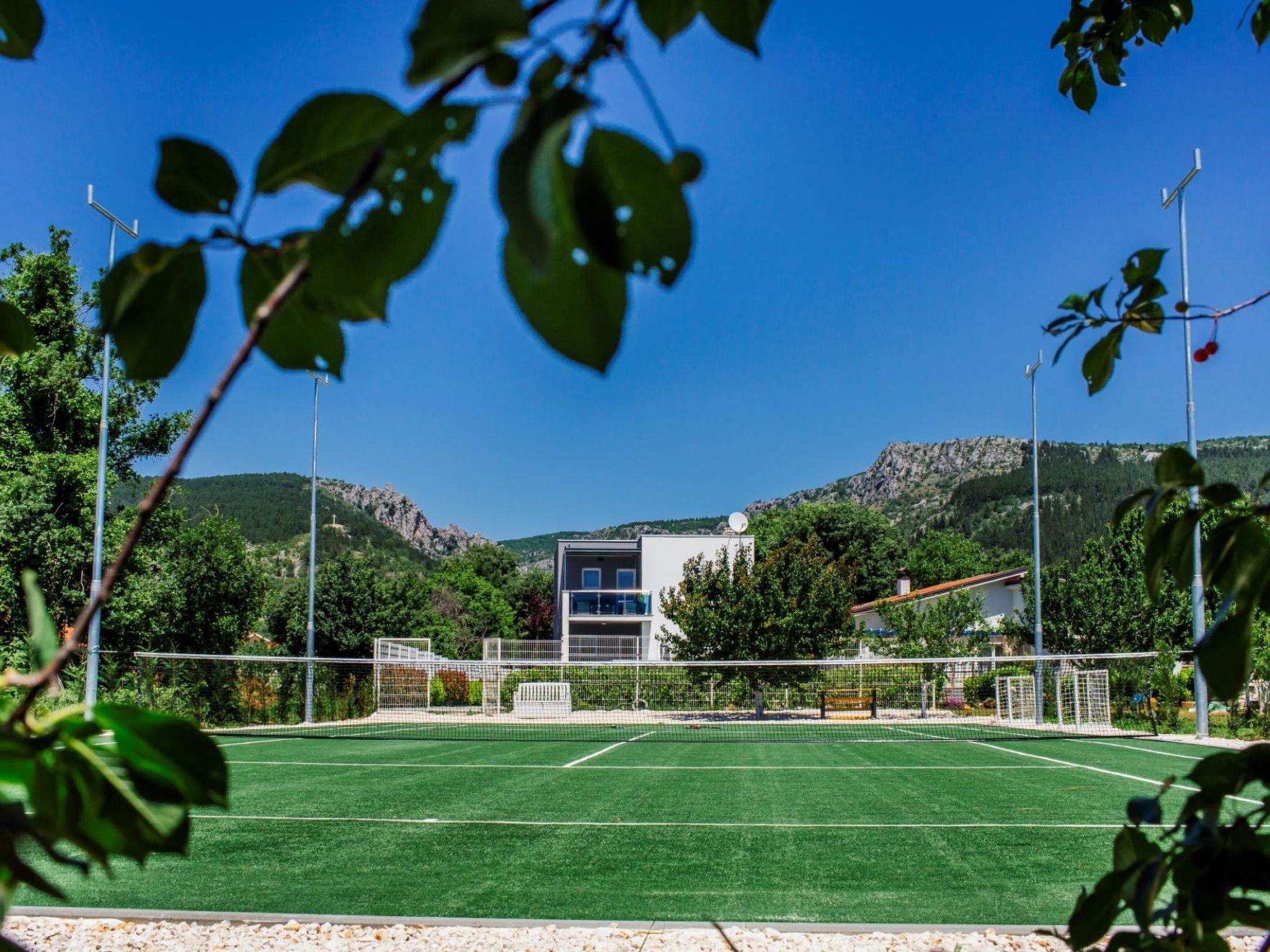 The villa spreads over three levels and with its four (4) bedrooms, three (3) bathrooms, a spacious living room, kitchen and two terraces is ideal for up to eight (8) guests. There are two large dining tables for eight (8) people, one of which is in the closed part and the other on the open, covered terrace equipped with a gas grill (Weber). The ground floor has one bedroom and a bathroom equipped with a washing machine. Upstairs is reached by an internal stone staircase, secured by a railing and a handrail where there are three bedrooms and two bathrooms. Two spacious rooms share one bathroom. The Master bedroom has its own bathroom, an outdoor terrace covered with a pergola with seating (high quality rattan). Outdoor pool (47m2 - 9.4mx5m) and the beautifully landscaped sun deck offer you true moments of relaxation. Along with first-class deck chairs and umbrellas, there is a high-quality sitting set. Fans of sports activities at their disposal have a table tennis table, bicycles, a professional tennis court (dimensions 10,97m x 23,77m) and a boccia alley (dimensions 4m x 25m). Outside the object there is a basketball court and a small football playing ground. Villa is located on 1 hectare of family farm with an orchard with 350 trees of different fruit varieties: sour and sweet cherries, almonds, figs, pomegranates. The villa offers a stunning view over the fields and orchards towards Biokovo - a mountain with a root in the sea,
