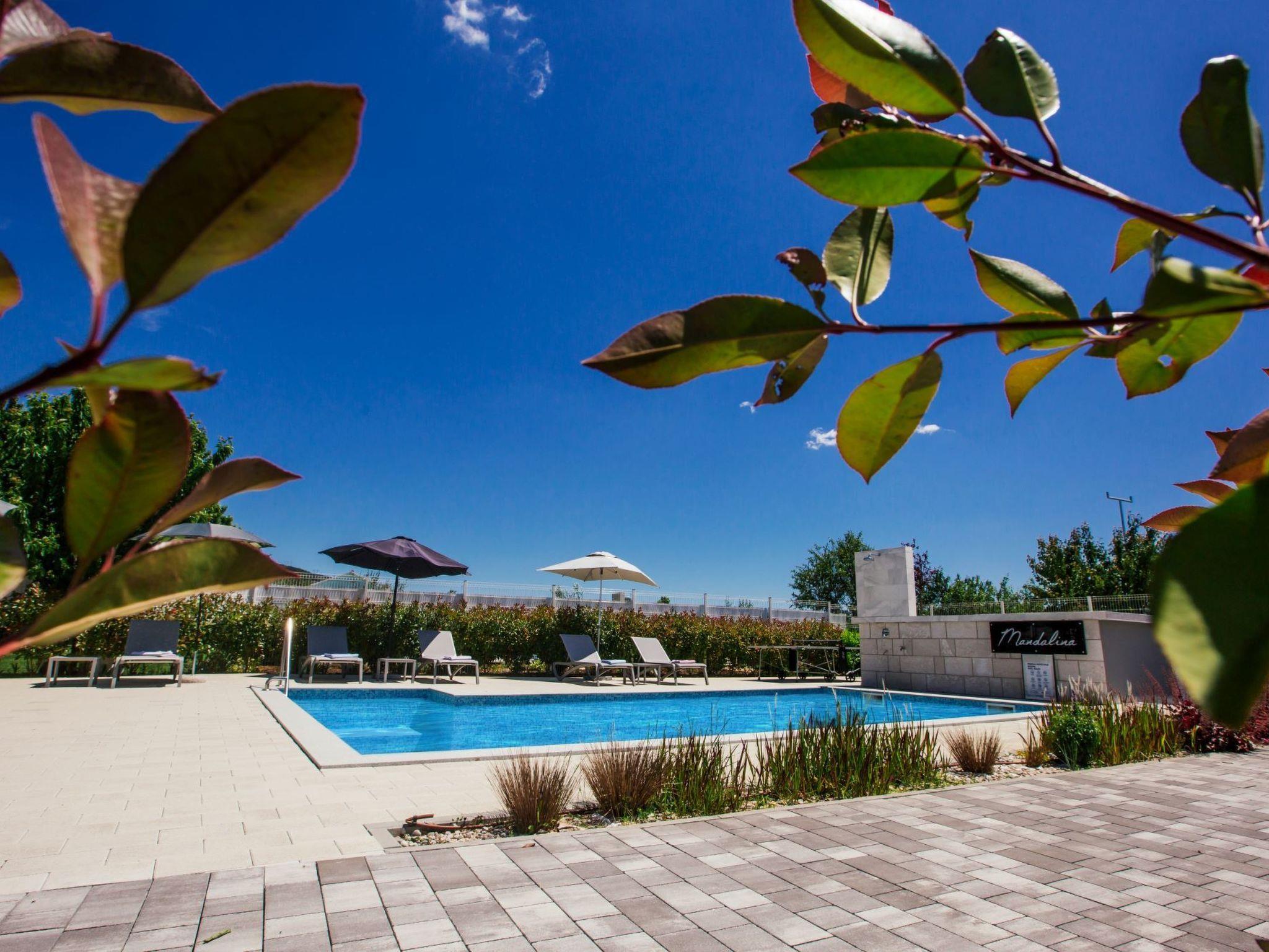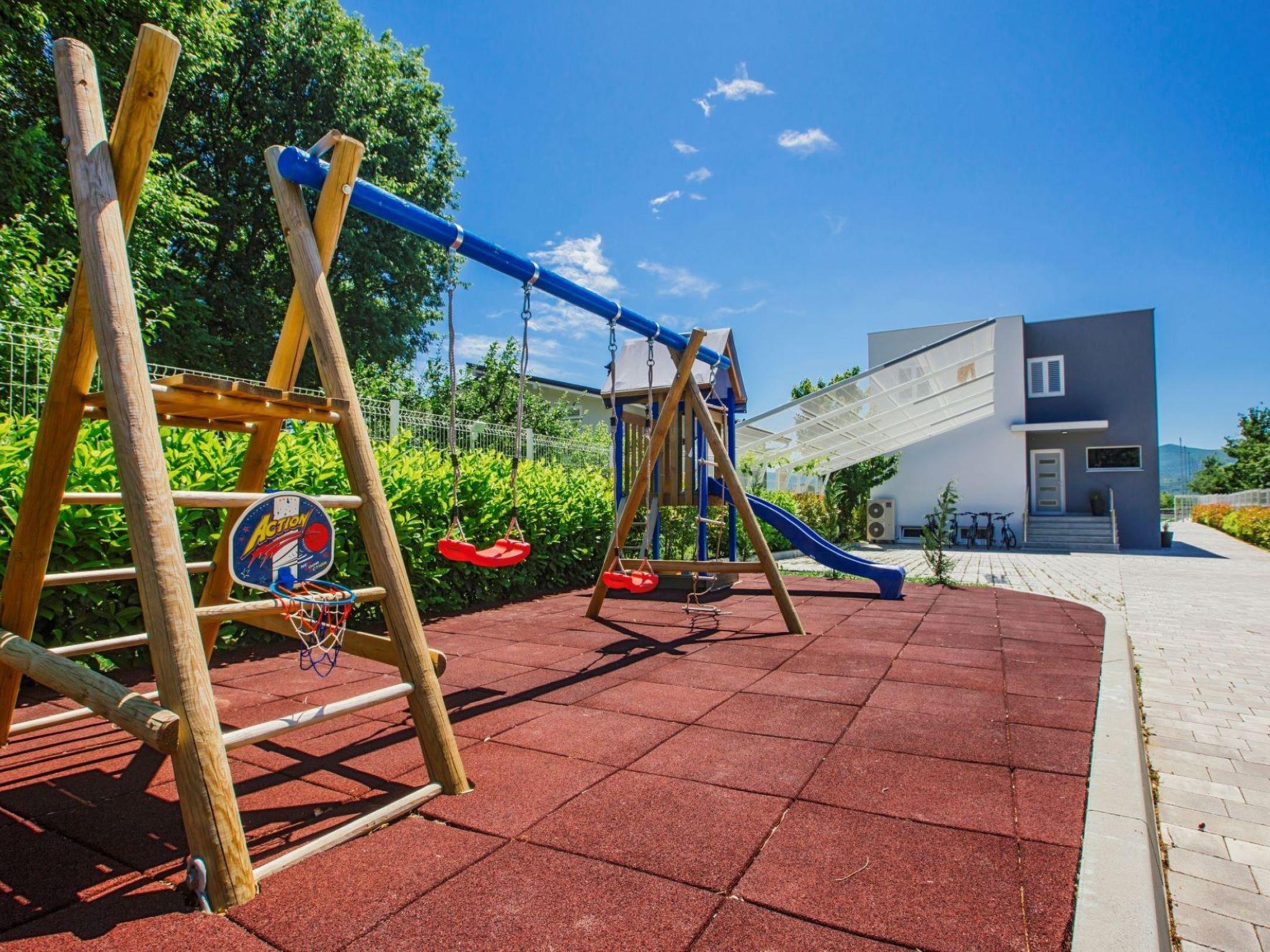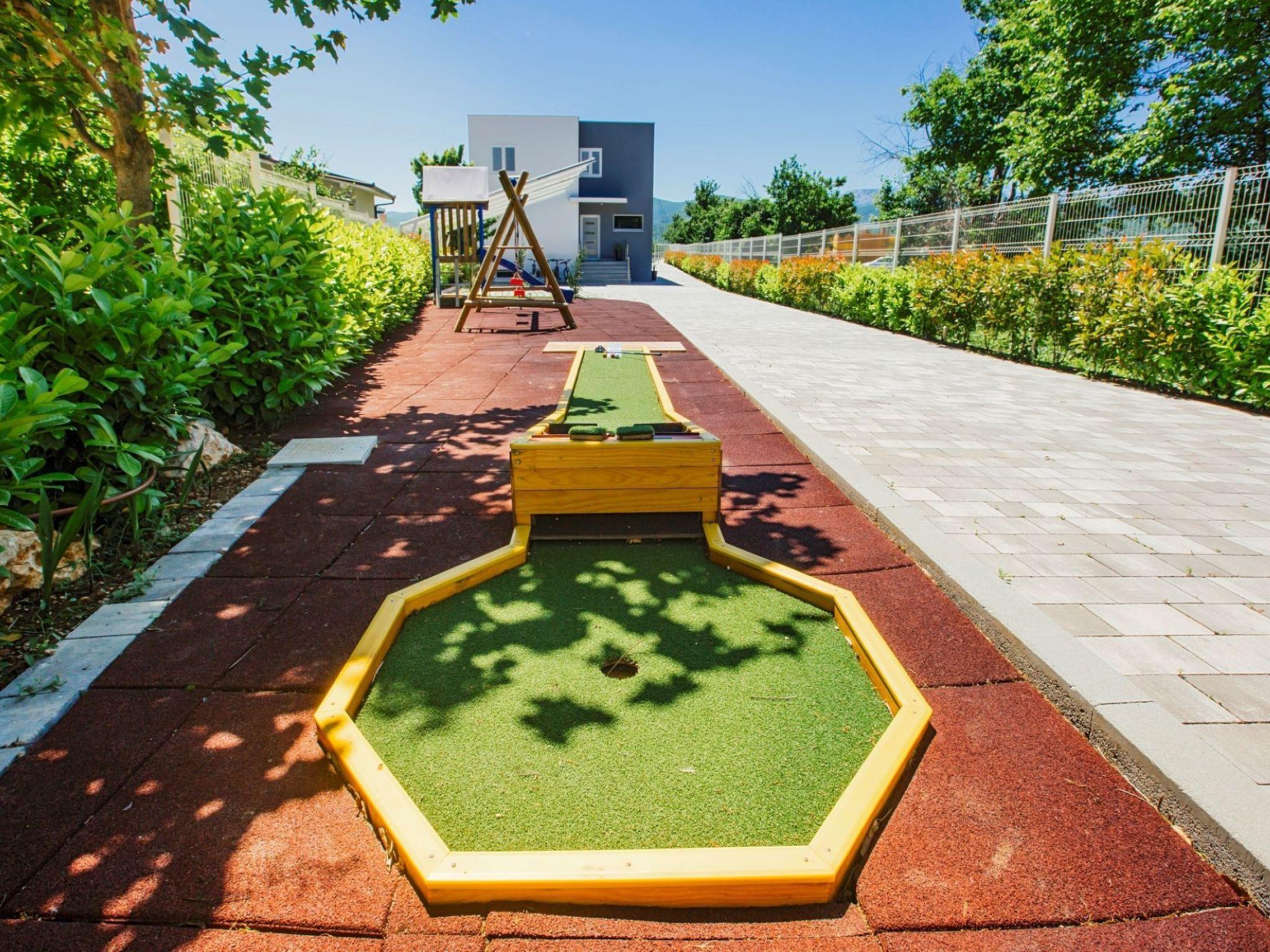 Villa Mandalina.HR is completely fenced and surrounded by green hedges all around. The entrance on the north side leads to a free parking lot for four cars and is part of a landscaped yard where there is a children's playground and a mini-golf course (6 variants of the game). The children's playground on a safe surface is equipped with a swing, a climbing house, a slide and a sandpit.