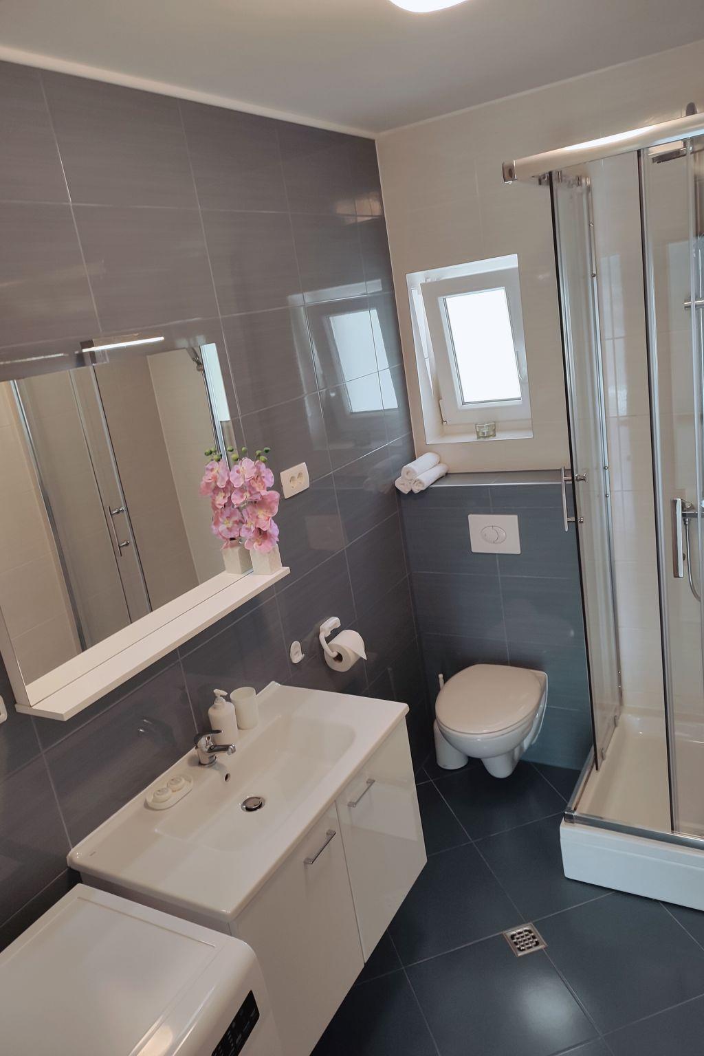 The 48m² apartment can accommodate four people. The centerpiece of the apartment is the spacious living room. It has a comfortable sitting area with a TV and a sofa, which can be converted into a sofa bed (140 x 190cm) for two adults or two children. Right behind the sofa there is a dining space with four chairs. Opposite there is the open kitchen, equipped with a stove, oven, fridge, dishwasher, toaster and kettle. The tiled daylight bathroom provides a shower, WC, washbasin with cupboard underneath, washing machine and an illuminated mirror. The comfortable bedroom has a double bed (160 x 200cm) with two bedside tables and reading lamps, as well as a big wardrobe.
