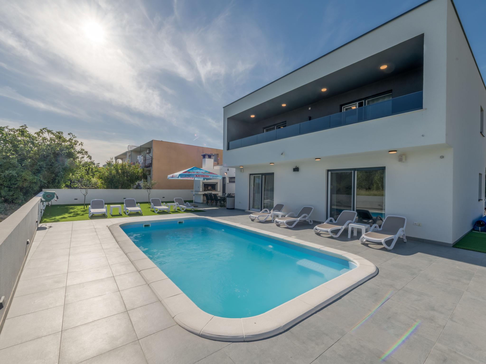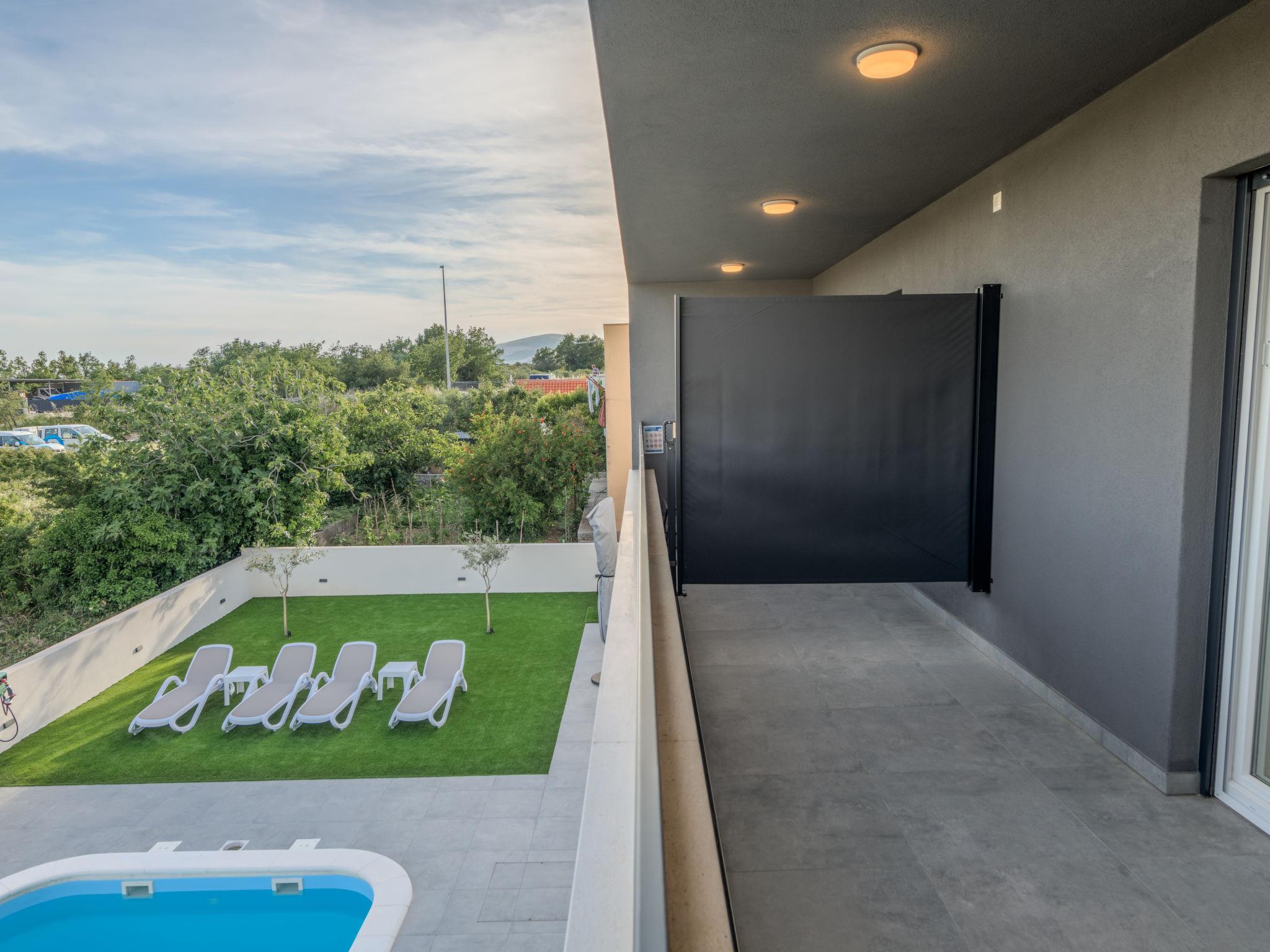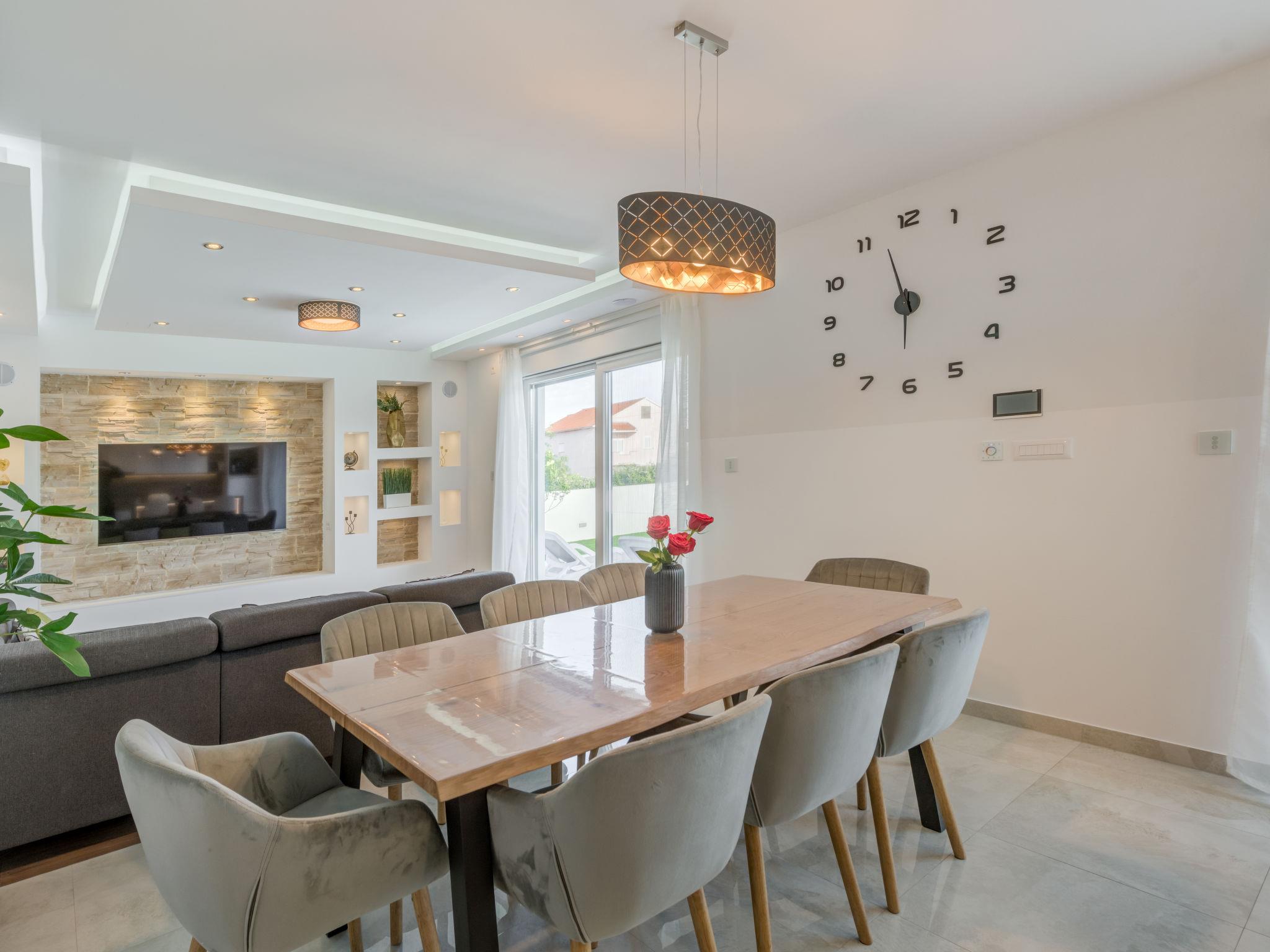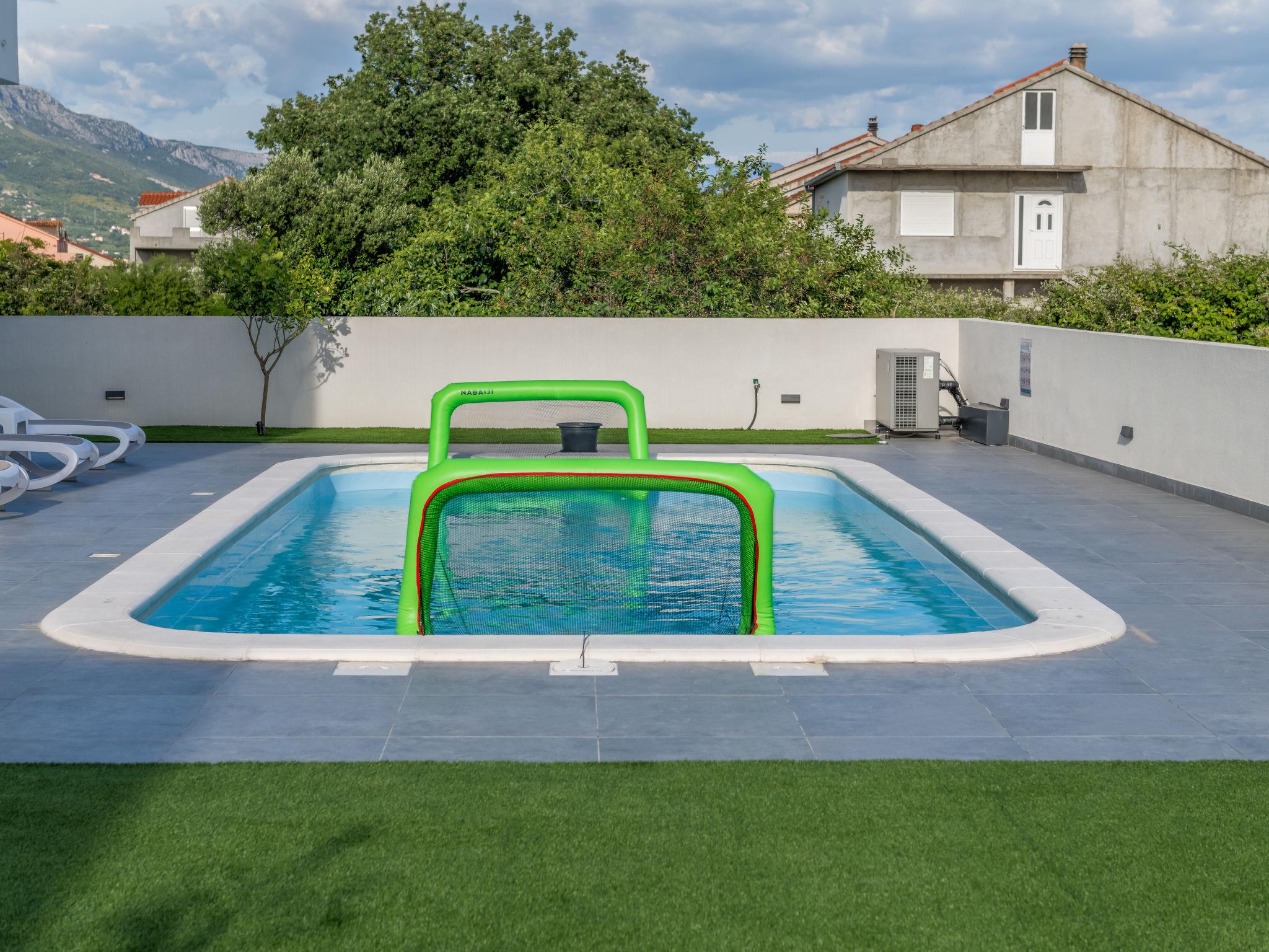 Very modern, beautiful house "Golden strings", 2 storeys, built in 2024. 2.3 km from the centre of Kaštel Novi, 1.3 km from the sea, 1.3 km from the beach, in a cul-de-sac. Private: property 500 m2 (fenced), swimming pool angular, heated (28 m2, depth 145 cm, seasonal availability: 01.Jan. - 31.Dec.) with internal staircase. WC in the pool area, outdoor shower, terrace (100 m2), garden furniture, barbecue, pool maintenance by the owner/gardener. In the house: internet access, washing machine, tumble dryer. Parking (for 4 cars) at the house on the premises, single garage. Supermarket 600 m, restaurant 2.1 km, café 2.1 km, bus stop 500 m, pebble beach 1.3 km. Please note: airfield close by 3.3 km from the property. Neighbourhood highly sensitive to noise. Quietness and good behaviour expected.