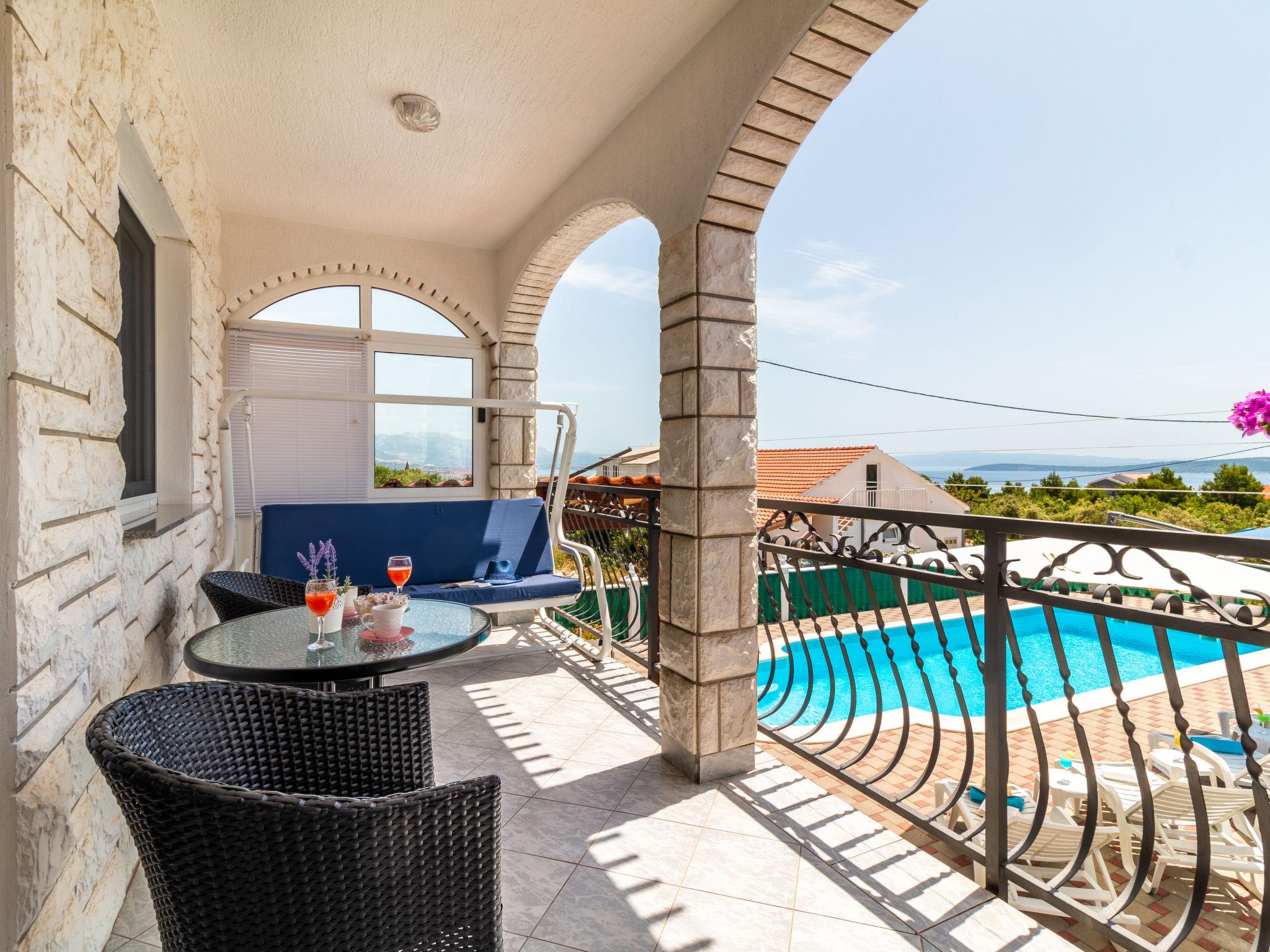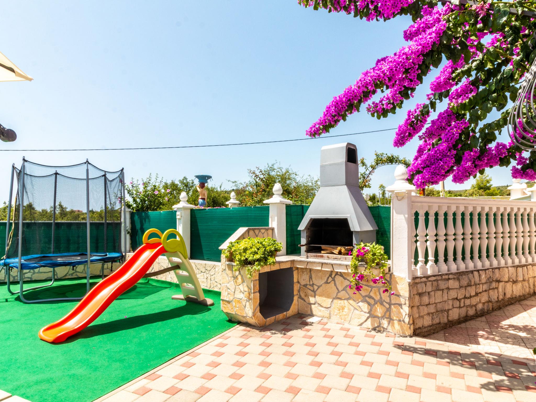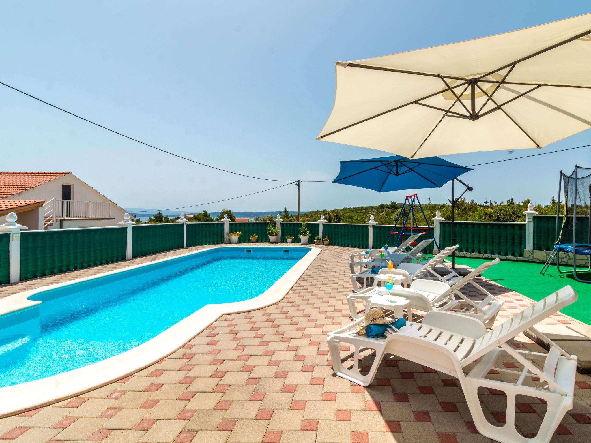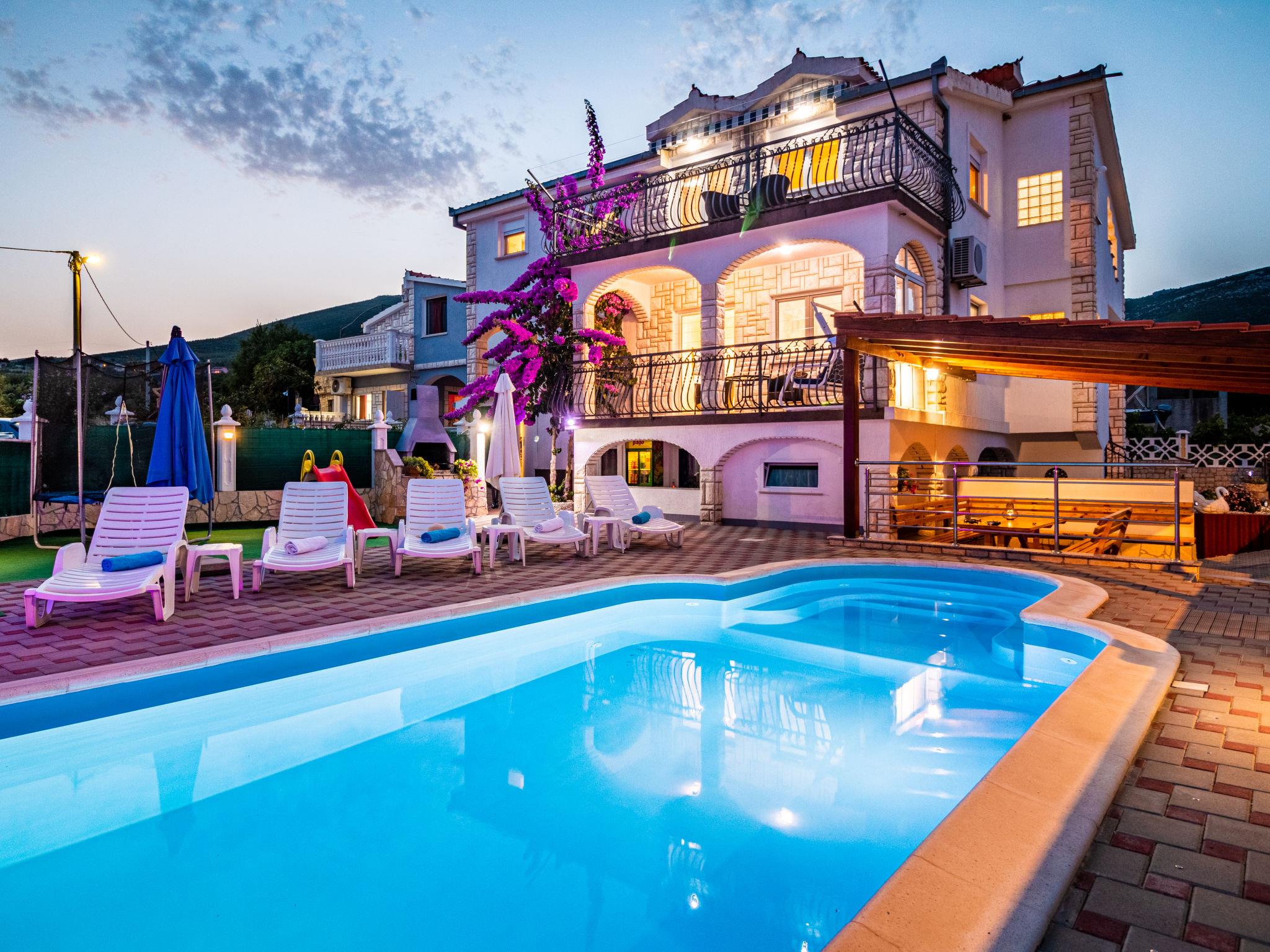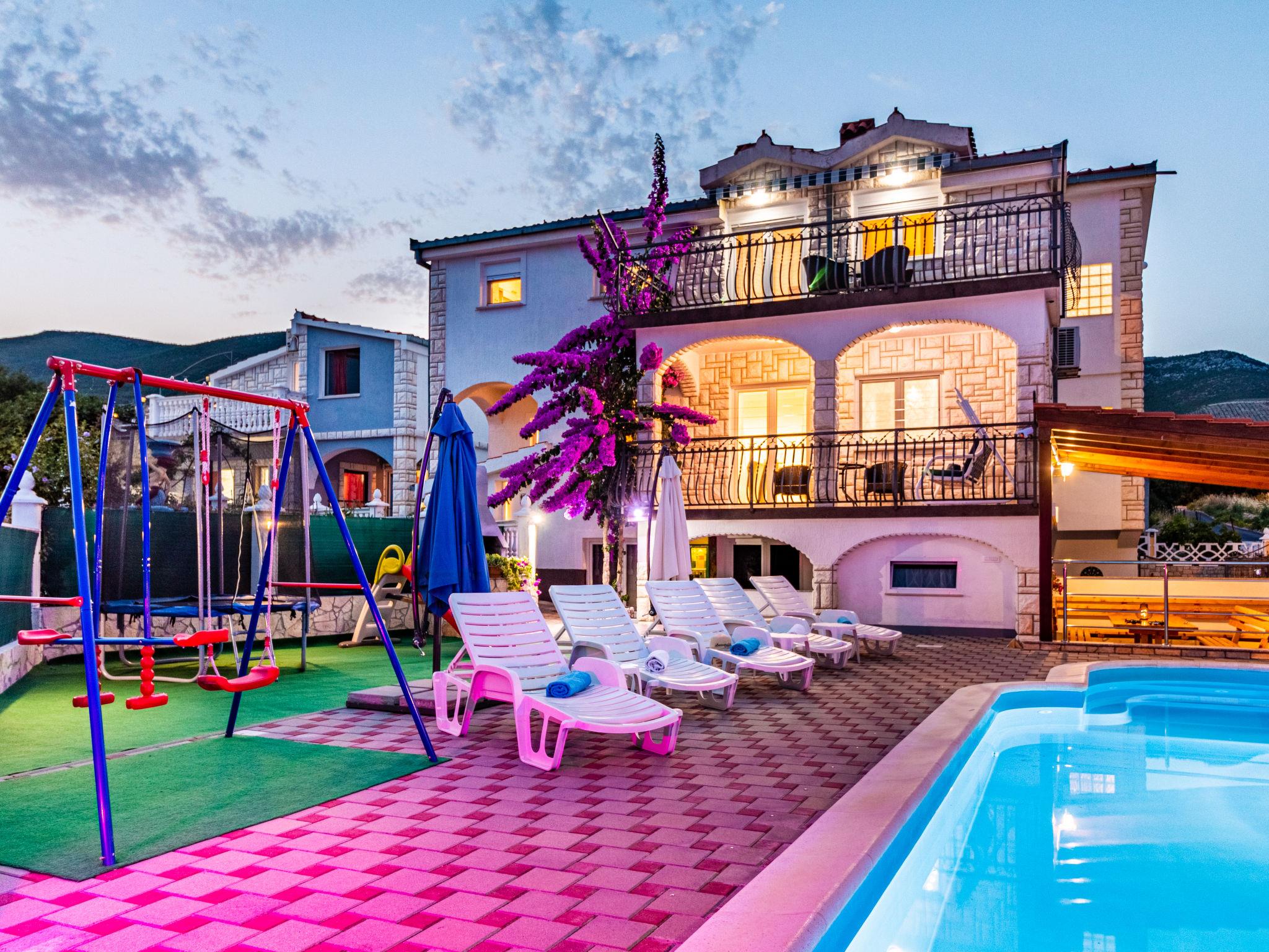3-family house "Josipa". 2.8 km from the centre of Kaštel Novi, in a quiet, sunny position, 2.5 km from the sea. Private: property 600 m2 (fenced), swimming pool kidney shaped (7 x 3 m, depth 150 cm, seasonal availability: 01.Jun. - 01.Oct.) with internal staircase. Outdoor shower, terrace (30 m2), garden furniture, barbecue, children's playground (swing). In the house: internet access, table football, trampoline, washing machine. Parking (for 3 cars) at the house on the premises. Shop 250 m, restaurant 1.5 km, bus stop 1.1 km, pebble beach 2.5 km. Groups of teenagers on request only. Neighbourhood highly sensitive to noise. Quietness and good behaviour expected.