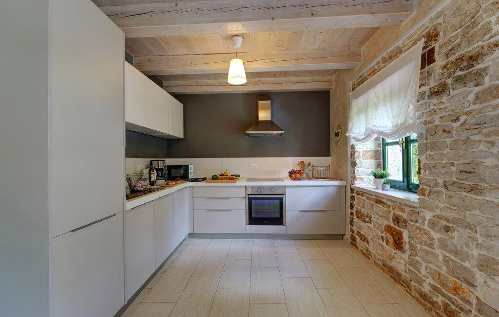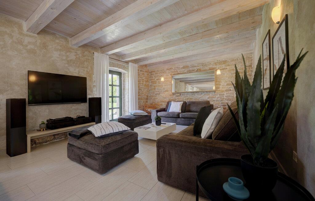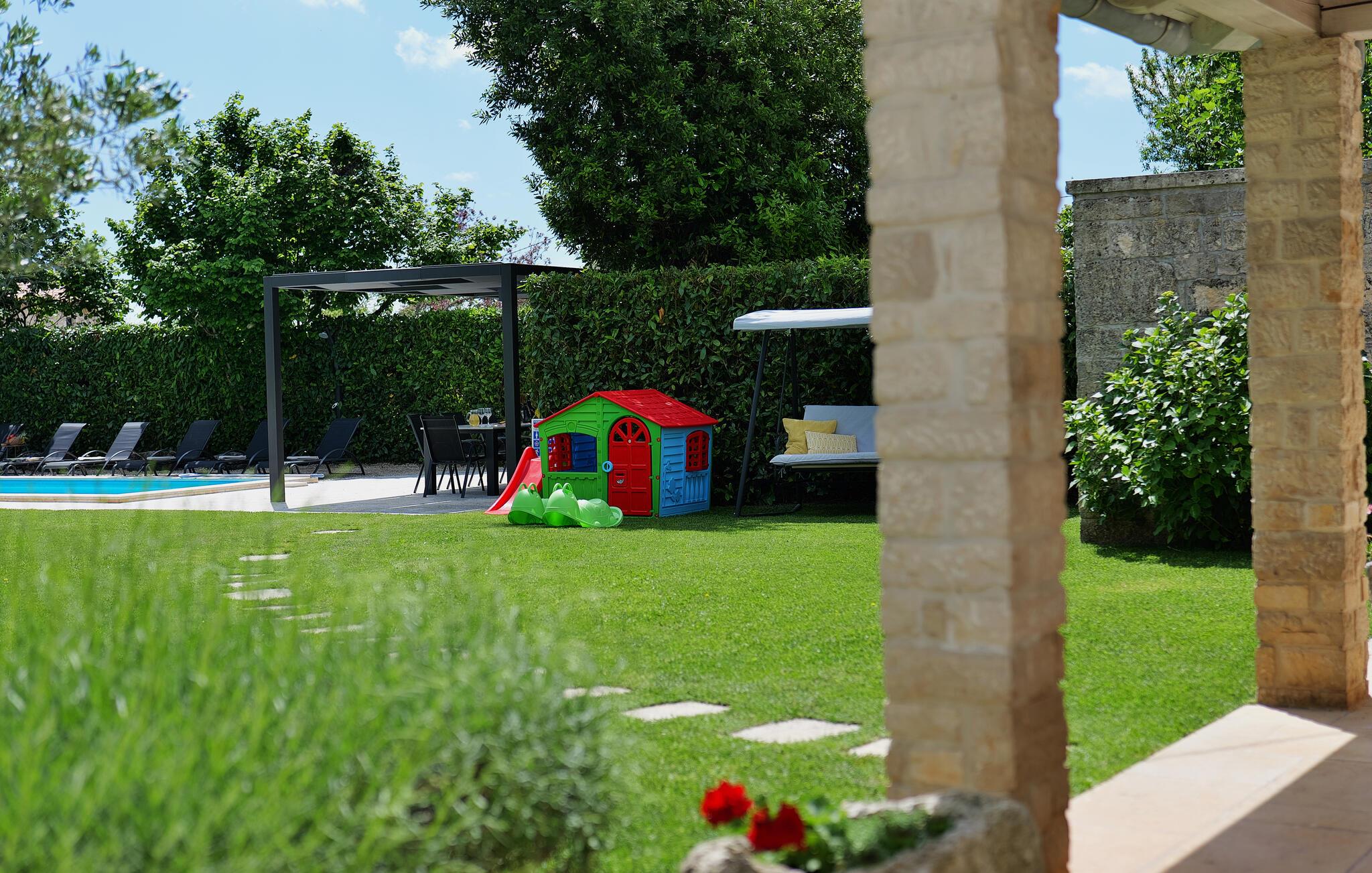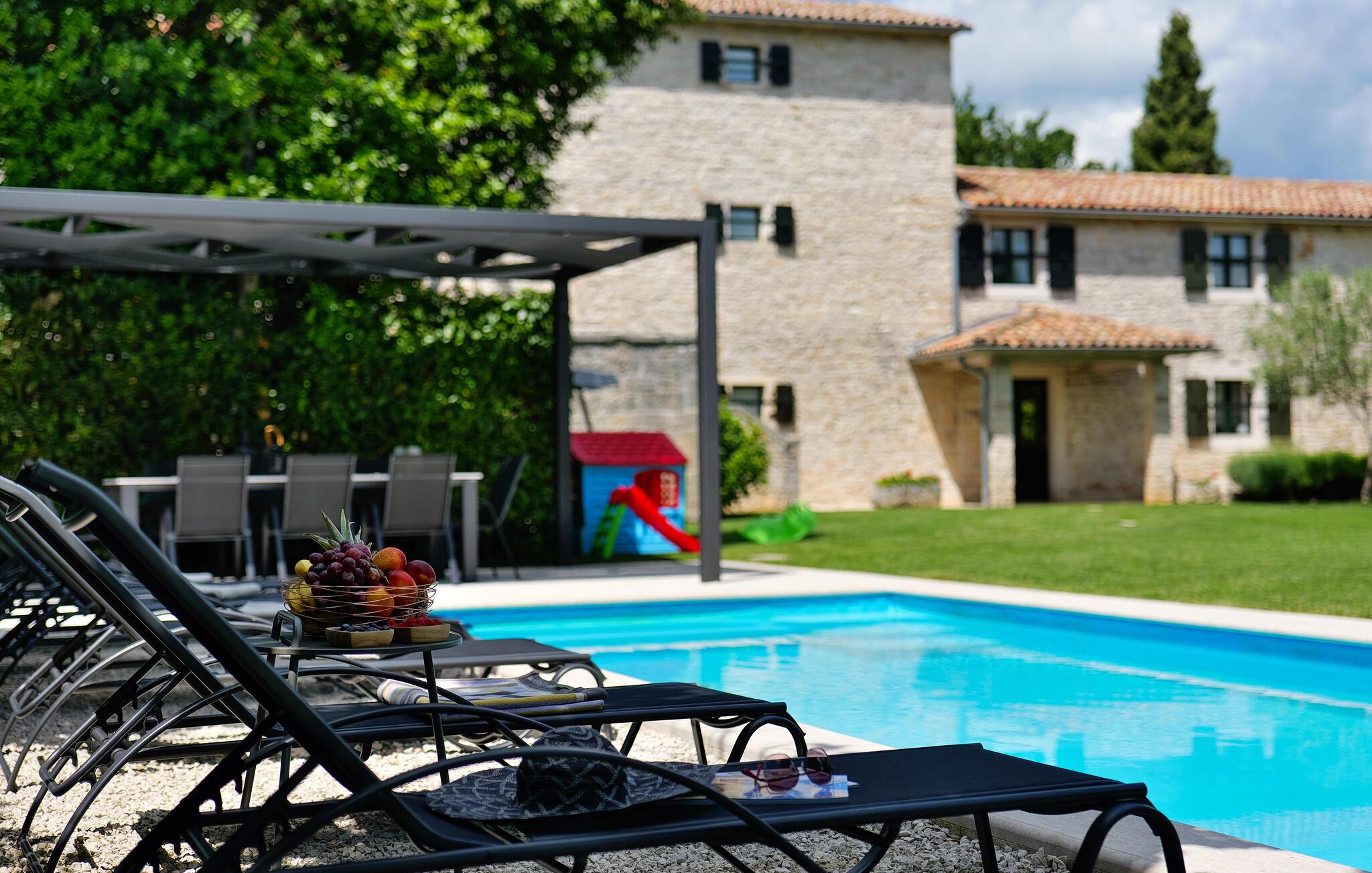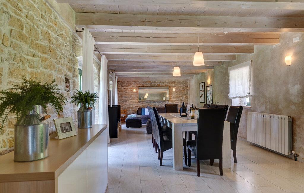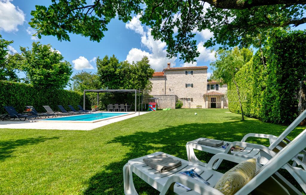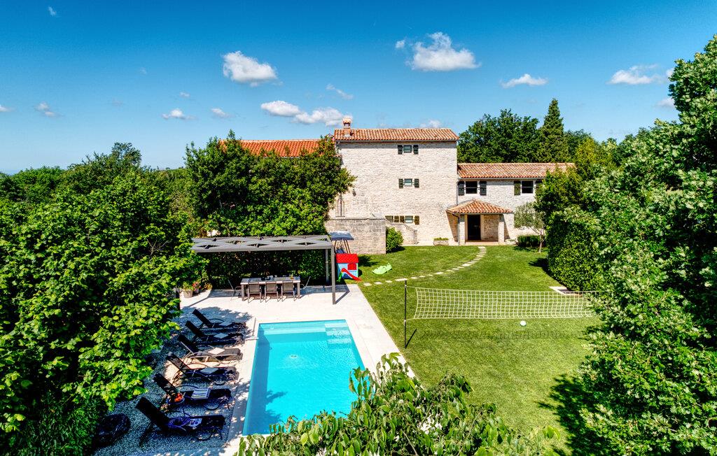 Dette landhus er moderniseret og renoveret og fremstår nu som en særdeles komfortabel feriebolig. Det er bygget i lokal stil med sten og træ, indrettet med alt til en vellykket ferie. I stueplan ligger stue og spisestue, samt et stort veludstyret køkken og toilet, på øverste etage ligger soveværelserne. I haven bag ved huset ligger den indbydende swimmingpool, hvor I med garanti, vil tilbringe mange af feriens kostbareste stunder. På den overdækkede terrasse, står grillen, så I behøver at bruge mindst mulig tid indendørs. I haven er der legeredskaber, samt plæner hvor I kan spille volleyball og badminton. På husets forside er endnu en terrasse, der egner sig fint til familiens morgenkaffe. Besøg feriebyerne Porec og Rovinj, ca. 20 km fra feriehuset. Besøg også den lille by Dvigrad med interessante ruiner fra middelalderen. Lige I nærheden ligger en klippevæg som besøges af sportsklatrere fra hele Europa.