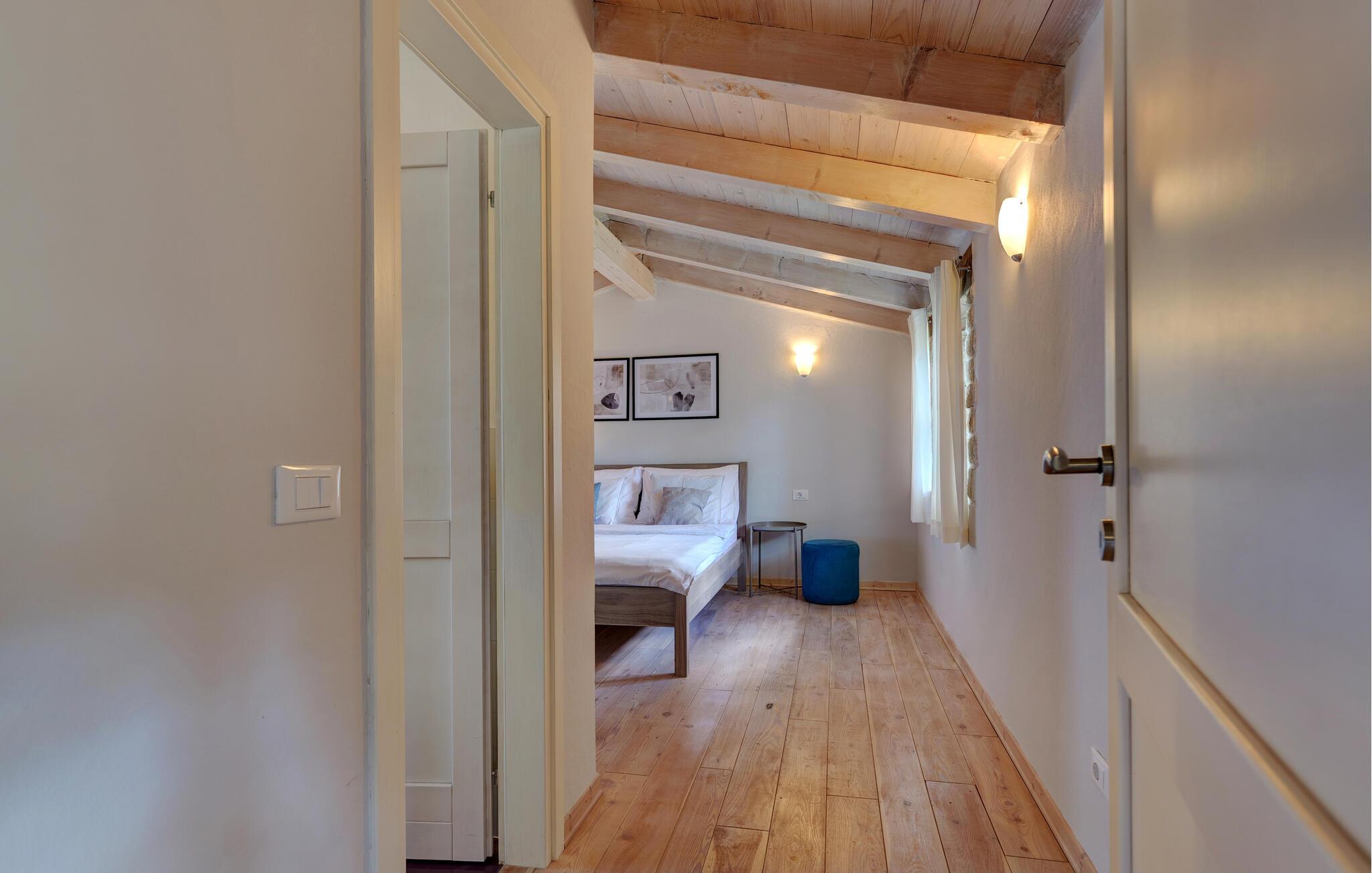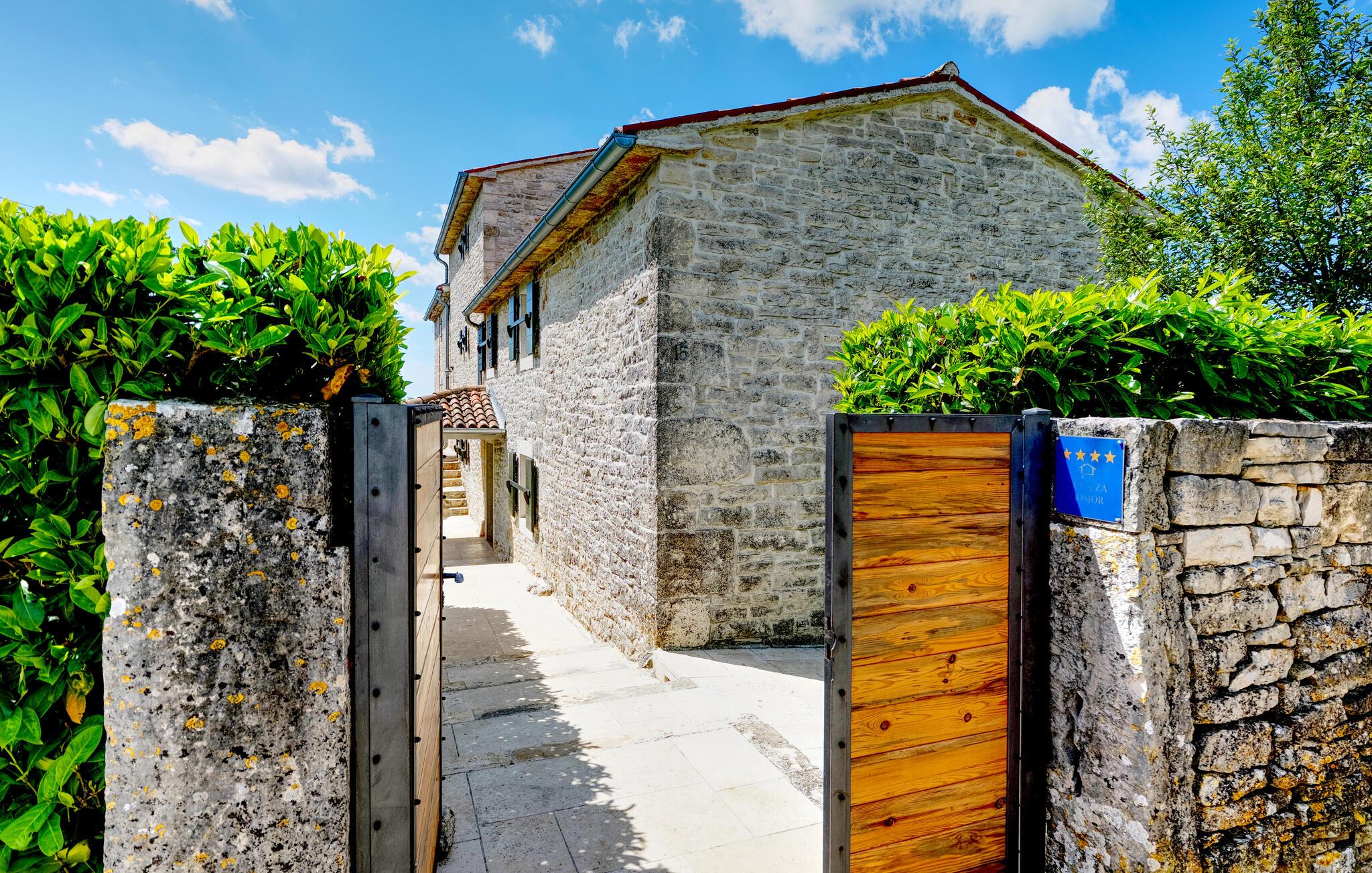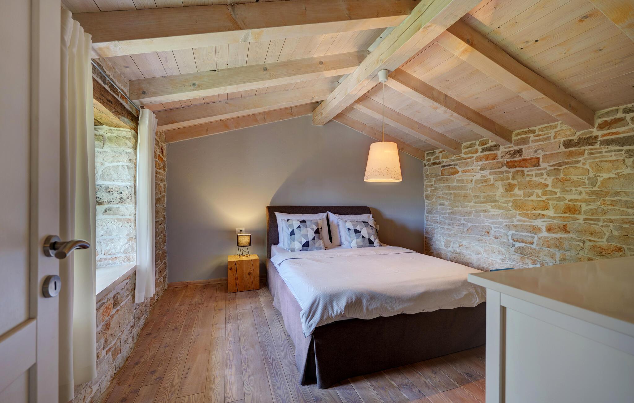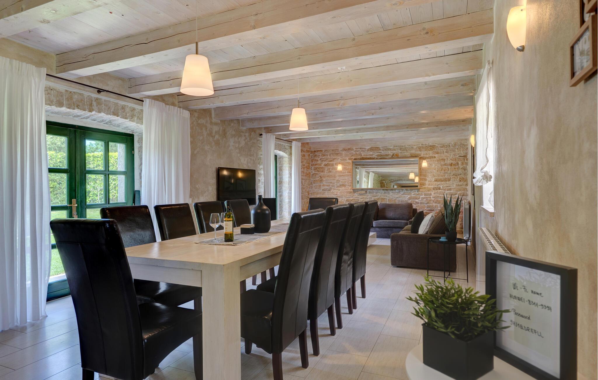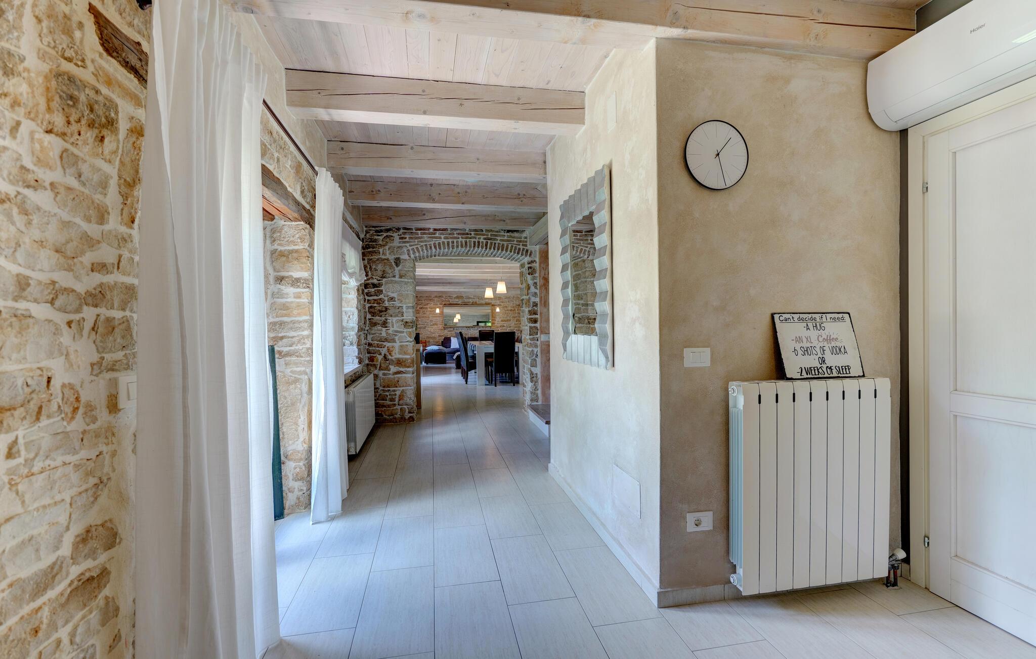 Dette landhus er moderniseret og renoveret og fremstår nu som en særdeles komfortabel feriebolig. Det er bygget i lokal stil med sten og træ, indrettet med alt til en vellykket ferie. I stueplan ligger stue og spisestue, samt et stort veludstyret køkken og toilet, på øverste etage ligger soveværelserne. I haven bag ved huset ligger den indbydende swimmingpool, hvor I med garanti, vil tilbringe mange af feriens kostbareste stunder. På den overdækkede terrasse, står grillen, så I behøver at bruge mindst mulig tid indendørs. I haven er der legeredskaber, samt plæner hvor I kan spille volleyball og badminton. På husets forside er endnu en terrasse, der egner sig fint til familiens morgenkaffe. Besøg feriebyerne Porec og Rovinj, ca. 20 km fra feriehuset. Besøg også den lille by Dvigrad med interessante ruiner fra middelalderen. Lige I nærheden ligger en klippevæg som besøges af sportsklatrere fra hele Europa.