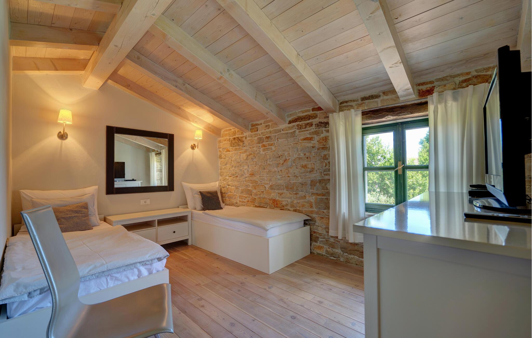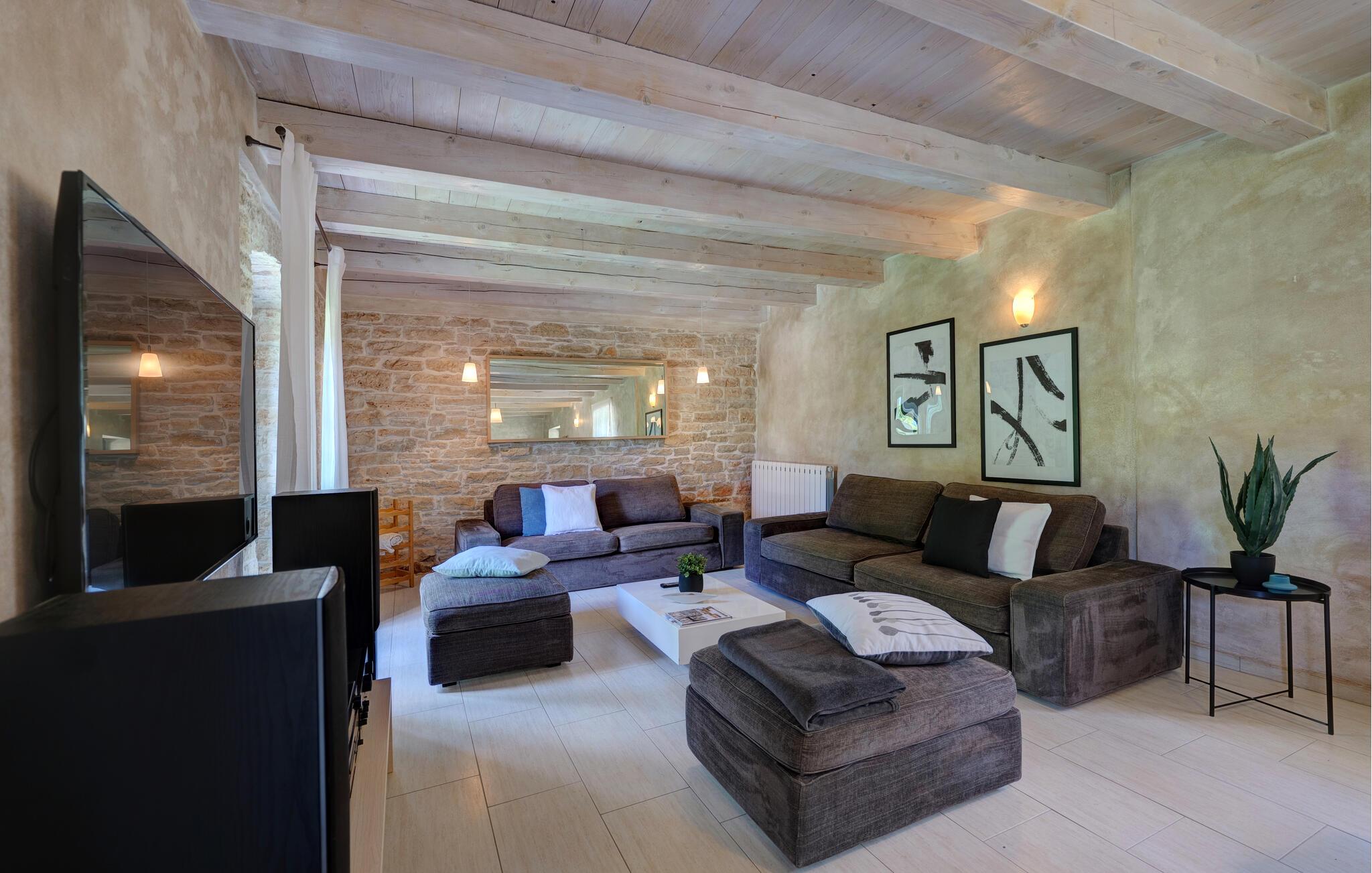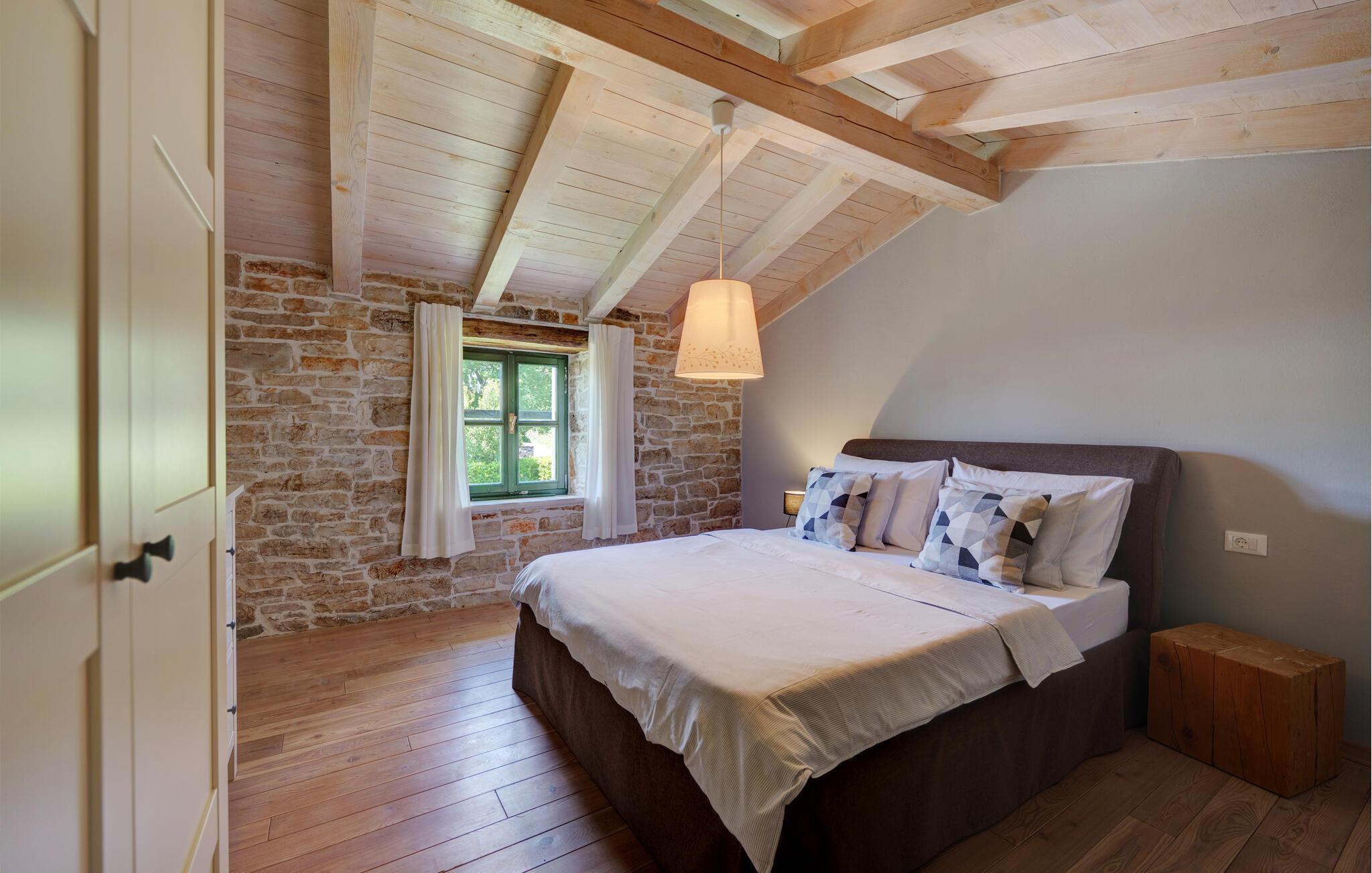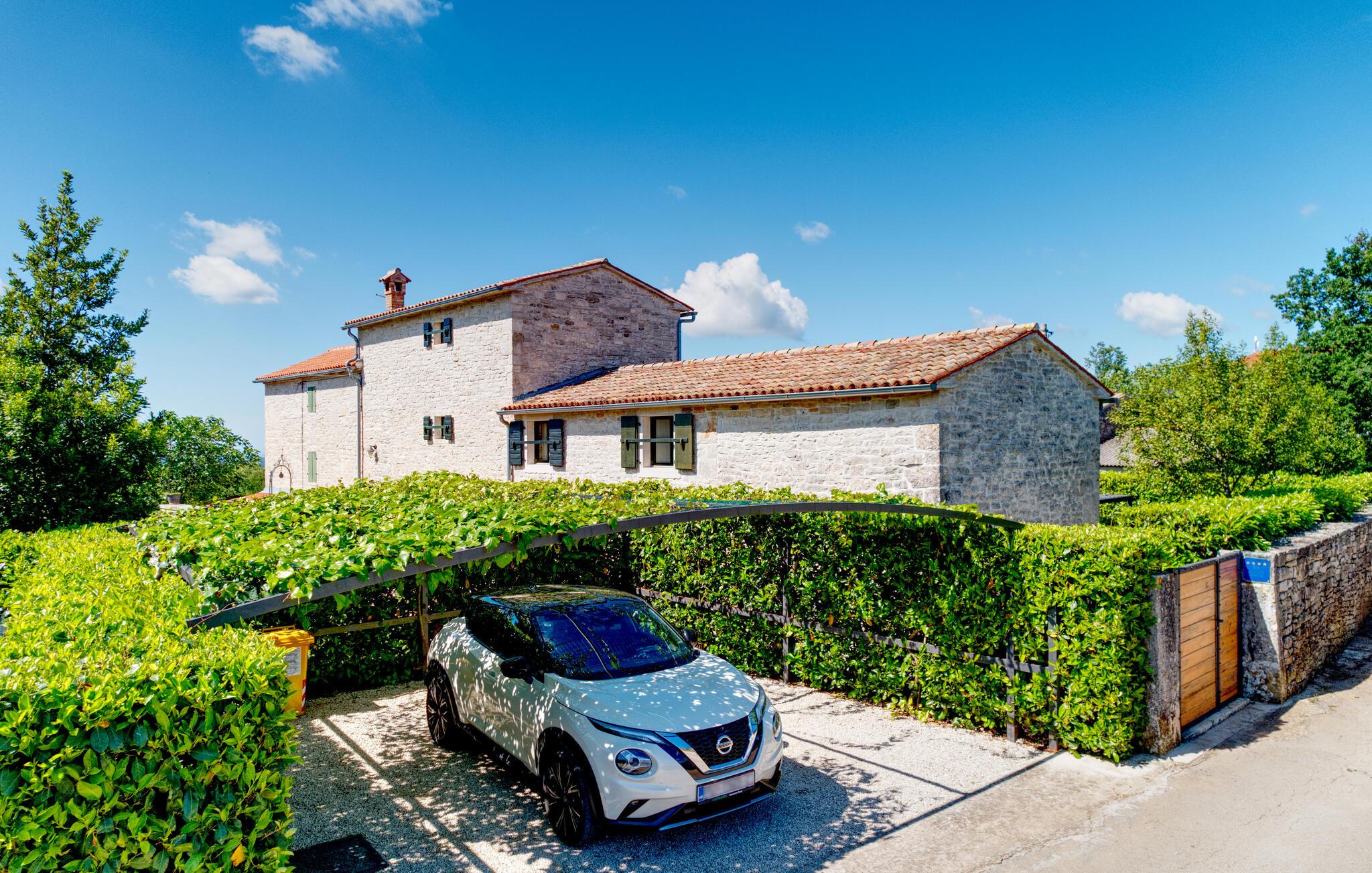 Dette landhus er moderniseret og renoveret og fremstår nu som en særdeles komfortabel feriebolig. Det er bygget i lokal stil med sten og træ, indrettet med alt til en vellykket ferie. I stueplan ligger stue og spisestue, samt et stort veludstyret køkken og toilet, på øverste etage ligger soveværelserne. I haven bag ved huset ligger den indbydende swimmingpool, hvor I med garanti, vil tilbringe mange af feriens kostbareste stunder. På den overdækkede terrasse, står grillen, så I behøver at bruge mindst mulig tid indendørs. I haven er der legeredskaber, samt plæner hvor I kan spille volleyball og badminton. På husets forside er endnu en terrasse, der egner sig fint til familiens morgenkaffe. Besøg feriebyerne Porec og Rovinj, ca. 20 km fra feriehuset. Besøg også den lille by Dvigrad med interessante ruiner fra middelalderen. Lige I nærheden ligger en klippevæg som besøges af sportsklatrere fra hele Europa.