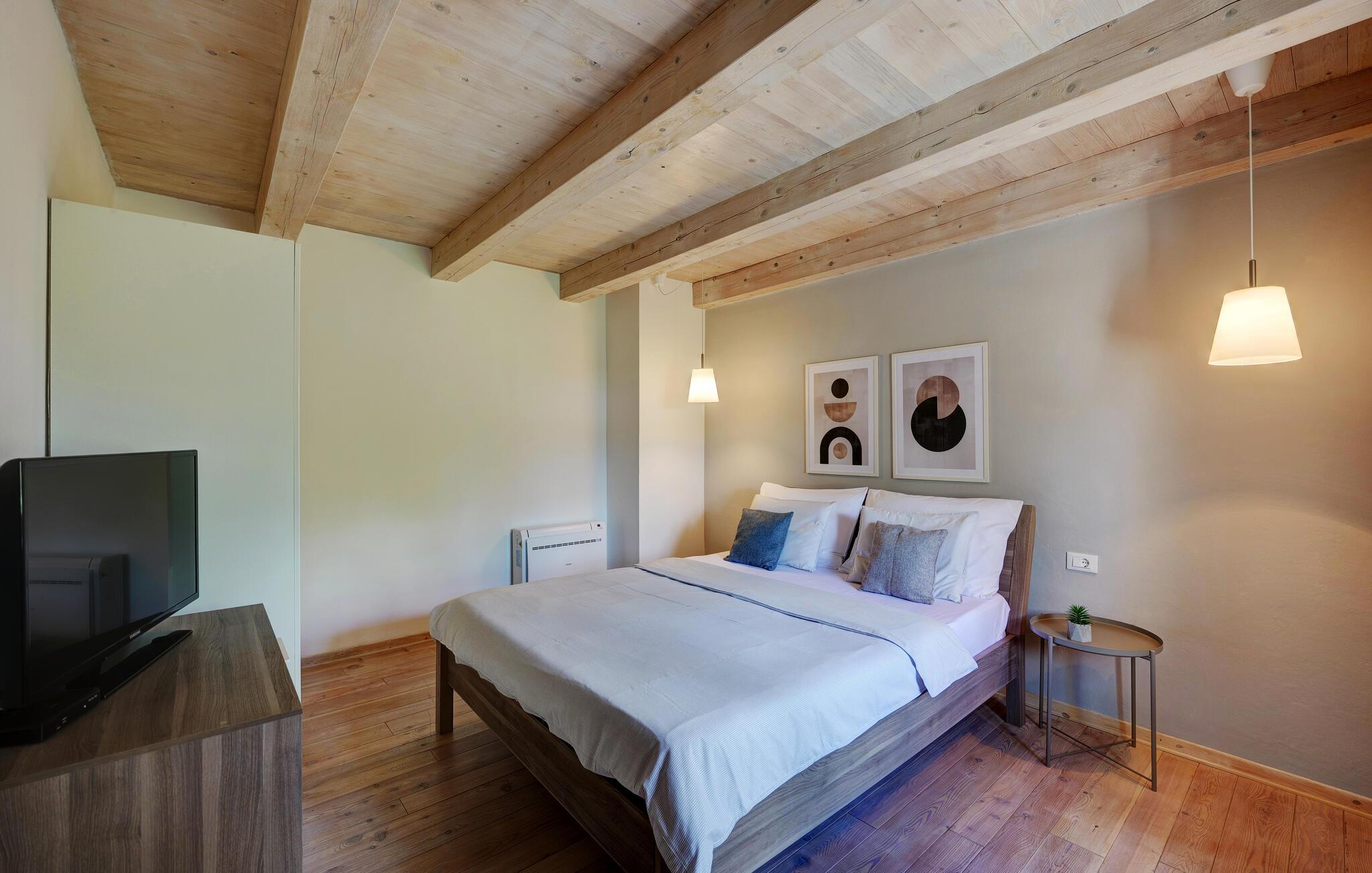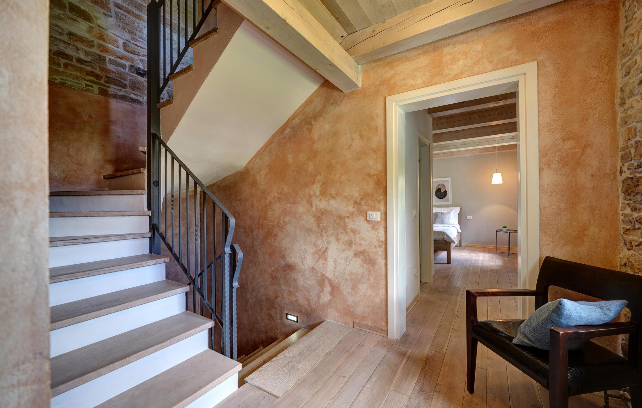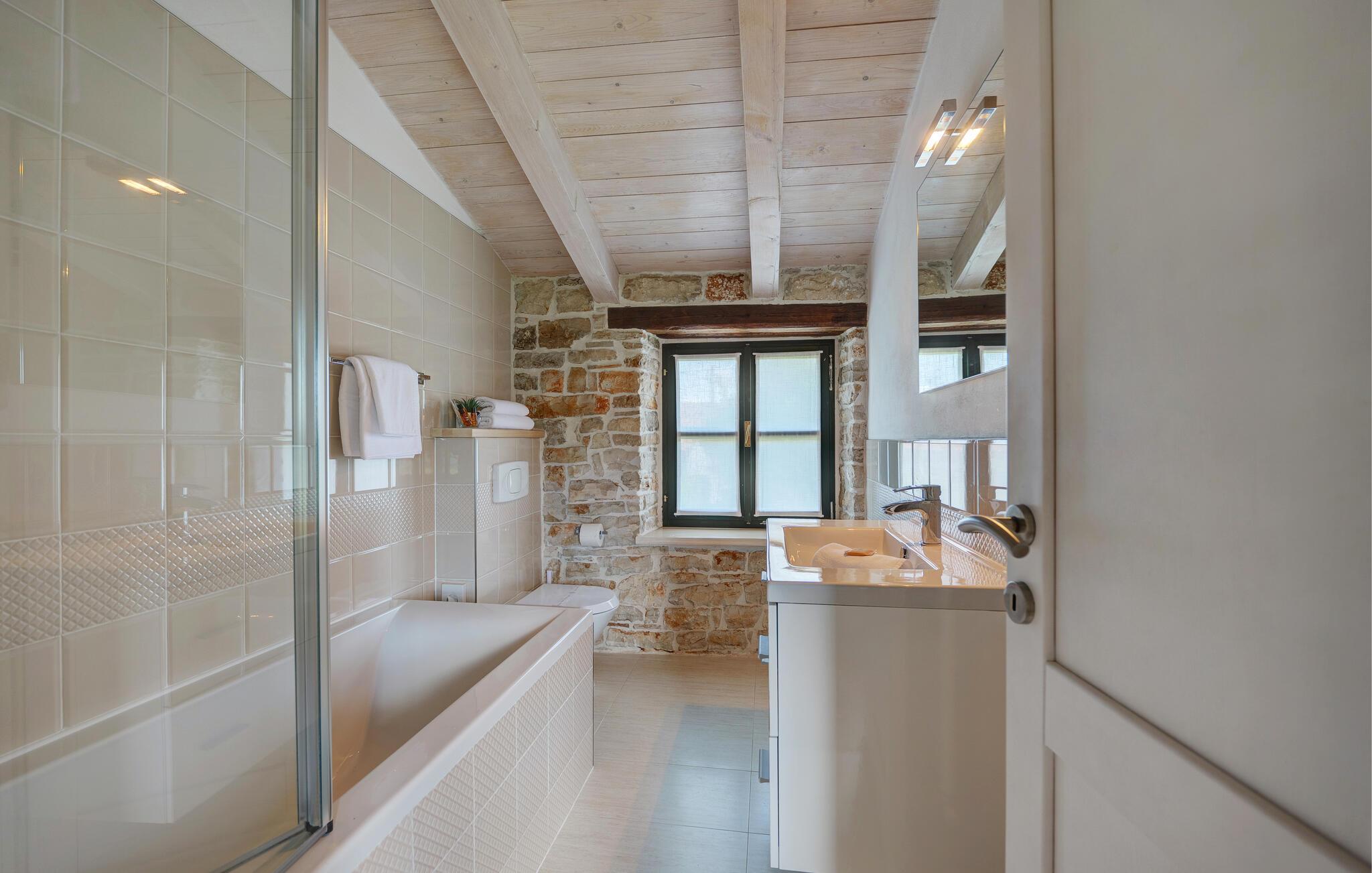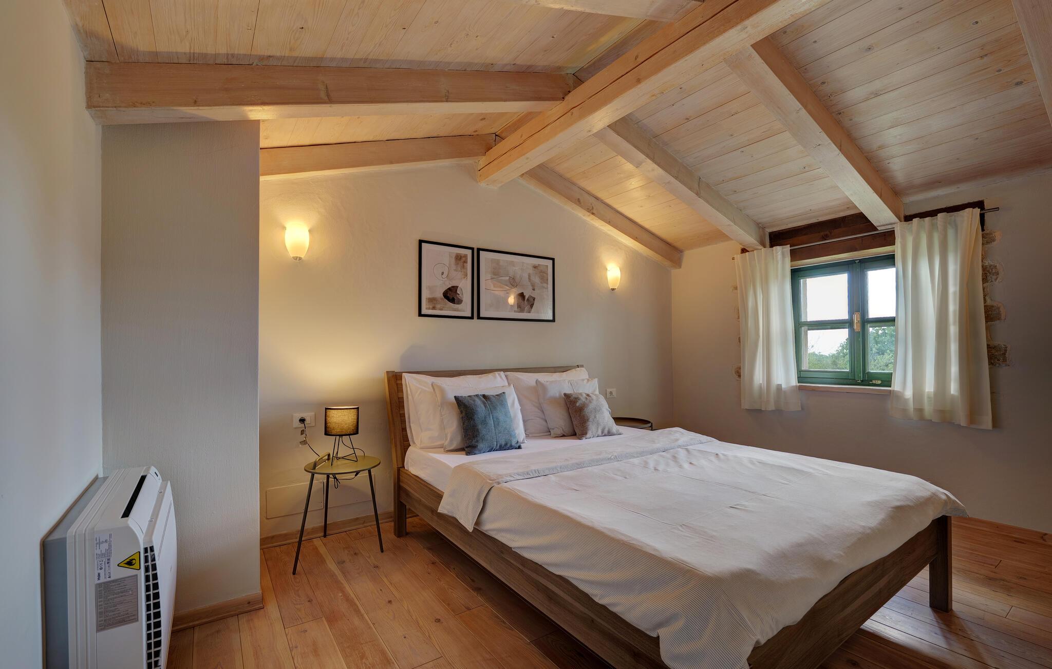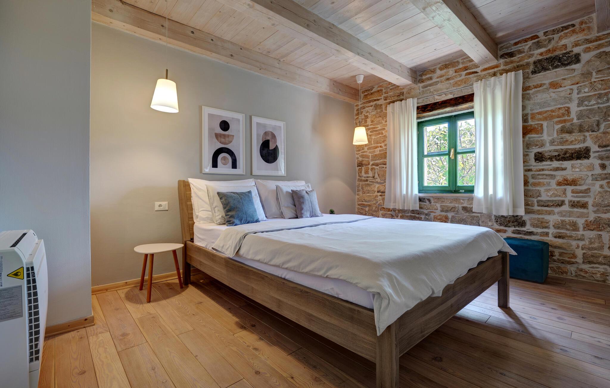 Dette landhus er moderniseret og renoveret og fremstår nu som en særdeles komfortabel feriebolig. Det er bygget i lokal stil med sten og træ, indrettet med alt til en vellykket ferie. I stueplan ligger stue og spisestue, samt et stort veludstyret køkken og toilet, på øverste etage ligger soveværelserne. I haven bag ved huset ligger den indbydende swimmingpool, hvor I med garanti, vil tilbringe mange af feriens kostbareste stunder. På den overdækkede terrasse, står grillen, så I behøver at bruge mindst mulig tid indendørs. I haven er der legeredskaber, samt plæner hvor I kan spille volleyball og badminton. På husets forside er endnu en terrasse, der egner sig fint til familiens morgenkaffe. Besøg feriebyerne Porec og Rovinj, ca. 20 km fra feriehuset. Besøg også den lille by Dvigrad med interessante ruiner fra middelalderen. Lige I nærheden ligger en klippevæg som besøges af sportsklatrere fra hele Europa.