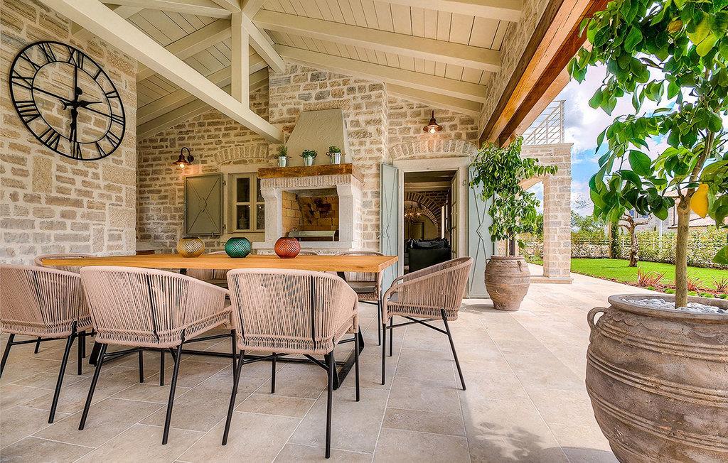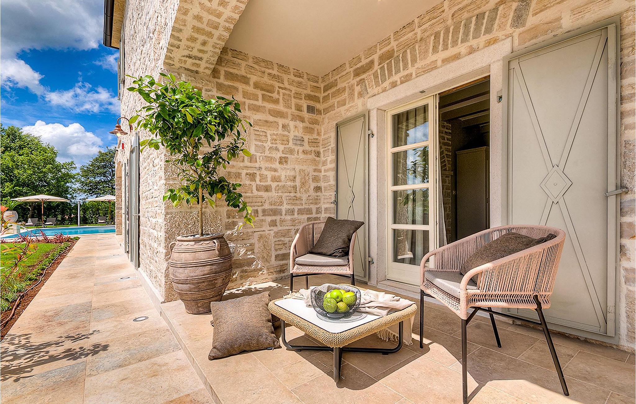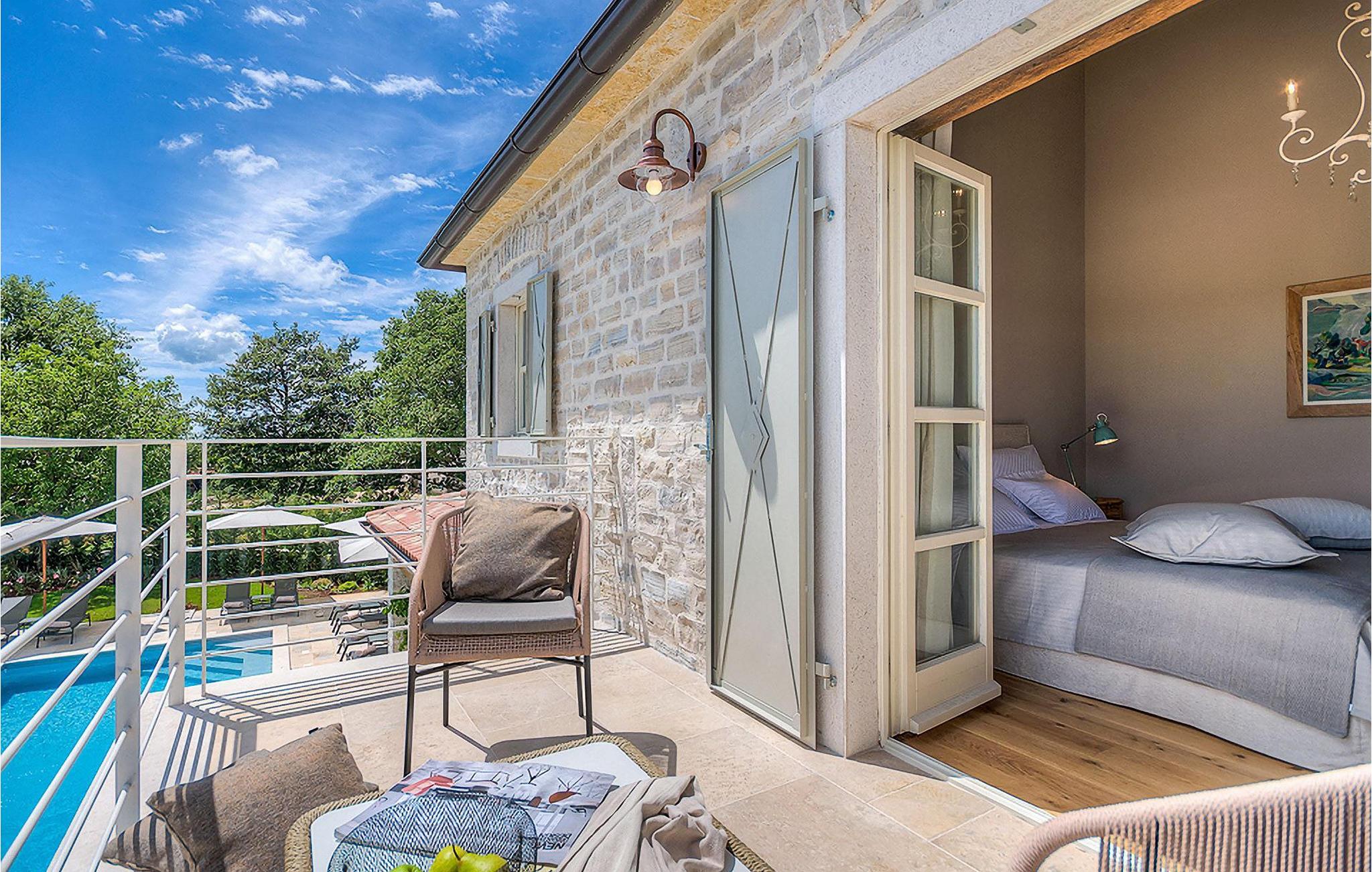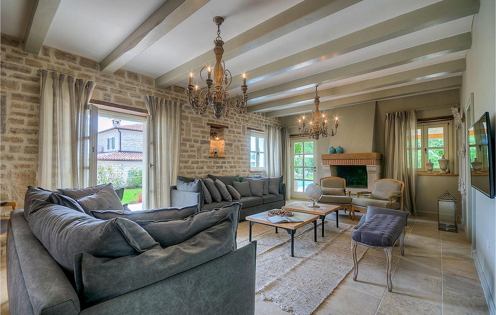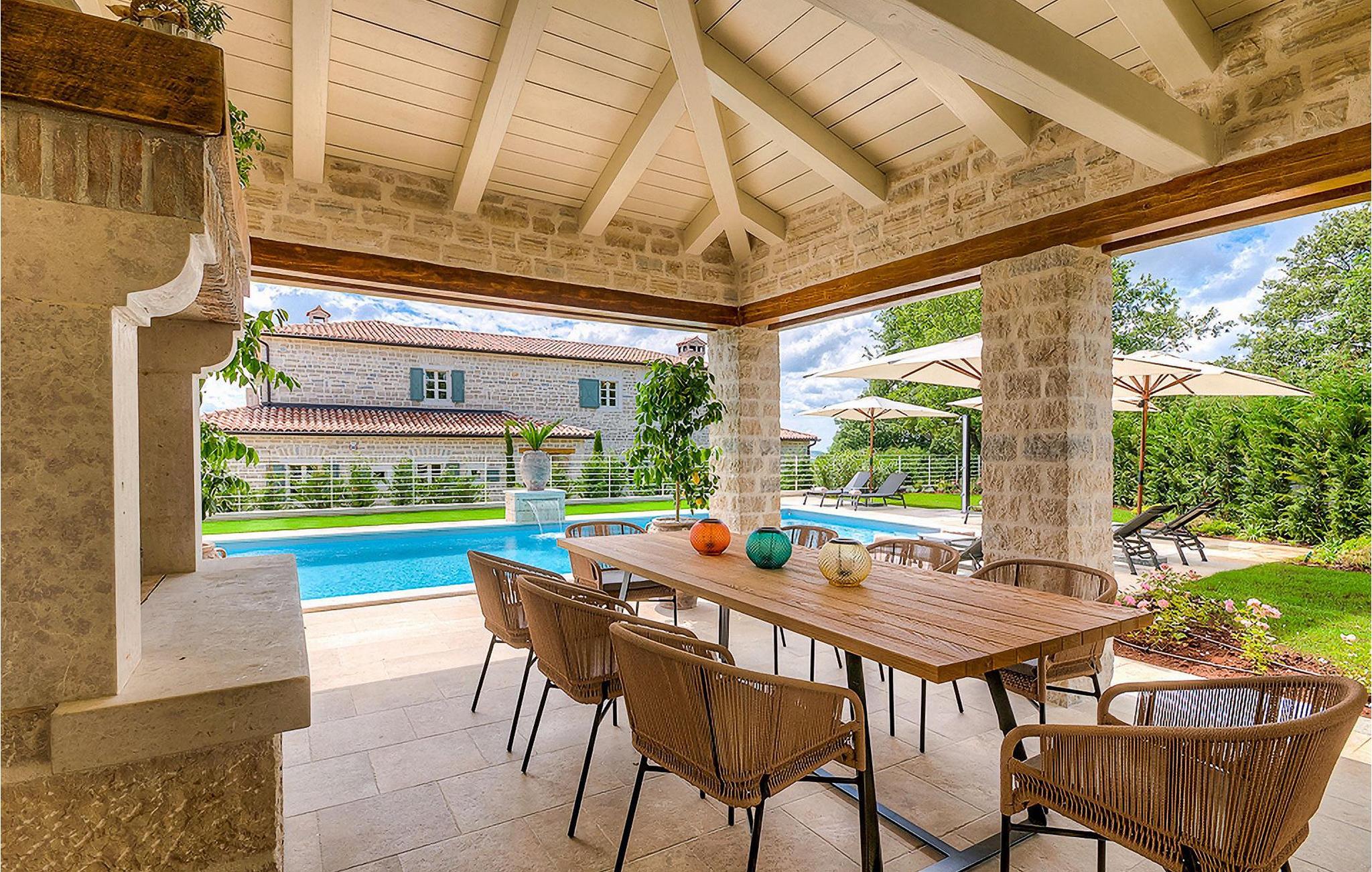 Elegant, stilvoll und hervorragend gelegen, inmitten der pittoresken Landschaft Istriens und doch noch in der Nähe von sonnigen Stränden und lebendigen Küstenstädten, bietet die Villa Elena luxuriöse Unterkunft, in der Sie jede Minute Ihres Urlaubs entspannt genießen können. Das Erdgeschoss ist ganz dem aufwändigen Verweilen gewidmet. Der herrliche großzügig ausgelegte Raum ist durch einen Steinbogen in Wohn-, Ess- und Kochbereiche verteilt, mit riesigen Fenstertüren, die eine Fülle an warmem istrischem Licht hineinbringen. Natursteinwände, Holzbalkendecken und der herrliche offene Kamin schaffen eine warme, gemütliche Atmosphäre, während die Mischung aus modernen und Vintage-Möbeln, sowie die exquisite Ausstattung Sie mit erstklassigem Komfort versorgen. Drei Schlafzimmer sind über die obere Etage verteilt, während das vierte im Erdgeschoss direkt auf den verlockenden Privatpool öffnen, der wunderbare Ort zum Erholen und Entspannen. Die hübsche, überdachte Veranda mit dem authentischen eingebauten Grill und einem großen Esstisch ist eine attraktive Zuflucht von der Sommerhitze, sowie der perfekte Ort für genussvolle Mahlzeiten im Freien.