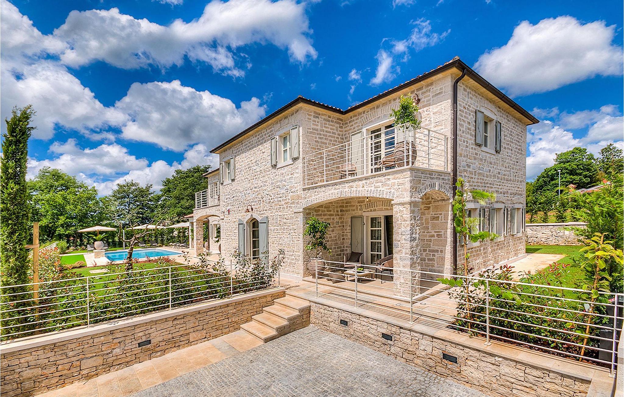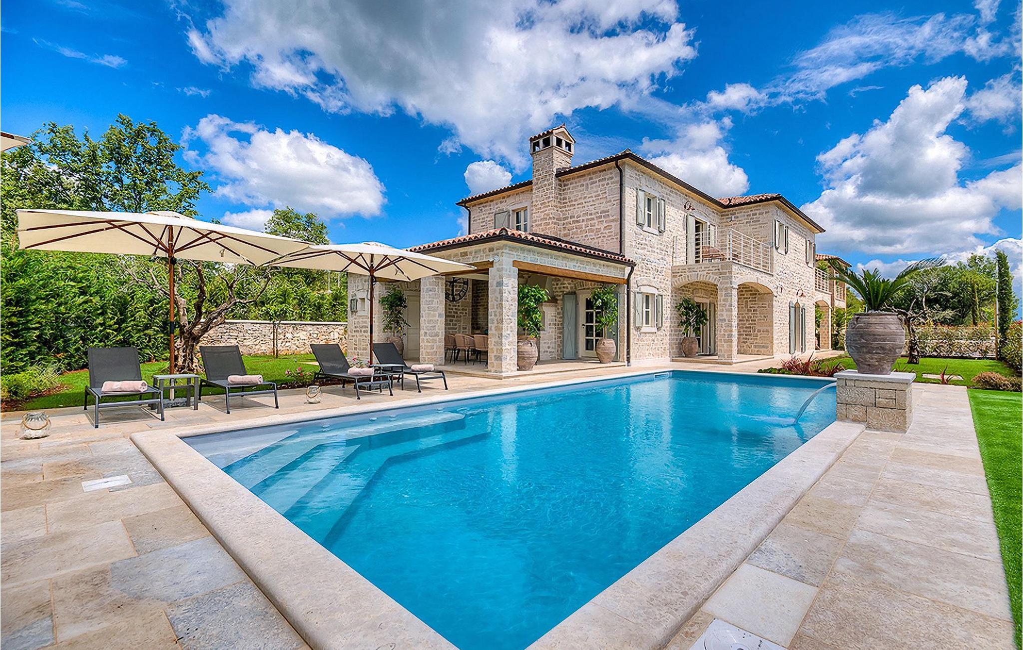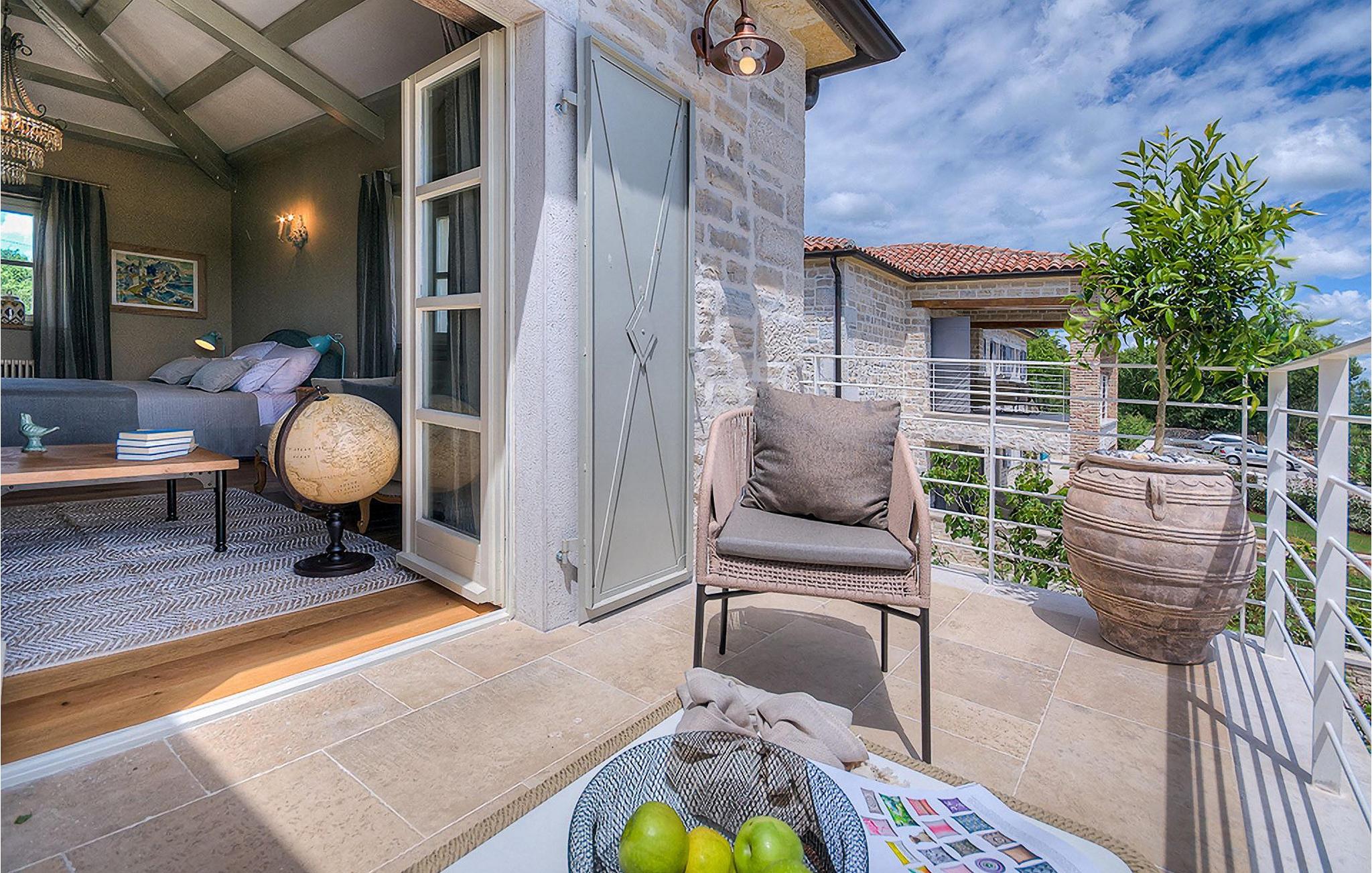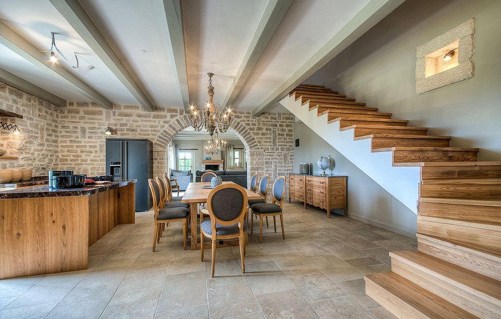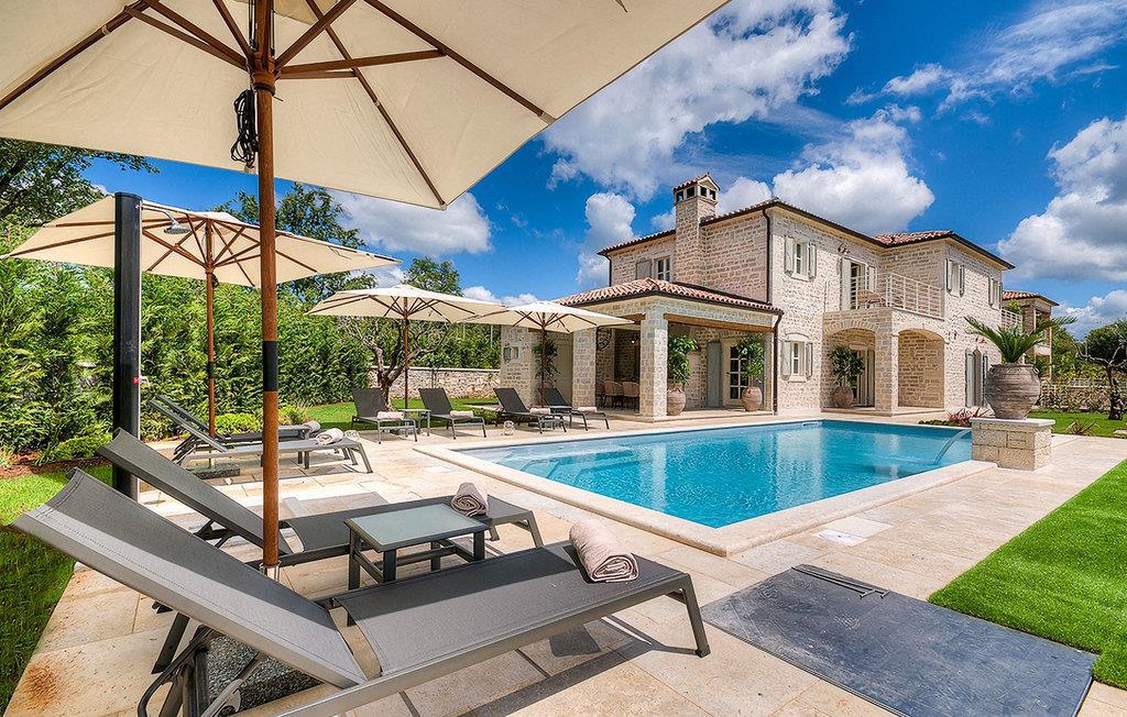 Elegant, stilvoll und hervorragend gelegen, inmitten der pittoresken Landschaft Istriens und doch noch in der Nähe von sonnigen Stränden und lebendigen Küstenstädten, bietet die Villa Elena luxuriöse Unterkunft, in der Sie jede Minute Ihres Urlaubs entspannt genießen können. Das Erdgeschoss ist ganz dem aufwändigen Verweilen gewidmet. Der herrliche großzügig ausgelegte Raum ist durch einen Steinbogen in Wohn-, Ess- und Kochbereiche verteilt, mit riesigen Fenstertüren, die eine Fülle an warmem istrischem Licht hineinbringen. Natursteinwände, Holzbalkendecken und der herrliche offene Kamin schaffen eine warme, gemütliche Atmosphäre, während die Mischung aus modernen und Vintage-Möbeln, sowie die exquisite Ausstattung Sie mit erstklassigem Komfort versorgen. Drei Schlafzimmer sind über die obere Etage verteilt, während das vierte im Erdgeschoss direkt auf den verlockenden Privatpool öffnen, der wunderbare Ort zum Erholen und Entspannen. Die hübsche, überdachte Veranda mit dem authentischen eingebauten Grill und einem großen Esstisch ist eine attraktive Zuflucht von der Sommerhitze, sowie der perfekte Ort für genussvolle Mahlzeiten im Freien.