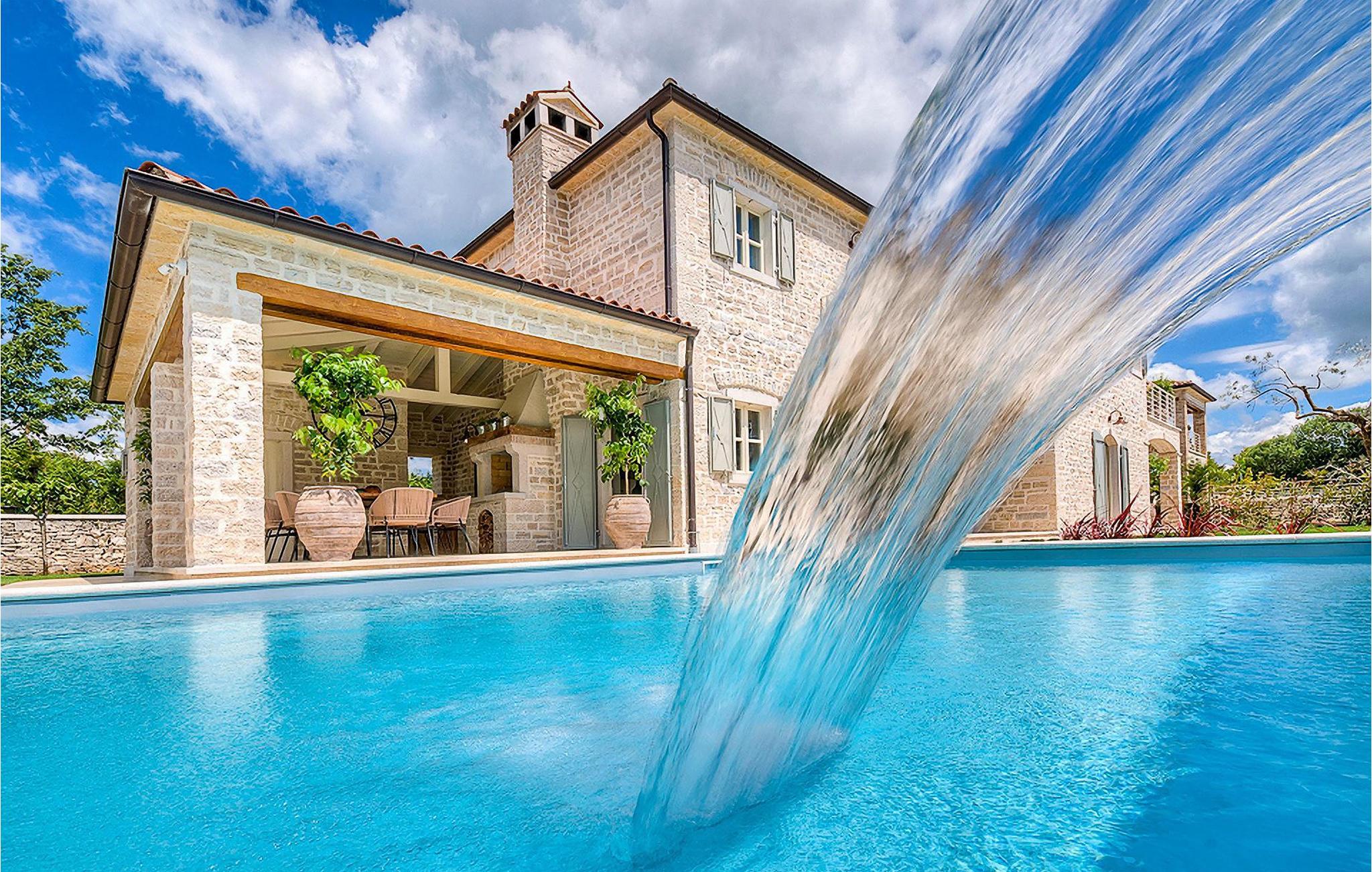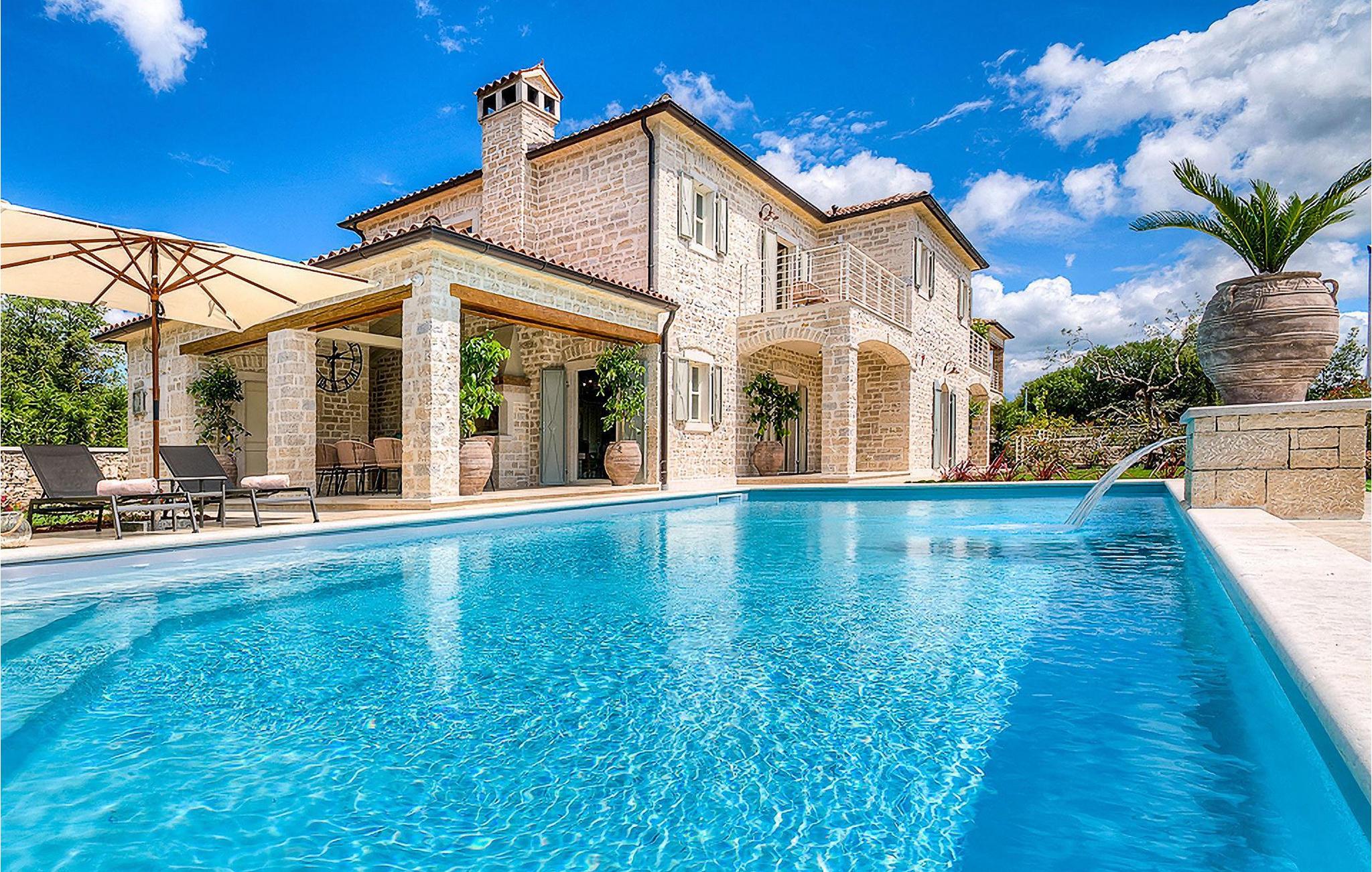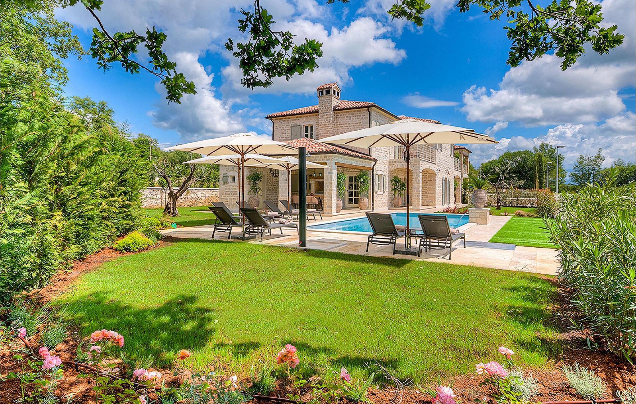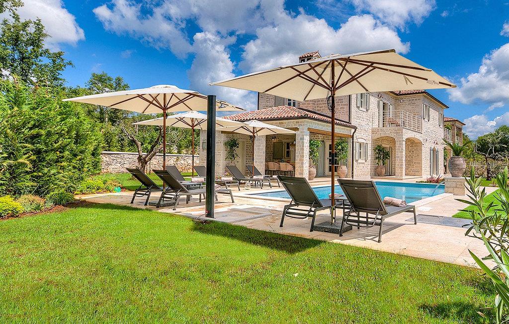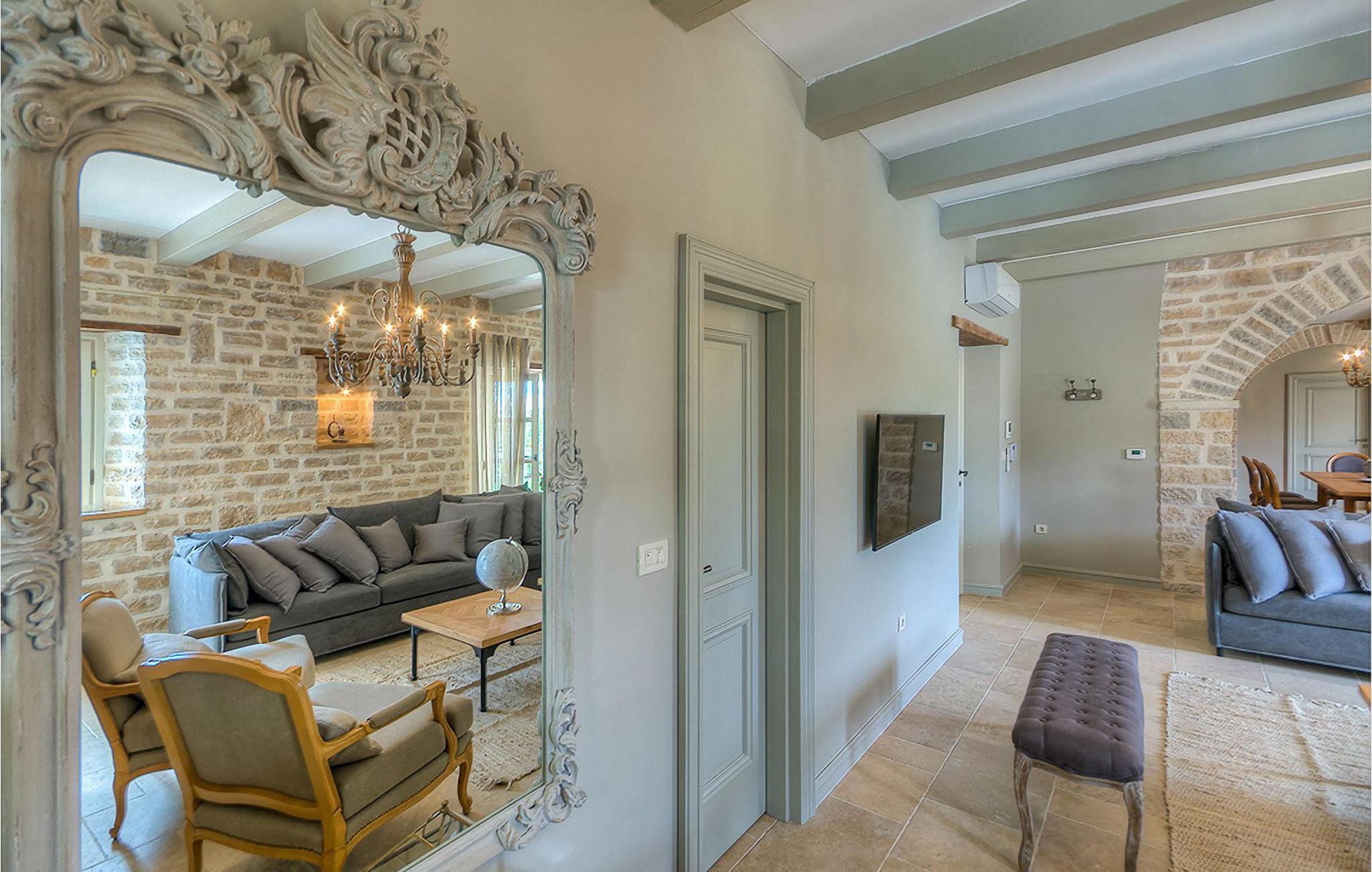 Elegant, stilvoll und hervorragend gelegen, inmitten der pittoresken Landschaft Istriens und doch noch in der Nähe von sonnigen Stränden und lebendigen Küstenstädten, bietet die Villa Elena luxuriöse Unterkunft, in der Sie jede Minute Ihres Urlaubs entspannt genießen können. Das Erdgeschoss ist ganz dem aufwändigen Verweilen gewidmet. Der herrliche großzügig ausgelegte Raum ist durch einen Steinbogen in Wohn-, Ess- und Kochbereiche verteilt, mit riesigen Fenstertüren, die eine Fülle an warmem istrischem Licht hineinbringen. Natursteinwände, Holzbalkendecken und der herrliche offene Kamin schaffen eine warme, gemütliche Atmosphäre, während die Mischung aus modernen und Vintage-Möbeln, sowie die exquisite Ausstattung Sie mit erstklassigem Komfort versorgen. Drei Schlafzimmer sind über die obere Etage verteilt, während das vierte im Erdgeschoss direkt auf den verlockenden Privatpool öffnen, der wunderbare Ort zum Erholen und Entspannen. Die hübsche, überdachte Veranda mit dem authentischen eingebauten Grill und einem großen Esstisch ist eine attraktive Zuflucht von der Sommerhitze, sowie der perfekte Ort für genussvolle Mahlzeiten im Freien.