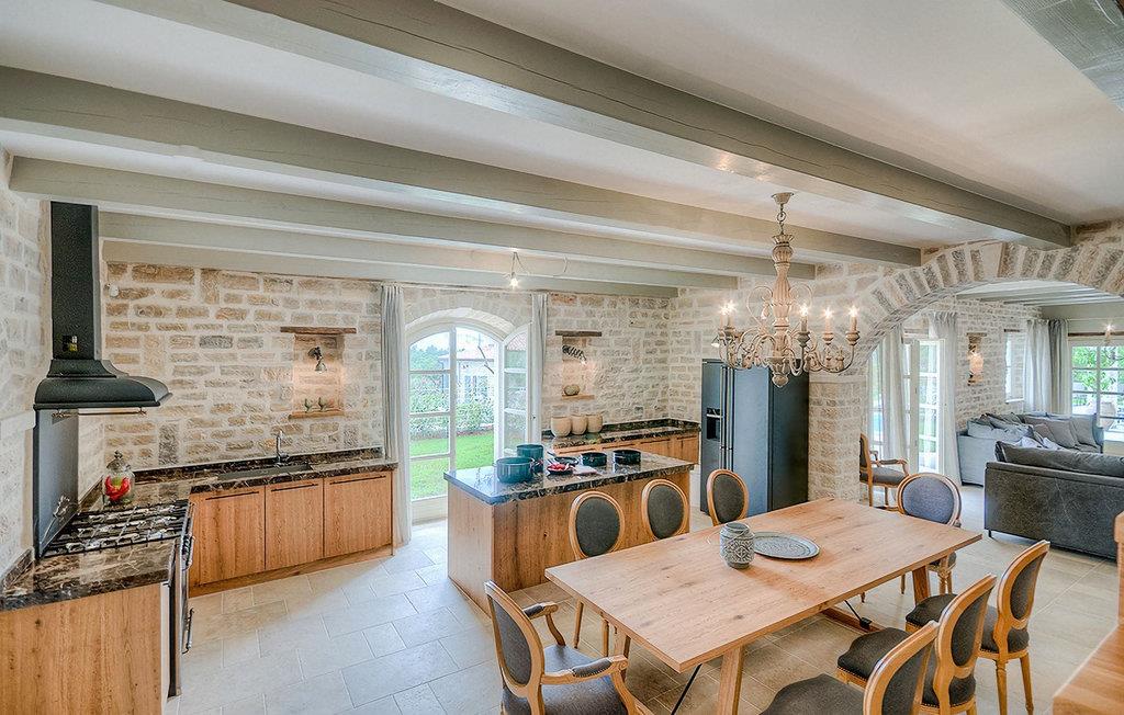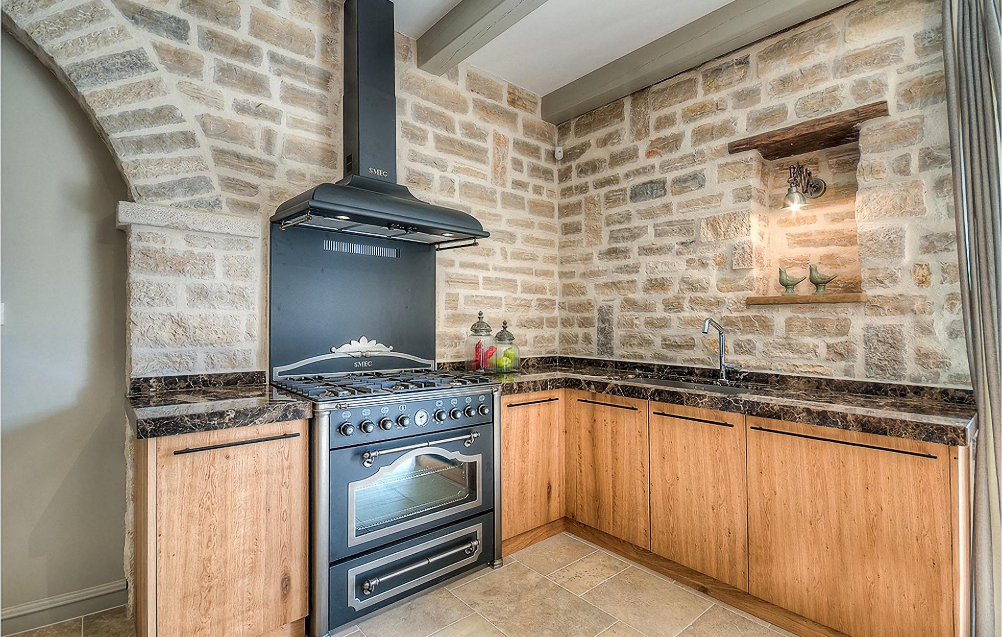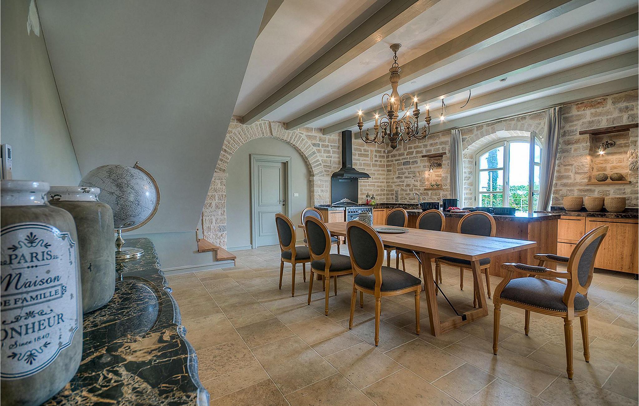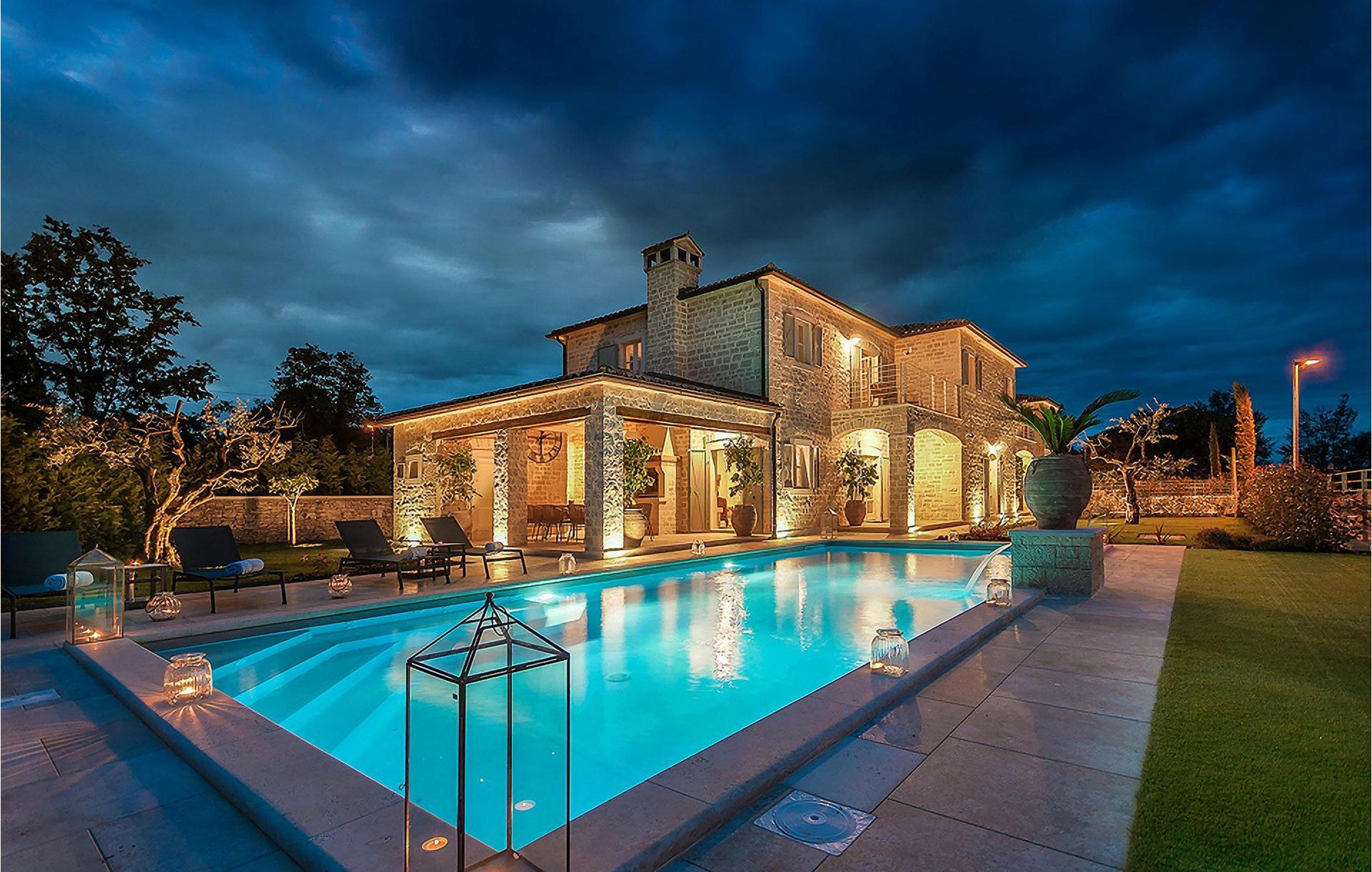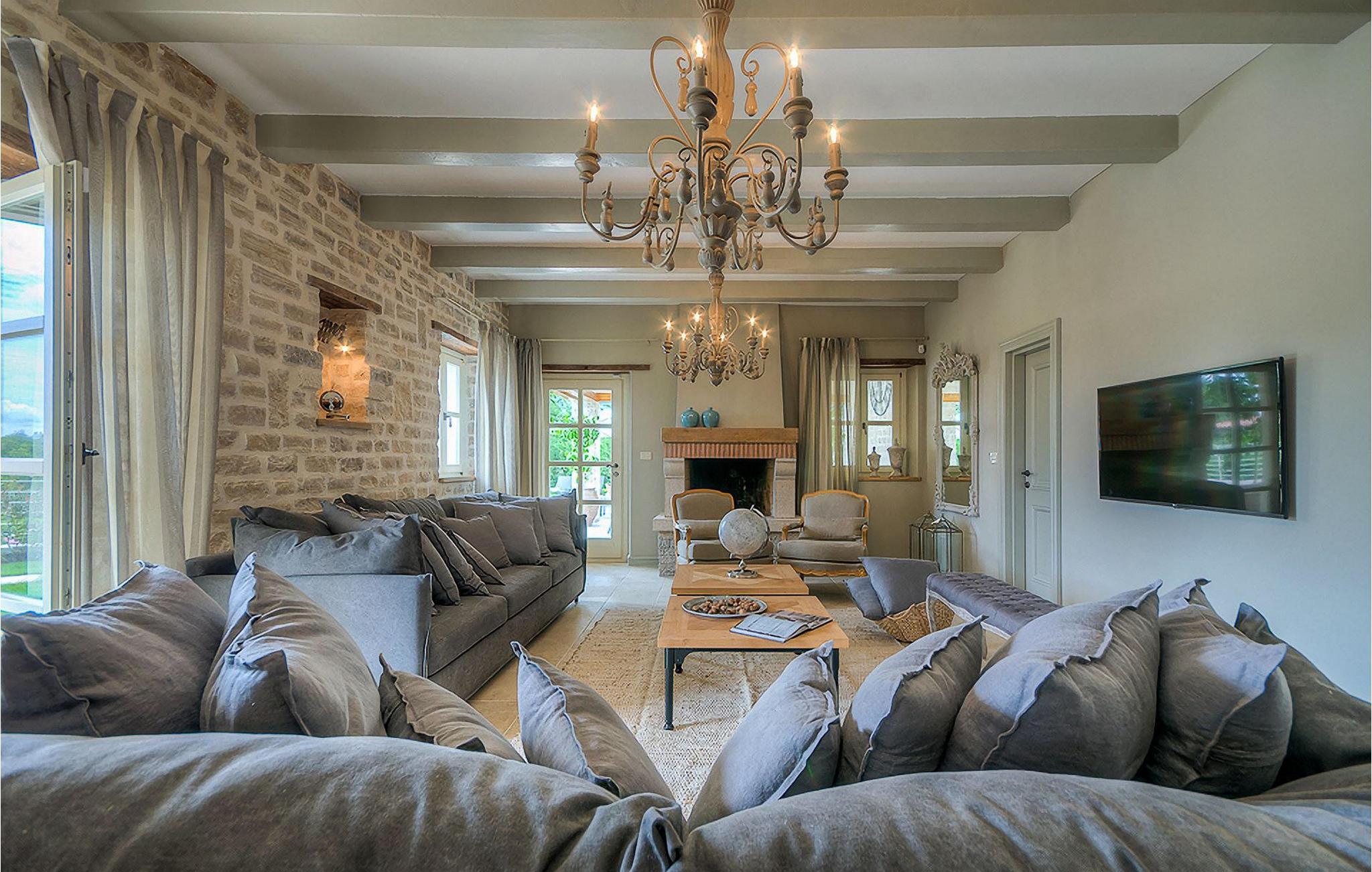 Elegant, stilvoll und hervorragend gelegen, inmitten der pittoresken Landschaft Istriens und doch noch in der Nähe von sonnigen Stränden und lebendigen Küstenstädten, bietet die Villa Elena luxuriöse Unterkunft, in der Sie jede Minute Ihres Urlaubs entspannt genießen können. Das Erdgeschoss ist ganz dem aufwändigen Verweilen gewidmet. Der herrliche großzügig ausgelegte Raum ist durch einen Steinbogen in Wohn-, Ess- und Kochbereiche verteilt, mit riesigen Fenstertüren, die eine Fülle an warmem istrischem Licht hineinbringen. Natursteinwände, Holzbalkendecken und der herrliche offene Kamin schaffen eine warme, gemütliche Atmosphäre, während die Mischung aus modernen und Vintage-Möbeln, sowie die exquisite Ausstattung Sie mit erstklassigem Komfort versorgen. Drei Schlafzimmer sind über die obere Etage verteilt, während das vierte im Erdgeschoss direkt auf den verlockenden Privatpool öffnen, der wunderbare Ort zum Erholen und Entspannen. Die hübsche, überdachte Veranda mit dem authentischen eingebauten Grill und einem großen Esstisch ist eine attraktive Zuflucht von der Sommerhitze, sowie der perfekte Ort für genussvolle Mahlzeiten im Freien.