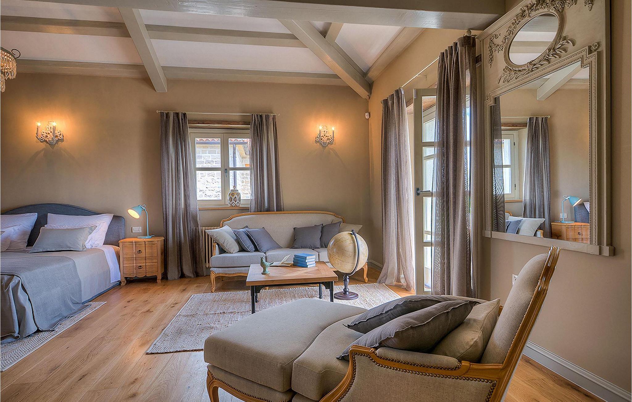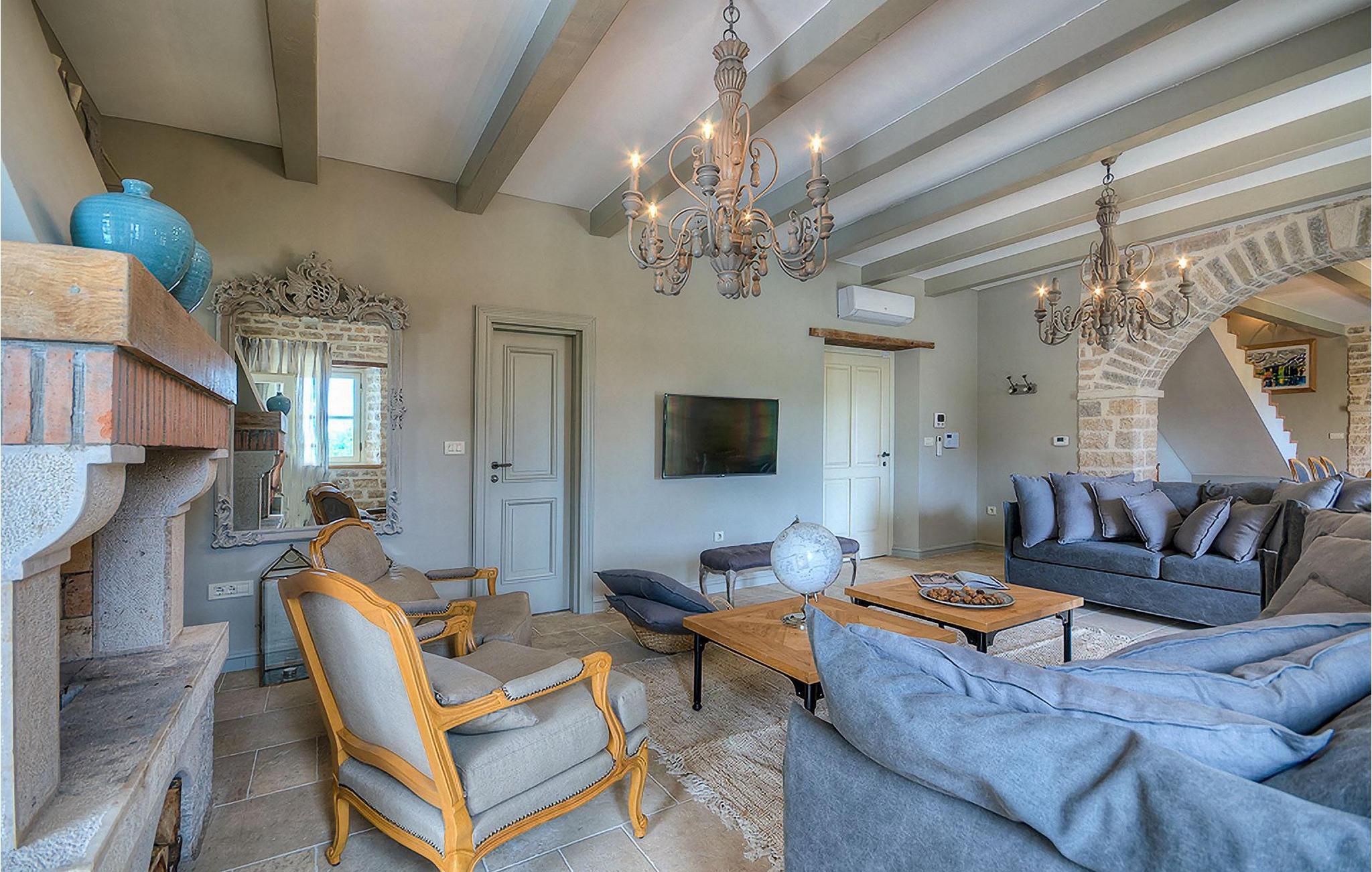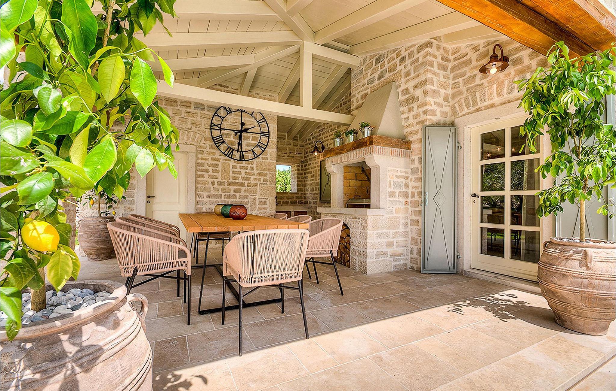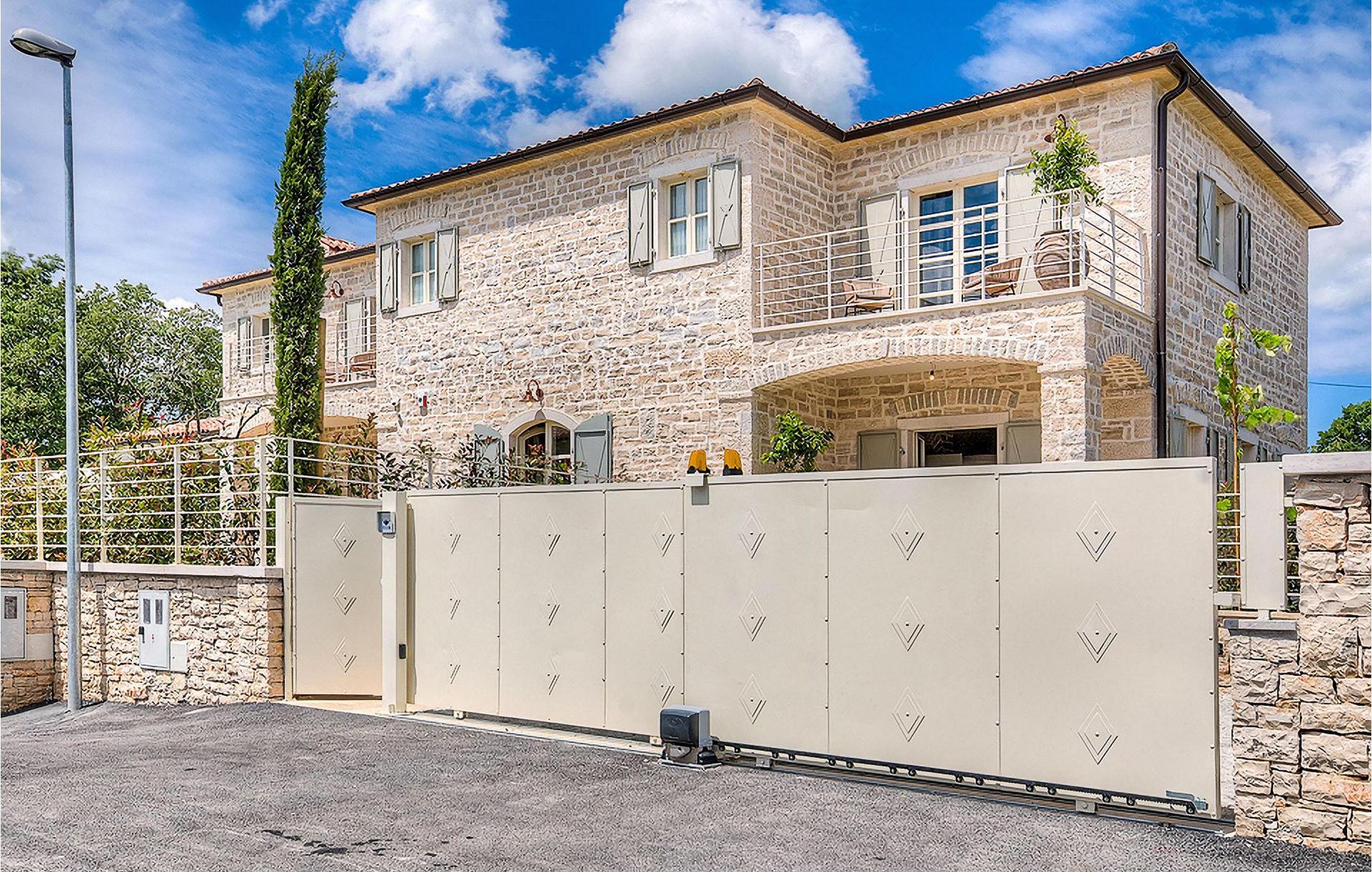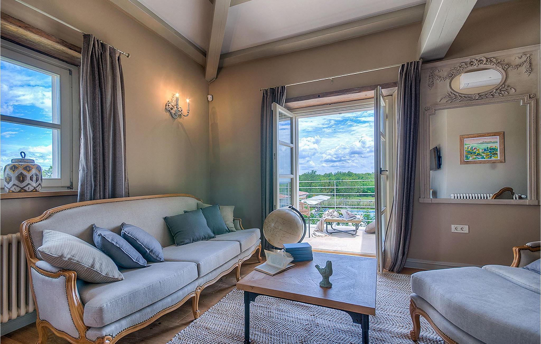 Elegant, stilvoll und hervorragend gelegen, inmitten der pittoresken Landschaft Istriens und doch noch in der Nähe von sonnigen Stränden und lebendigen Küstenstädten, bietet die Villa Elena luxuriöse Unterkunft, in der Sie jede Minute Ihres Urlaubs entspannt genießen können. Das Erdgeschoss ist ganz dem aufwändigen Verweilen gewidmet. Der herrliche großzügig ausgelegte Raum ist durch einen Steinbogen in Wohn-, Ess- und Kochbereiche verteilt, mit riesigen Fenstertüren, die eine Fülle an warmem istrischem Licht hineinbringen. Natursteinwände, Holzbalkendecken und der herrliche offene Kamin schaffen eine warme, gemütliche Atmosphäre, während die Mischung aus modernen und Vintage-Möbeln, sowie die exquisite Ausstattung Sie mit erstklassigem Komfort versorgen. Drei Schlafzimmer sind über die obere Etage verteilt, während das vierte im Erdgeschoss direkt auf den verlockenden Privatpool öffnen, der wunderbare Ort zum Erholen und Entspannen. Die hübsche, überdachte Veranda mit dem authentischen eingebauten Grill und einem großen Esstisch ist eine attraktive Zuflucht von der Sommerhitze, sowie der perfekte Ort für genussvolle Mahlzeiten im Freien.