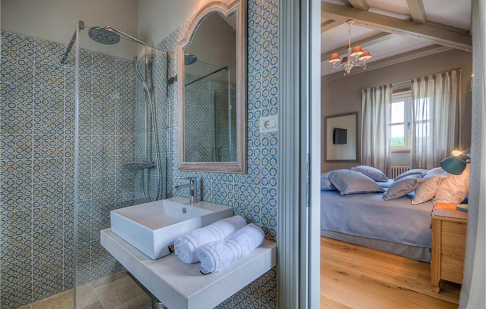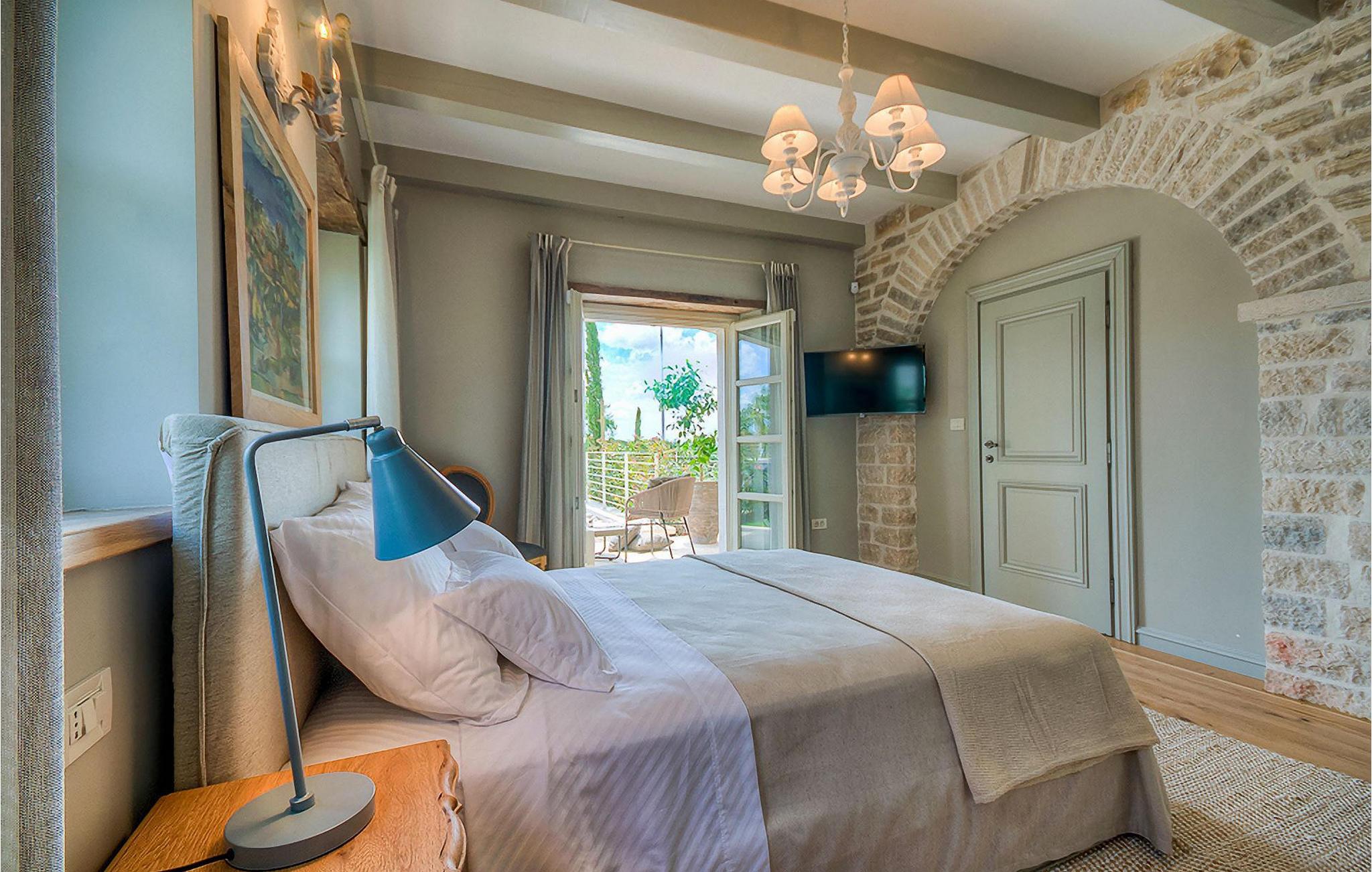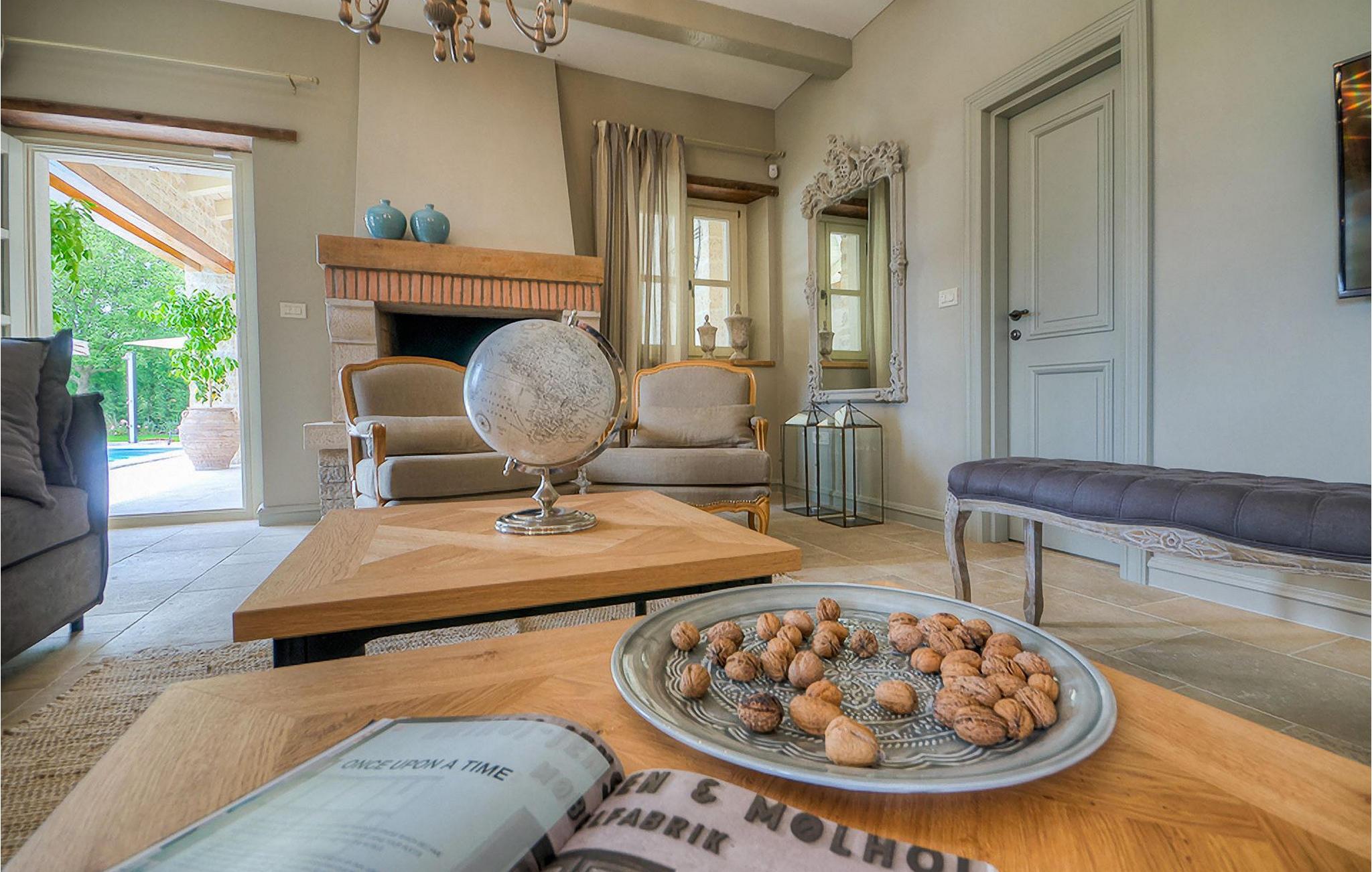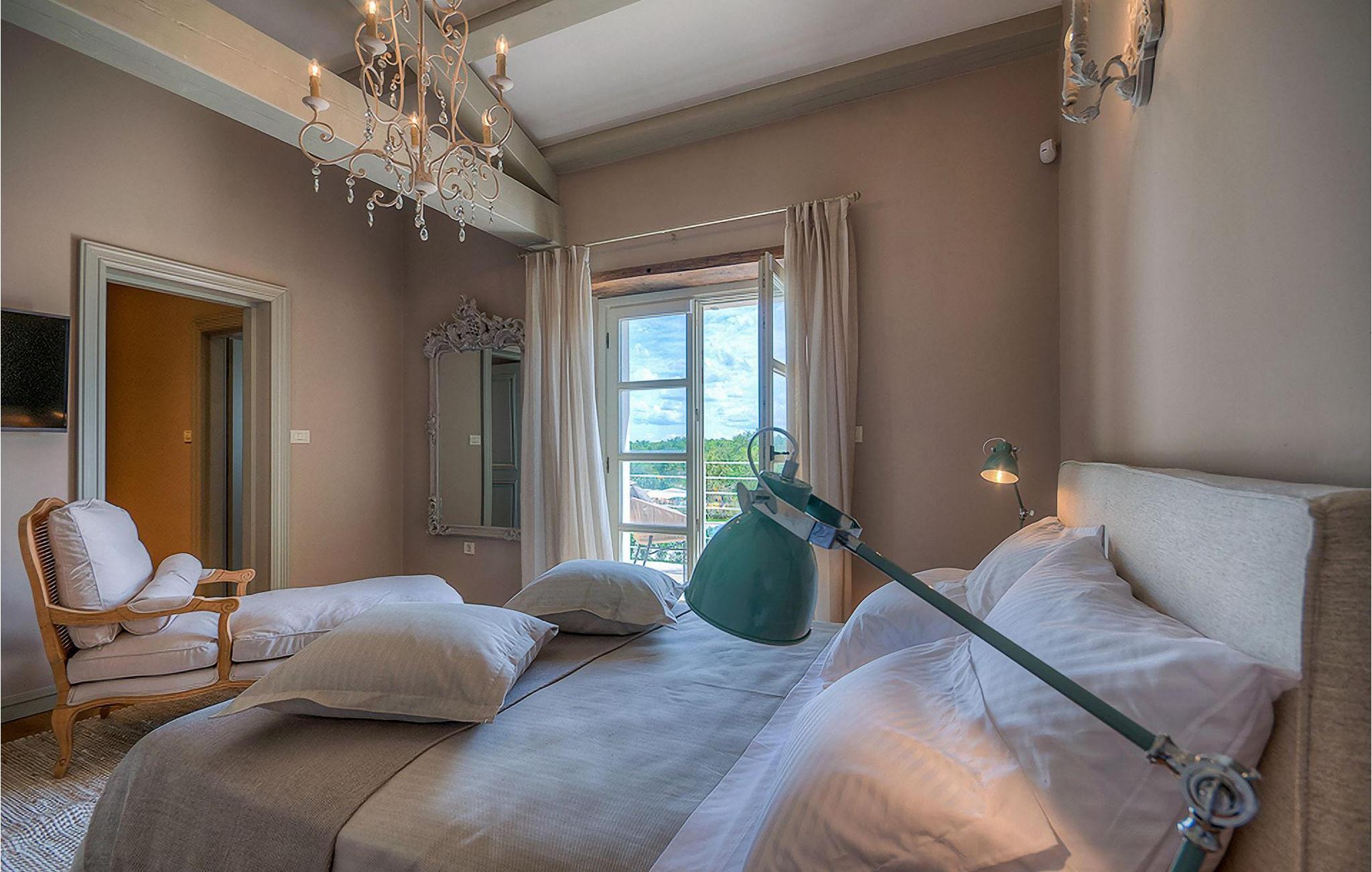 Elegant, stilvoll und hervorragend gelegen, inmitten der pittoresken Landschaft Istriens und doch noch in der Nähe von sonnigen Stränden und lebendigen Küstenstädten, bietet die Villa Elena luxuriöse Unterkunft, in der Sie jede Minute Ihres Urlaubs entspannt genießen können. Das Erdgeschoss ist ganz dem aufwändigen Verweilen gewidmet. Der herrliche großzügig ausgelegte Raum ist durch einen Steinbogen in Wohn-, Ess- und Kochbereiche verteilt, mit riesigen Fenstertüren, die eine Fülle an warmem istrischem Licht hineinbringen. Natursteinwände, Holzbalkendecken und der herrliche offene Kamin schaffen eine warme, gemütliche Atmosphäre, während die Mischung aus modernen und Vintage-Möbeln, sowie die exquisite Ausstattung Sie mit erstklassigem Komfort versorgen. Drei Schlafzimmer sind über die obere Etage verteilt, während das vierte im Erdgeschoss direkt auf den verlockenden Privatpool öffnen, der wunderbare Ort zum Erholen und Entspannen. Die hübsche, überdachte Veranda mit dem authentischen eingebauten Grill und einem großen Esstisch ist eine attraktive Zuflucht von der Sommerhitze, sowie der perfekte Ort für genussvolle Mahlzeiten im Freien.
