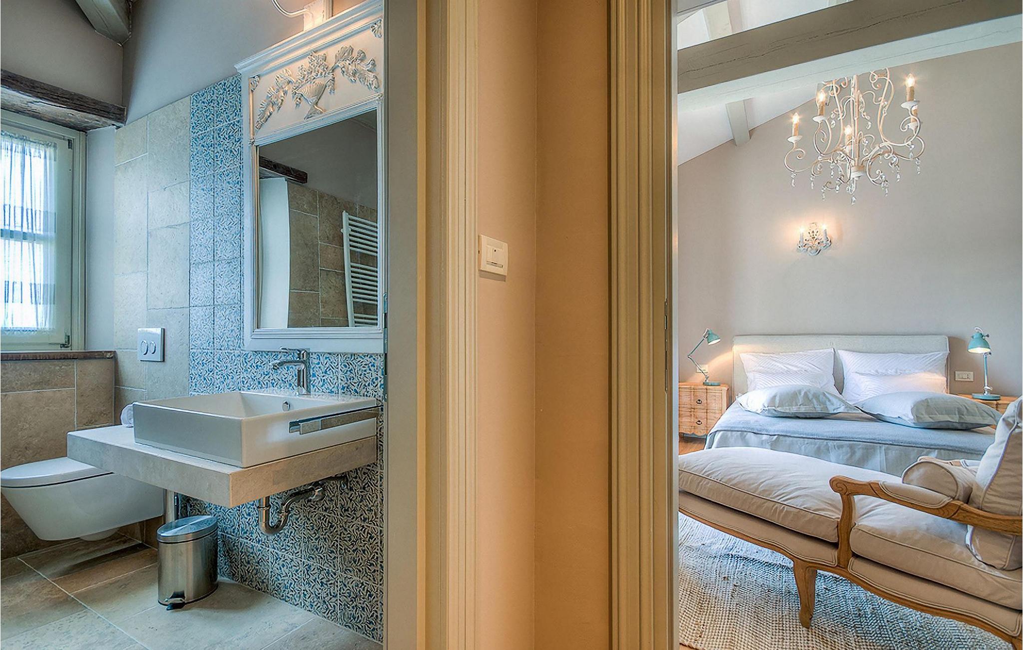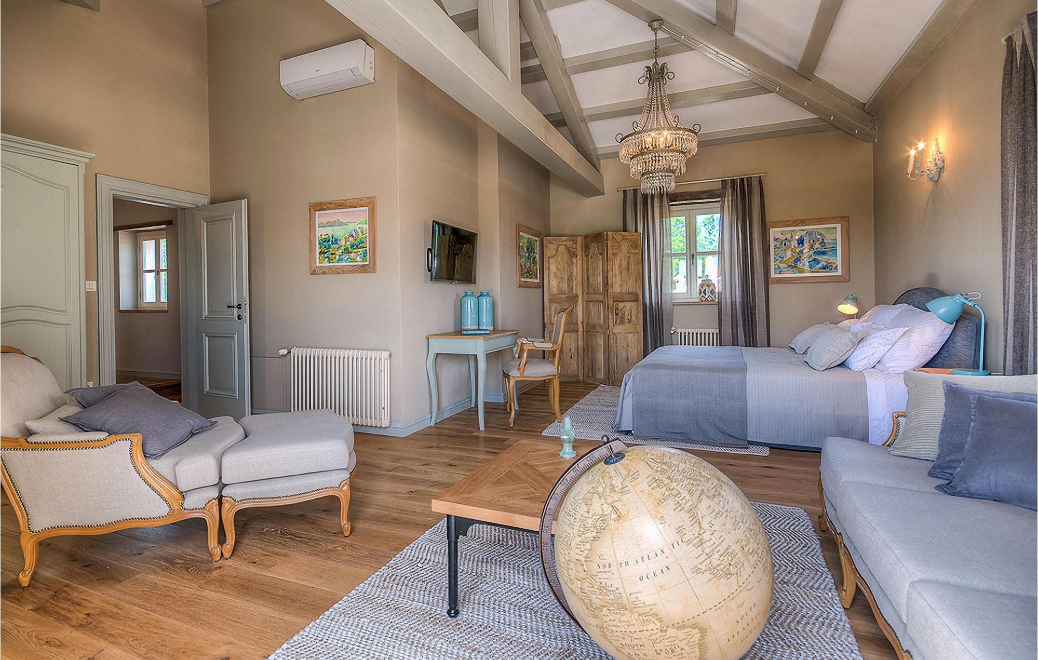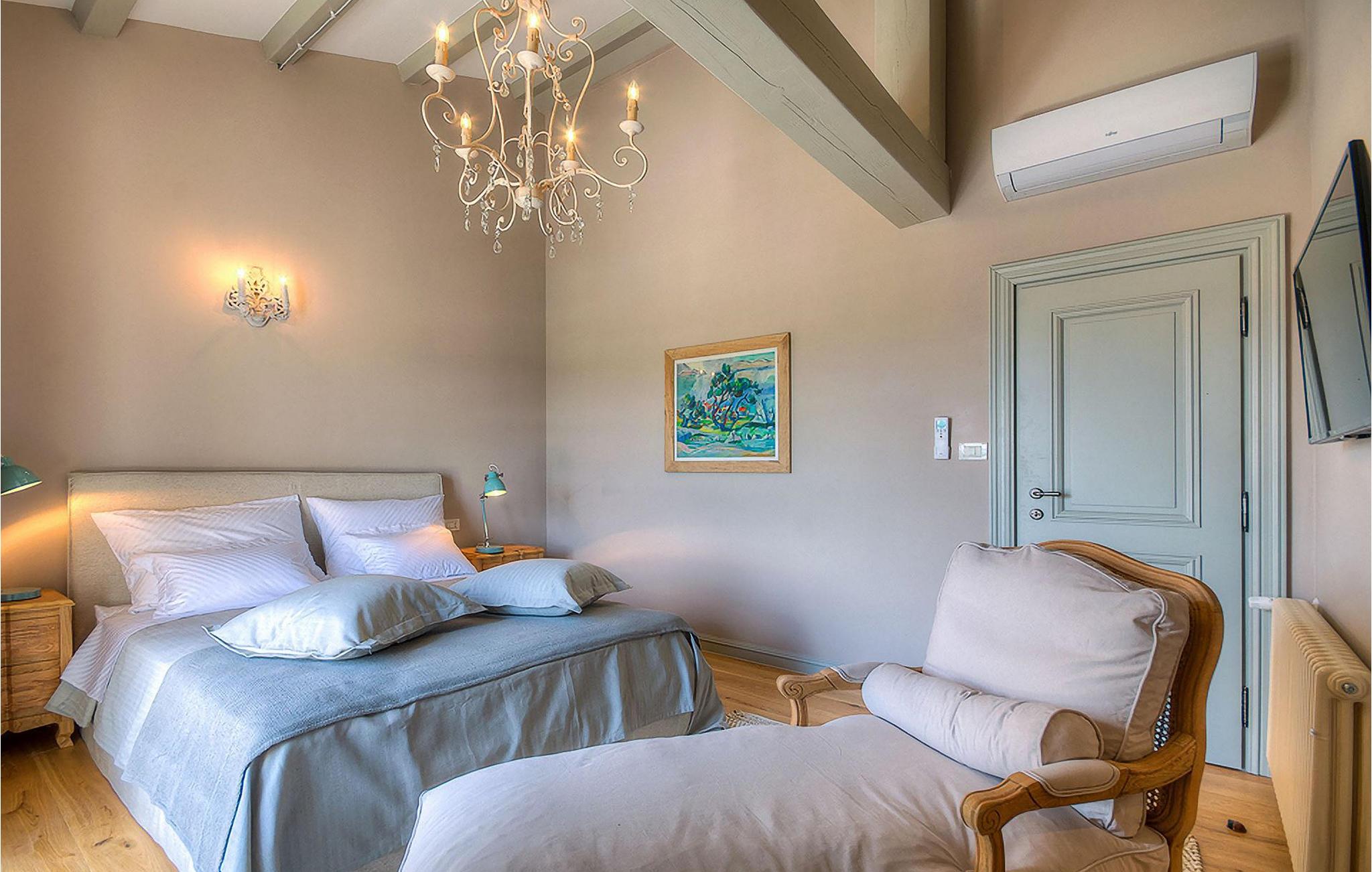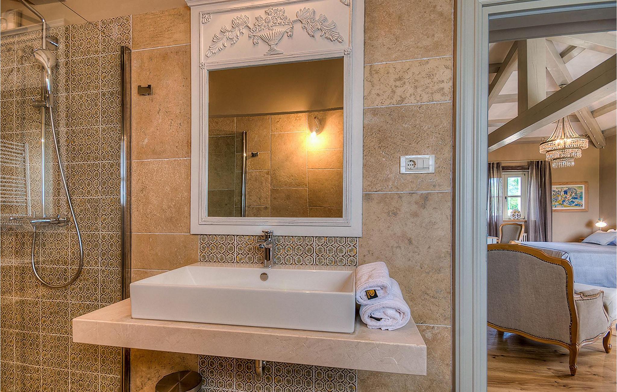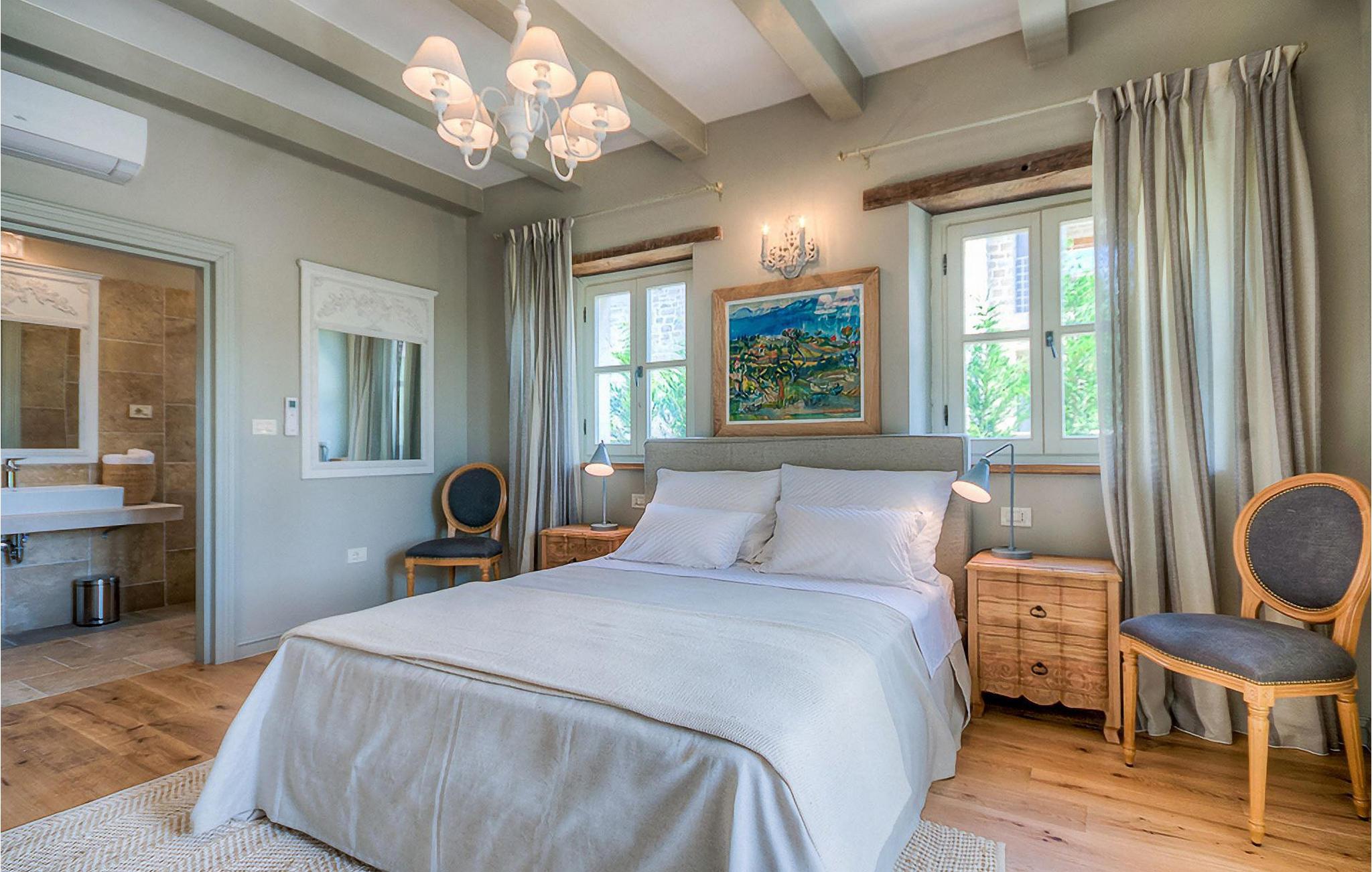 Elegant, stilvoll und hervorragend gelegen, inmitten der pittoresken Landschaft Istriens und doch noch in der Nähe von sonnigen Stränden und lebendigen Küstenstädten, bietet die Villa Elena luxuriöse Unterkunft, in der Sie jede Minute Ihres Urlaubs entspannt genießen können. Das Erdgeschoss ist ganz dem aufwändigen Verweilen gewidmet. Der herrliche großzügig ausgelegte Raum ist durch einen Steinbogen in Wohn-, Ess- und Kochbereiche verteilt, mit riesigen Fenstertüren, die eine Fülle an warmem istrischem Licht hineinbringen. Natursteinwände, Holzbalkendecken und der herrliche offene Kamin schaffen eine warme, gemütliche Atmosphäre, während die Mischung aus modernen und Vintage-Möbeln, sowie die exquisite Ausstattung Sie mit erstklassigem Komfort versorgen. Drei Schlafzimmer sind über die obere Etage verteilt, während das vierte im Erdgeschoss direkt auf den verlockenden Privatpool öffnen, der wunderbare Ort zum Erholen und Entspannen. Die hübsche, überdachte Veranda mit dem authentischen eingebauten Grill und einem großen Esstisch ist eine attraktive Zuflucht von der Sommerhitze, sowie der perfekte Ort für genussvolle Mahlzeiten im Freien.