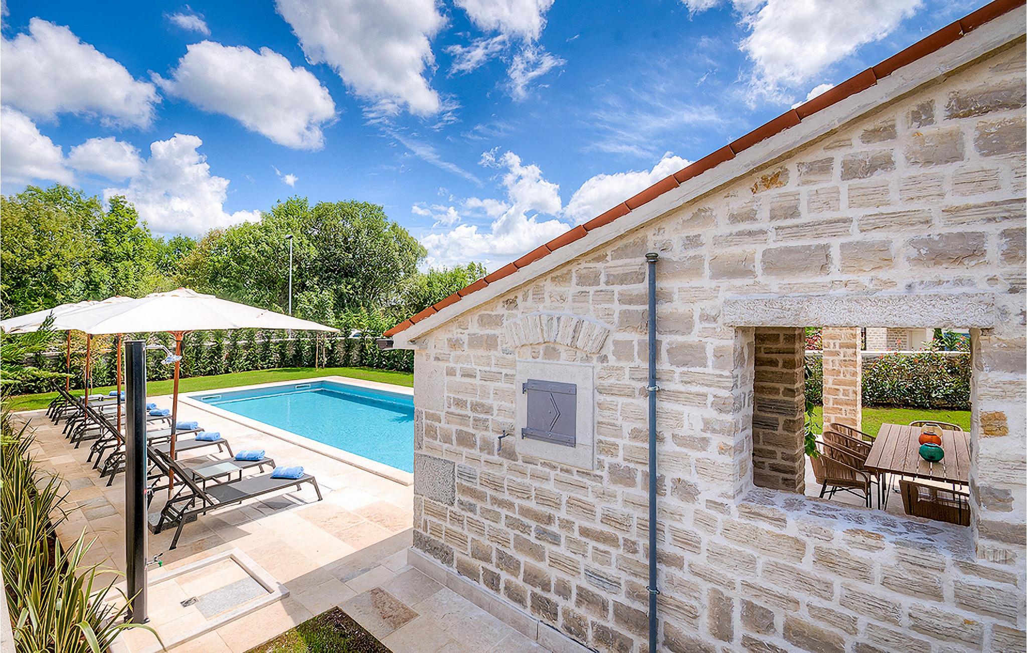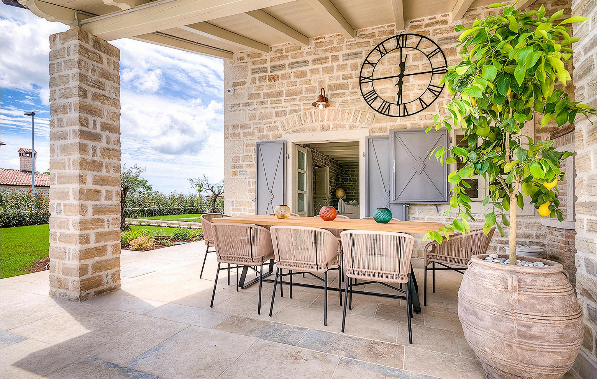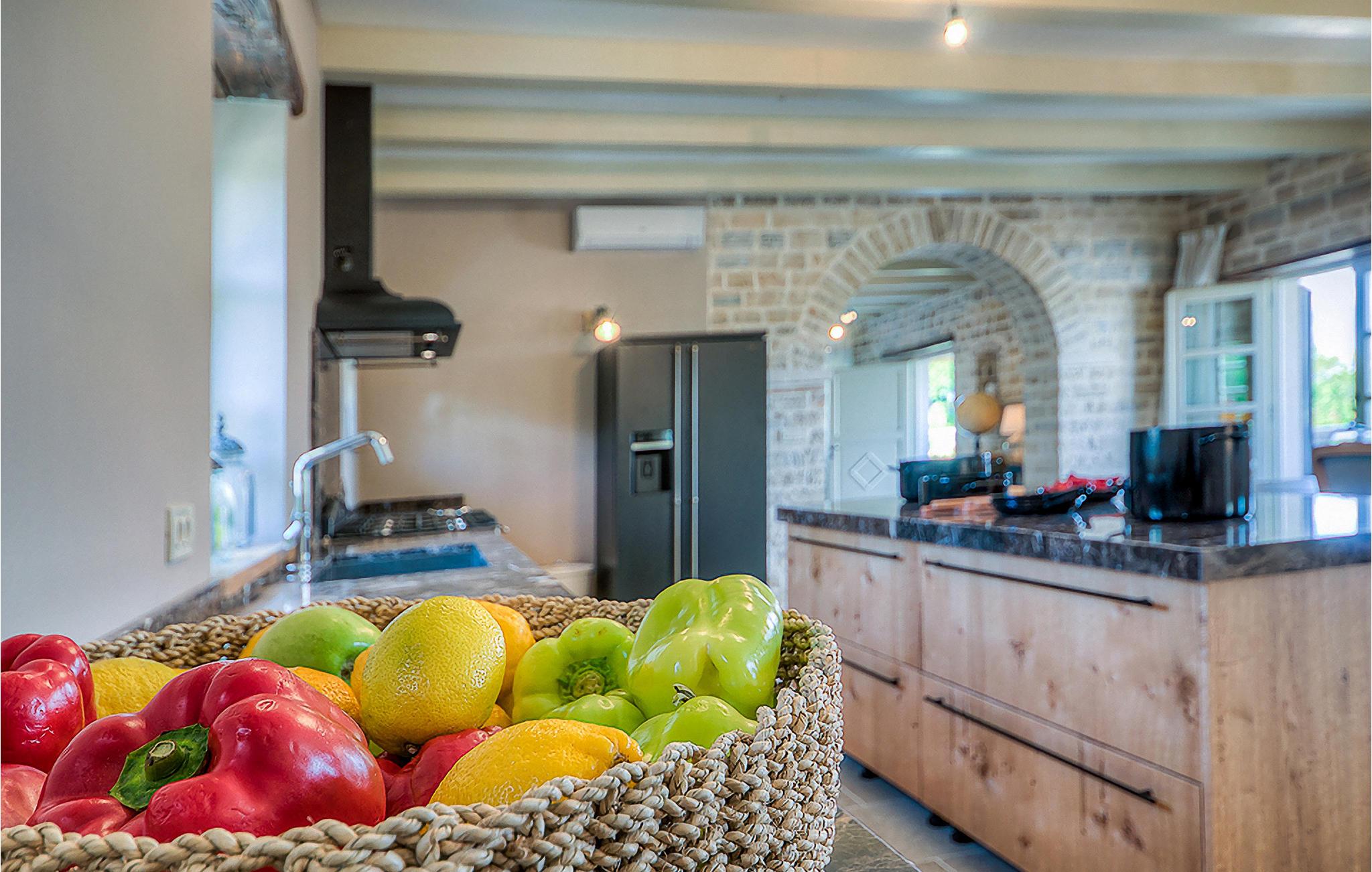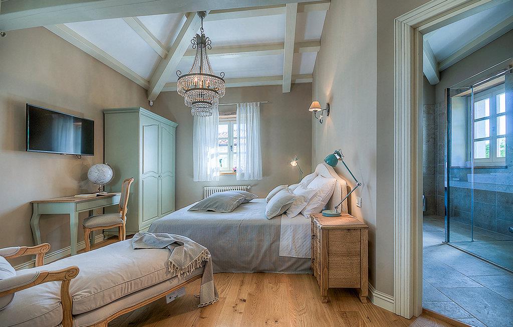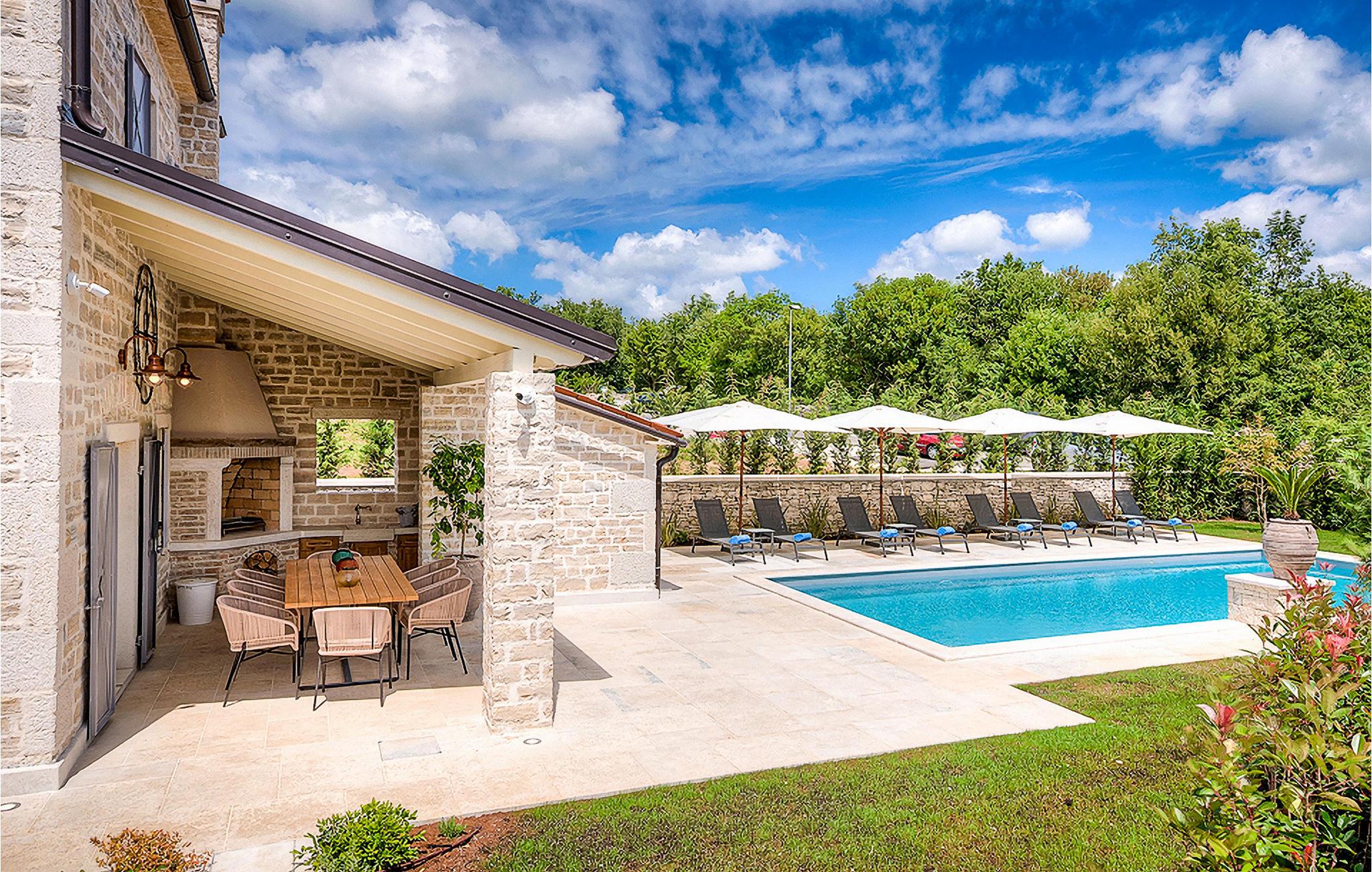 Denne smukke villa, sammen med Villa Nevia, Villa Elli og Villa Elena, ligger i et luksusprojekt med 5600 m2 privat jord, der tilbyder gæsterne af disse 4 villaer en økologisk have med årstidens grøntsager, udendørs fitness, 2 tennisbaner, 2 petanquebaner, samt baner til håndbold, fodbold, basketball og volleyball. For en ægte istrisk fornemmelse er der også 3 boskariner, hvide grå langhornede istriske kvæg, et symbol på regionen. Elegant, sofistikeret og fremragende beliggende midt i det maleriske istriske landskab, men alligevel inden for rækkevidde af solrige strande og livlige badebyer, tilbyder Villa Zoe luksuriøs indkvartering, hvor du øjeblikkeligt kan slappe af og nyde hvert minut af din ferie. Stueetagen er udelukkende dedikeret til overdådig bolig, med et vidunderligt langt rum opdelt af en buegang i opholds- og spise-/madlavningsområder med franske døre, der bringer overfloden af varmt istrisk lys indenfor. Fritlagt murværk, bjælkelofter og en smuk åben pejs skaber en varm og behagelig atmosfære, mens en blanding af moderne og vintage møbler og udsøgt indretning giver dig komfort af høj kvalitet. De fire stilfuldt designede soveværelser er fordelt over den øverste etage, mens stueetagen åbner direkte til det indbydende private poolområde, som udgør et fantastisk sted at slappe af og slappe af, herunder en dejlig, overdækket, autentisk grill med et spisebord, der gør en vidunderligt tilbagetog fra solen eller det perfekte sted at nyde dine udendørs måltider. Du vil aldrig mangle ting at gøre og steder at besøge, hvilket gør denne smukke villa til en god base for din ferie i Istrien. Villa Zoe er beliggende i den centrale del af halvøen Istrien, nær den lille by Kanfanar. Den gamle arkitektur i byen og de omkringliggende landsbyer er velbevaret, og vinmarker og oliven dominerer dette område med varmt middelhavsklima. Kanfanar og dets omkringliggende landskab er kendt, ikke kun for deres historiske og kulturelle arv, men for ægte istrisk køkken. Istrien er et unikt og fortryllet sted, der har budt velkommen til besøgende og bosættere fra alle dele af verden, så længe vi har nedtegnet historie. Byen Pula med dets romerske amfiteater og Brijuni nationalpark med en 18-hullers golfbane ligger kun 30 minutters kørsel derfra. Det er et fantastisk sted at nyde maden, historien og trods alt at slappe af. En bil anbefales.