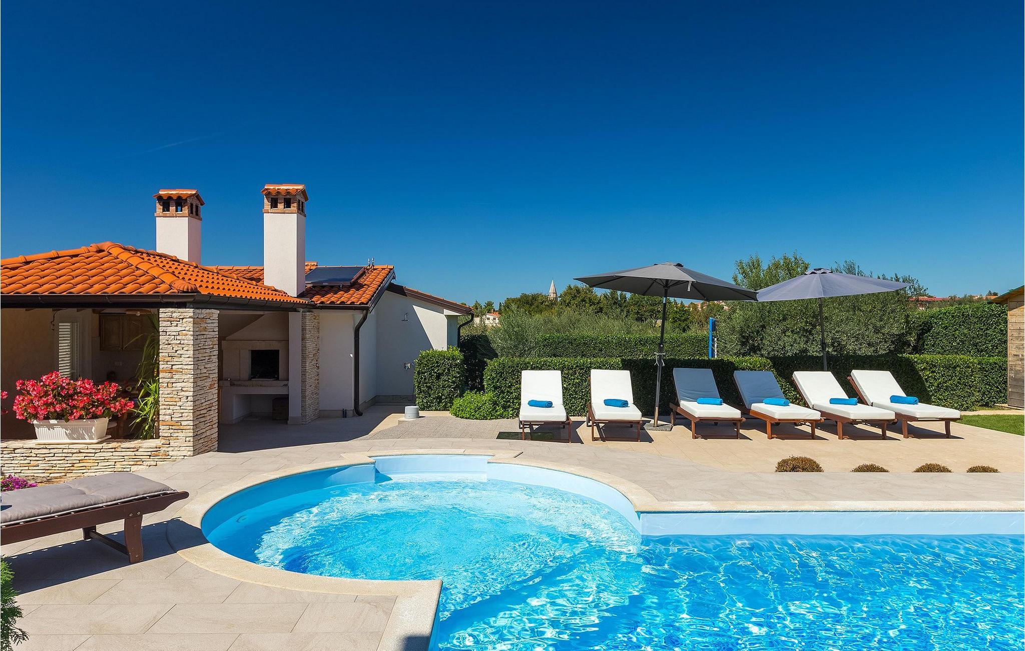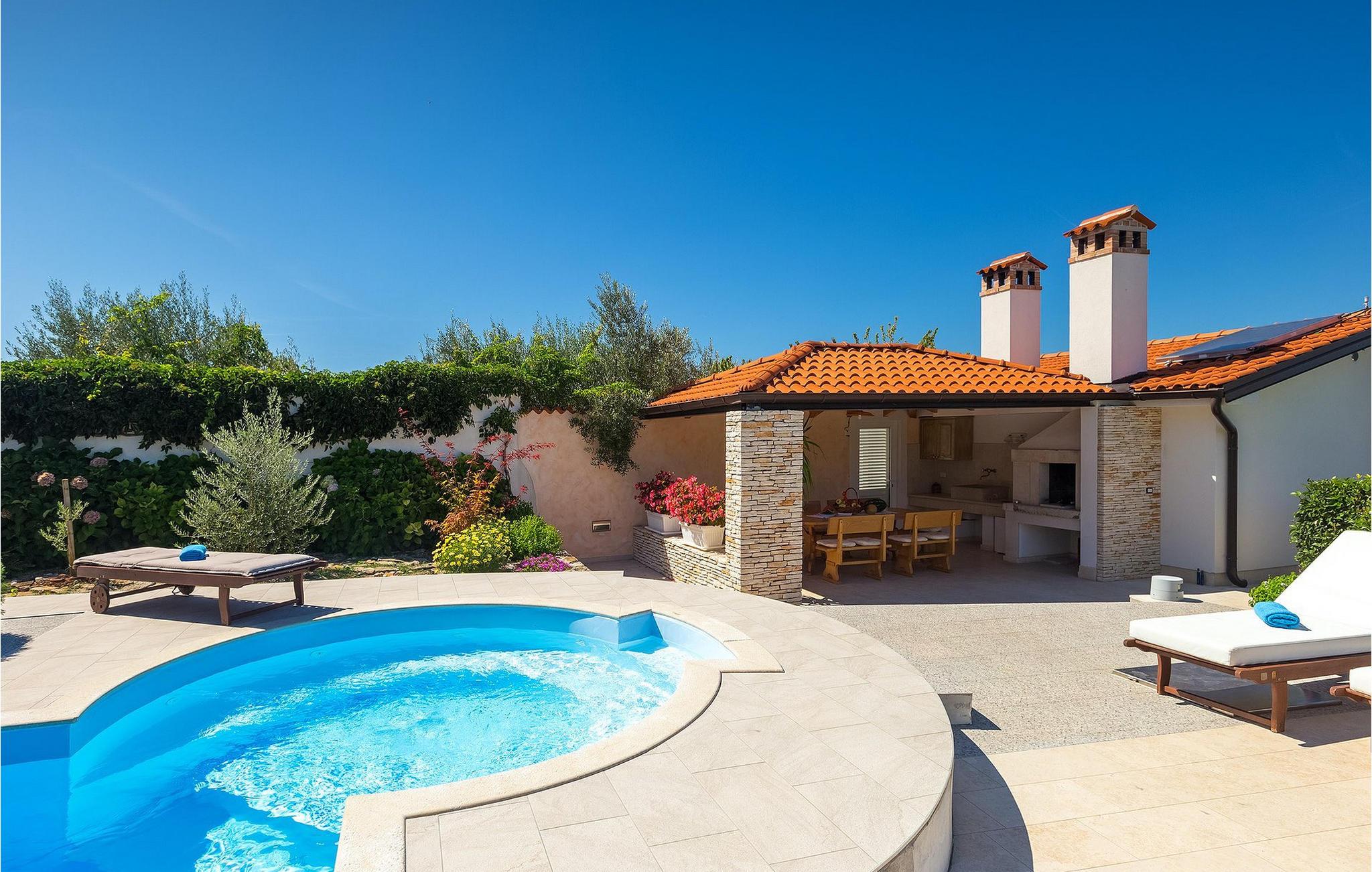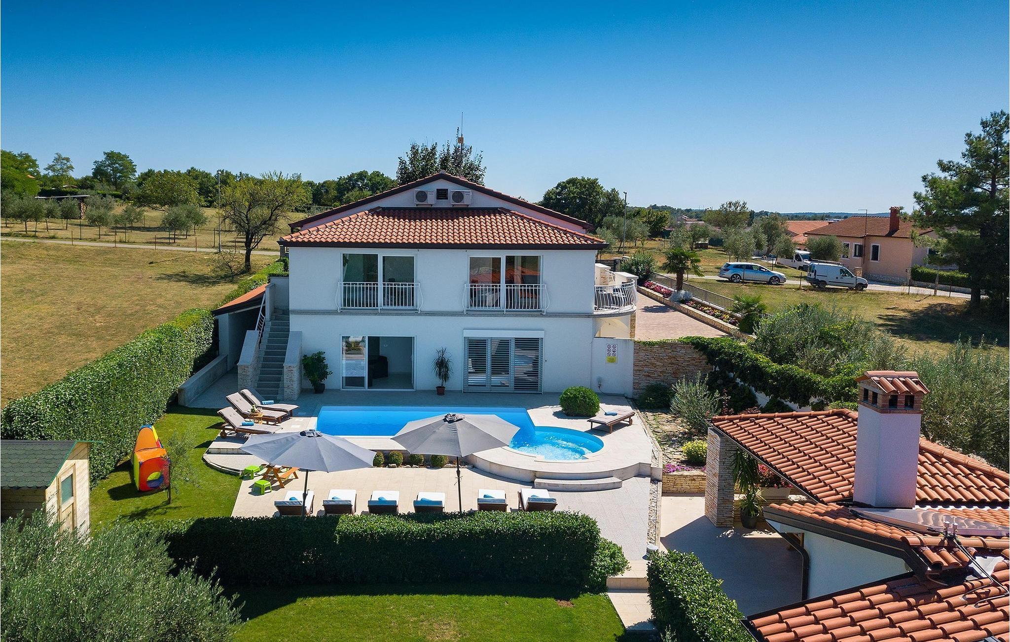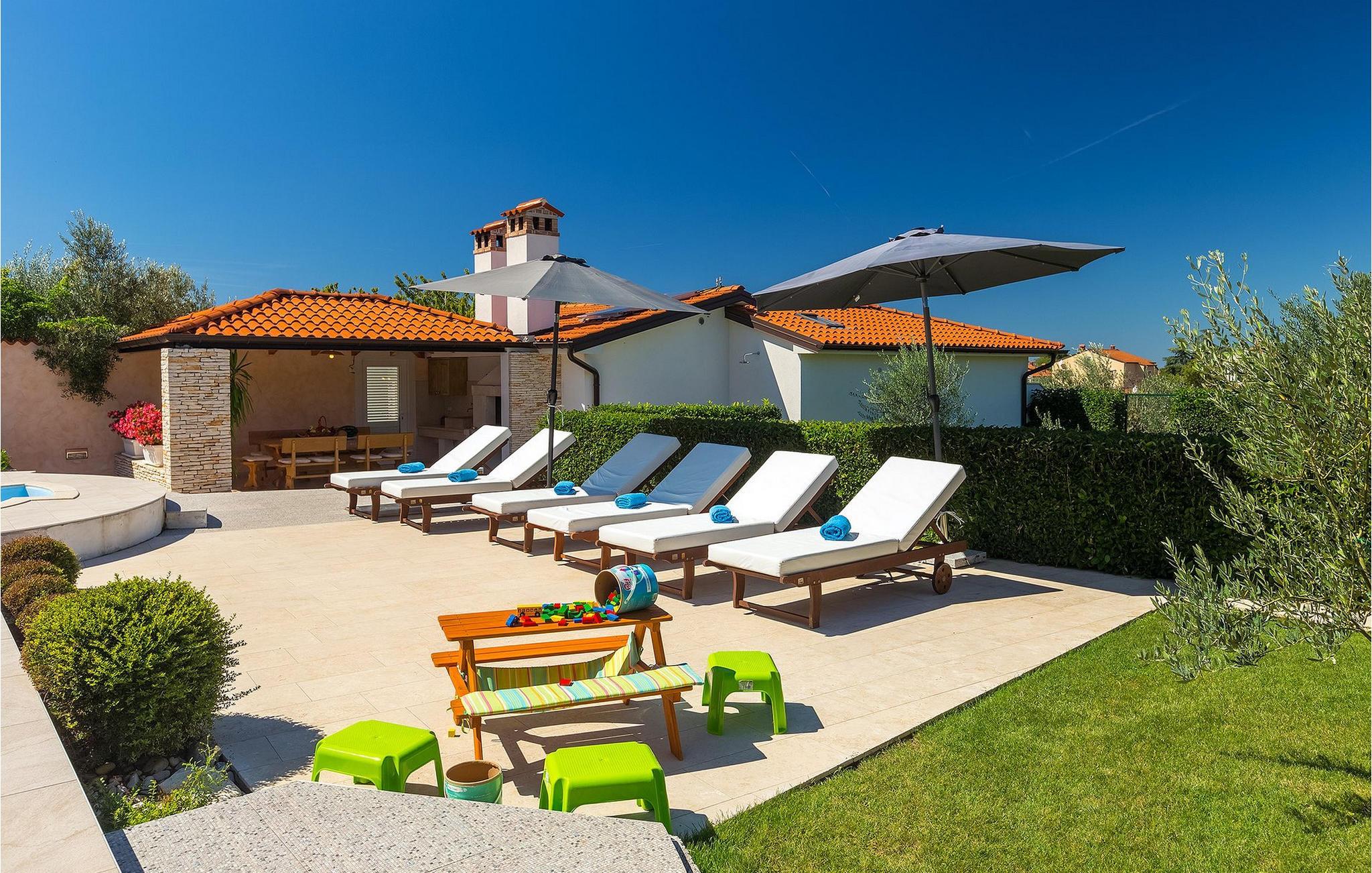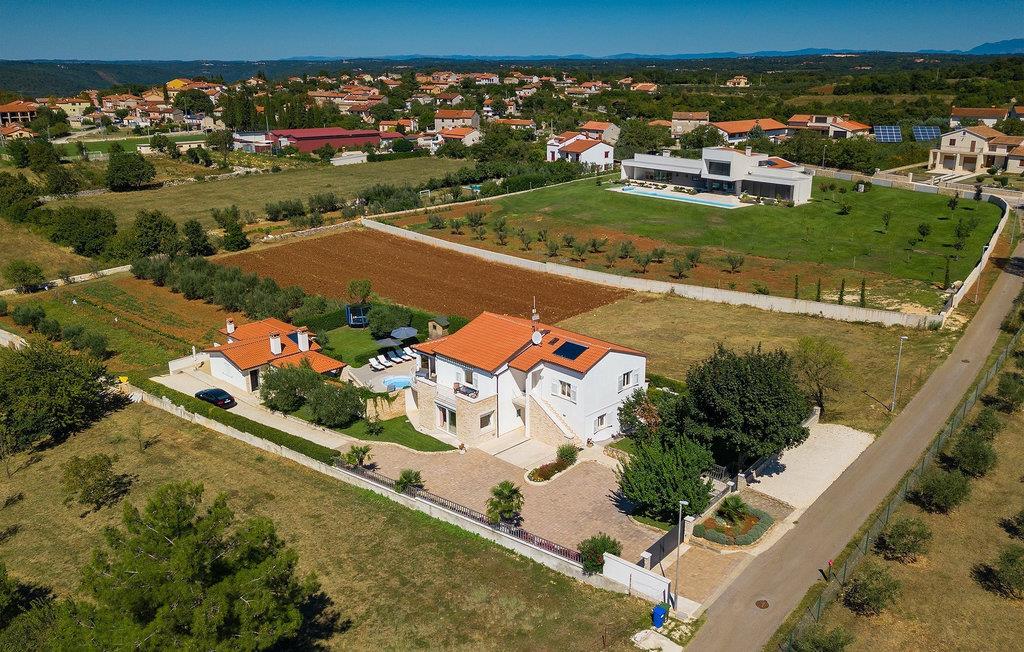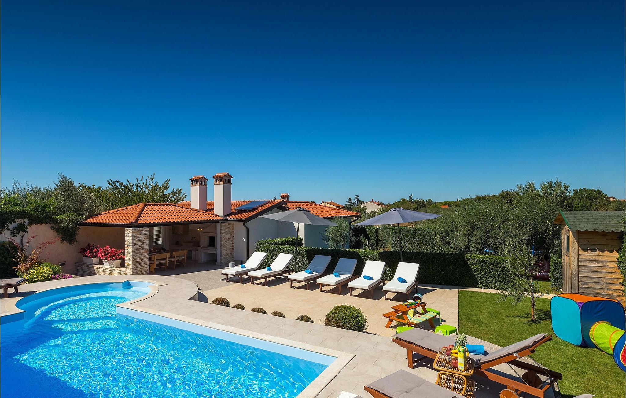 Villa Allegra er en dejlig familievilla beliggende i hjertet af Istrien. Villaen er velegnet til at rumme 6 gæster i sine 3 smagfuldt indrettede soveværelser. Villaen byder på alt til en fuldstændig fornøjelig ferie - en privat pool, et wellness-område med en infrarød sauna samt et fitnessrum til at holde sig i form under dine feriedage. En indendørs jacuzzi er også tilgængelig. Børnene kan lege på legepladsen og trampolinen, eller hygge sig med cykler, mens forældrene tilbereder nogle lækre måltider på grillen på den overdækkede terrasse eller bare slapper af på liggestolene ved siden af poolen. Bordtennis, dart og bordfodbold er også til din rådighed. Stueetagen af villaen består af wellness- og fitnessområdet, mens det fuldt udstyrede køkken med spiseplads, stue og 3 soveværelser ligger på øverste etage. Under dit ophold kan du plukke årstidens frugter og grøntsager fra villaens have og fuldt ud nyde din tid i Istrien i enhver forstand. Villaen er beliggende i den centrale del af Istrien-halvøen, nær den lille by Kanfanar. Den gamle arkitektur i byen og de omkringliggende landsbyer er velbevaret, og oliven dominerer dette område med varmt middelhavsklima. Kanfanar og dets omkringliggende landskab er velkendt, ikke kun for sin historiske og kulturelle arv, men for fremragende ægte istriske køkken. Udover det er denne placering et fantastisk udgangspunkt for at opdage det magiske Istrien - den romantiske by Rovinj er ca. 18 km fra villaen, centralt beliggende Pazin ca. 20 km, den historiske by Porec ca. 30 km, og Istriens største by, Pula, er kun omkring 37 km væk. Afhængigt af din interesse tilbyder denne placering virkelig alt. En bil anbefales.