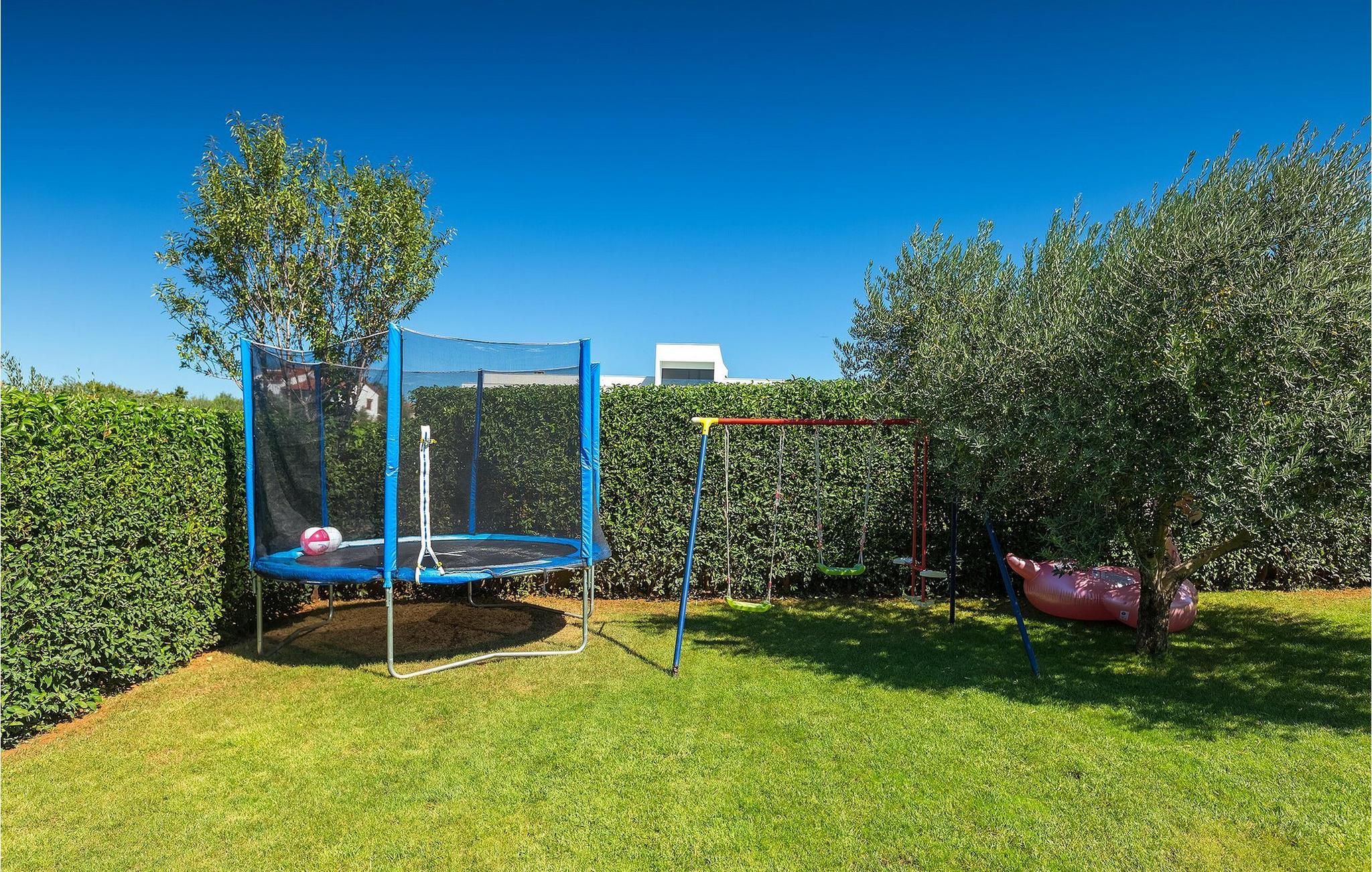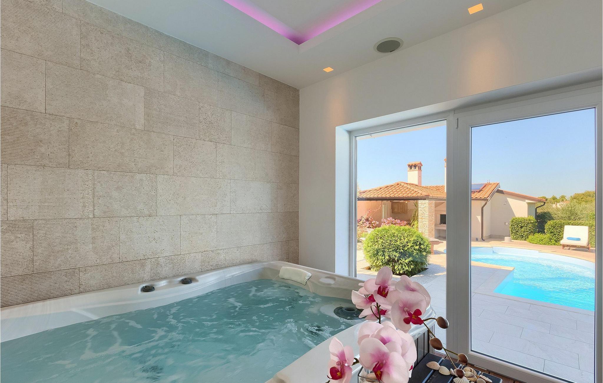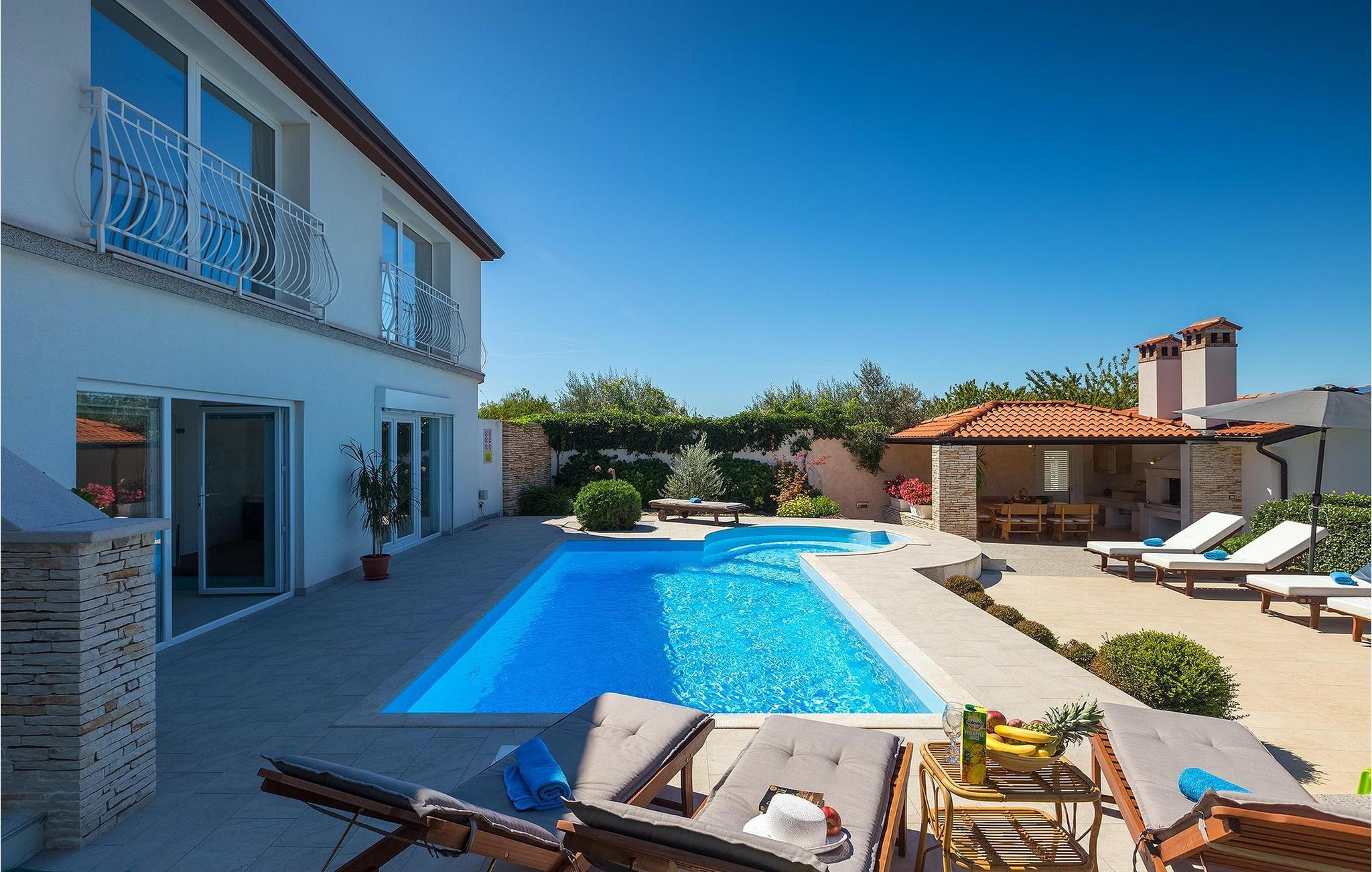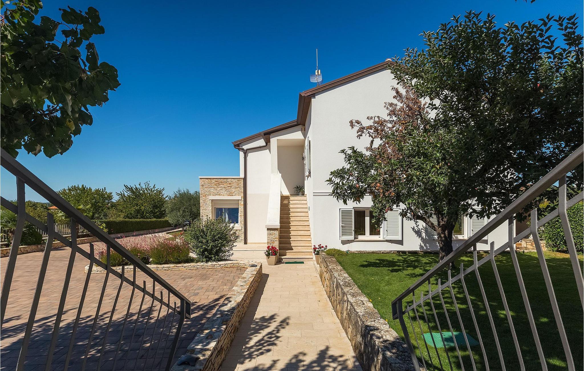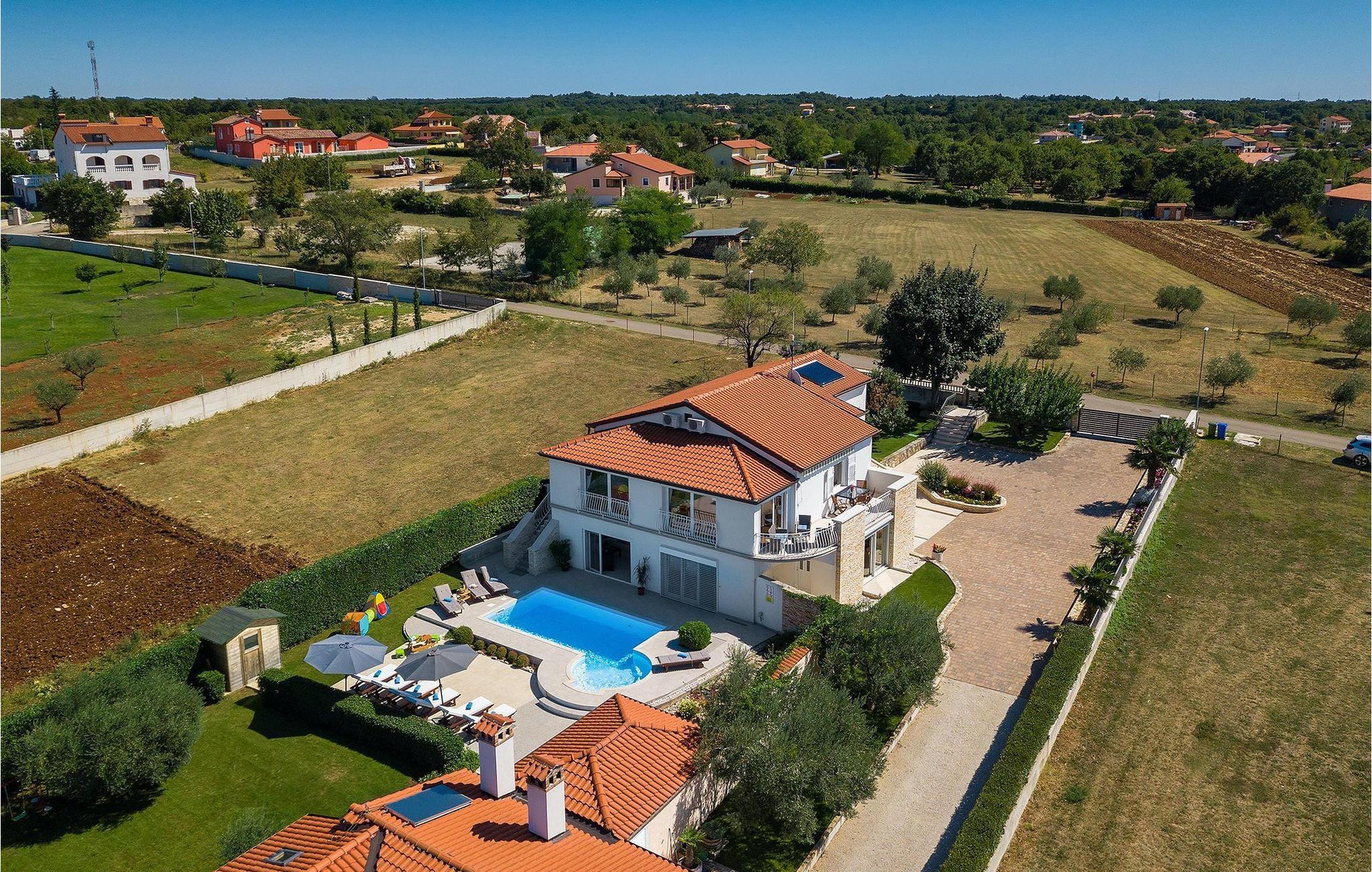 Villa Allegra er en dejlig familievilla beliggende i hjertet af Istrien. Villaen er velegnet til at rumme 6 gæster i sine 3 smagfuldt indrettede soveværelser. Villaen byder på alt til en fuldstændig fornøjelig ferie - en privat pool, et wellness-område med en infrarød sauna samt et fitnessrum til at holde sig i form under dine feriedage. En indendørs jacuzzi er også tilgængelig. Børnene kan lege på legepladsen og trampolinen, eller hygge sig med cykler, mens forældrene tilbereder nogle lækre måltider på grillen på den overdækkede terrasse eller bare slapper af på liggestolene ved siden af poolen. Bordtennis, dart og bordfodbold er også til din rådighed. Stueetagen af villaen består af wellness- og fitnessområdet, mens det fuldt udstyrede køkken med spiseplads, stue og 3 soveværelser ligger på øverste etage. Under dit ophold kan du plukke årstidens frugter og grøntsager fra villaens have og fuldt ud nyde din tid i Istrien i enhver forstand. Villaen er beliggende i den centrale del af Istrien-halvøen, nær den lille by Kanfanar. Den gamle arkitektur i byen og de omkringliggende landsbyer er velbevaret, og oliven dominerer dette område med varmt middelhavsklima. Kanfanar og dets omkringliggende landskab er velkendt, ikke kun for sin historiske og kulturelle arv, men for fremragende ægte istriske køkken. Udover det er denne placering et fantastisk udgangspunkt for at opdage det magiske Istrien - den romantiske by Rovinj er ca. 18 km fra villaen, centralt beliggende Pazin ca. 20 km, den historiske by Porec ca. 30 km, og Istriens største by, Pula, er kun omkring 37 km væk. Afhængigt af din interesse tilbyder denne placering virkelig alt. En bil anbefales.