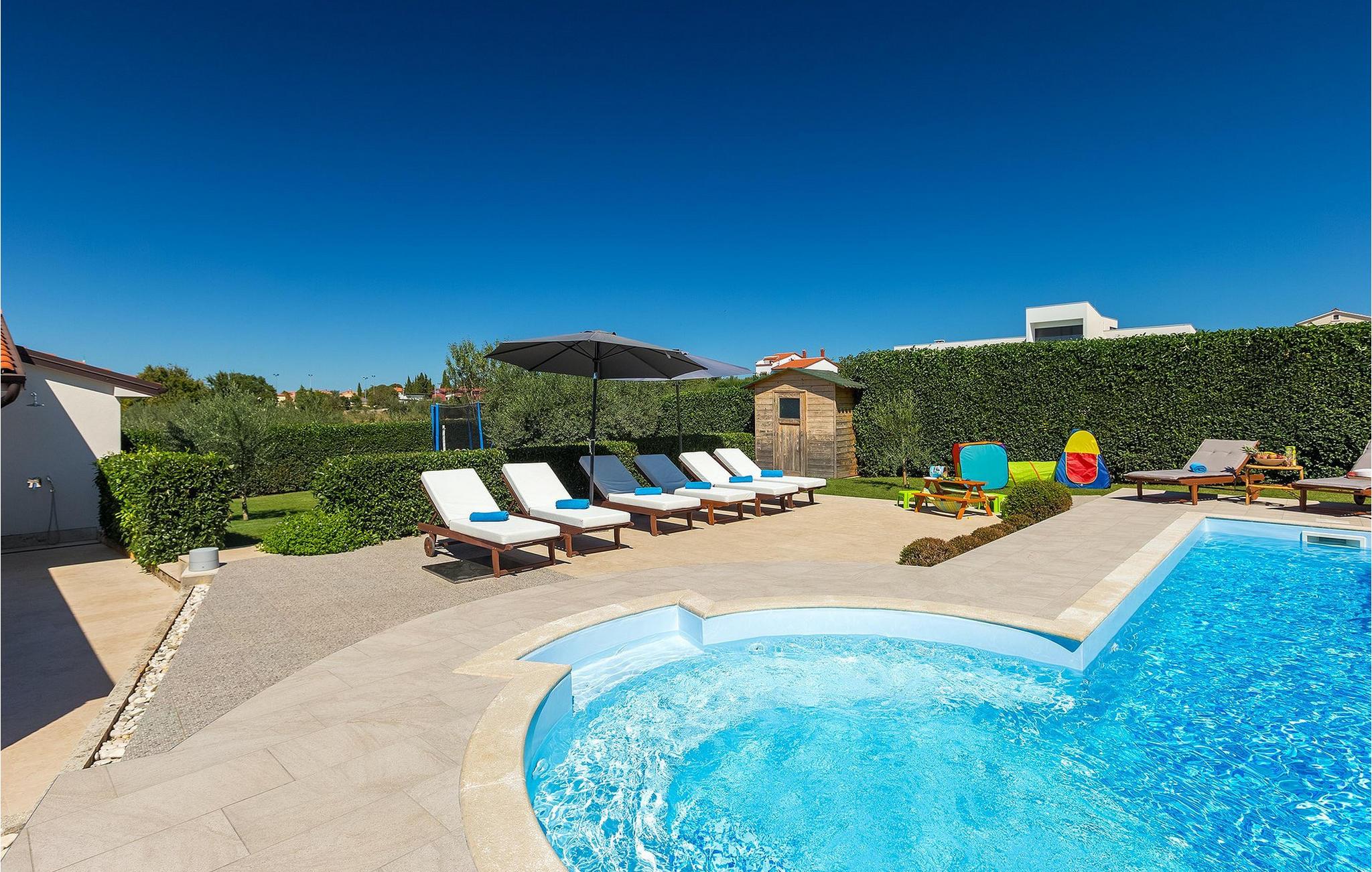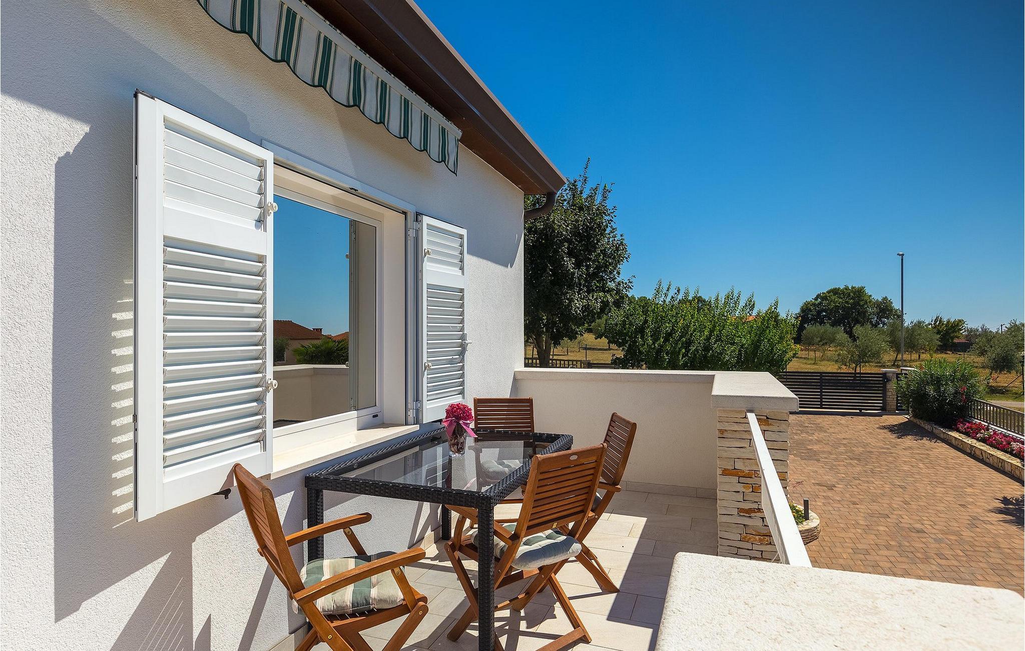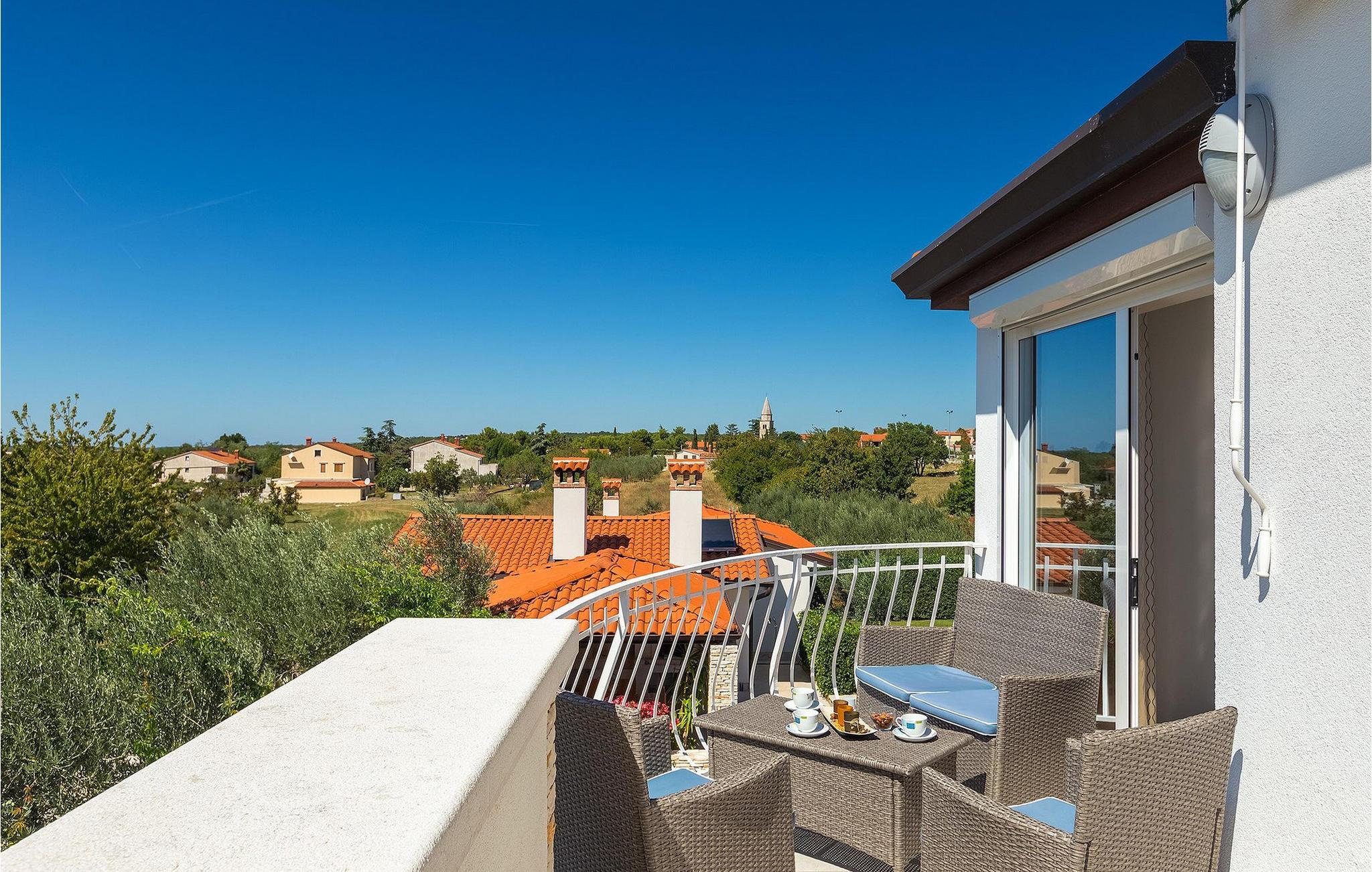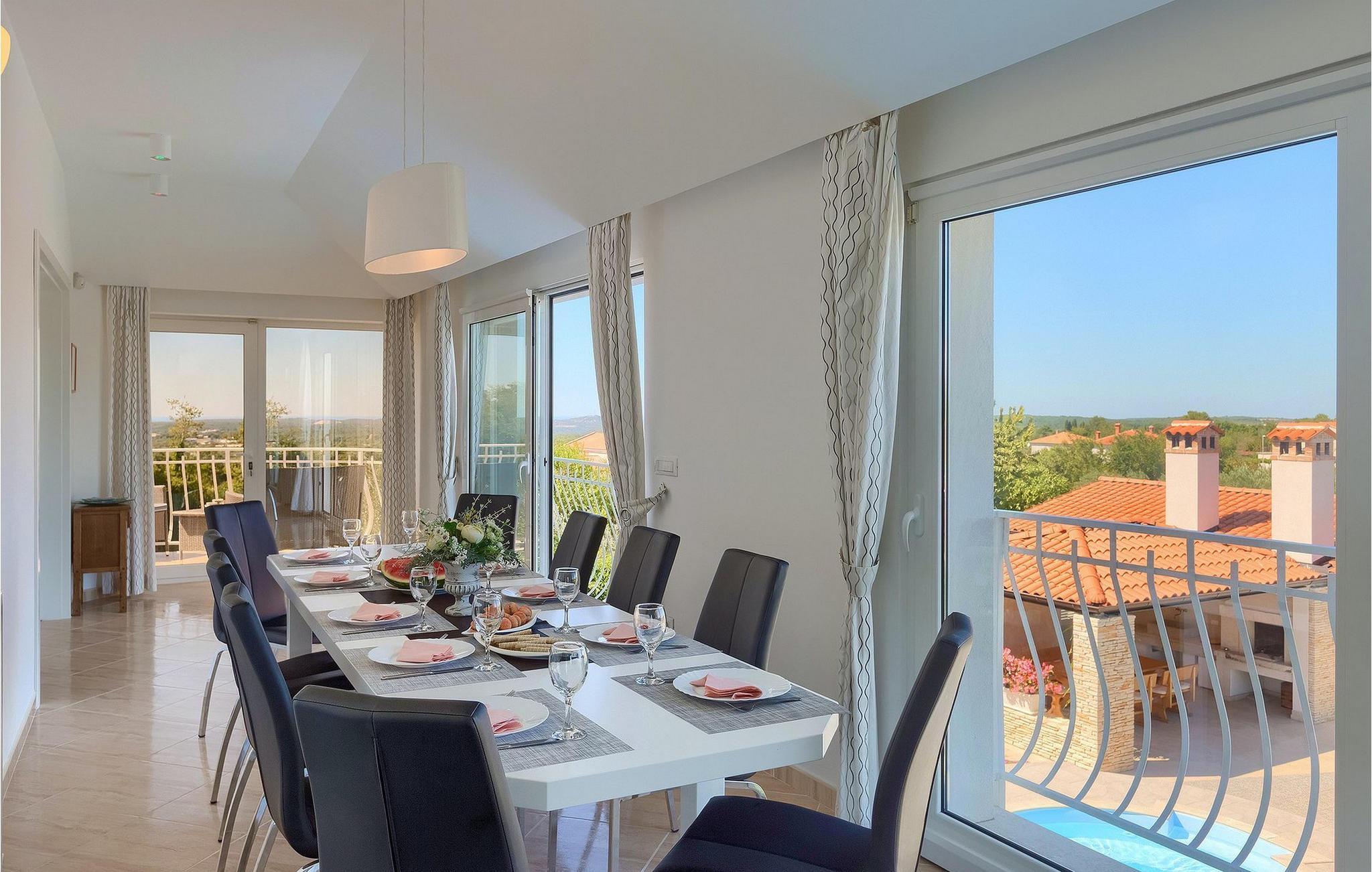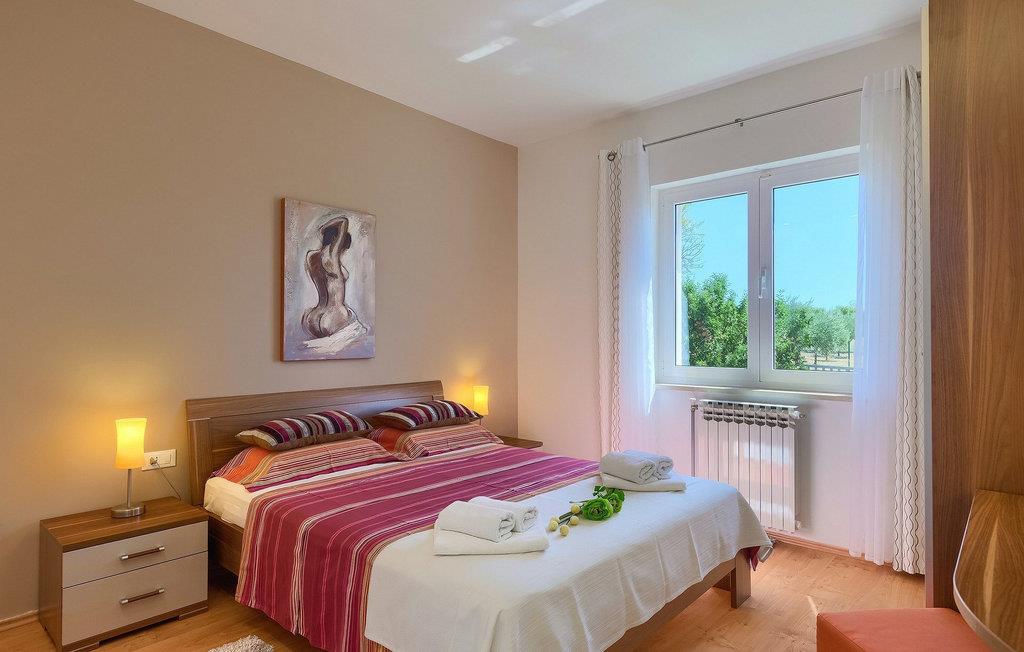 Villa Allegra er en dejlig familievilla beliggende i hjertet af Istrien. Villaen er velegnet til at rumme 6 gæster i sine 3 smagfuldt indrettede soveværelser. Villaen byder på alt til en fuldstændig fornøjelig ferie - en privat pool, et wellness-område med en infrarød sauna samt et fitnessrum til at holde sig i form under dine feriedage. En indendørs jacuzzi er også tilgængelig. Børnene kan lege på legepladsen og trampolinen, eller hygge sig med cykler, mens forældrene tilbereder nogle lækre måltider på grillen på den overdækkede terrasse eller bare slapper af på liggestolene ved siden af poolen. Bordtennis, dart og bordfodbold er også til din rådighed. Stueetagen af villaen består af wellness- og fitnessområdet, mens det fuldt udstyrede køkken med spiseplads, stue og 3 soveværelser ligger på øverste etage. Under dit ophold kan du plukke årstidens frugter og grøntsager fra villaens have og fuldt ud nyde din tid i Istrien i enhver forstand. Villaen er beliggende i den centrale del af Istrien-halvøen, nær den lille by Kanfanar. Den gamle arkitektur i byen og de omkringliggende landsbyer er velbevaret, og oliven dominerer dette område med varmt middelhavsklima. Kanfanar og dets omkringliggende landskab er velkendt, ikke kun for sin historiske og kulturelle arv, men for fremragende ægte istriske køkken. Udover det er denne placering et fantastisk udgangspunkt for at opdage det magiske Istrien - den romantiske by Rovinj er ca. 18 km fra villaen, centralt beliggende Pazin ca. 20 km, den historiske by Porec ca. 30 km, og Istriens største by, Pula, er kun omkring 37 km væk. Afhængigt af din interesse tilbyder denne placering virkelig alt. En bil anbefales.