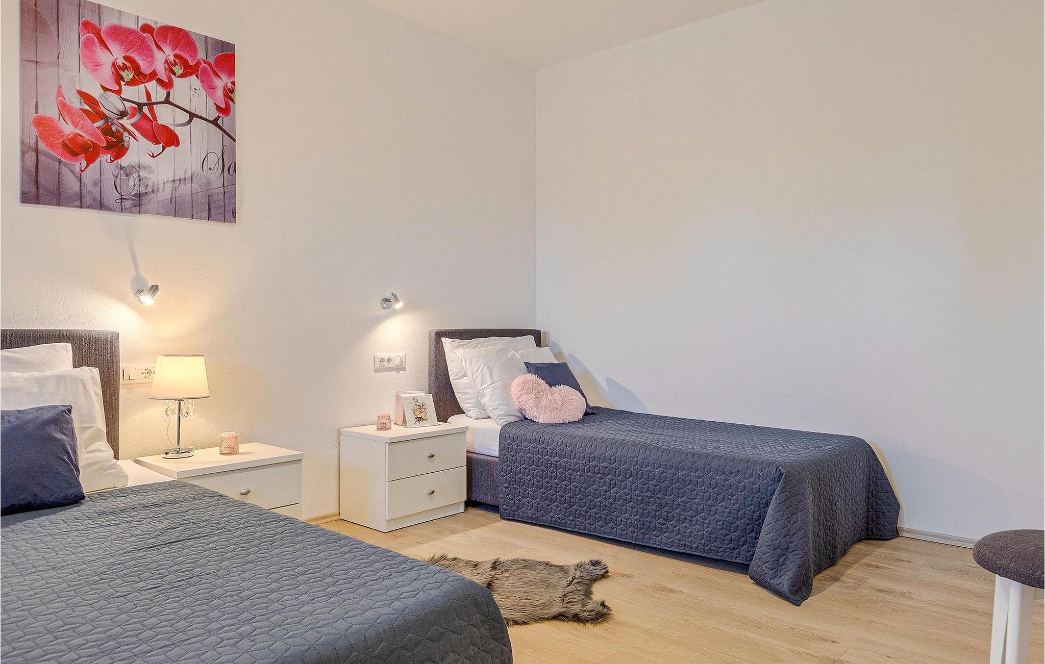 I villaens stueetage venter en fælles opholds-, madlavnings- og spiseplads på dig. Den er kendetegnet ved sine lyse toner og en kombination af moderne og vintage elementer. Den rummelige opholdsstue udstråler en magnetisk aura af afslapning. Et soveværelse med dobbeltseng og eget badeværelse med bruser er også placeret på denne etage, mens de andre tre soveværelser er på første sal. To soveværelser på denne etage er udstyret med en dobbeltseng og har et ensuite badeværelse med bruser, det tredje har en enkeltseng og en dobbeltseng og har også et ensuite badeværelse med bruser. De vidunderlige senge i villaen vil helt sikkert få dig til at sove som en baby!