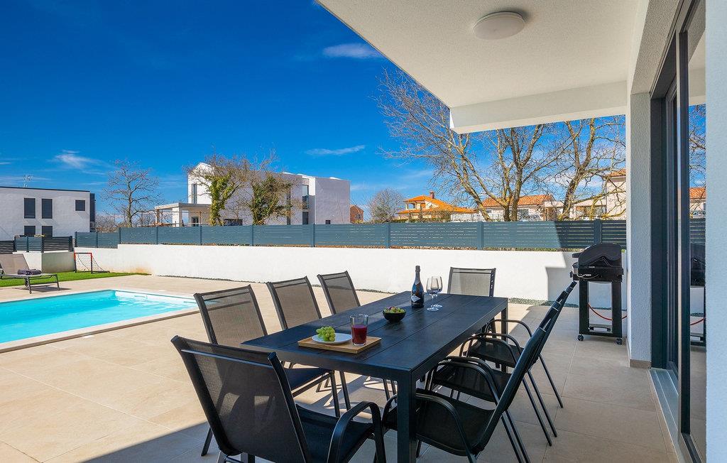 Nyd en fantastisk tid med dine kære ved villaens 32m2 turkise pool, slap af på en af de komfortable liggestole med en forfriskende drink i hånden, mens børnene leger i haven, tilbring milde sommeraftener på den overdækkede terrasse og nyd frisk grillede delikatesser.