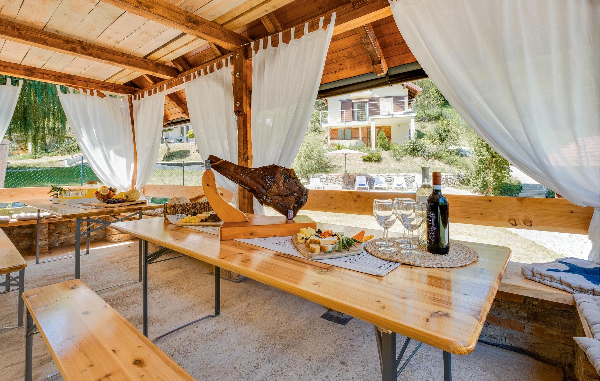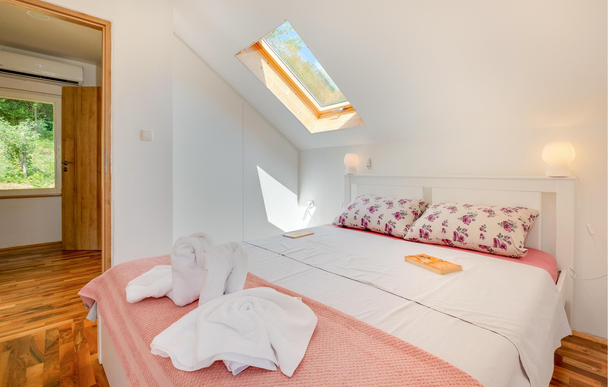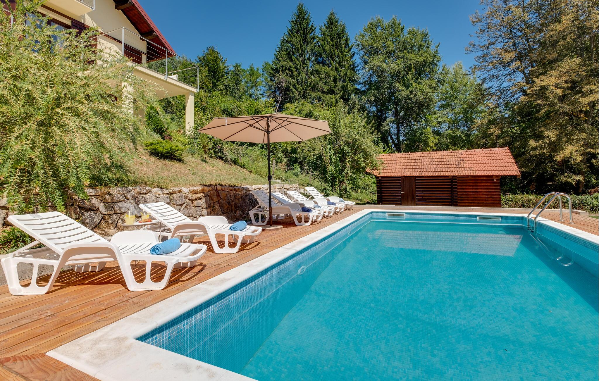 Jeres feriehus i Koranski Brijeg ligger idyllisk på en lille bakke nær floden Korana. Huset består af to separate enheder. I stueetagen finder I en hyggelig lejlighed til to personer, mens der på første sal er en rummelig bolig med to soveværelser til fire personer. Nyd den fantastiske udsigt over det grønne landskab, de blide bakker og de omkringliggende skove. Lad jer inspirere af naturens ro og start dagen med en afslappet morgenmad på terrassen. Et hop i poolen giver en forfriskende afkøling og energi til dagen.