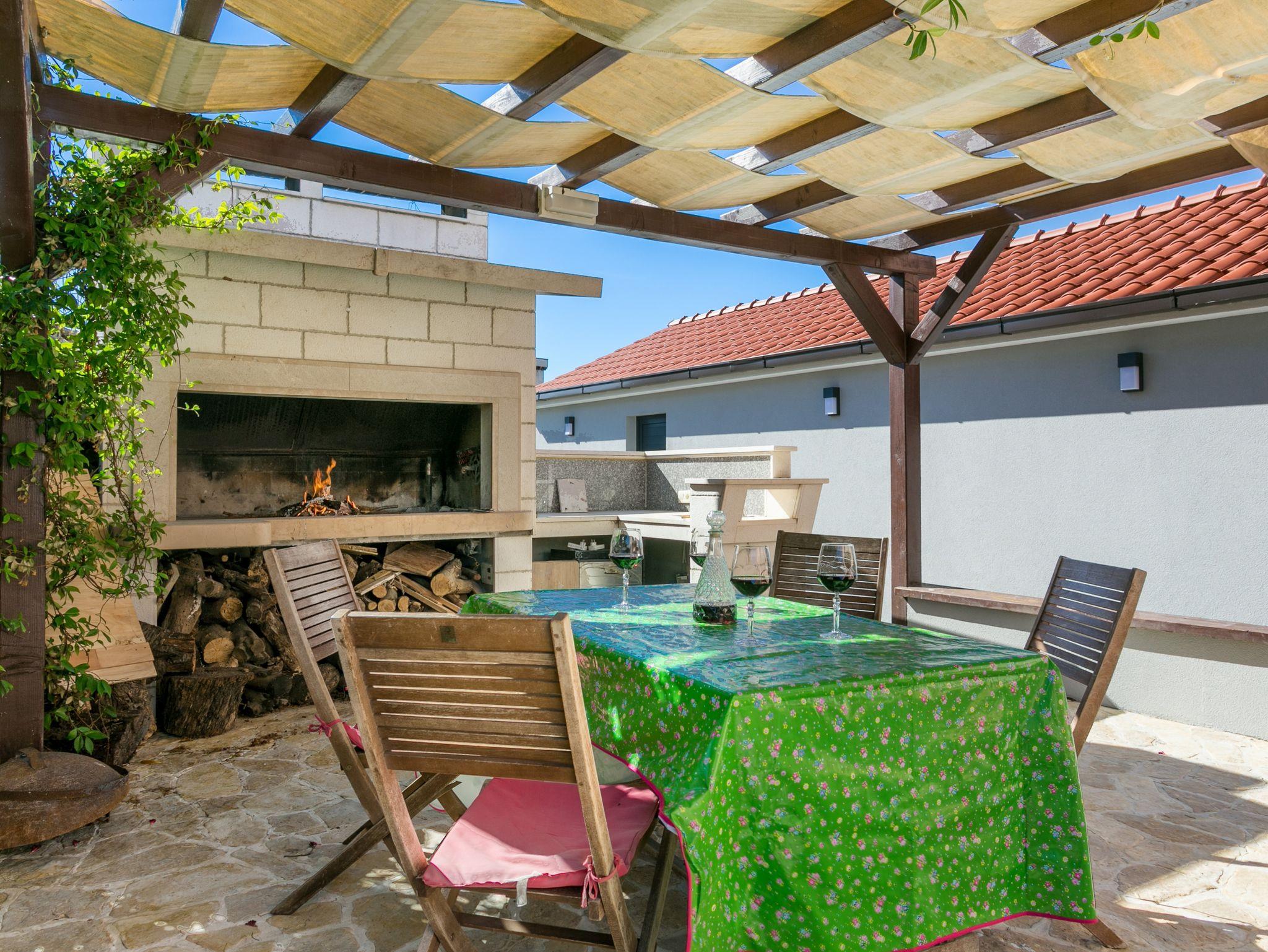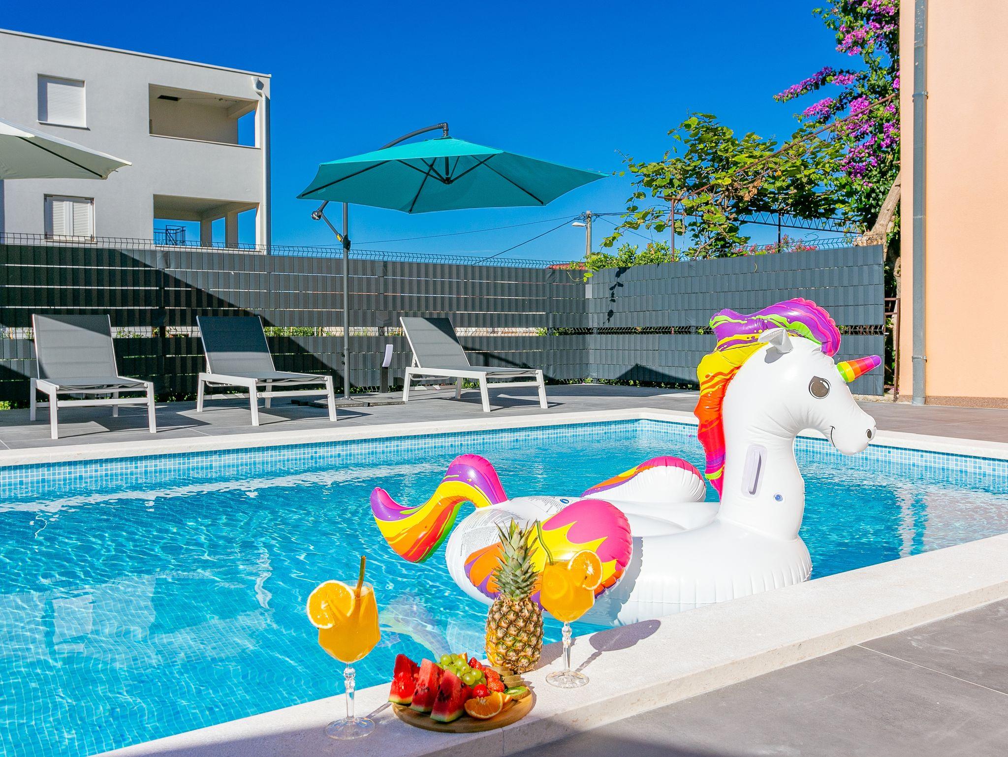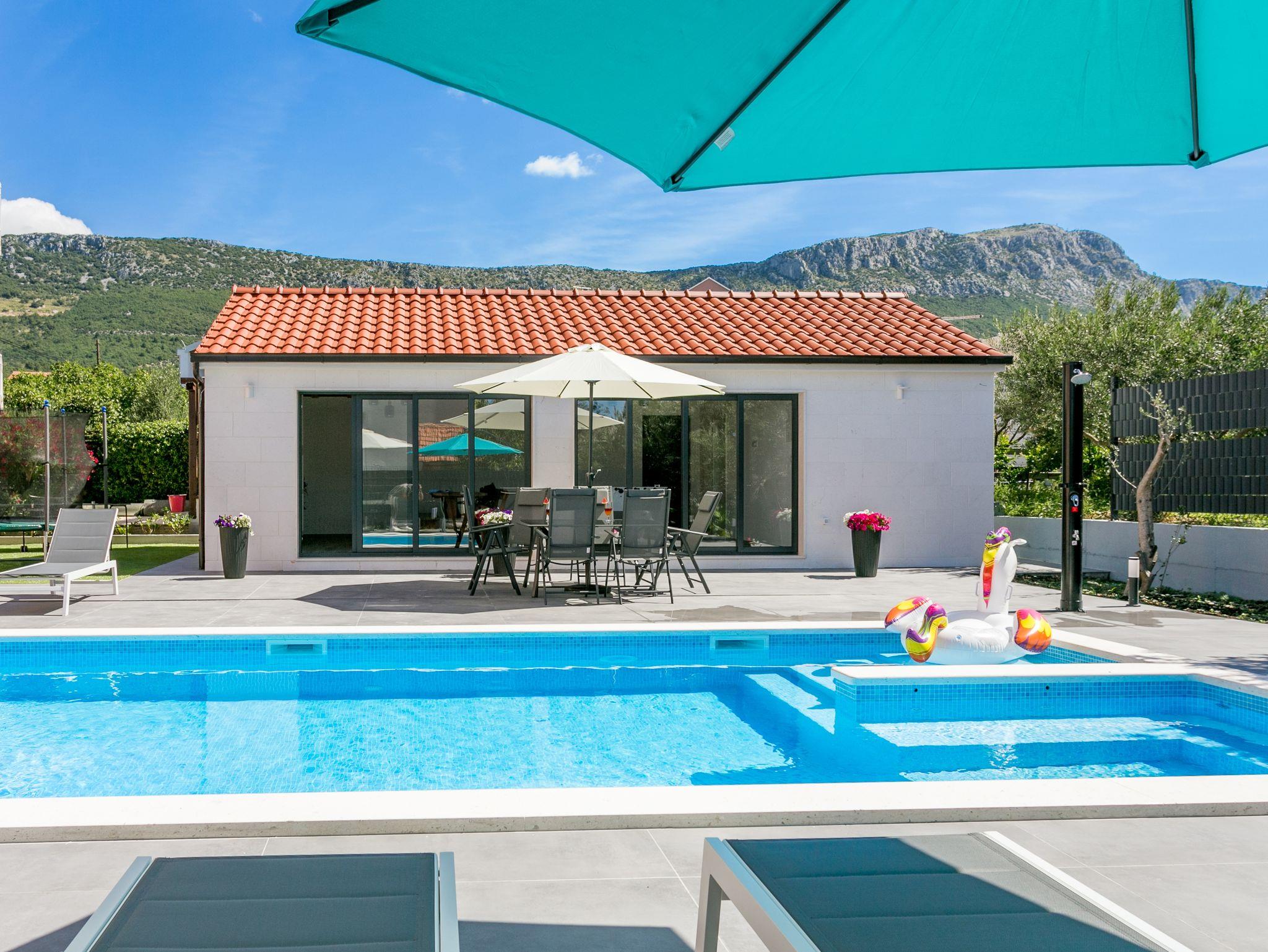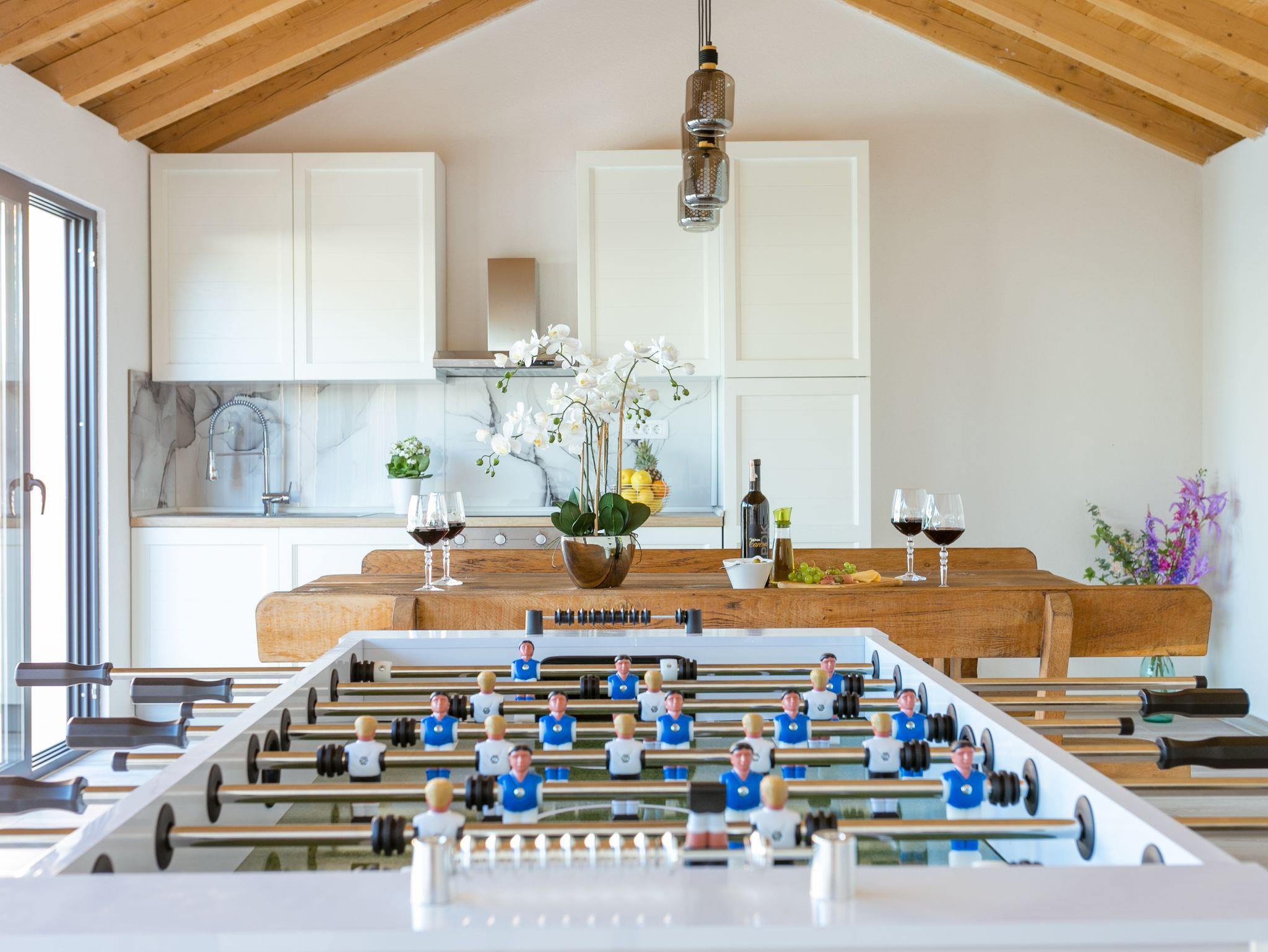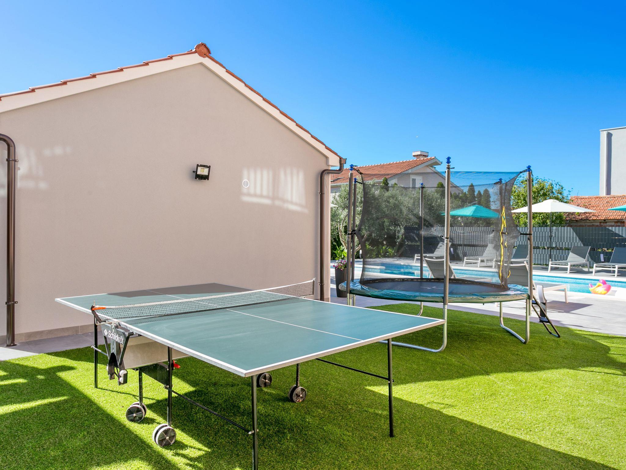 Hof (120m2, Kinderbereich, Sitzbereich), Parkplatz (Anzahl der Parkplätze: 4, Entfernung vom Objekt: im Hof), Pool: gemeinsam, Dimensionen: 13m x 4.5m x 1.6m, Wassertyp: Süßwasser, Heizung: Ja, Grill: gemeinsam, WiFi Internet, Föhn, Bügeleisen, Bügelbrett, Kinderbett