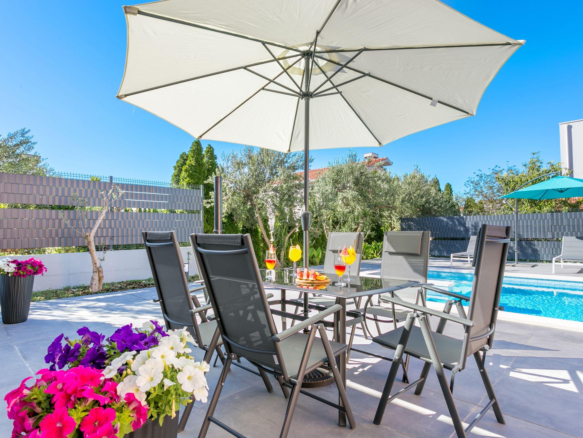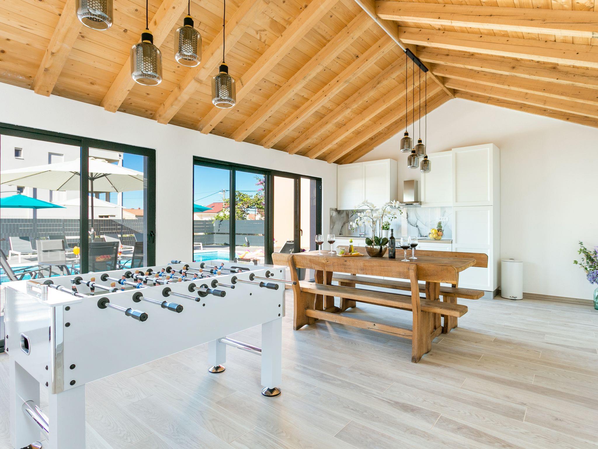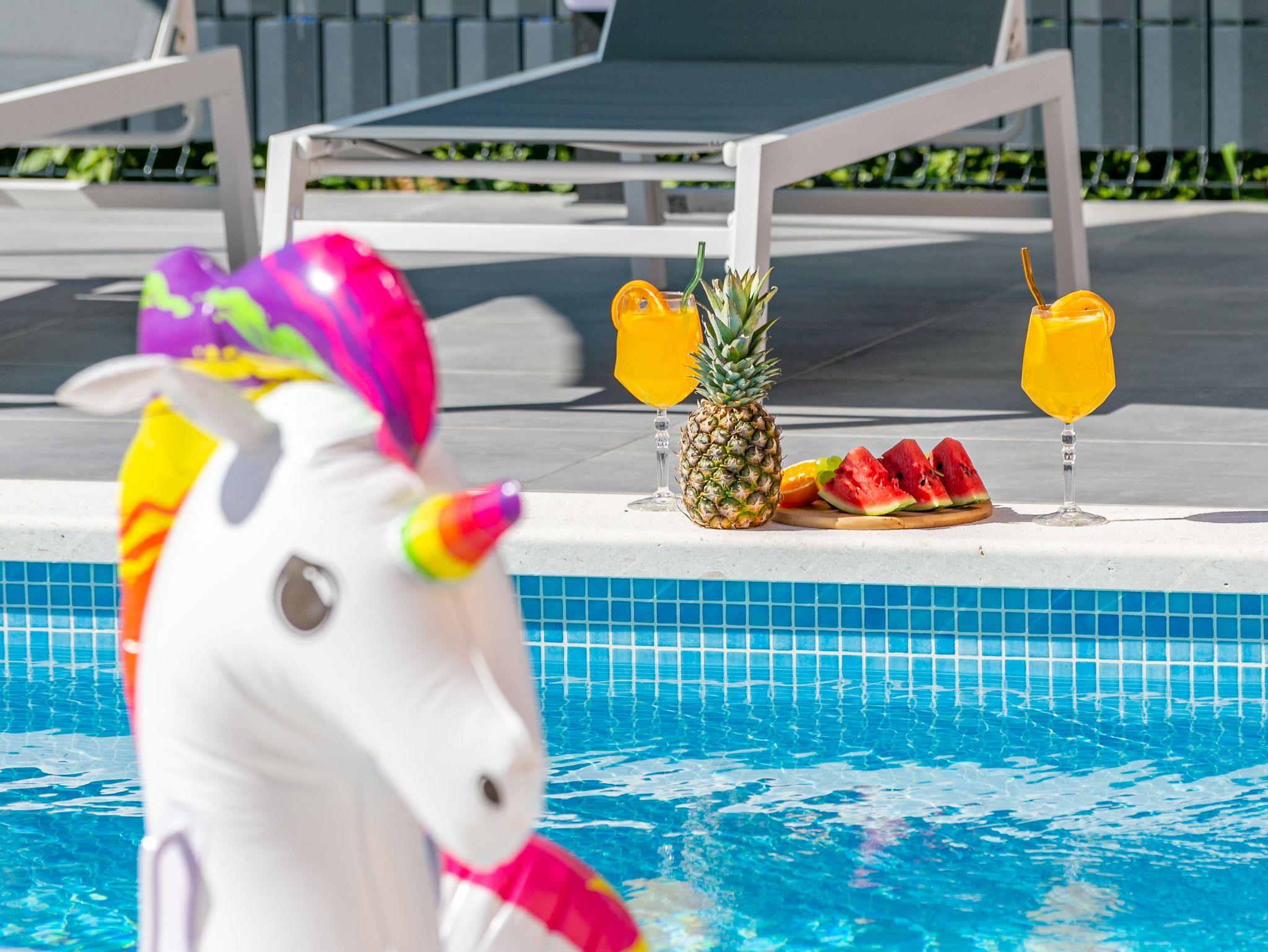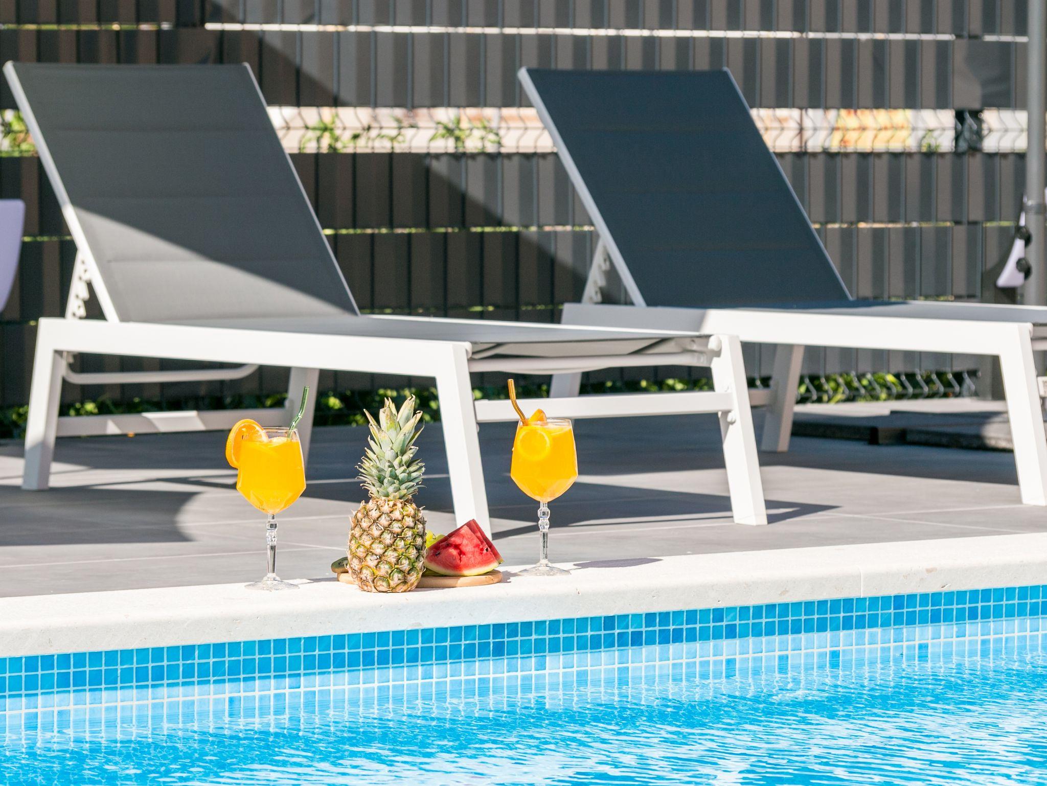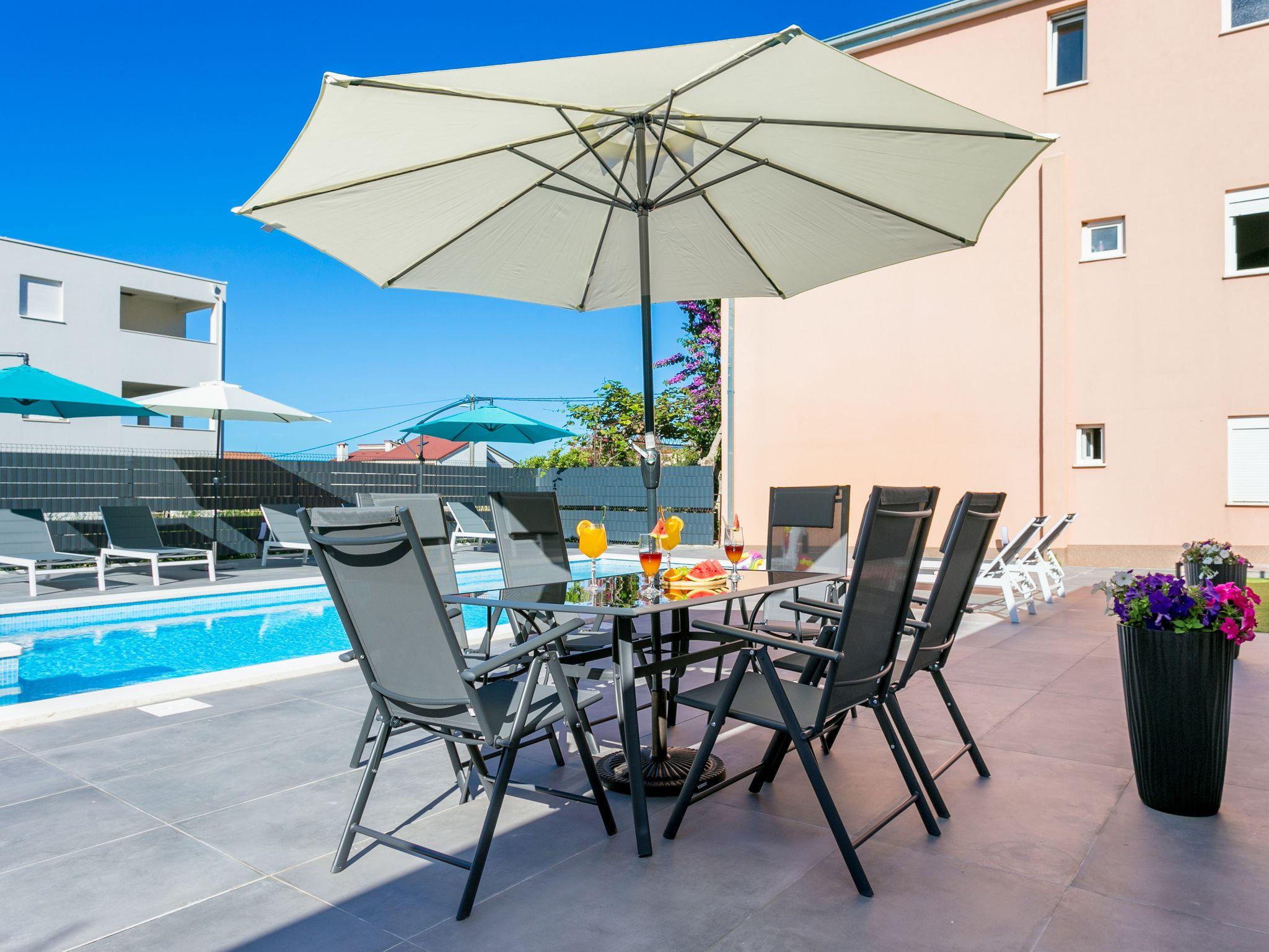 Hof (120m2, Kinderbereich, Sitzbereich), Parkplatz (Anzahl der Parkplätze: 4, Entfernung vom Objekt: im Hof), Pool: gemeinsam, Dimensionen: 13m x 4.5m x 1.6m, Wassertyp: Süßwasser, Heizung: Ja, Grill: gemeinsam, WiFi Internet, Föhn, Bügeleisen, Bügelbrett, Kinderbett