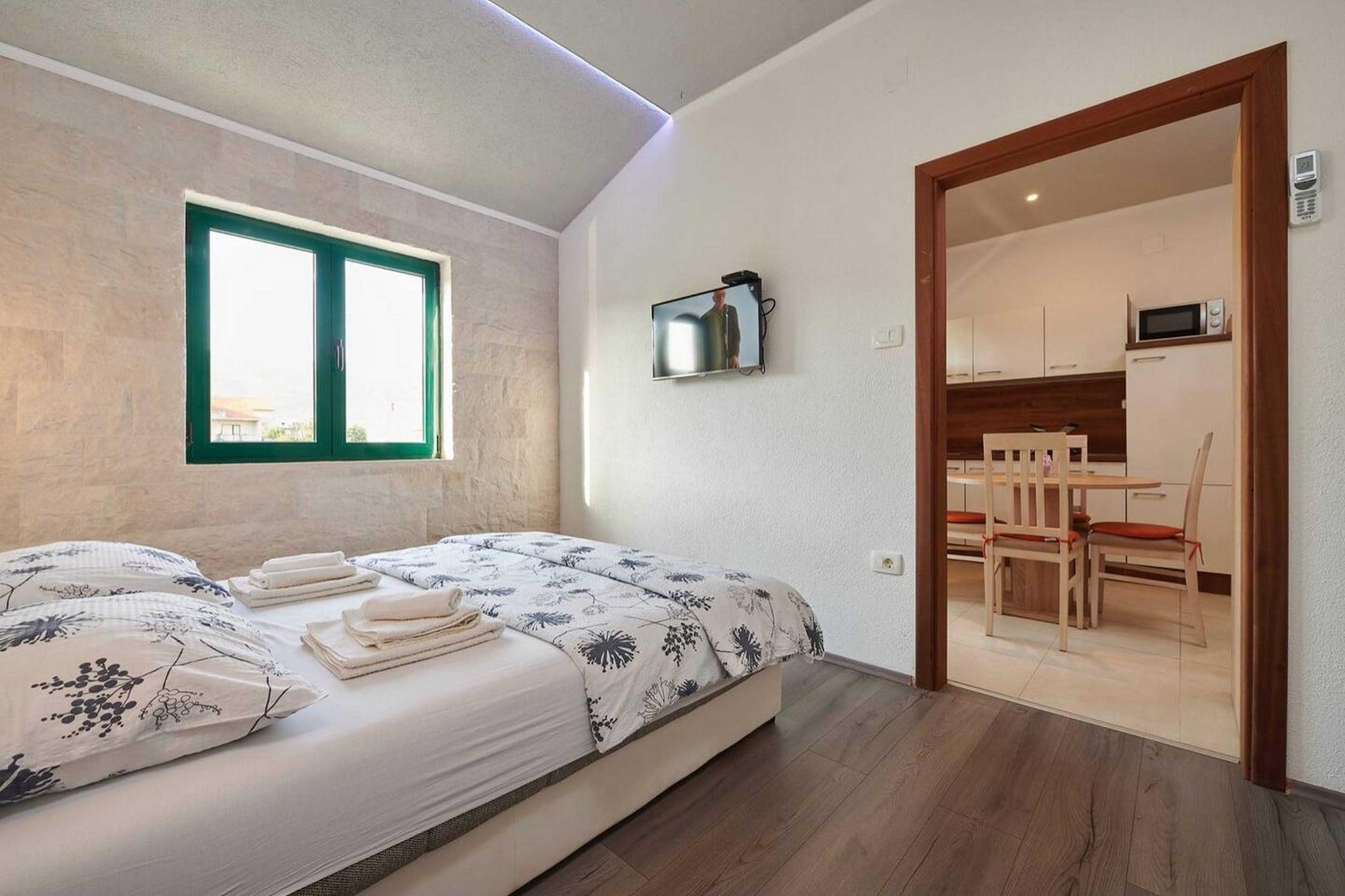 Apartments Vujina er beliggende i Kaštel Štafilic, stedet mellem Split og Trogir, kun 150 m fra stranden Bila. Ejendommen tilbyder tre lejligheder med selvforplejning hver med dejlig møbleret terrasse. Privat olivenhave med legeplads til børn samt grillfaciliteter er til rådighed for gæsterne " bortskaffelse. Privat parkering er til rådighed, reservation er ikke påkrævet. Kæledyr er tilladt efter anmodning mod et tillægsgebyr på 5 euro pr. nat. Strygefaciliteter er tilgængelige efter anmodning. Lej en cykel er tilgængelig efter anmodning mod et tillægsgebyr. Denne studiolejlighed leveres med en dobbeltseng og en dobbelt sovesofa, hvilket gør denne lejlighed til en perfekt plads til op til fire personer. Den har også fladskærms-tv samt spiseplads. Køkkenet er veludstyret med køleskab, vandkedel, mikroovn, komfur, og køkkenredskaber. Det private badeværelse er udstyret med bruser og toilet. Du har også adgang til en vaskemaskine. Hårtørrer og håndklæder samt sengetøj er til din rådighed.Kaštel Štafilic er en by i det administrative område Kaštela i Dalmatien. Alt hvad du har brug for kan findes inden for gåafstand, såsom restauranter, caféer, købmand, bageri, busstoppested og apotek. Den nærmeste strand ligger 150 m fra ejendommen. Split færgehavn og hovedbusstation ligger 23 km fra hotellet. ejendommen, mens Split Lufthavn ligger 3 km derfra.