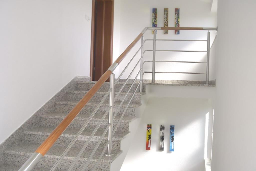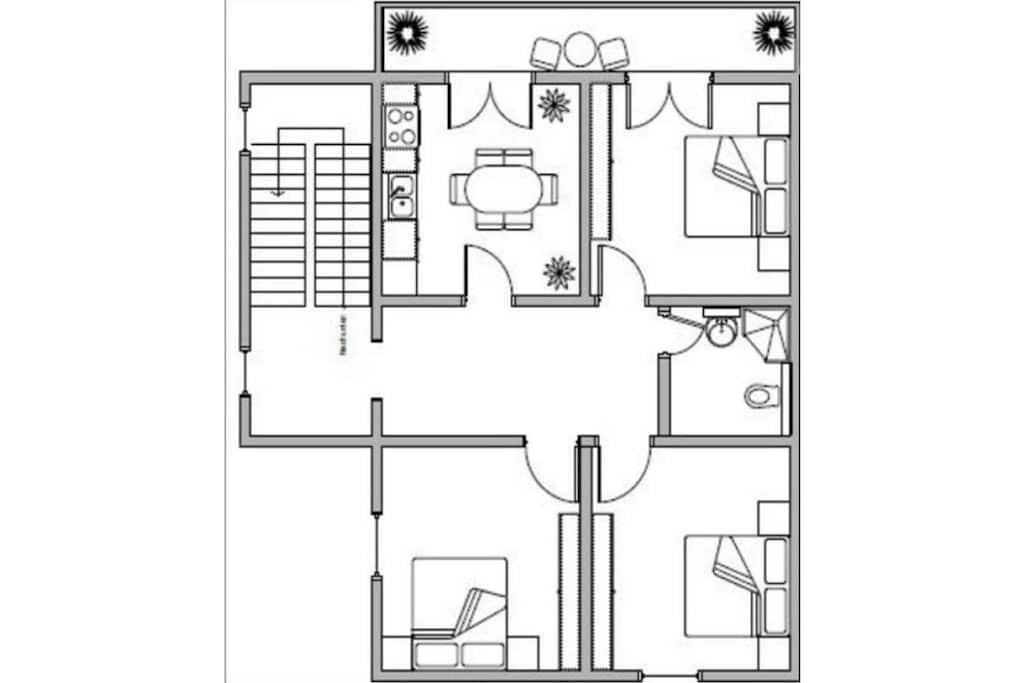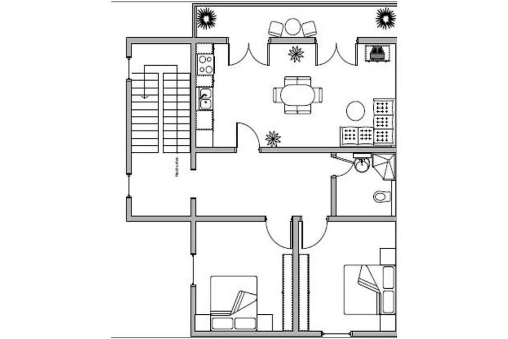 Feriehuset er egnet til en gruppe på op til 14 personer. De tre køkkener med spiseplads tilbyder rigelig plads og et højt komfortniveau for dig og din gruppe. De er udstyret med tv, radio, siddepladser og alle nødvendige køkkenapparater. I stueetagen og de to øverste etager finder I lyse og indbydende badeværelser med bruser. De syv dobbeltværelser (hver 17 m²) er placeret på alle niveauer og har komfortable dobbeltsenge (1,80 x 2,00 m). Hver af de to øverste etager har en sydvendt balkon (12 m²) til afslapning, tilgængelig fra køkkenerne med spiseplads.