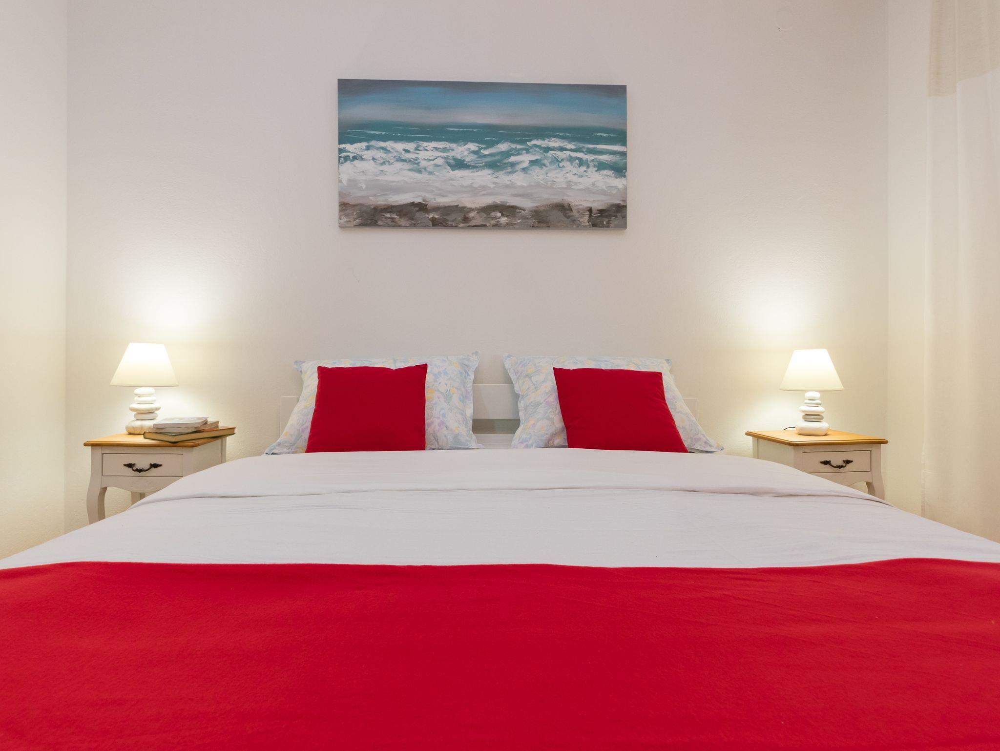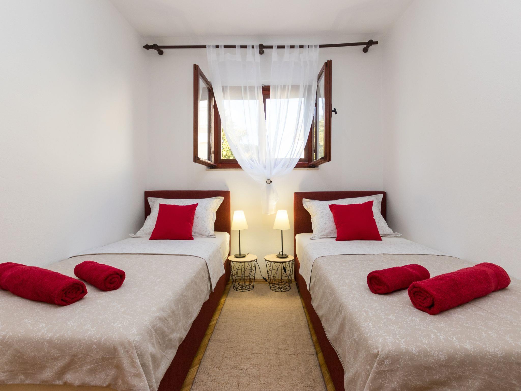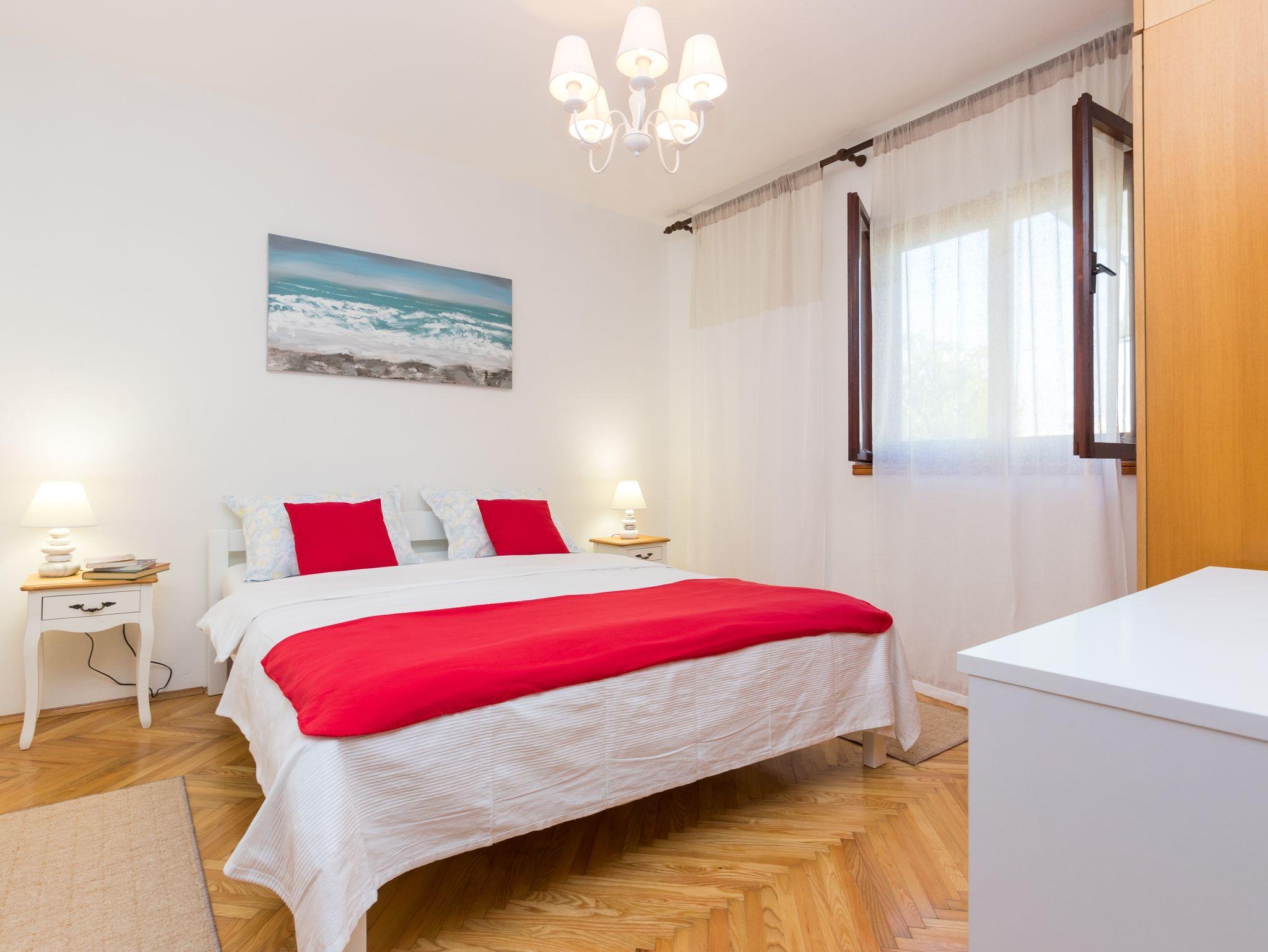 Ferienwohnung bietet Platz für 4 Gäste. Die Betten sind in Schlafzimmern, die es 2 gibt, innerhalb einer Gesamtfläche von 44m2, angeordnet. Die Gäste haben eine eigene Terrasse zur Verfügung, auf der sie in warmen Sommernächten genießen können. Für vollen Genuss und Entspannung gibt es einen privaten Grill für Gäste dieser Unterkunft. IM PREIS INBEGRIFFEN: Kurtaxe, Endreinigung, Klimatisierung, Parkplatz, Internet, Bügeleisen, Bügelbrett, Föhn. VERBINDLICHE ZUSÄTZLICHE KOSTEN: Aufzahlung für Kurzaufenthalte (prozentualer Zuschlag pro Nächtigungsanzahl: 30% - 1, 20% - 2, 10% - 3). Die Verfügbarkeit zusätzlicher Dienstleistungen in Ihrem reservierten Termin und die Preise derselben (falls nicht aufgeführt) müssen im Voraus überprüft werden. Zusätzliche Dienstleistungen die in der Zahlungsaufforderung nicht aufgeführt sind werden direkt beim Vermieter bezahlt, angenommen der Gast nutzt auch diese.