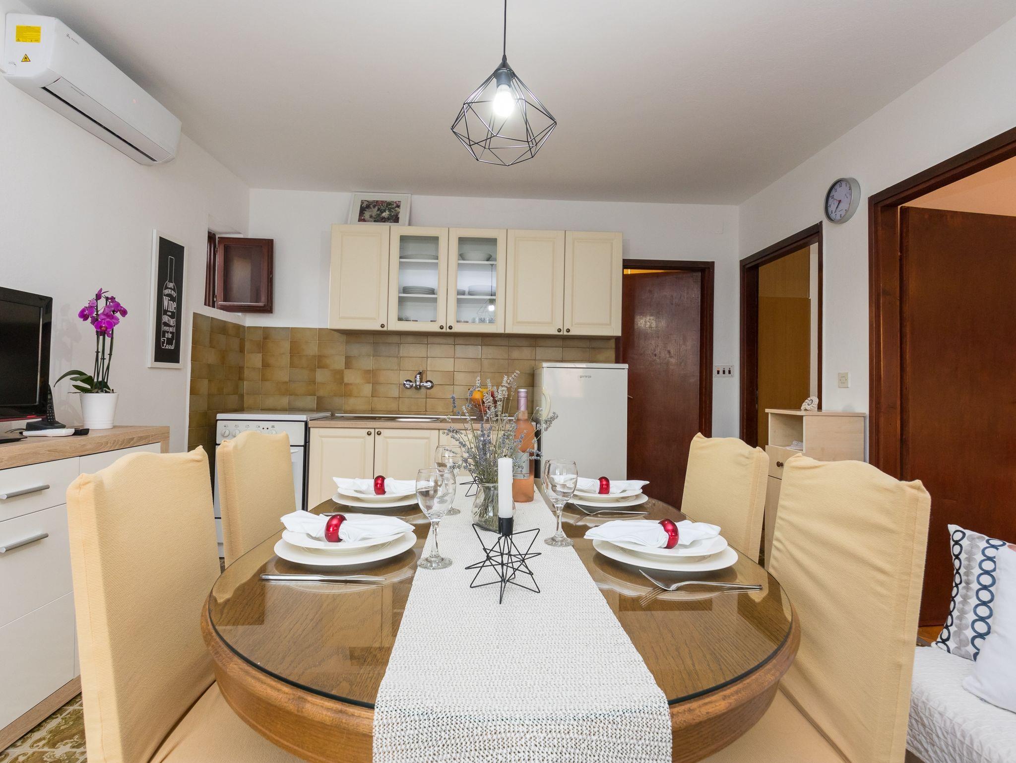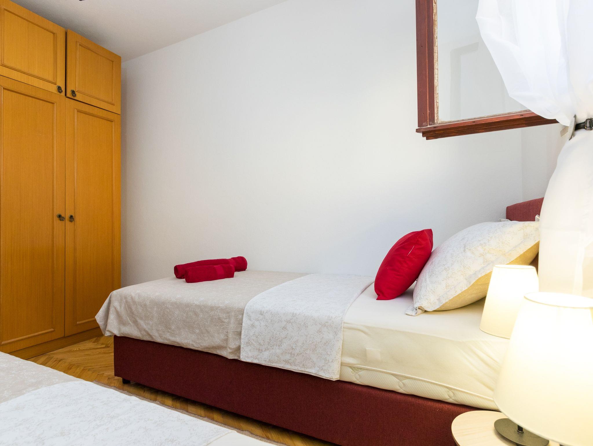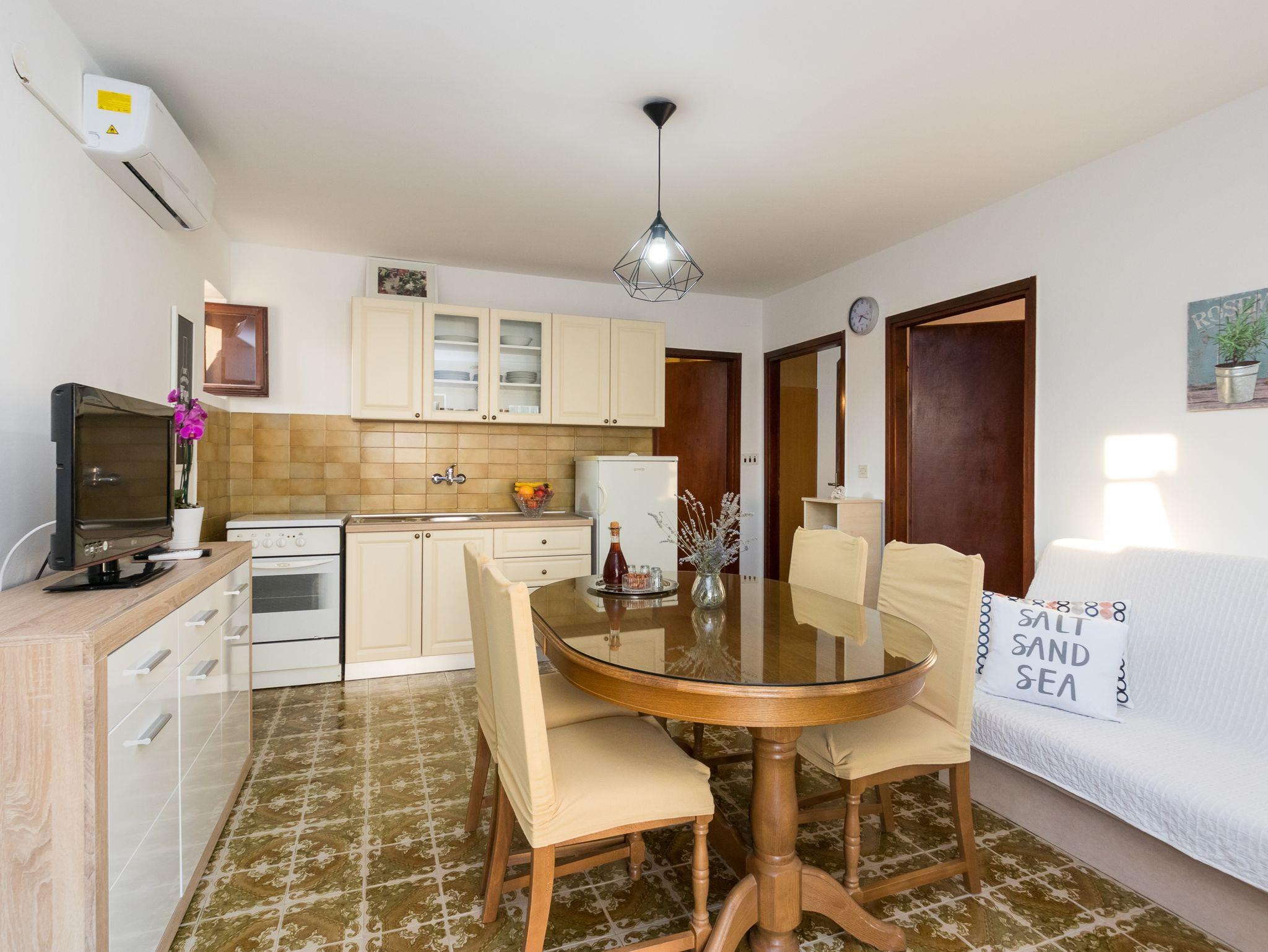 Ferienwohnung bietet Platz für 4 Gäste. Die Betten sind in Schlafzimmern, die es 2 gibt, innerhalb einer Gesamtfläche von 44m2, angeordnet. Die Gäste haben eine eigene Terrasse zur Verfügung, auf der sie in warmen Sommernächten genießen können. Für vollen Genuss und Entspannung gibt es einen privaten Grill für Gäste dieser Unterkunft. IM PREIS INBEGRIFFEN: Kurtaxe, Endreinigung, Klimatisierung, Parkplatz, Internet, Bügeleisen, Bügelbrett, Föhn. VERBINDLICHE ZUSÄTZLICHE KOSTEN: Aufzahlung für Kurzaufenthalte (prozentualer Zuschlag pro Nächtigungsanzahl: 30% - 1, 20% - 2, 10% - 3). Die Verfügbarkeit zusätzlicher Dienstleistungen in Ihrem reservierten Termin und die Preise derselben (falls nicht aufgeführt) müssen im Voraus überprüft werden. Zusätzliche Dienstleistungen die in der Zahlungsaufforderung nicht aufgeführt sind werden direkt beim Vermieter bezahlt, angenommen der Gast nutzt auch diese.