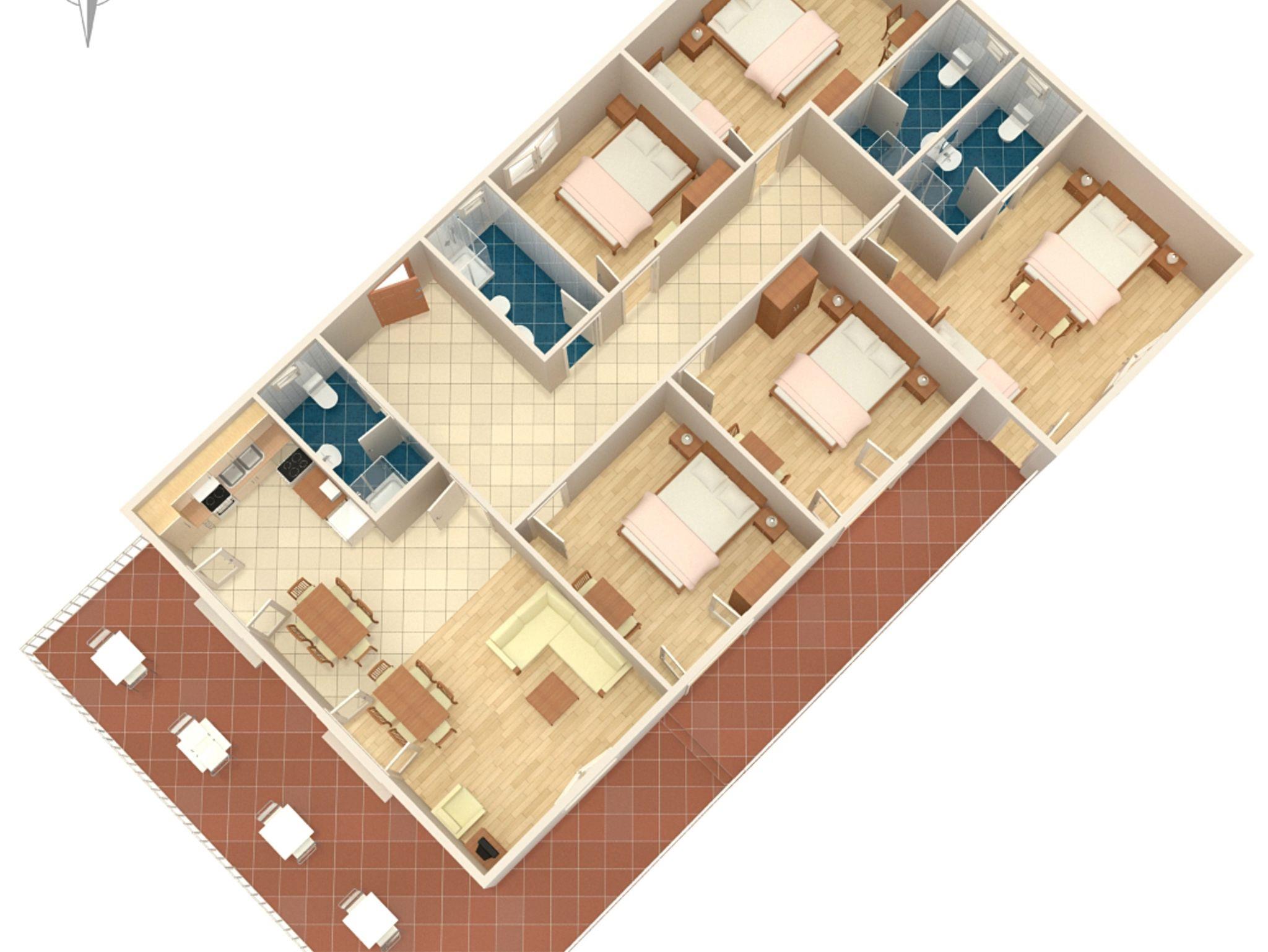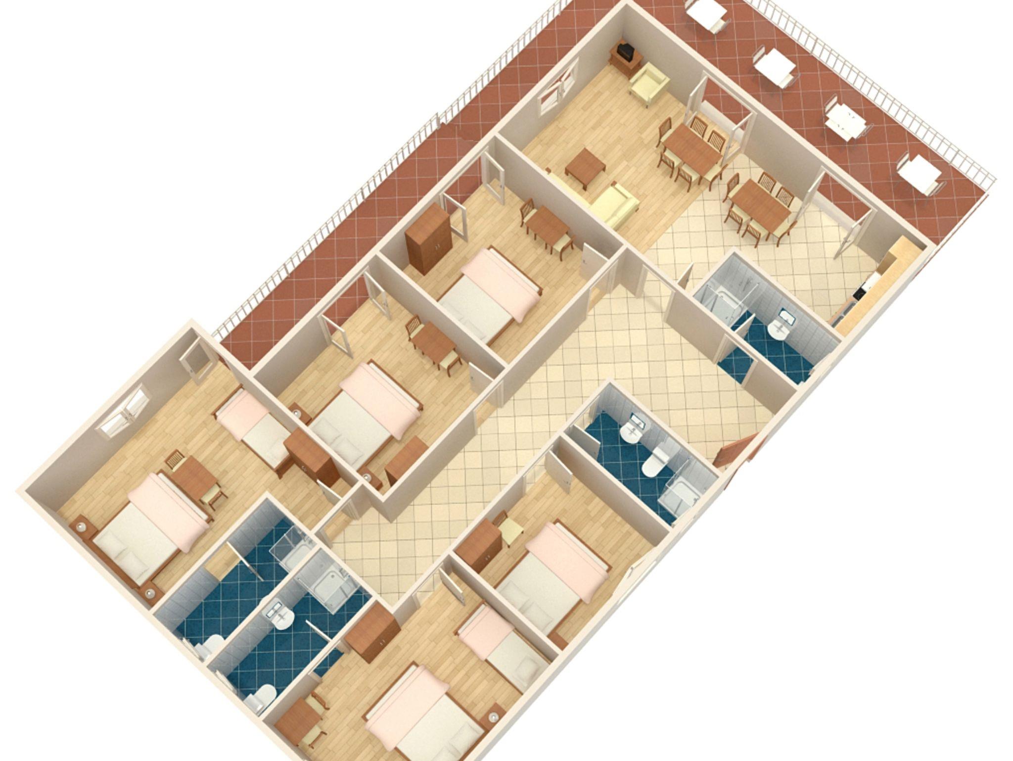 Ferienwohnung bietet Platz für 12 Gäste. Die Betten sind in Schlafzimmern, die es 5 gibt, innerhalb einer Gesamtfläche von 124m2, angeordnet. Die Gäste haben eine eigene Terrasse zur Verfügung, auf der sie in warmen Sommernächten genießen können. Es ist erlaubt, Speisen auf dem Gemeinschafts-Grill vorzubereiten. IM PREIS INBEGRIFFEN: Kurtaxe, Endreinigung, Klimatisierung, Parkplatz, Internet, Kinderbett, Bügeleisen, Bügelbrett, Föhn. VERBINDLICHE ZUSÄTZLICHE KOSTEN: Aufzahlung für Kurzaufenthalte (prozentualer Zuschlag pro Nächtigungsanzahl: 30% - 1, 20% - 2, 10% - 3). UNVERBINDLICHE ZUSÄTZLICHE KOSTEN: Wäschewaschen (8,00 € Waschen). Die Verfügbarkeit zusätzlicher Dienstleistungen in Ihrem reservierten Termin und die Preise derselben (falls nicht aufgeführt) müssen im Voraus überprüft werden. Zusätzliche Dienstleistungen die in der Zahlungsaufforderung nicht aufgeführt sind werden direkt beim Vermieter bezahlt, angenommen der Gast nutzt auch diese. Ermäßigung auf den Grundpreis: Gratistag 14=13 (bei einem Aufenthalt von 14 Tagen oder mehr erhalten Sie einen Gratistag für den Aufenthalt bis 31.12.26).