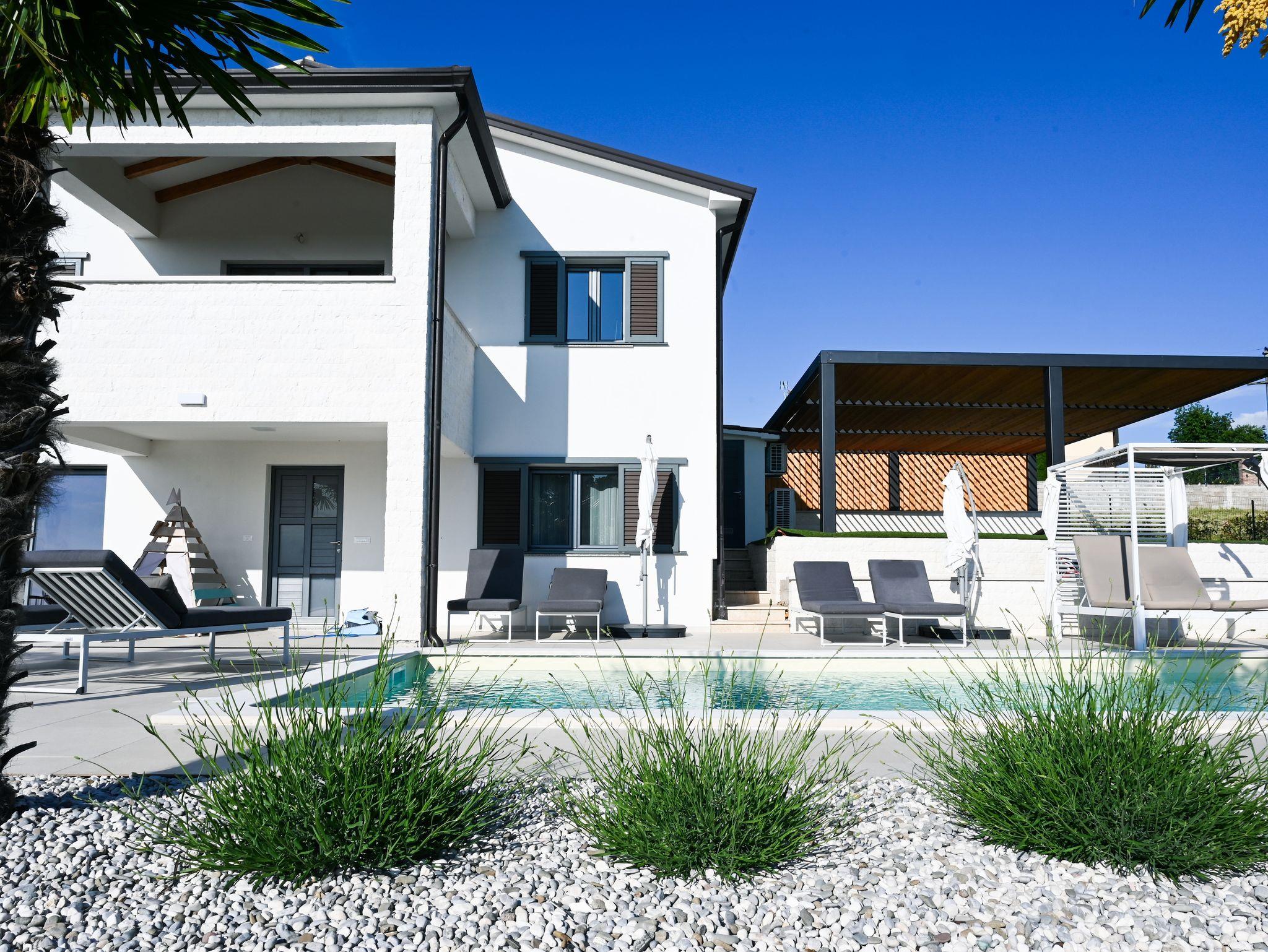 Haus bietet Platz für 8 Gäste. Die Betten sind in Schlafzimmern, die es 4 gibt, innerhalb einer Gesamtfläche von 153m2, angeordnet. Die Gäste haben eine eigene Terrasse zur Verfügung, auf der sie in warmen Sommernächten genießen können. Das Haus bietet Meerblick. Es ist erlaubt, Speisen auf dem Gemeinschafts-Grill vorzubereiten. Während ihres Aufenthalts können sich Gäste im privaten Schwimmbad entspannen. In der gebuchten Unterkunftseinheit zahlt man am Ort ein Depositum ( der Preis ist an der Internetseite angeführt ). IM PREIS INBEGRIFFEN: Endreinigung, Klimatisierung, Zentralheizung, Pool, Parkplatz, Internet, Kinderbett, Bügeleisen, Bügelbrett, Föhn, tragbarer Grill, 1 Bett für Kinder (im Preis enthalten). VERBINDLICHE ZUSÄTZLICHE KOSTEN: Kurtaxe (Erwachsene 0,93 € - 1,99 € Nacht/Person, Kinderermäßigung 12 - 17 Jahre), Kaution (500,00 € Einmalzahlung). UNVERBINDLICHE ZUSÄTZLICHE KOSTEN: Fahrrad (20,00 € täglich (pro Stück)). Die Verfügbarkeit zusätzlicher Dienstleistungen in Ihrem reservierten Termin und die Preise derselben (falls nicht aufgeführt) müssen im Voraus überprüft werden. Zusätzliche Dienstleistungen die in der Zahlungsaufforderung nicht aufgeführt sind werden direkt beim Vermieter bezahlt, angenommen der Gast nutzt auch diese. Ermäßigung auf den Grundpreis: Gratistag 28=25 (bei einem Aufenthalt von 28 oder mehr Tagen erhalten Sie 3 kostenlose Tage für den Aufenthalt bis 31.12.26).