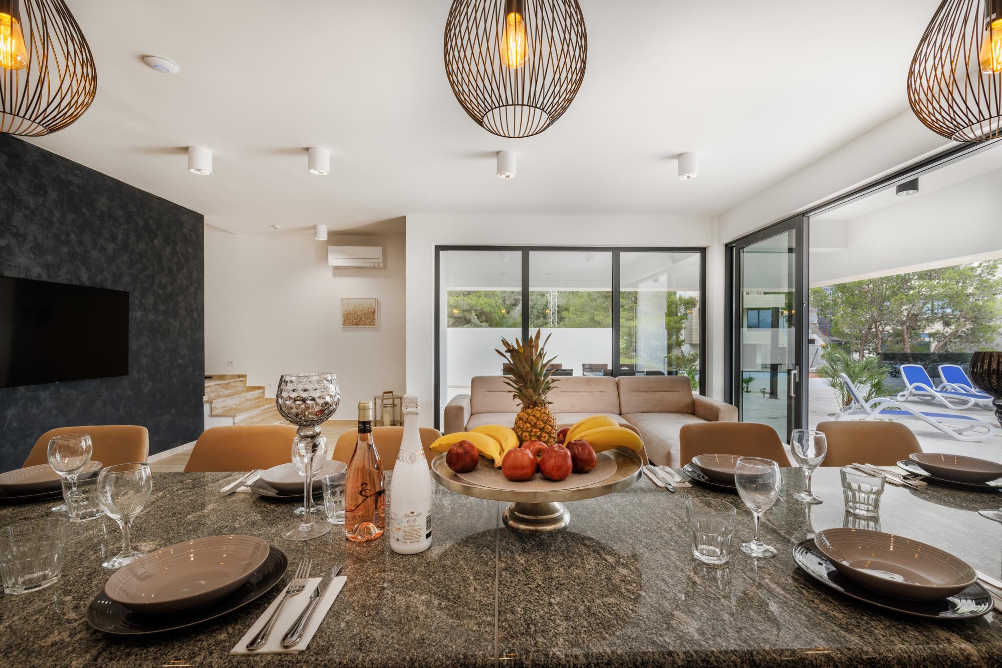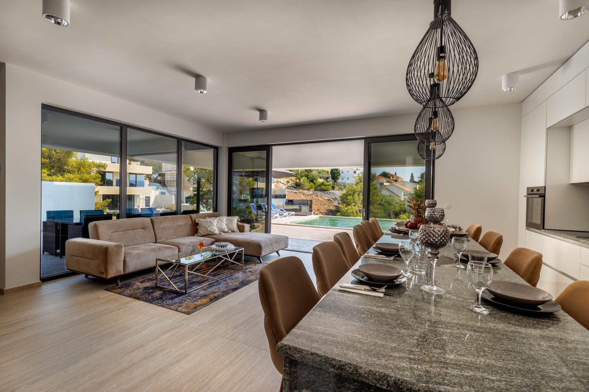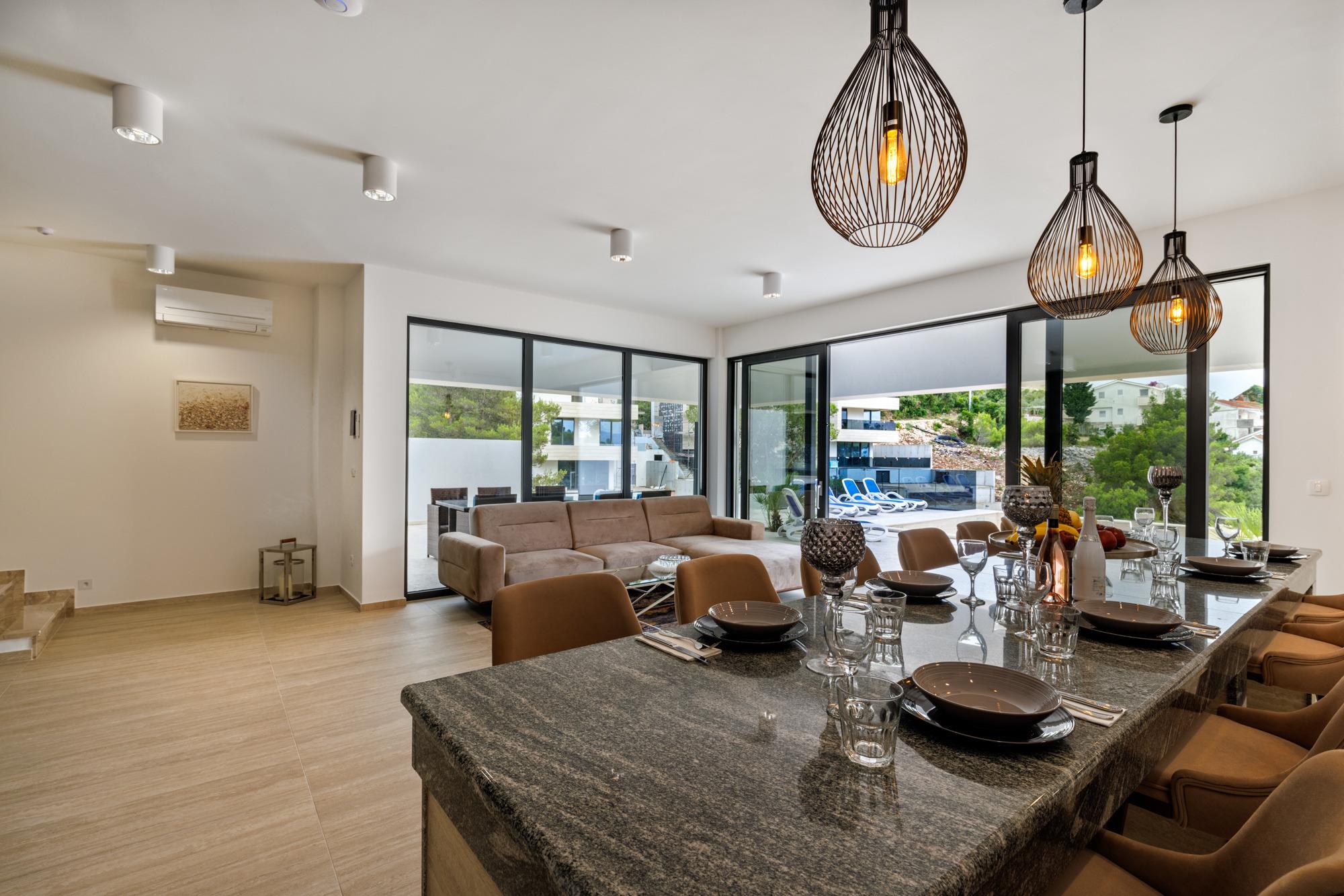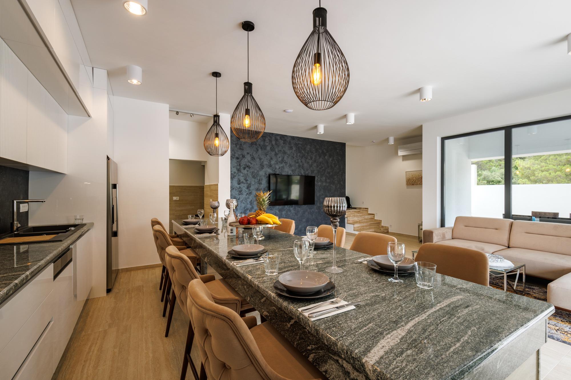 Das moderne Wohnzimmer verfügt über einen Smart-TV und ein bequemes Ecksofa mit Couchtisch. Neben dem Wohnzimmer befindet sich das einladende Esszimmer mit Granit Tisch und Sitzgelegenheiten für 8 Personen. In der komplett eingerichteten Küche können Sie Ihre Lieblingsgerichte zubereiten.