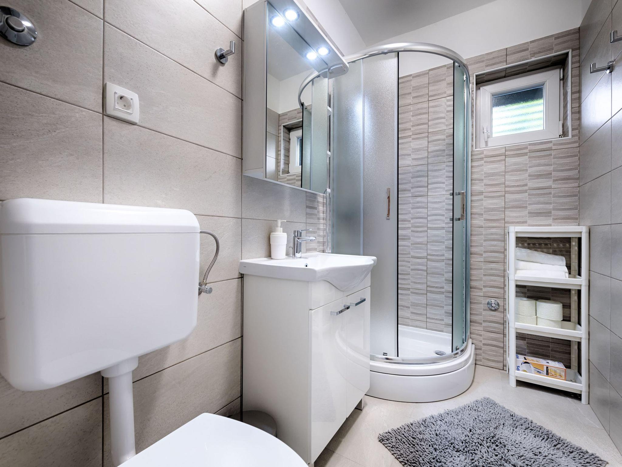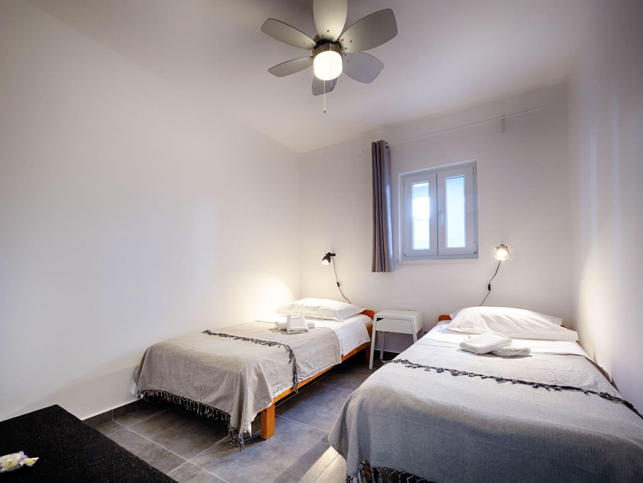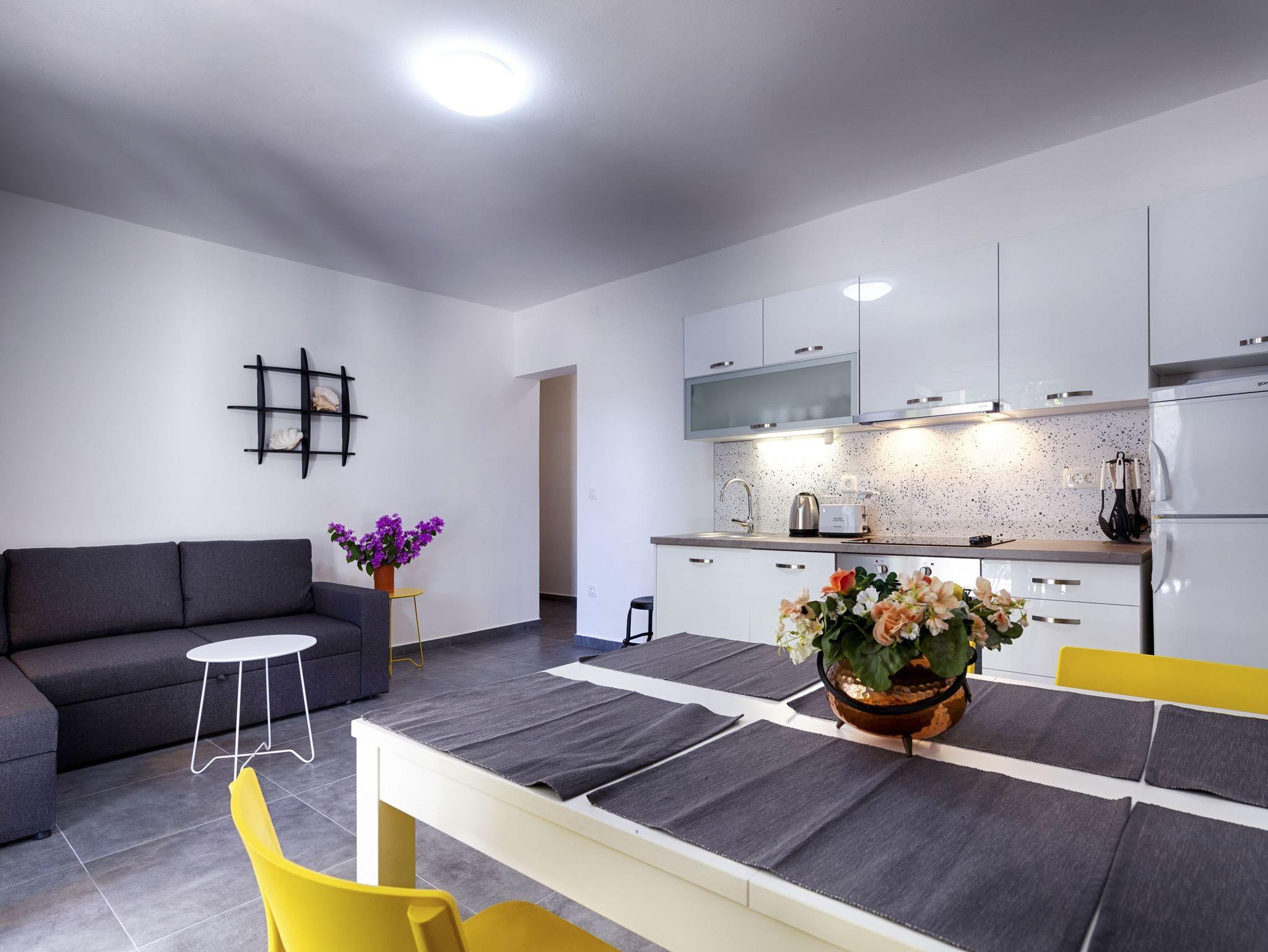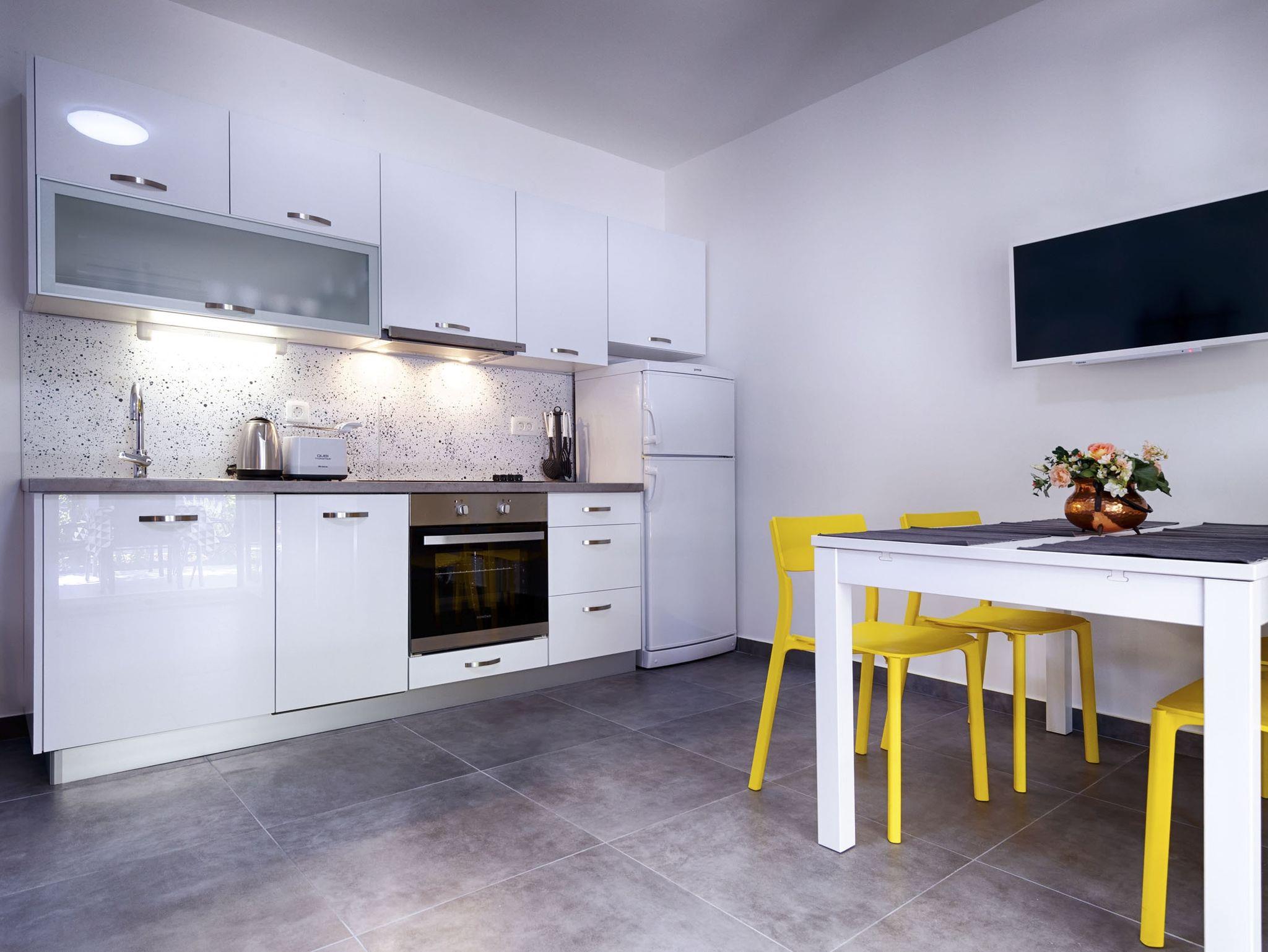 Ferienwohnung bietet Platz für 4 Gäste. Die Betten sind in Schlafzimmern, die es 2 gibt, innerhalb einer Gesamtfläche von 47m2, angeordnet. Die Gäste haben eine eigene Terrasse zur Verfügung, auf der sie in warmen Sommernächten genießen können. Für vollen Genuss und Entspannung gibt es einen privaten Grill für Gäste dieser Unterkunft. IM PREIS INBEGRIFFEN: Kurtaxe, Endreinigung, Klimatisierung, Parkplatz, Internet, Bügeleisen, Bügelbrett, Föhn. VERBINDLICHE ZUSÄTZLICHE KOSTEN: Aufzahlung für Kurzaufenthalte (prozentualer Zuschlag pro Nächtigungsanzahl: 30% - 1, 20% - 2, 10% - 3). UNVERBINDLICHE ZUSÄTZLICHE KOSTEN: 2 Kinderbettchen (10,00 € Person/Tag). Die Verfügbarkeit zusätzlicher Dienstleistungen in Ihrem reservierten Termin und die Preise derselben (falls nicht aufgeführt) müssen im Voraus überprüft werden. Zusätzliche Dienstleistungen die in der Zahlungsaufforderung nicht aufgeführt sind werden direkt beim Vermieter bezahlt, angenommen der Gast nutzt auch diese.