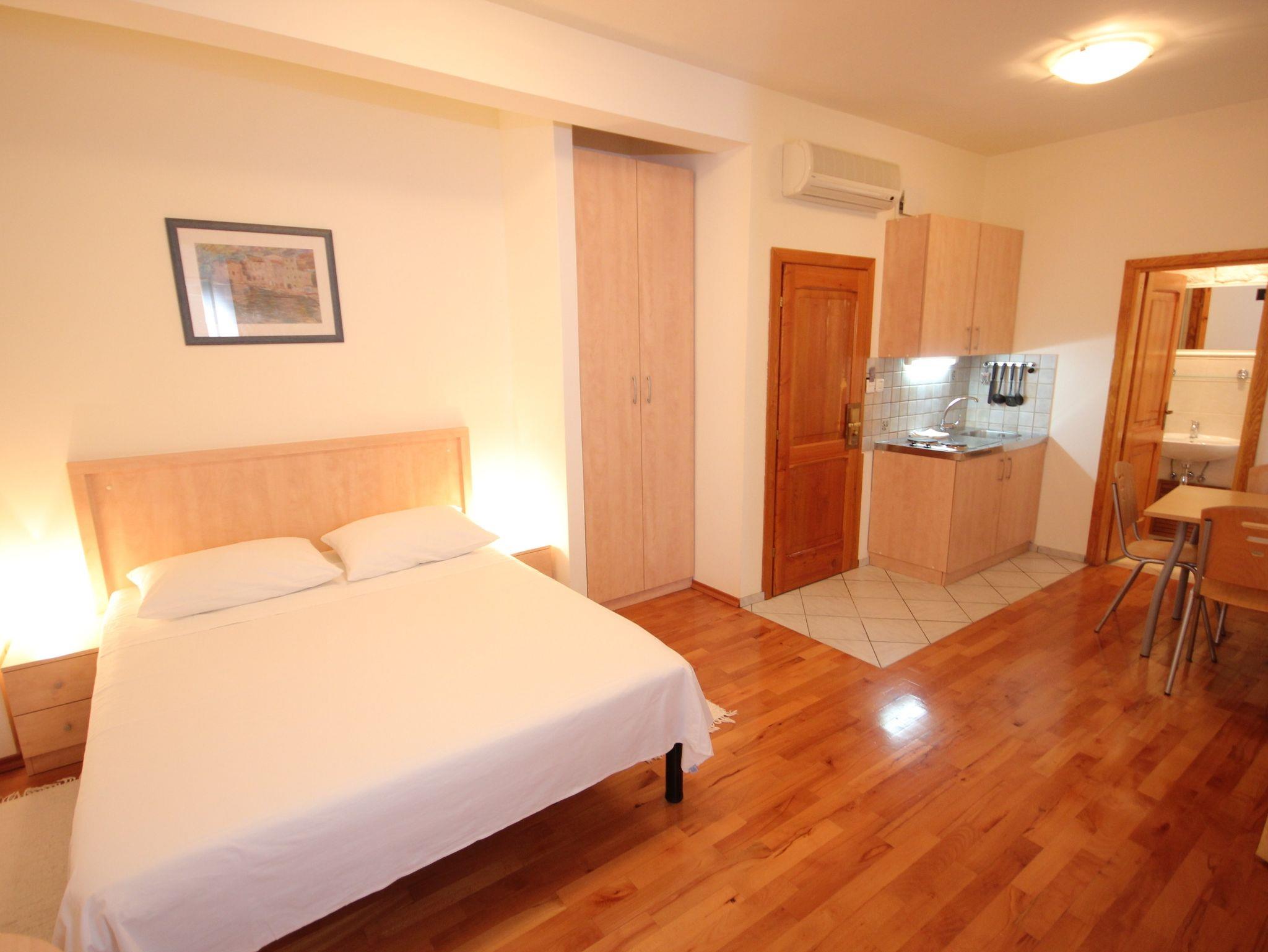 Studio bietet Platz für 3 Gäste. Die Betten sind in Schlafzimmern, die es 1 gibt, innerhalb einer Gesamtfläche von 22m2, angeordnet. Die reservierte Unterkunftseinheit hat keinen Balkon und keine Terrasse. IM PREIS INBEGRIFFEN: Kurtaxe, Endreinigung, Klimatisierung, Internet, Kinderbett, Föhn. VERBINDLICHE ZUSÄTZLICHE KOSTEN: Aufzahlung für Kurzaufenthalte (prozentualer Zuschlag pro Nächtigungsanzahl: 30% - 1, 20% - 2, 10% - 3). UNVERBINDLICHE ZUSÄTZLICHE KOSTEN: Zusatzbett (8,00 € pro Nacht). Die Verfügbarkeit zusätzlicher Dienstleistungen in Ihrem reservierten Termin und die Preise derselben (falls nicht aufgeführt) müssen im Voraus überprüft werden. Zusätzliche Dienstleistungen die in der Zahlungsaufforderung nicht aufgeführt sind werden direkt beim Vermieter bezahlt, angenommen der Gast nutzt auch diese.