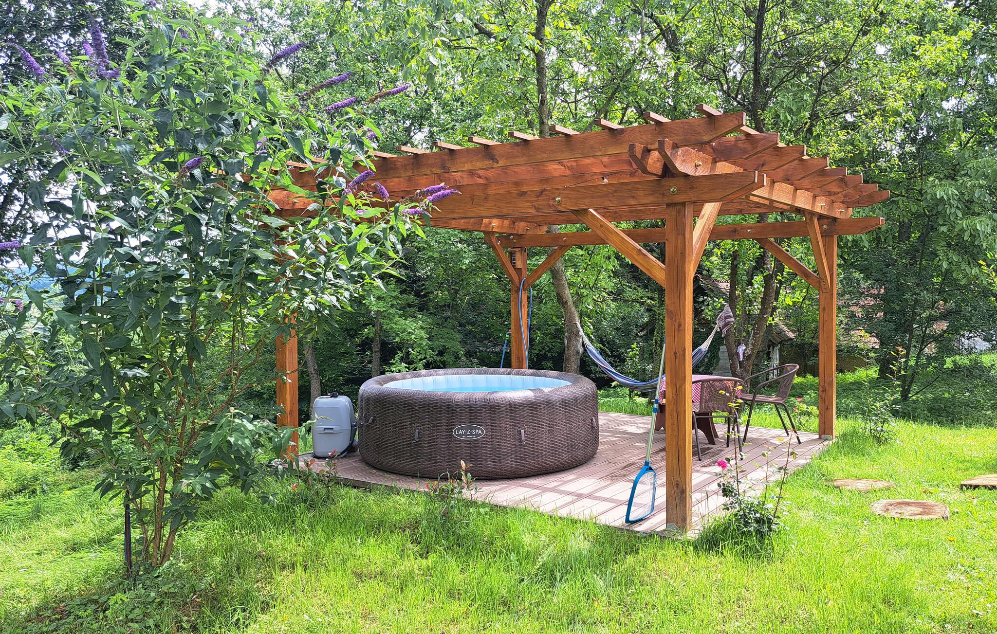 Der er fire træbygninger på ejendommen: et hovedhus, en udbygning med et moderne sommerkøkken og badeværelse samt et lysthus med grill og spabad. Slap af i spabadet, mens børnene leger i haven og på gyngerne.