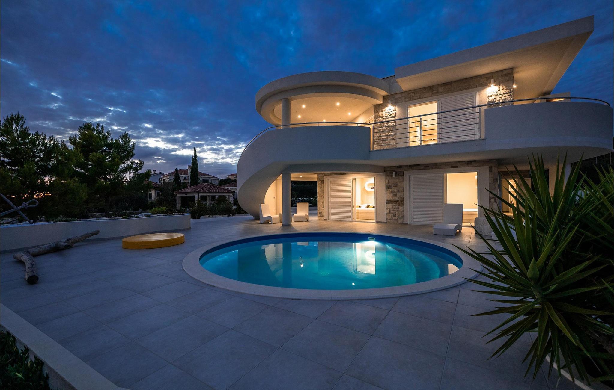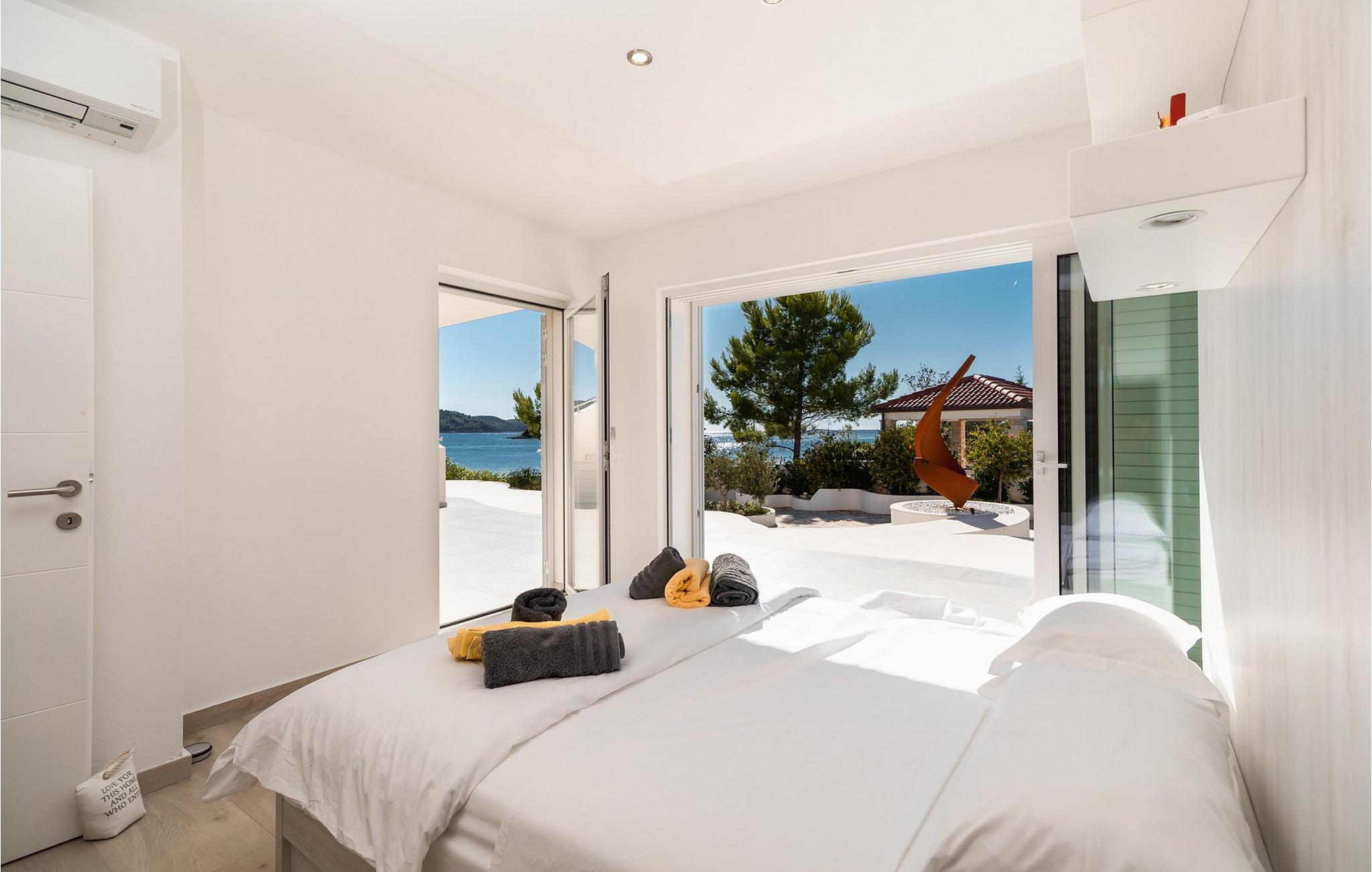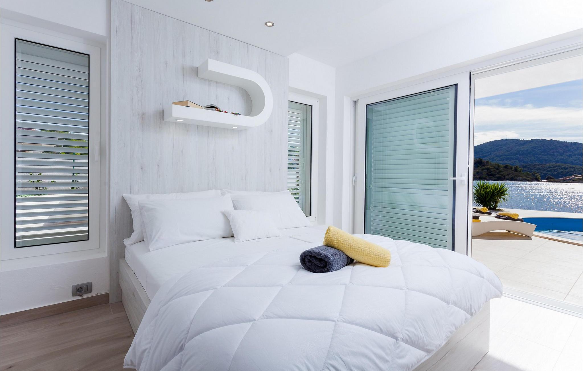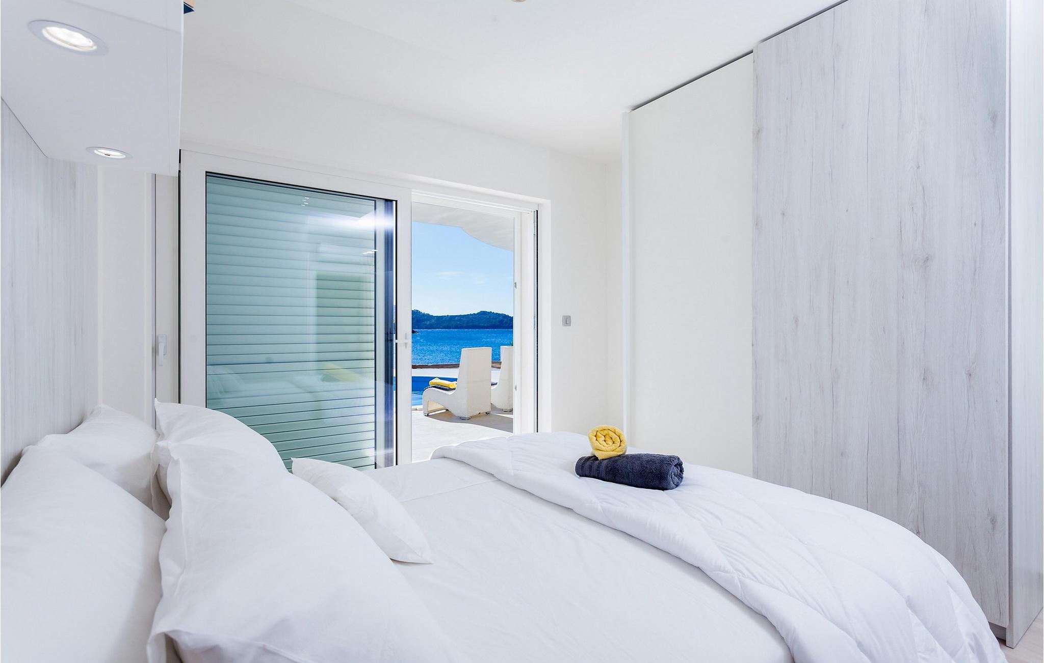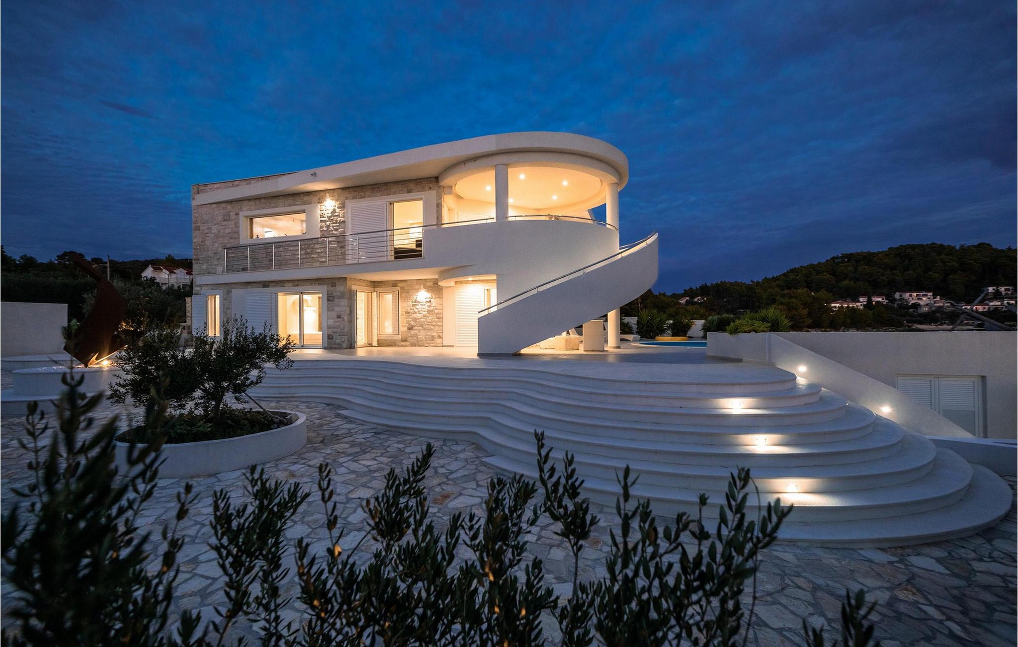 Nyd jeres ferie i denne eksklusive villa, der ligger direkte ved havet i Vela Luka på øen Korcula. Tilbring jeres ferie i Villa Soleil. Den moderne arkitektur kombinerer stilfuld æstetik med funktionelt design og skaber en luksuriøs atmosfære. Oplev de to etager med svingende trapper og lyse værelser. Den åbne stue med et fuldt udstyret køkken, spisestue og stue er fyldt med lys og tilbyder en spektakulær udsigt over havet. På den rummelige terrasse kan I nyde jeres måltider under åben himmel eller slappe af på en af liggestolene ved den cirkulære pool - det perfekte sted at se solnedgangen. Direkte adgang til havet vil gøre jeres ferie uforglemmelig. Vela Luka, der ligger i den vestlige del af øen Korcula, er et ideelt udgangspunkt for jeres udforskninger. Denne charmerende by er rig på historie, kultur og middelhavsstemning. Tag på bådture til de omkringliggende øer, oplev skjulte bugter eller besøg den historiske gamle bydel i Korcula. Det omkringliggende område byder på mange muligheder for udendørsaktiviteter som vandreture, cykling og vandsport. Oplev dalmatisk køkken i byens hyggelige restauranter og nyd den afslappede atmosfære i denne unikke middelhavsregion. Bemærk venligst: Villaen er ikke egnet til børn under 12 år.