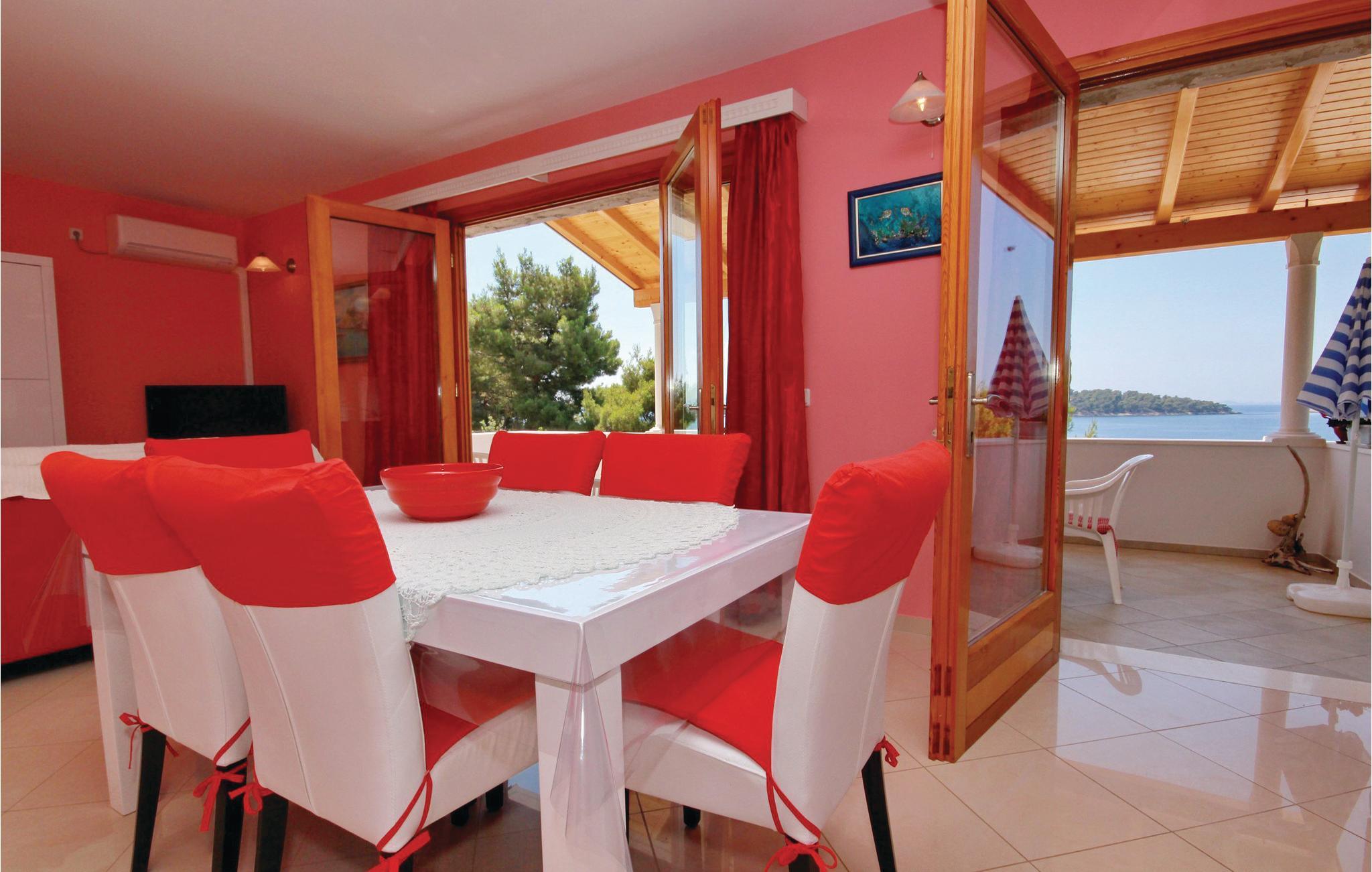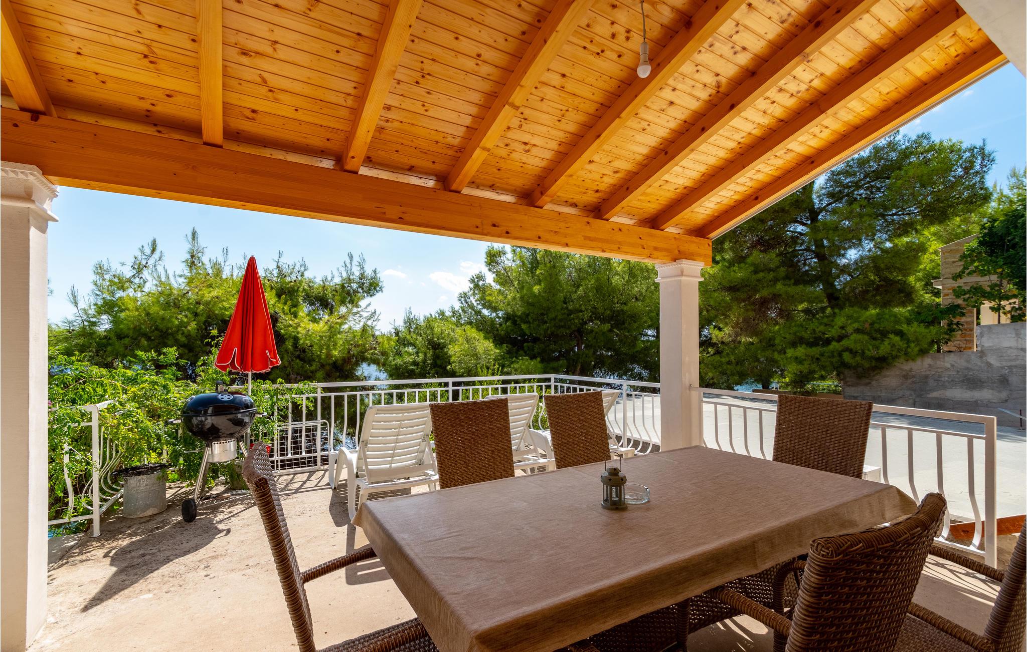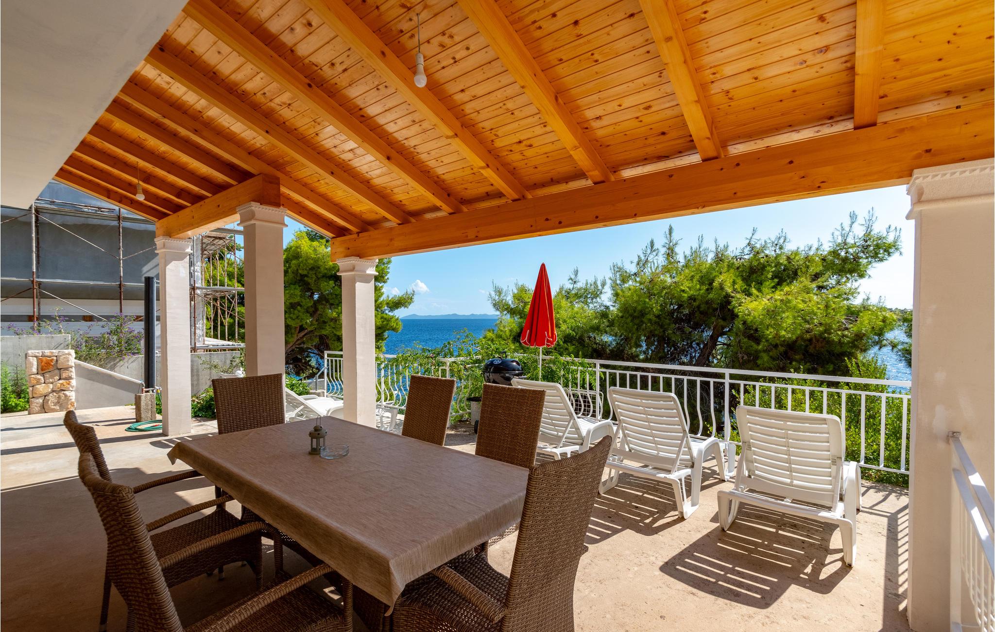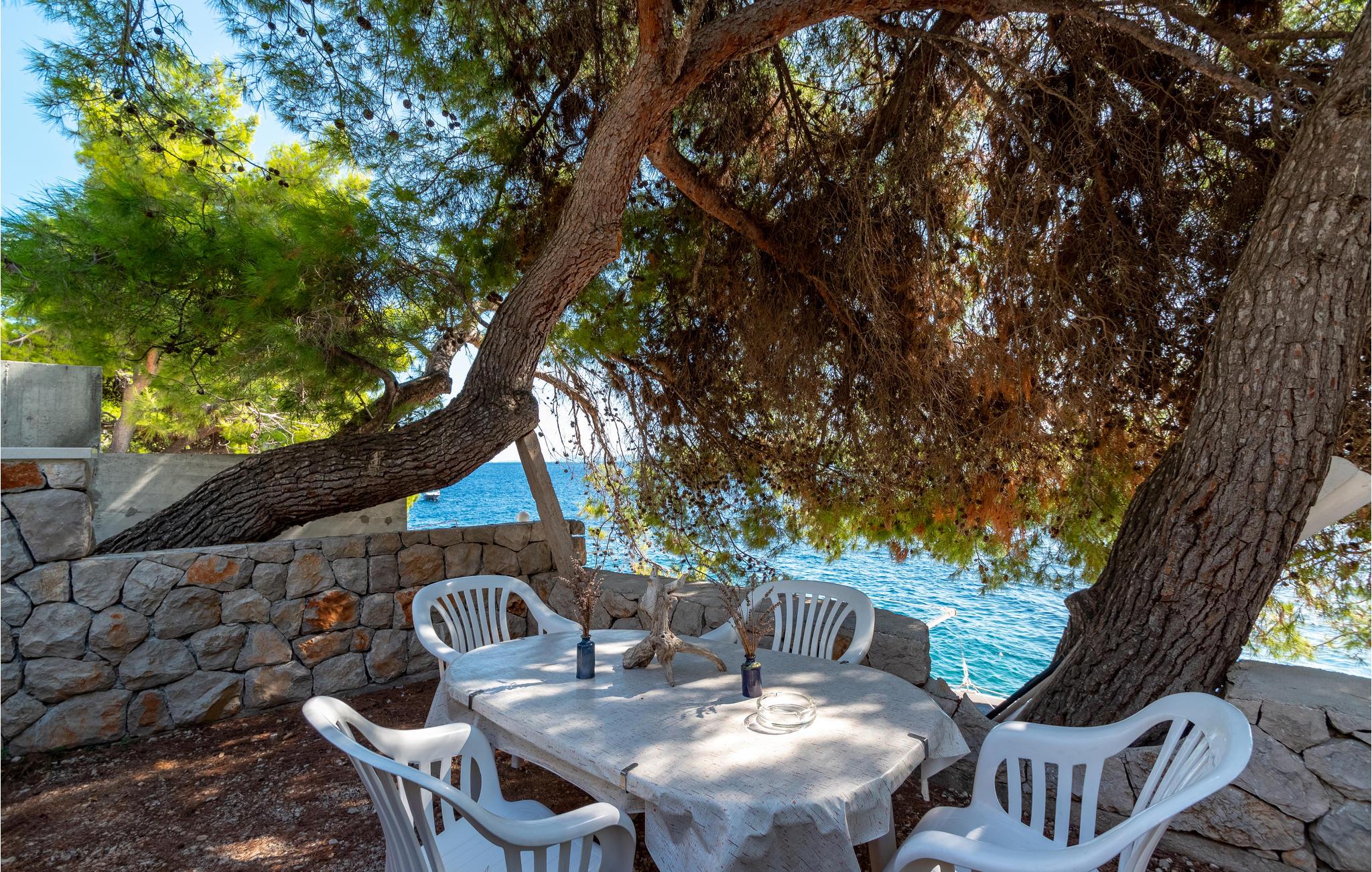 De skønneste dage på hele året bliver ganske enkelt helt uforglemmelige i dette lille, flotte stenhus! Lad solstrålerne danse hen over kroppen, svøm i det krystalklare hav, og træk jer tilbage på den skyggefulde terrasse, der er omgivet af flotte fyrretræer, når det bliver for varmt i solen. Huset ligger kun 10 m fra en dejlig privat strand, så det er oplagt at begynde eller slutte dagen med en svømmetur. Huset har to adskilte boligenheder, som er forbundne af en udendørs trappe. Stueetagen er ikke renoveret og har enkle møbler. Hvis I kommer med egen båd, er der en gratis anlægsplads til jeres rådighed. Et hus med alle forudsætninger til en uforglemmelig dejlig ferie.