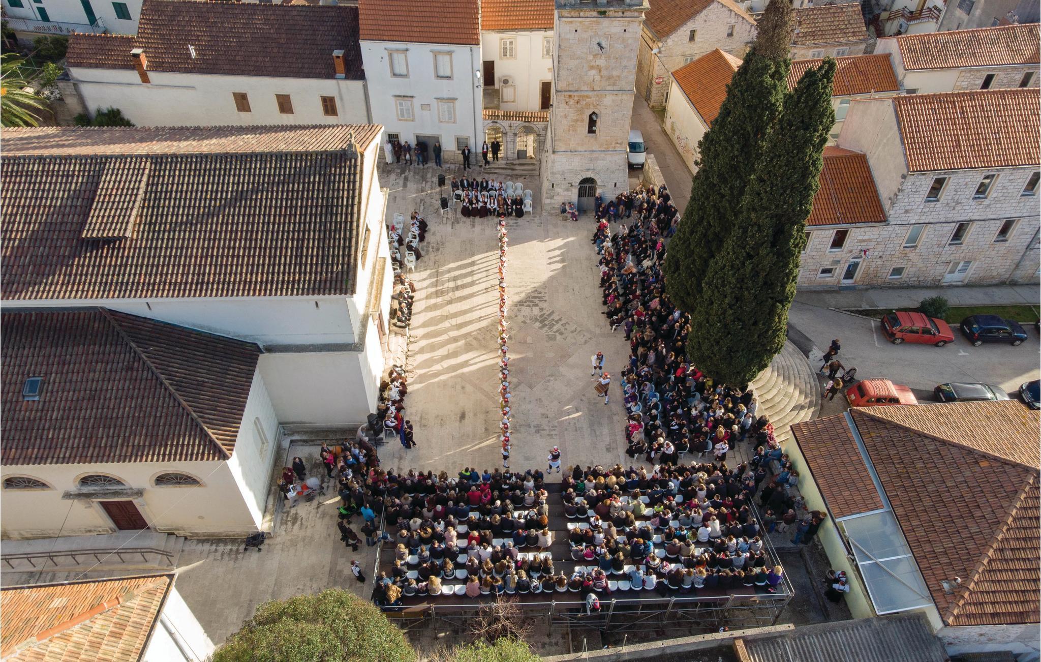 Dette dejlige stenhus er bygget i traditionel dalmatisk stil og ligger i et smukt område. Huset er perfekt til 2 familier, der gerne vil holde ferie sammen. Feriehuset har to næsten helt identiske boliger. Hver bolig har et soveværelse med en dobbeltseng, et badeværelse samt et lille køkken. I stueetagen er der en lille trappe, der fører op til en hems. Den laveste loftshøjde er ca. 1 m. Fra den flotte, åbne terrasse, er der en fantastisk udsigt ud over havet, og haven med mediterrane planter. I haven har I også en dejlig swimmingpool til rådighed, som I vil elske på de varme sommerdage. Derudover er der en stengrill til rådighed, som I kan tilberede jeres lækre måltider på. Strand i nærheden. Ejer stiller gratis to kajakker til rådighed. Planlæg spændende ture i området. Se blandt andet flere af de nærliggende byer, som byder på kultur og underholdning for alle