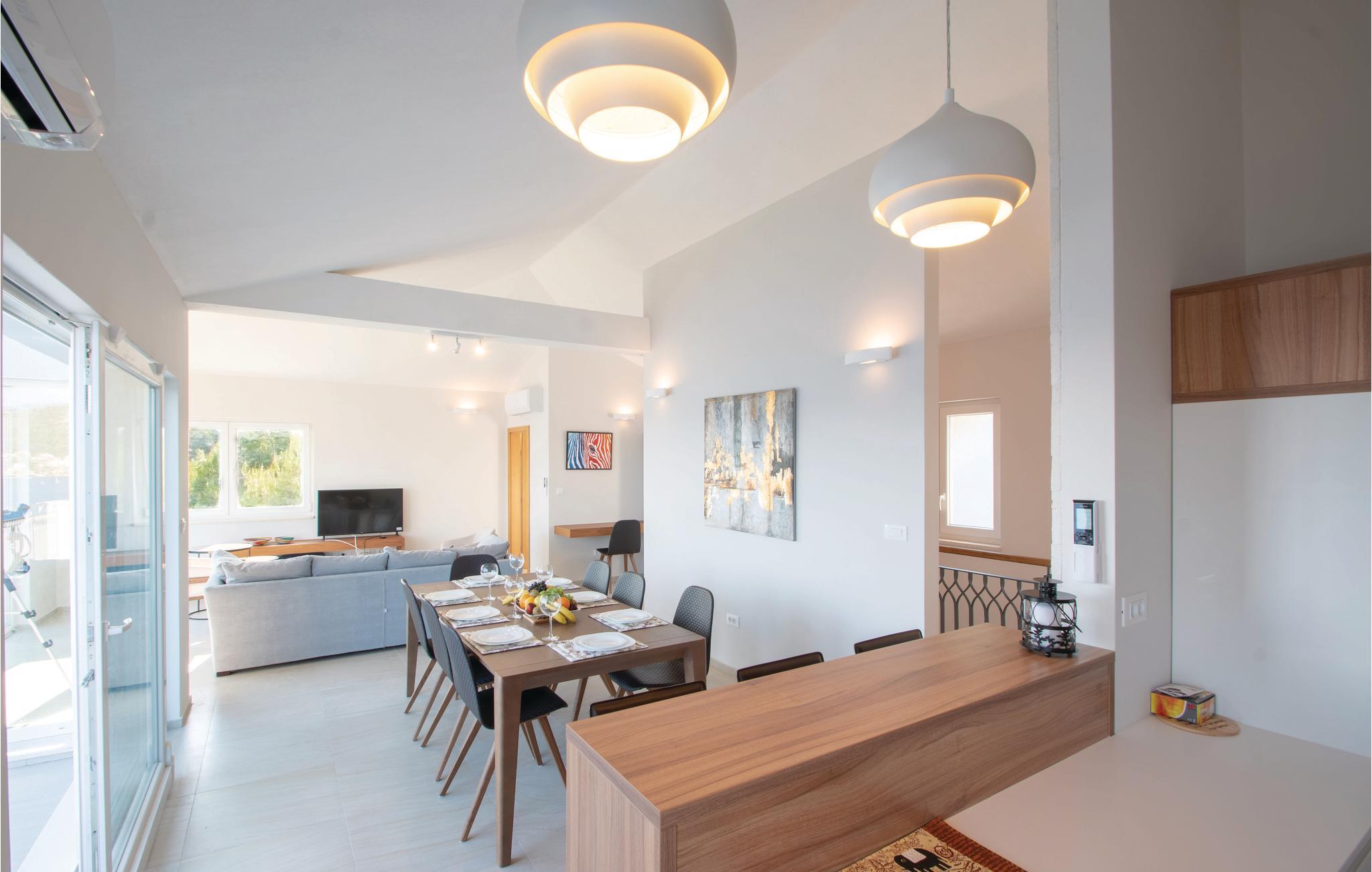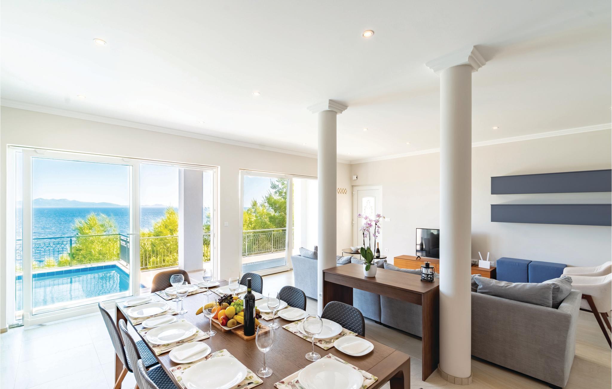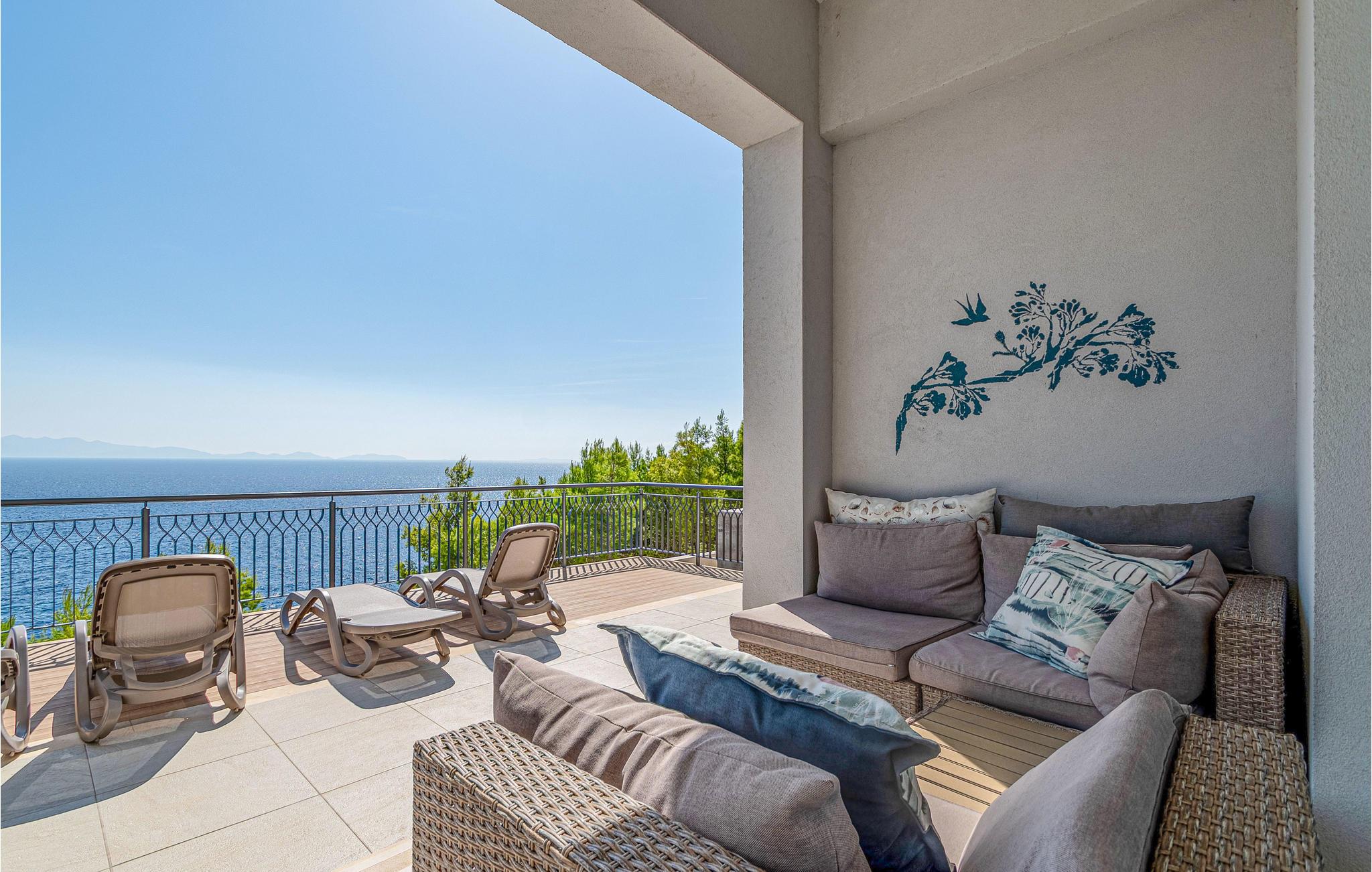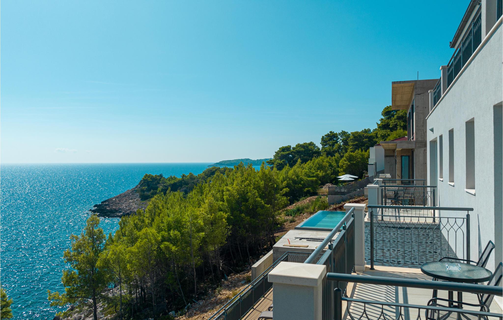 Dette drømmeskønne feriehus med pool ligger lige i nærheden af havet, ved den lille bugt Vinacac nær byen Brna, på øen Korcula. Klare linjer, luksuøse detaljer og materialevalg af høj kvalitet er overskriften i denne villa. Den er fordelt på to etager, i stueplan med et stort opholdsrum og fuldt udstyret køkken, et master-bedroom med badeværelse og en skøn terrasse med pool og en grill. Indre trapper fører til første sal med fire soveværelser med klimaanlæg, badeværelser en suite og en terrasse med havudsigt. Huset ligger kun få meter fra havet, med trin ned til et betonplateau, hvor I kan tage solbade og bade i havet.