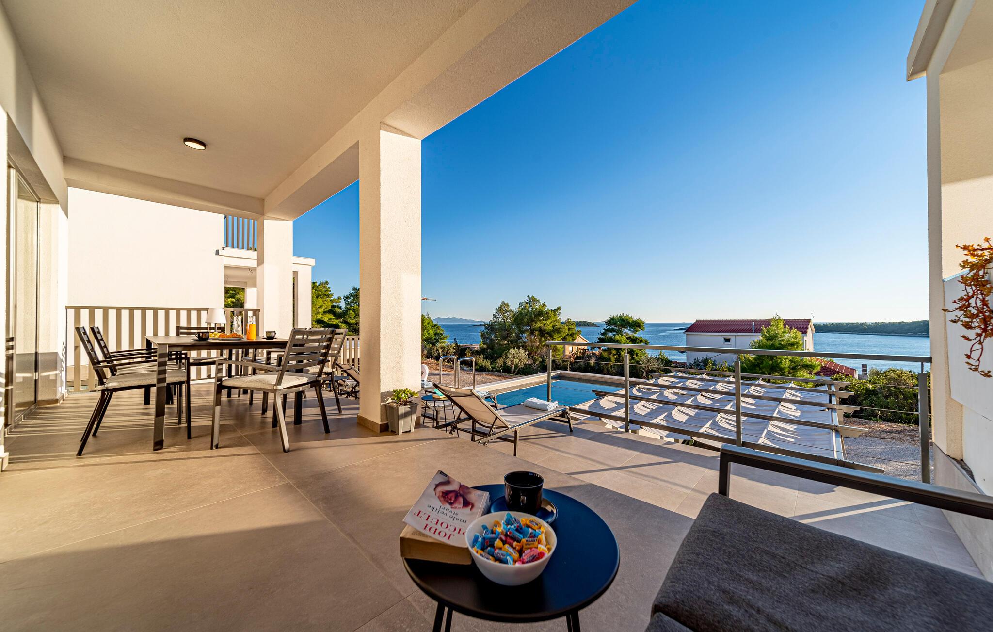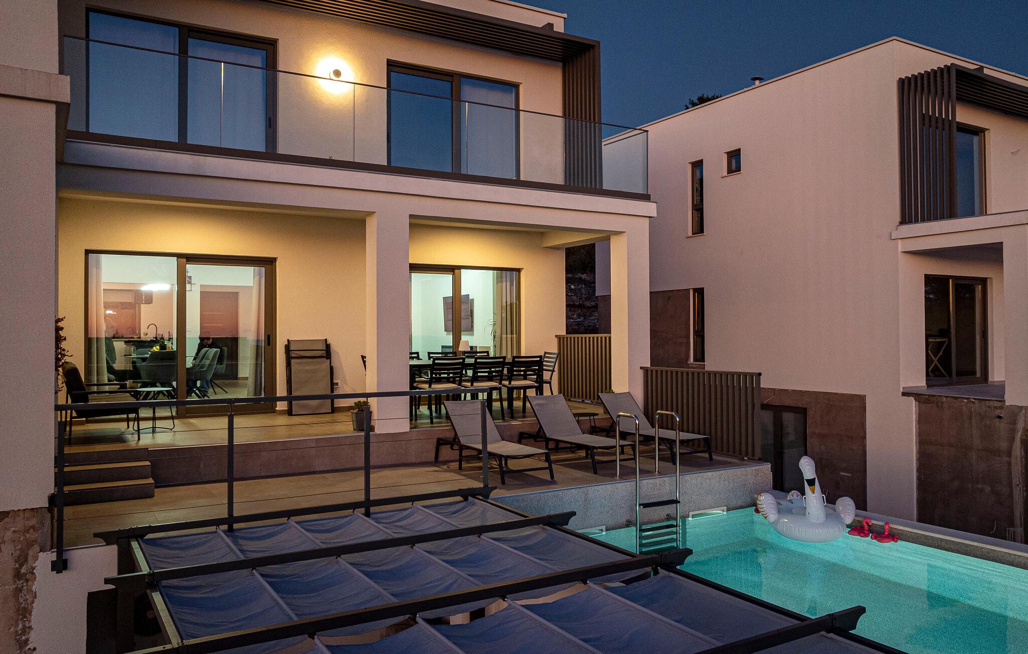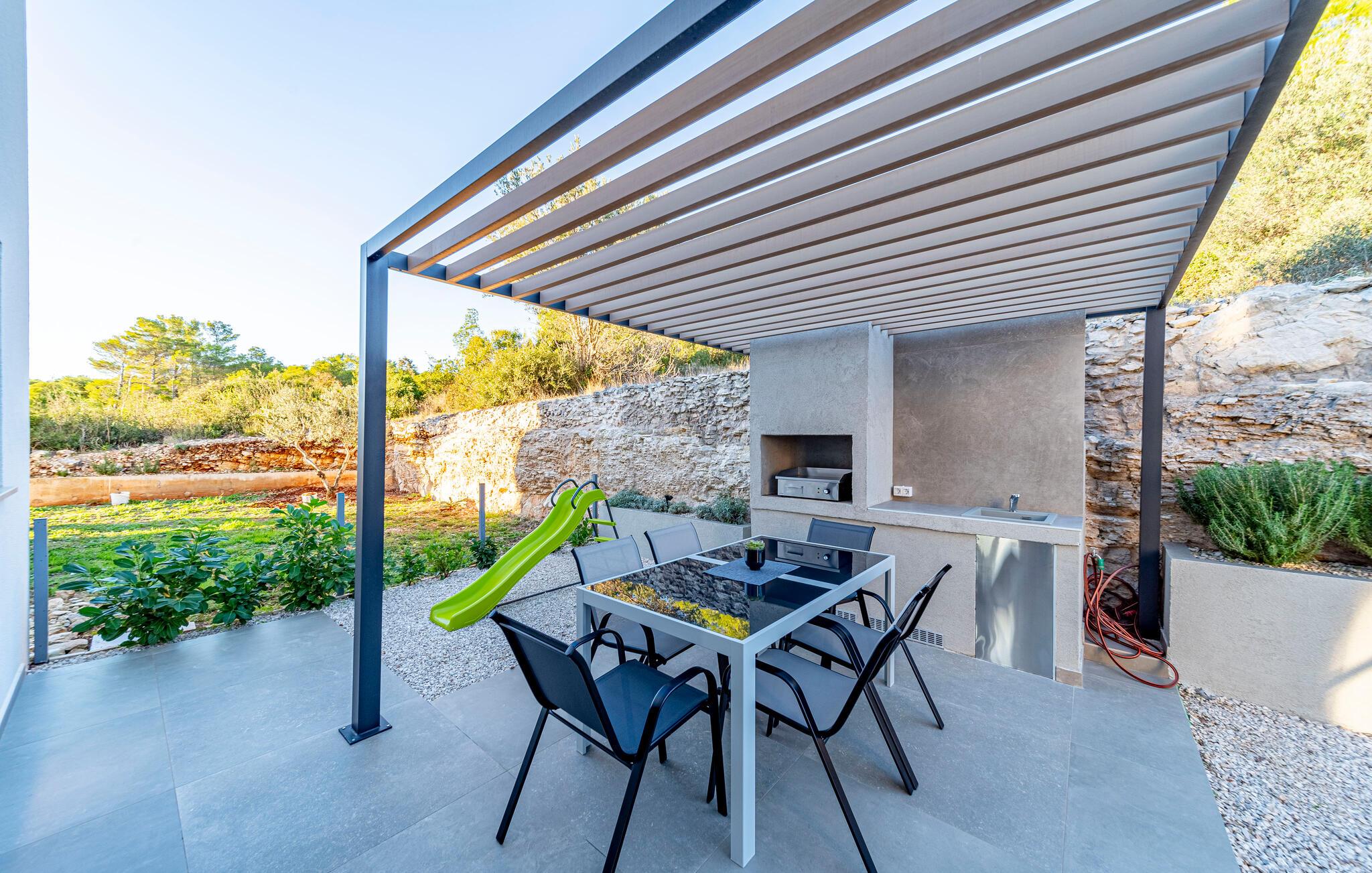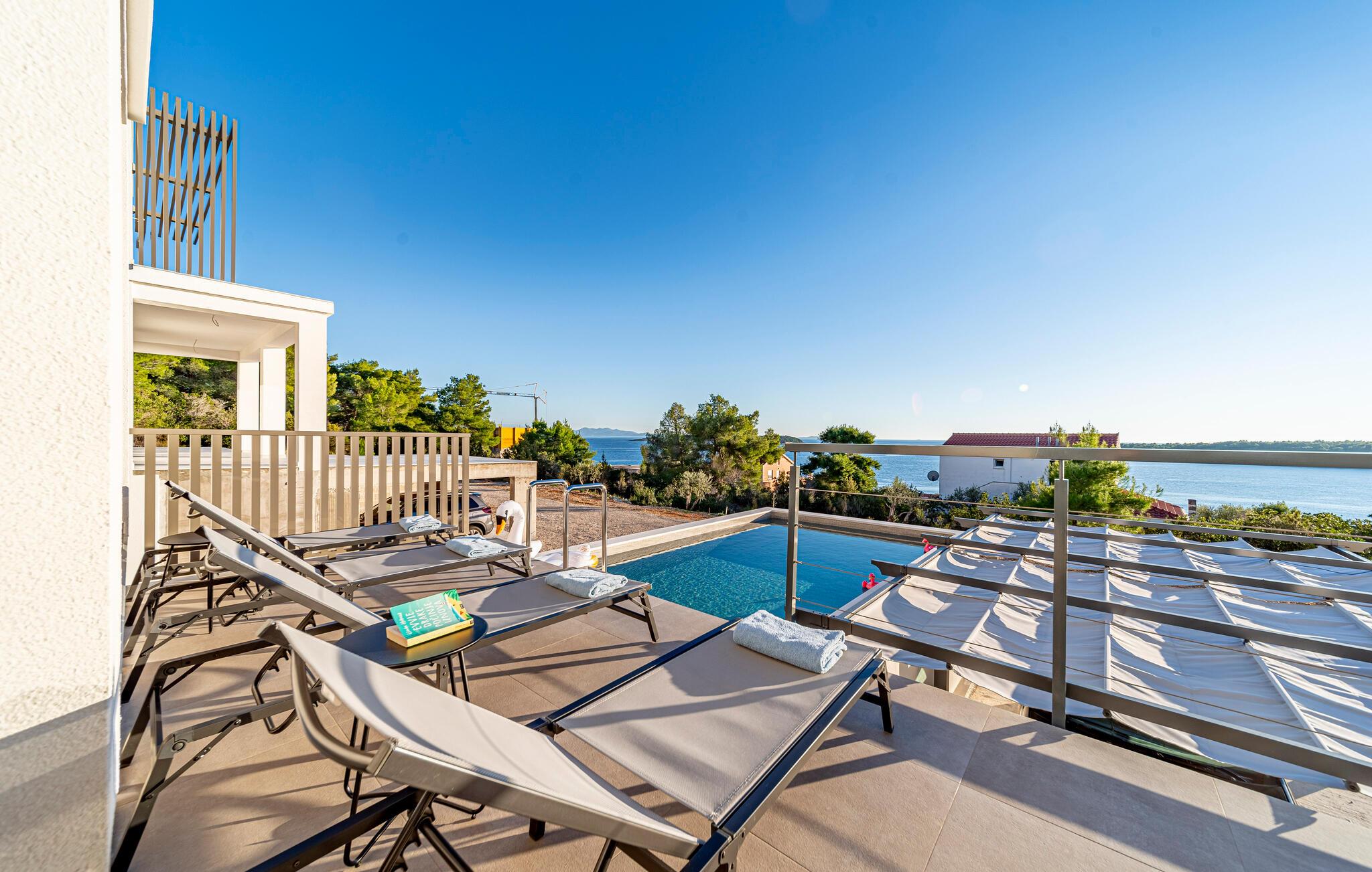 Oplad jeres batterier i infinity-poolen og lad jeres blik vandre over havet. Slap af på liggestolene, mens børnene leger i haven, eller nyd frisk fisk fra grillen under pergolaen, mens de smukke solnedgange bader terrassen i et varmt lys.