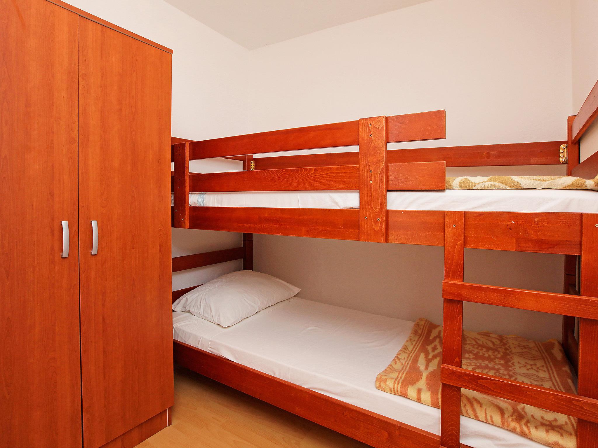 3-room apartment 45 m2, on the ground floor, south facing position. Living/dining room 18 m2 with open-hearth fireplace and satellite TV. Exit to the terrace. 1 room with 1 bed (90 cm, length 190 cm), 1 double bed (2 x 90 cm, length 200 cm). 1 room with 1 x 2 bunk beds. Kitchenette (4 hot plates, oven, freezer). Shower/WC. Terrace 35 m2. Terrace furniture. View of the sea. Facilities: Internet (WiFi, free).