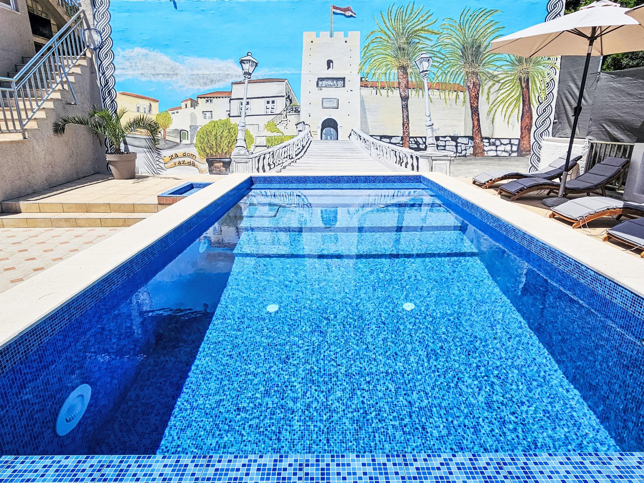 Apartment house "Snježana". On the outskirts, in a quiet, sunny position on a slope, 40 m from the sea, 40 m from the beach. For shared use: swimming pool angular (6 x 4 m, depth 80 - 150 cm, seasonal availability: 25.Apr. - 12.Sep.) with internal staircase. Barbecue. In the house: internet access. Roofed, parking at the house on the premises. Shop 700 m, restaurant 200 m, bus stop 3.4 km, sandy beach 1 km pebble beach 1 km, rocky beach 40 m. Please note: Additional accommodations can be booked.