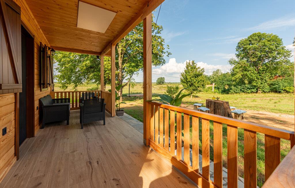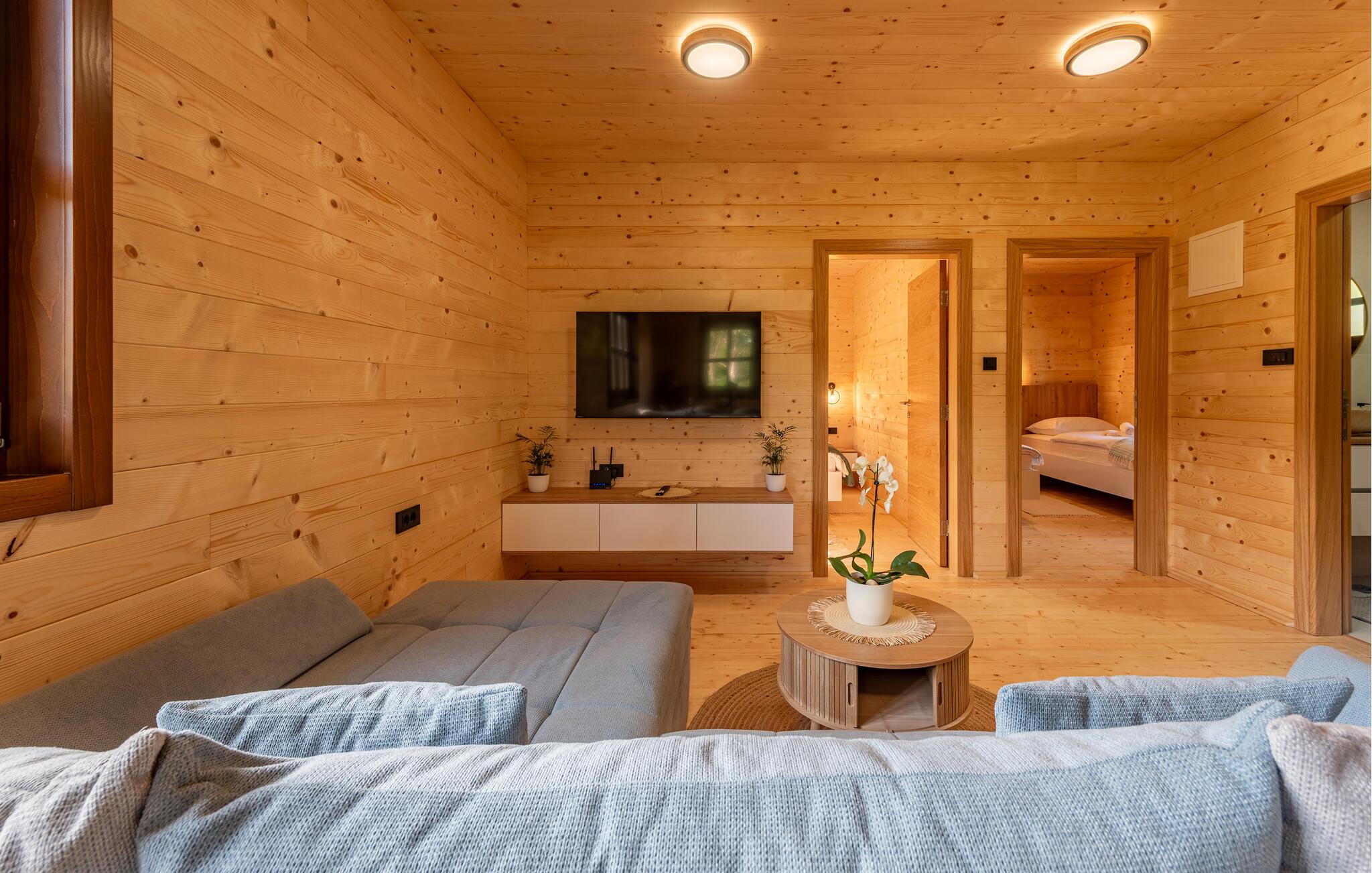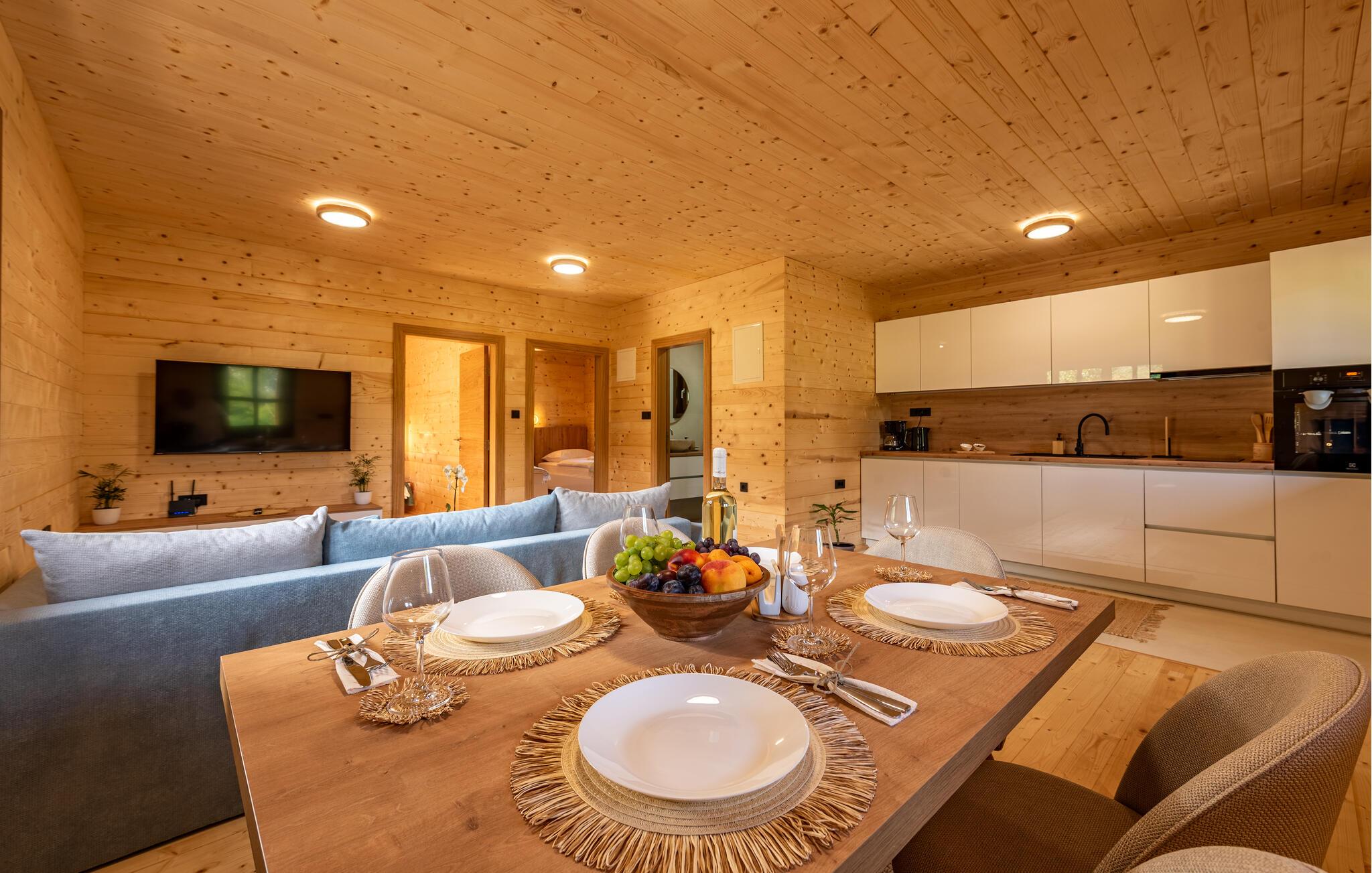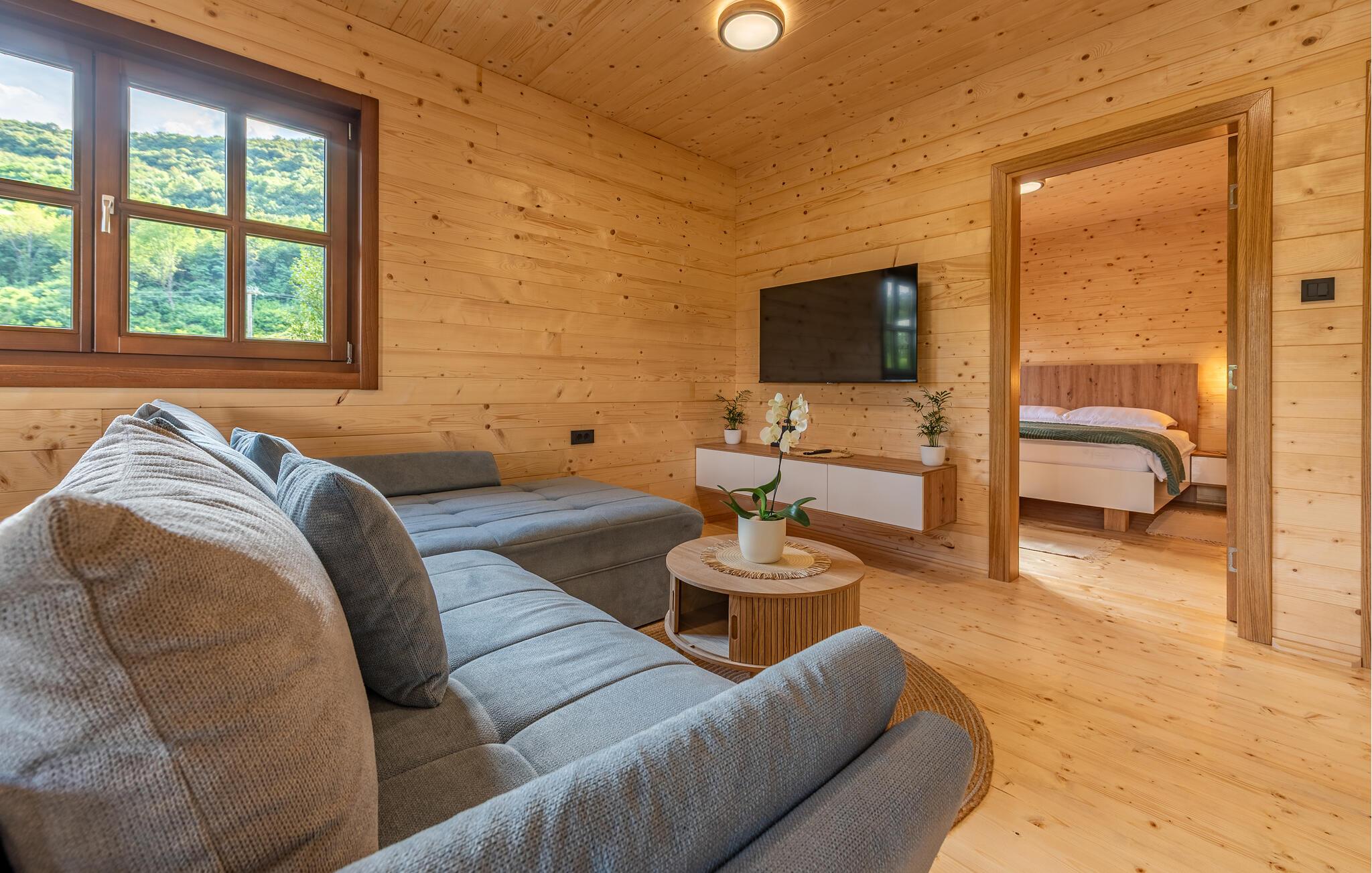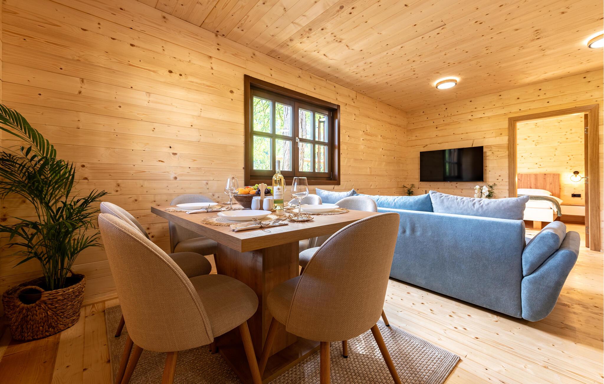 Velkommen til dette komfortable træhus, hvor I kan genoplade batterierne med jeres kære i en hyggelig atmosfære. Glæd jer til harmoniske måltider ved spisebordet, og stream en spændende film om aftenen, mens I hygger jer med hele familien i den behagelige sofa.