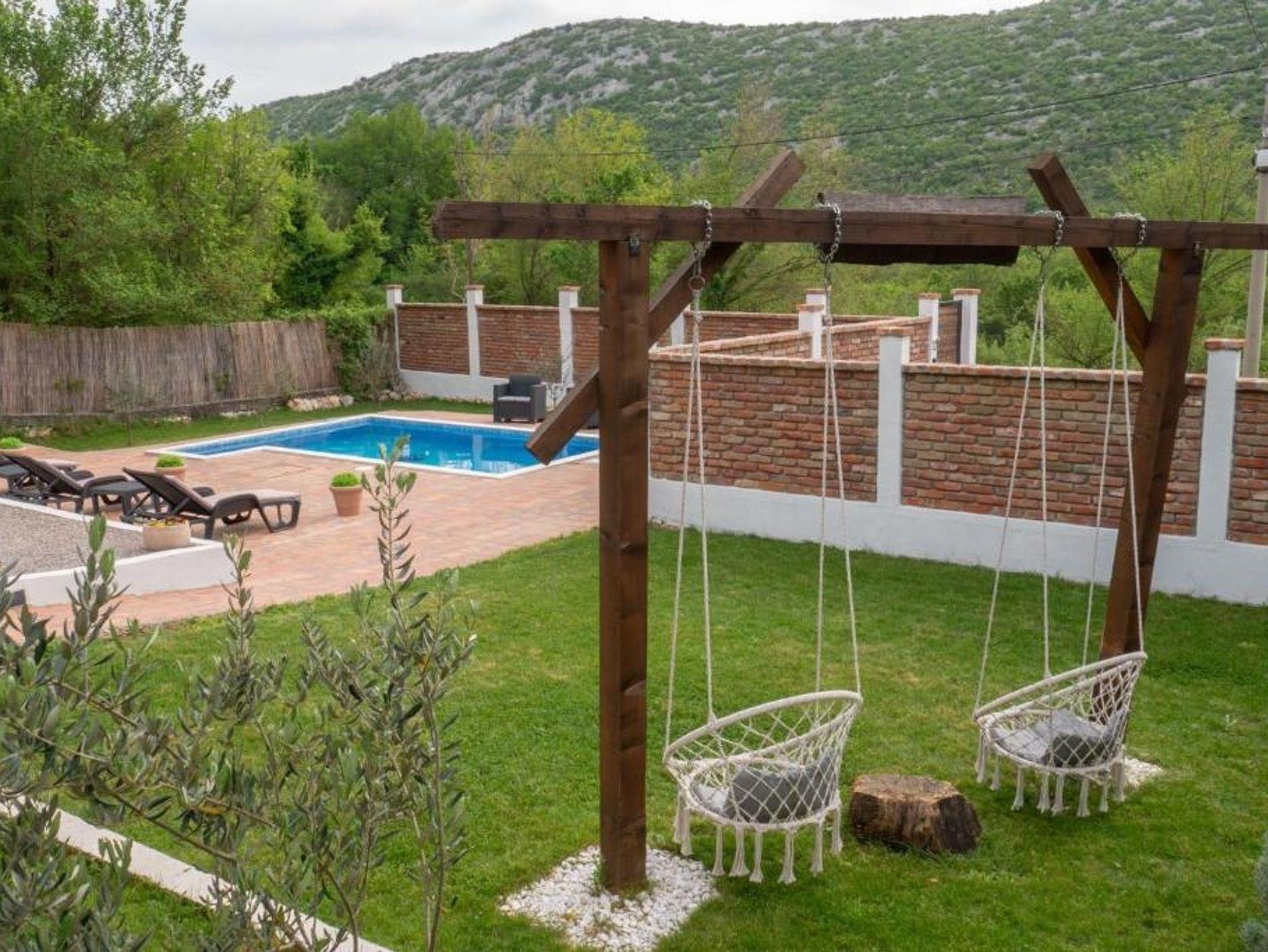 Umgebung des Objekts (Eingerichtet), Hof (350m2, Kinderbereich, Sitzbereich), Parkplatz (Anzahl der Parkplätze: 2, Entfernung vom Objekt: im Hof), Pool: privat, Dimensionen: 4m x 3m x 1.5m, Wassertyp: Süßwasser, WiFi Internet, Föhn, Bügeleisen, Bügelbrett, Kinderbett