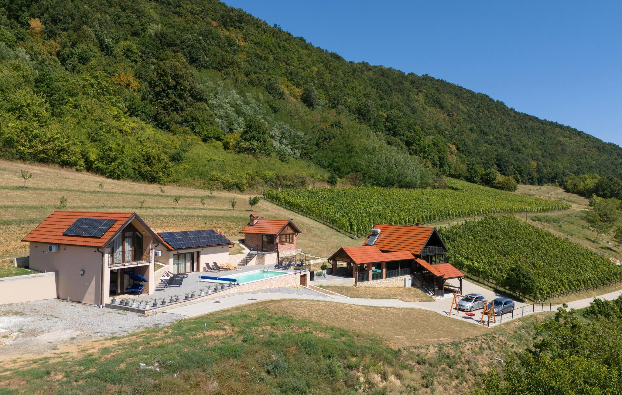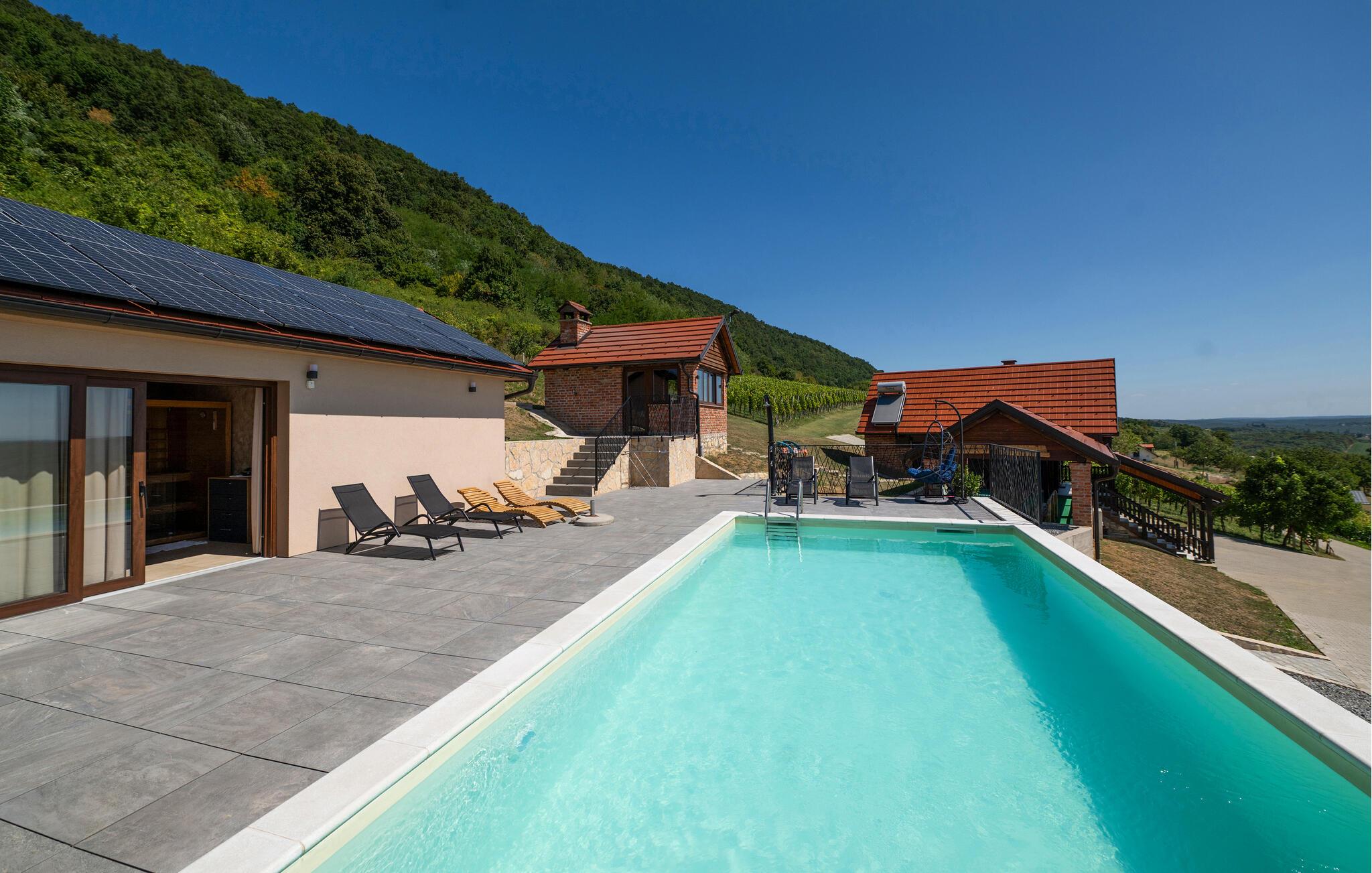Denne rummelige ferieoase på de sydlige skråninger af Kalnik-bjergene er ideel til en gruppe eller flere familier. Forkæl jer selv med beroligende øjeblikke i saunaen, spabadet eller den infrarøde kabine. Stream en film på Netflix eller kom sammen for at spille spil i den hyggelige brændeovnestue. Organiser sjove madlavningsarrangementer eller træk jer tilbage til jeres yndlingssted med en god bog.