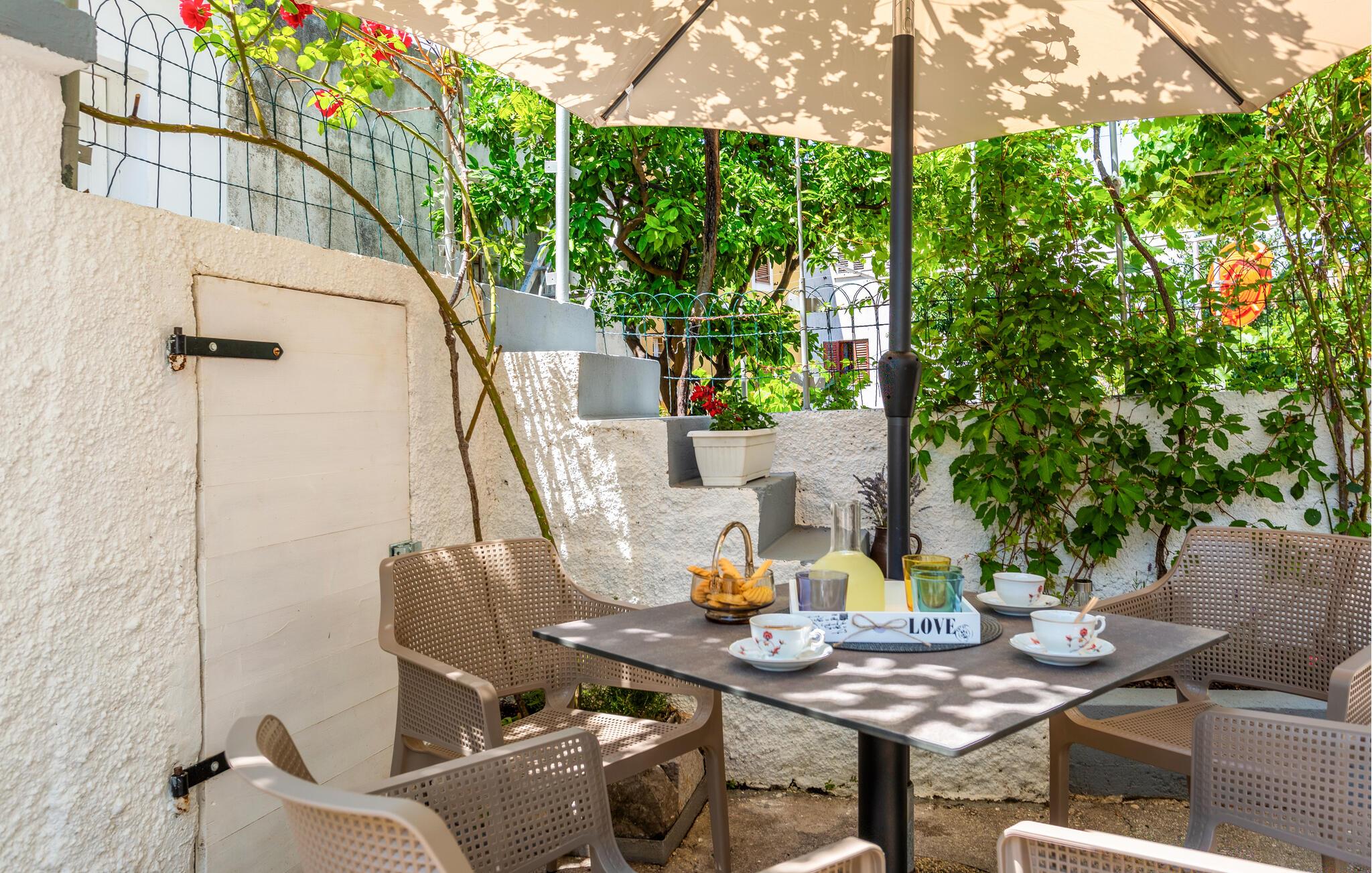Nyd jeres måltider udenfor på den hyggelige terrasse, der indbyder til afslapning og hygge. Lejligheden ligger i stueetagen af et hus og har en separat privat indgang, hvilket sørger for lidt ekstra privatliv.