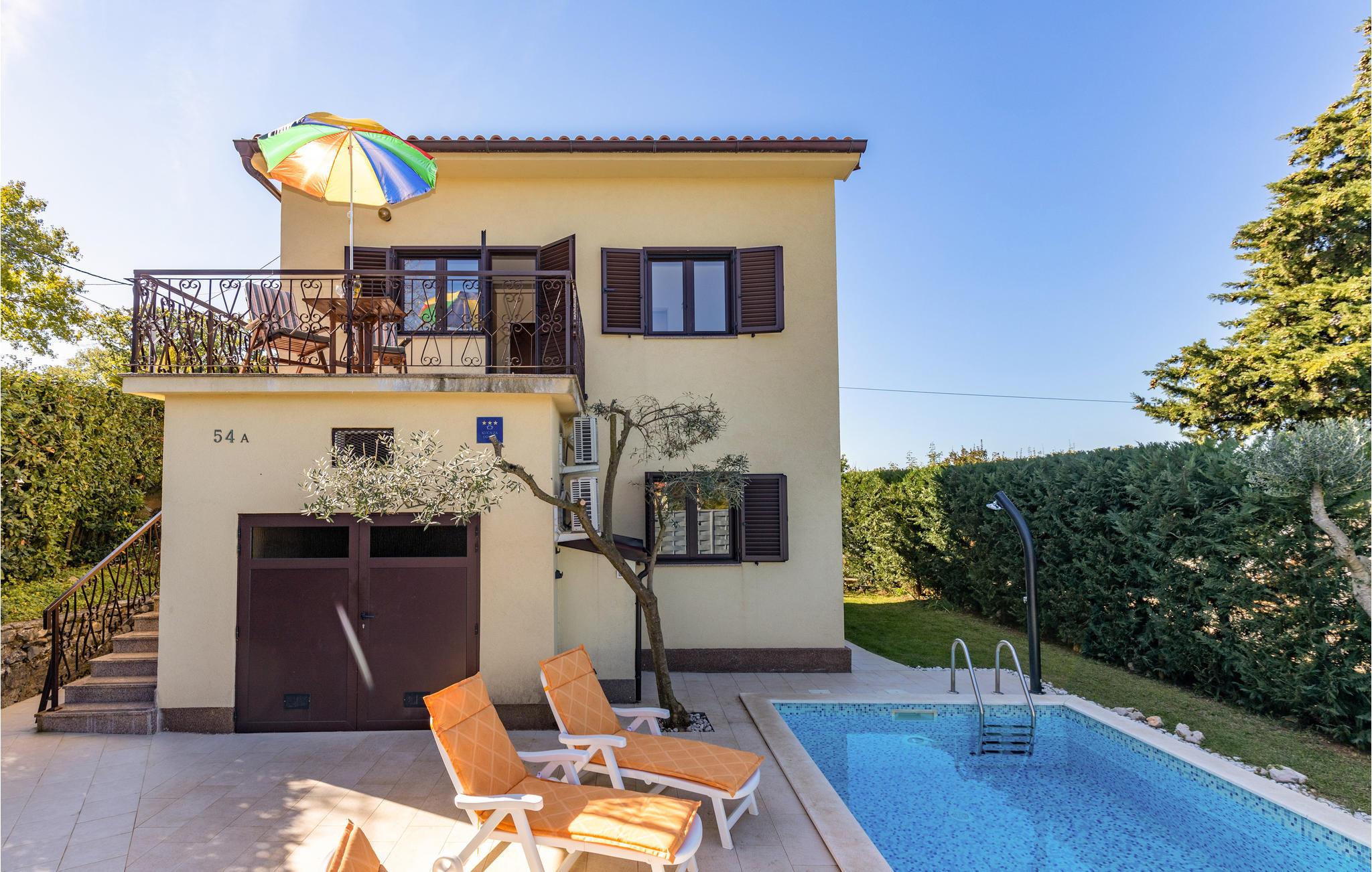 I den lille by Soline på øen Krk ligger dette smukke feriehus med pool. De to etager har ydertrapper. I stueetagen er der en dagligstue med køkken og spisestue, et soveværelse samt et fritidsrum med crosstrainer, bordtennis og pikado, og på første sal er der yderlige tre soveværelser, værelse 3 fungerer som gennemgang. Den flot anlagte, indhegnede have, hvor børn også kan lege sikkert, har en udendørspool, en overdækket og en åben terrasse med grillplads. Der er kun få minutters gang ned til stranden. Den kendte mudder med helende effekt, der findes her, er en særlig oplevelse.